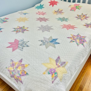 It is approximately 72 inches by 74 inches and comes from a smoke-free and pet-free home. Pictured on a queen-size bed.