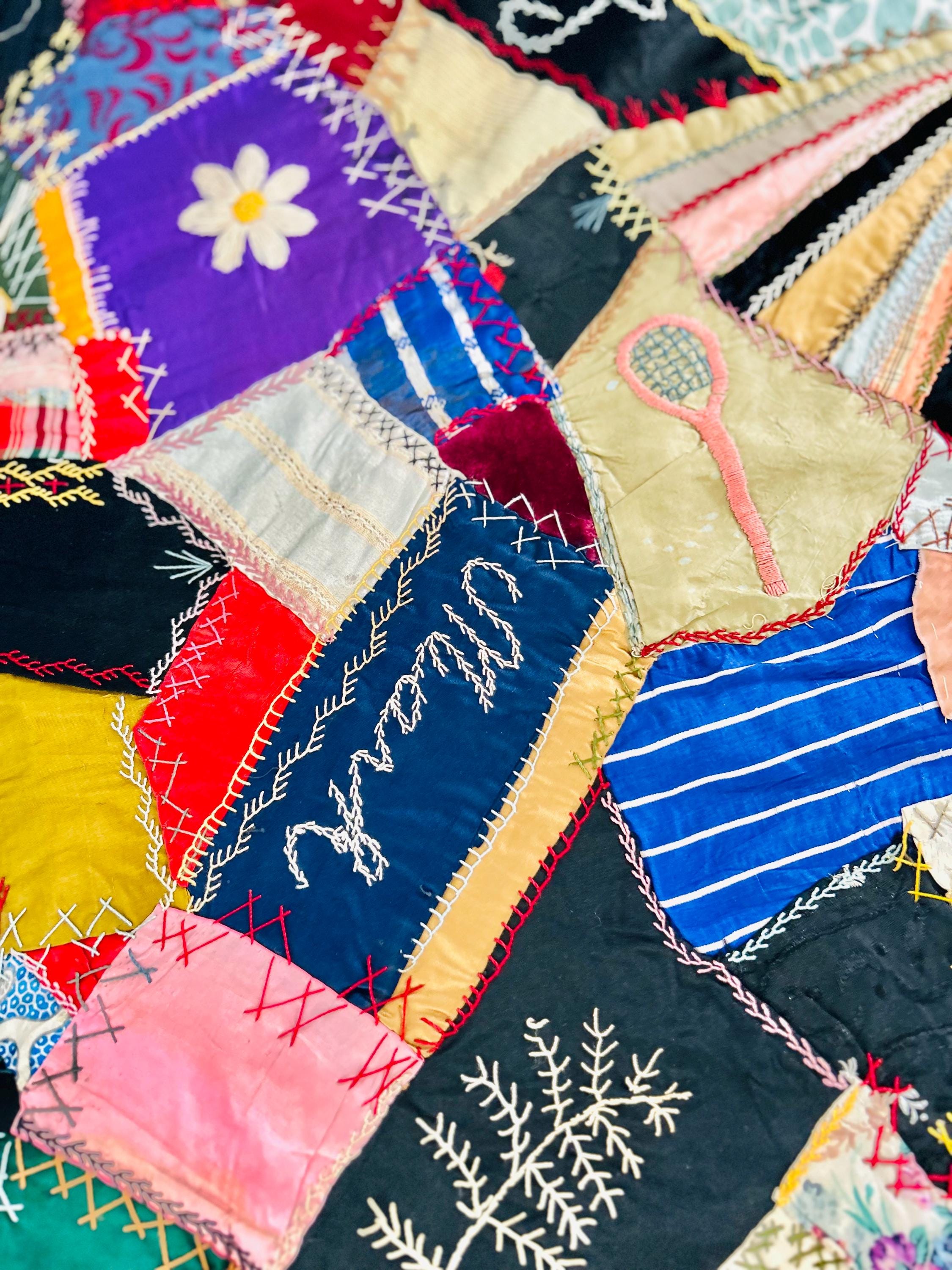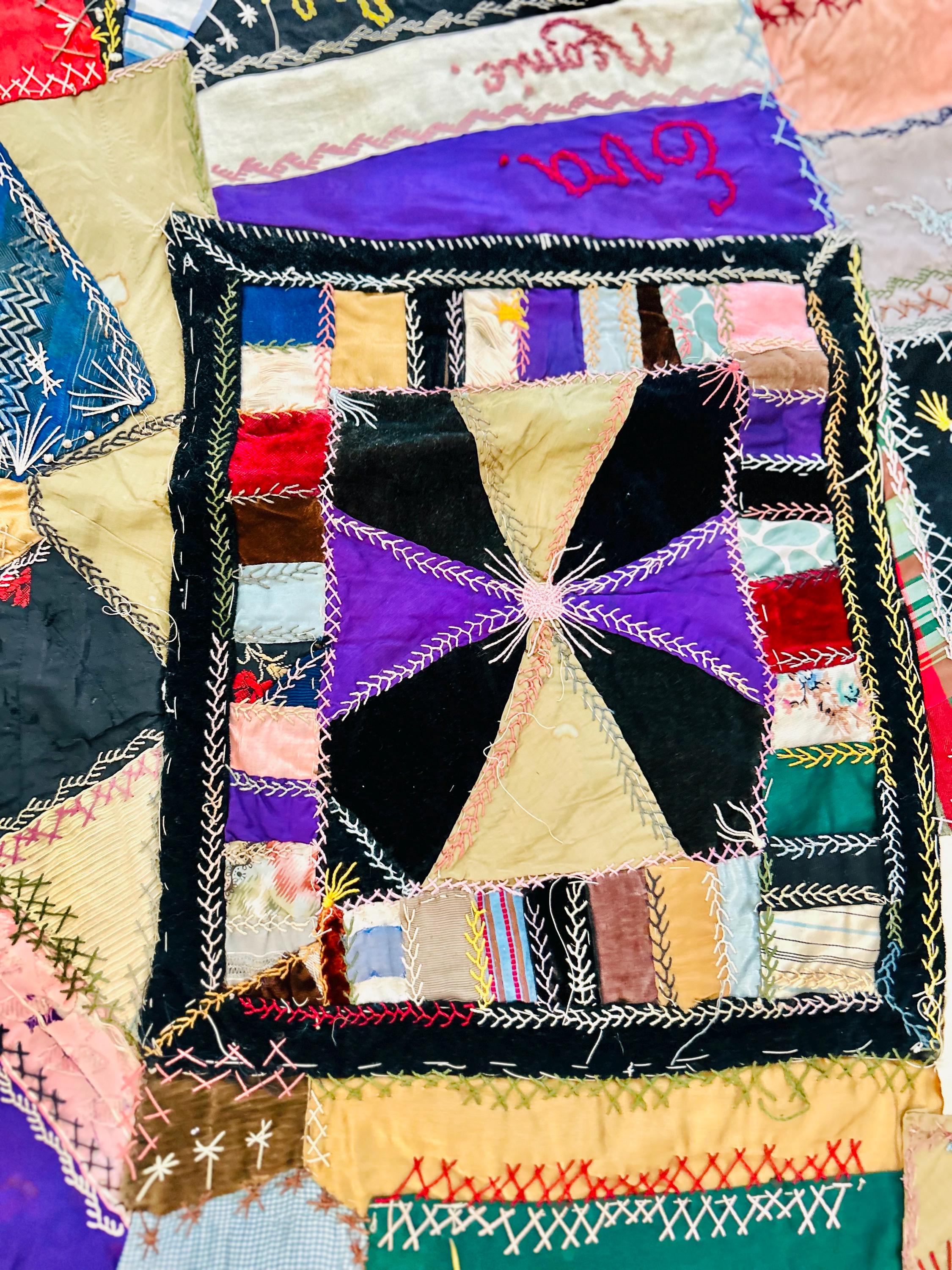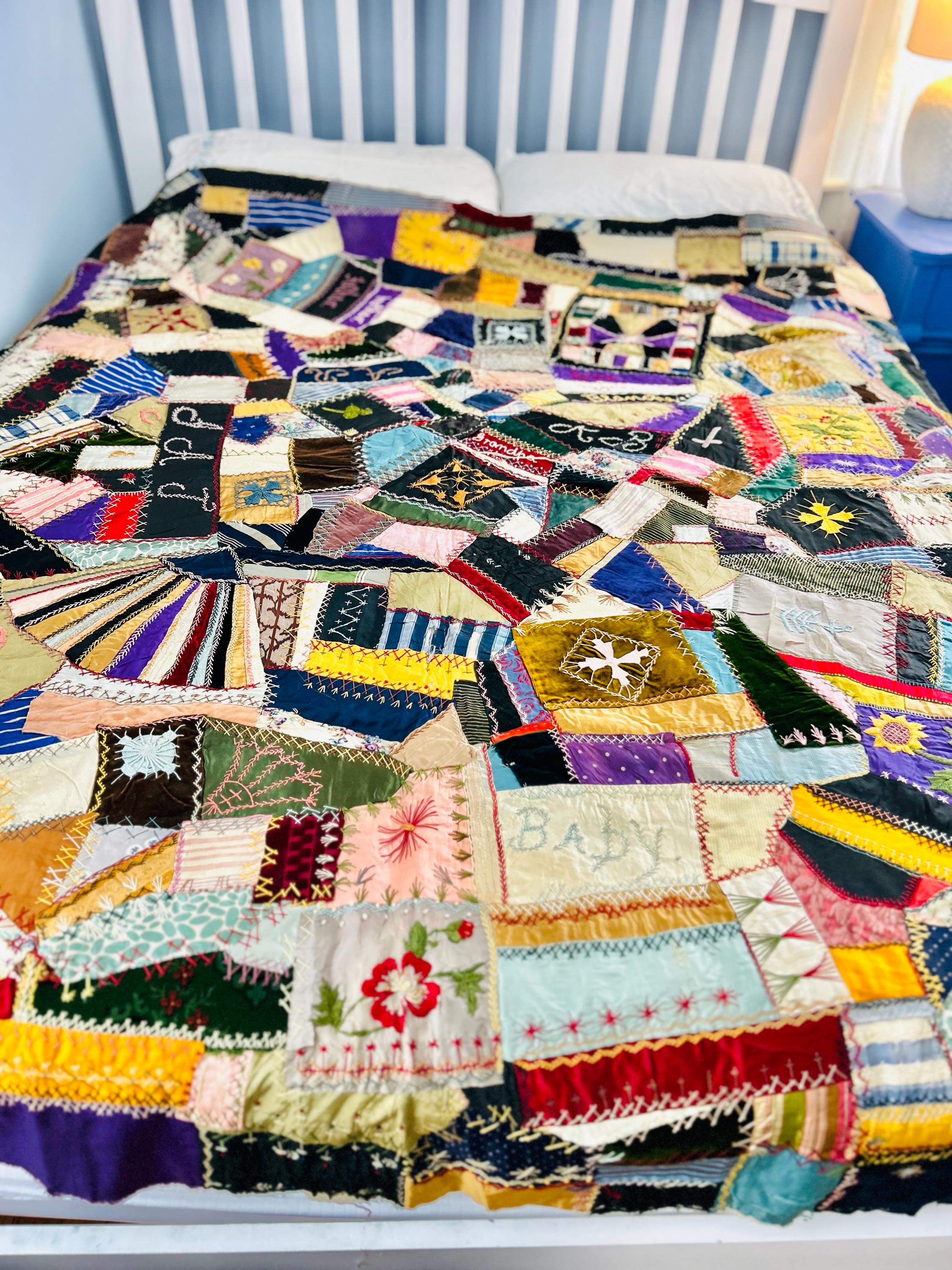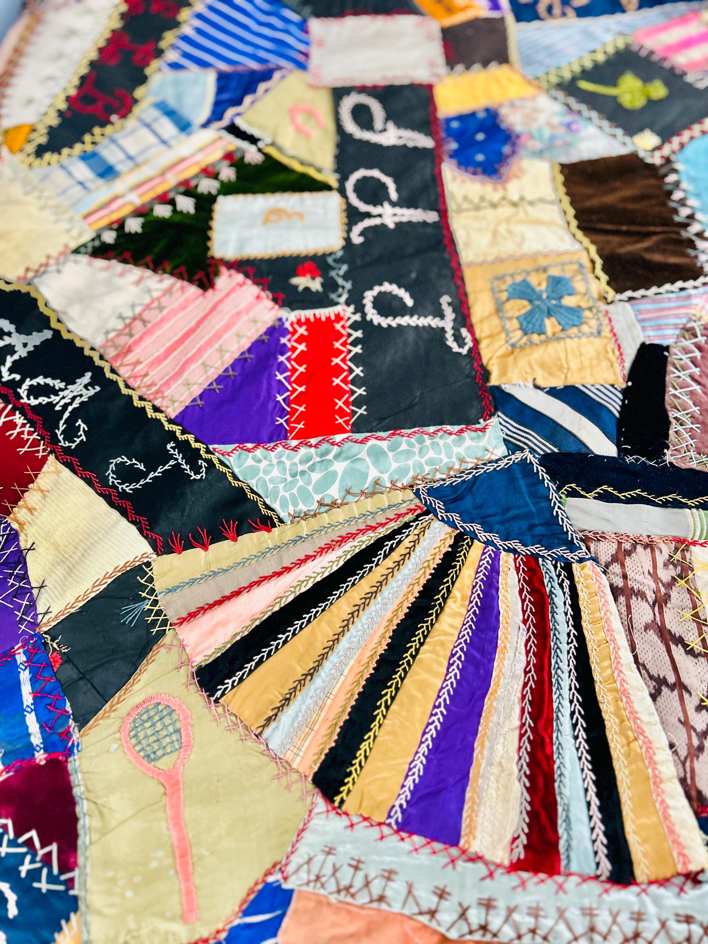 This is an elaborate and beautiful Crazy Quilt made sometime between 1890 and 1900. It has fans, embroidery, initials, names (including "Mother" and "Father"), flowers, and other embellishments filling up virtually every scrap of the top fabric. The fabrics are primarily satins and velvets with feedsacks used as the foundation - as can be seen on the back of the quilt (see photos).