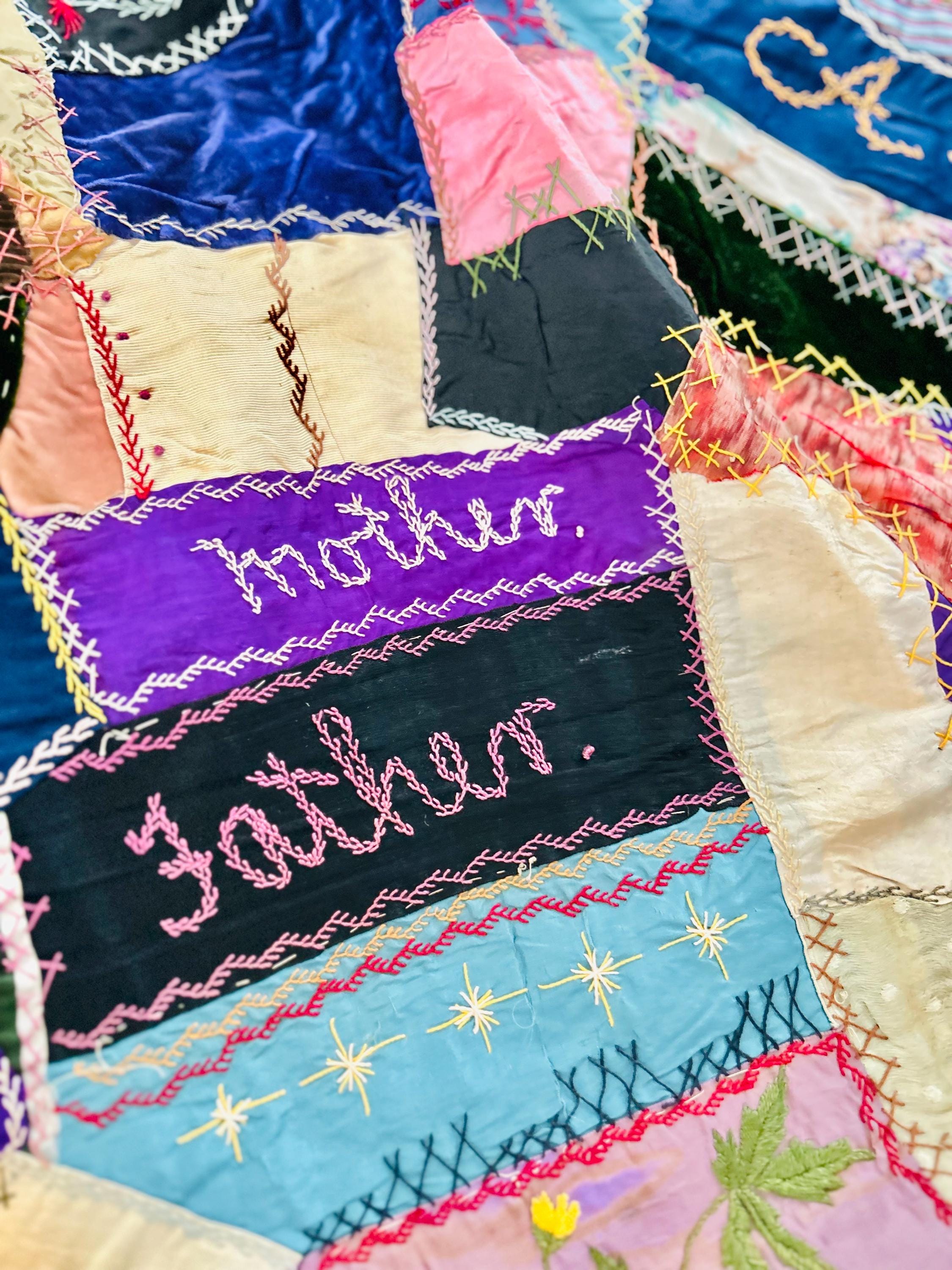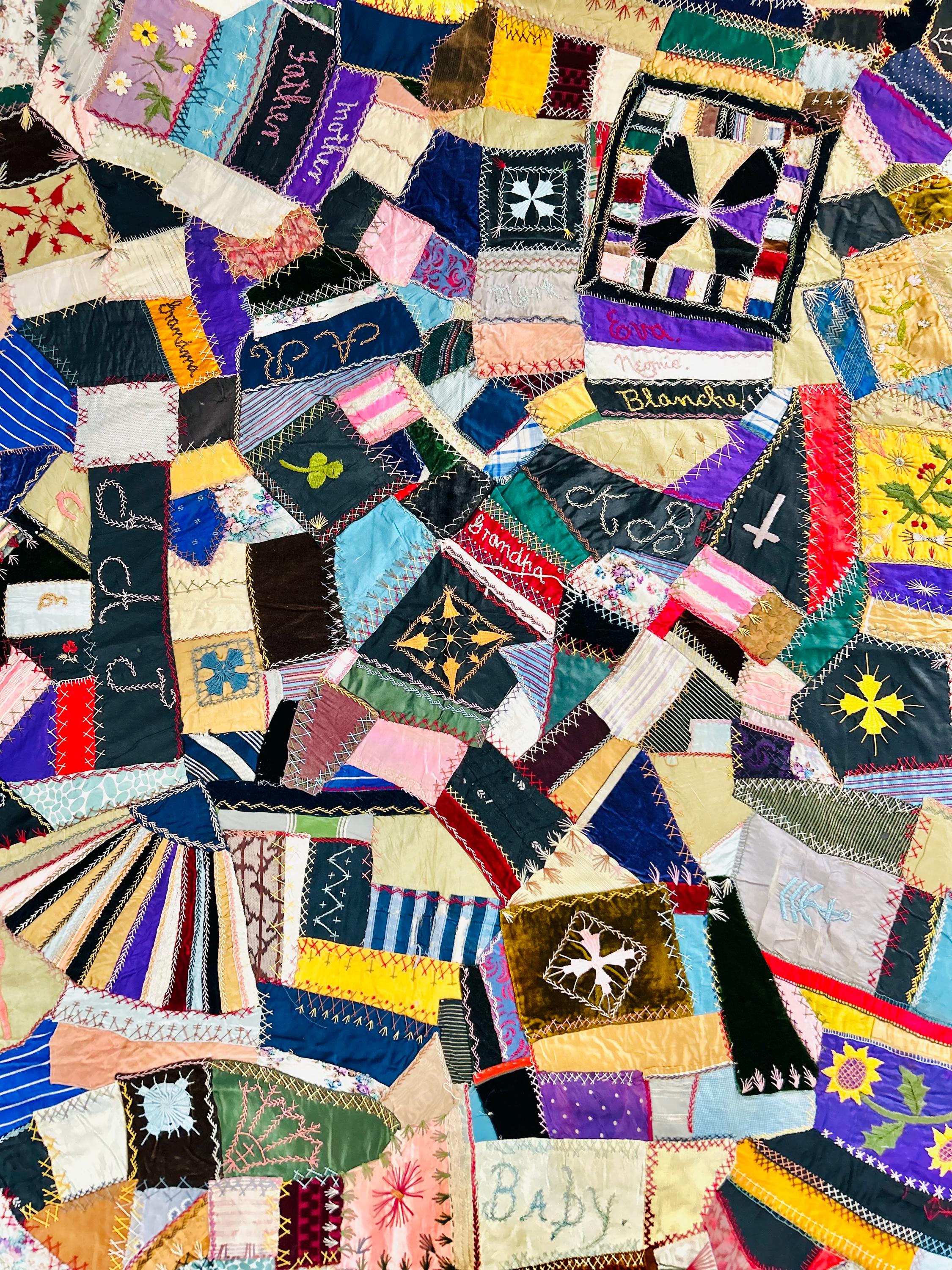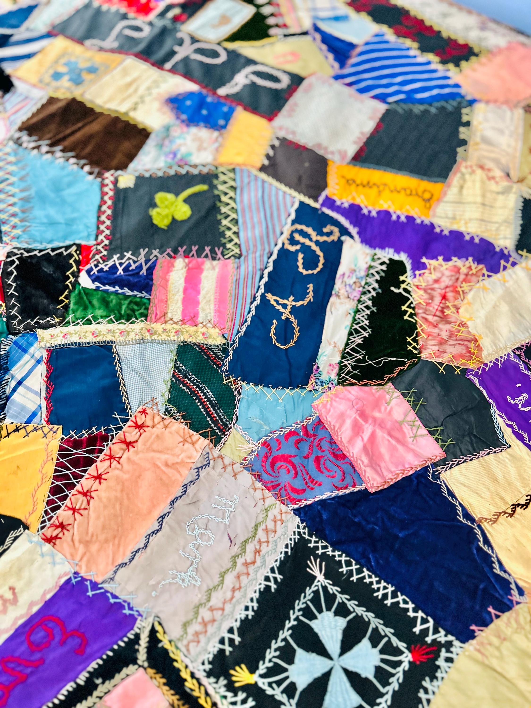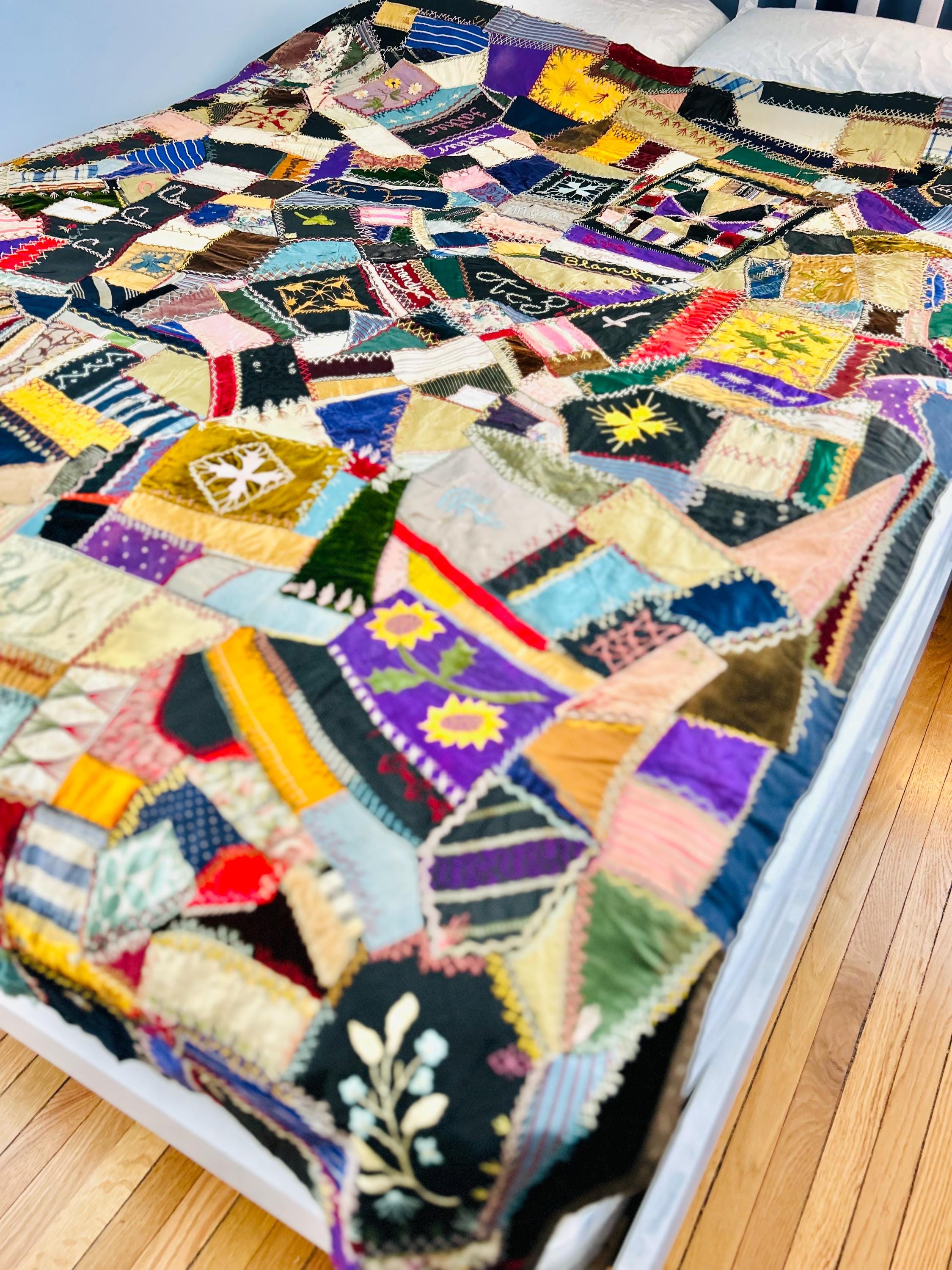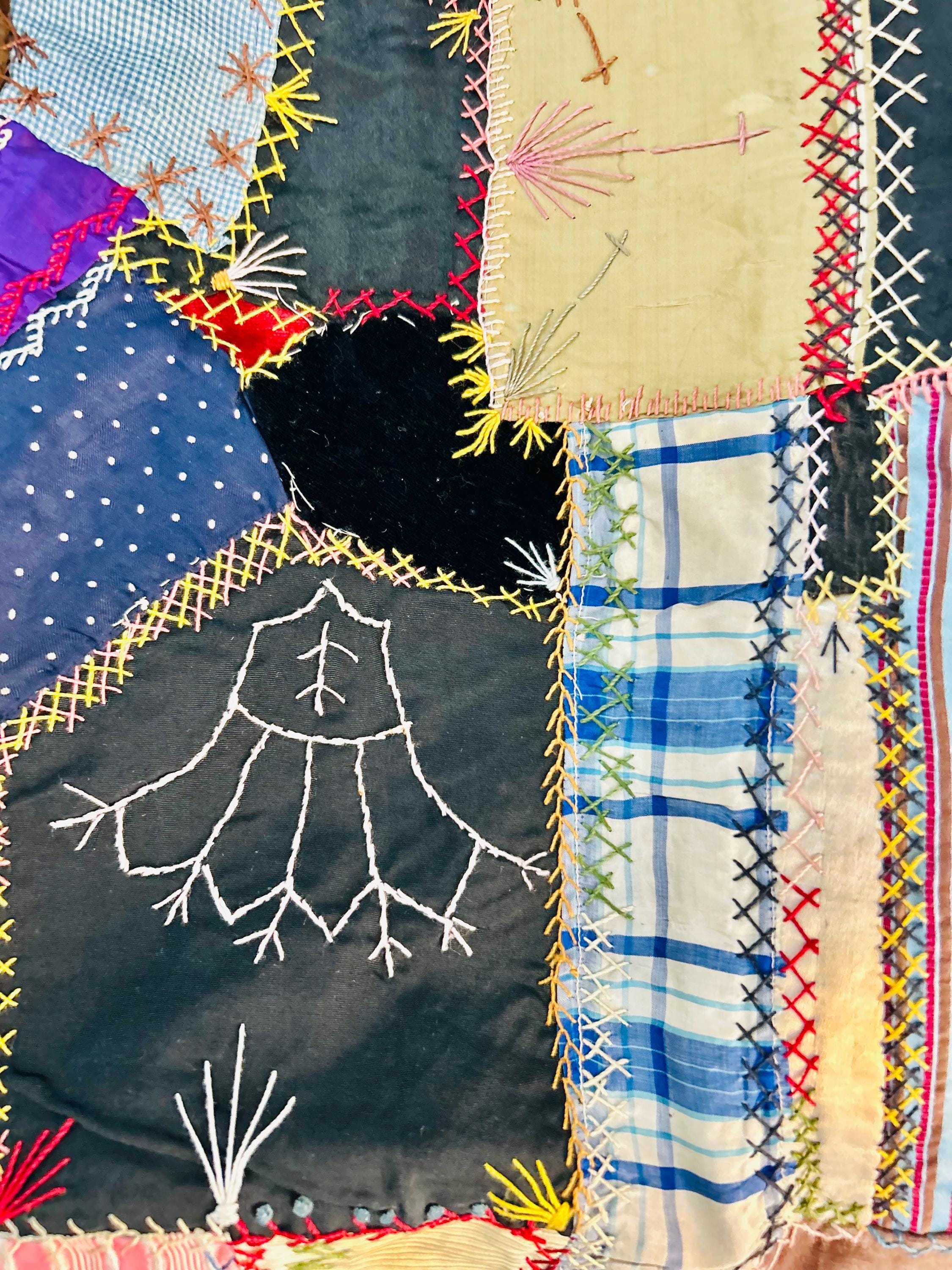 This is an elaborate and beautiful Crazy Quilt made sometime between 1890 and 1900. It has fans, embroidery, initials, names (including "Mother" and "Father"), flowers, and other embellishments filling up virtually every scrap of the top fabric. The fabrics are primarily satins and velvets with feedsacks used as the foundation - as can be seen on the back of the quilt (see photos).