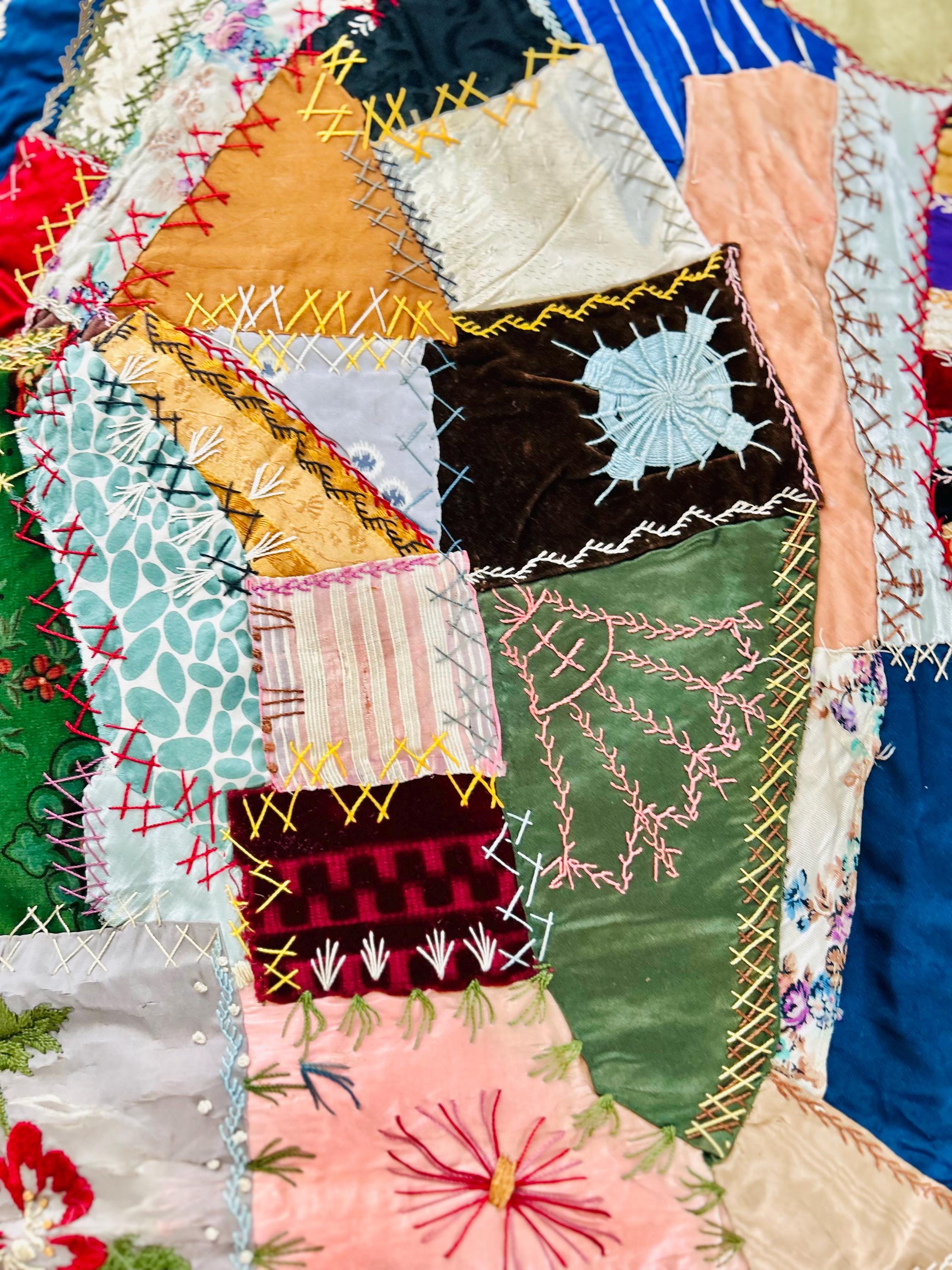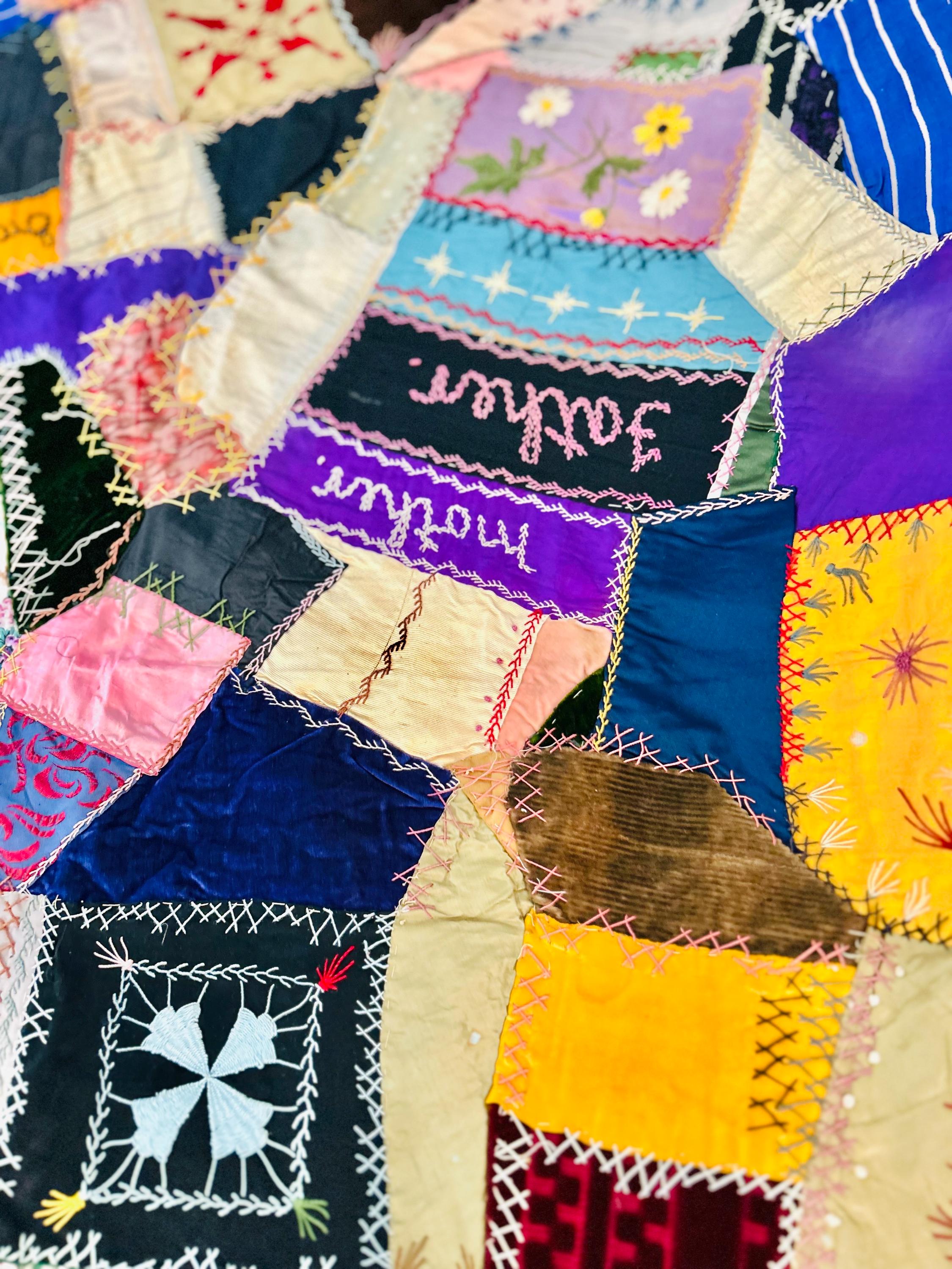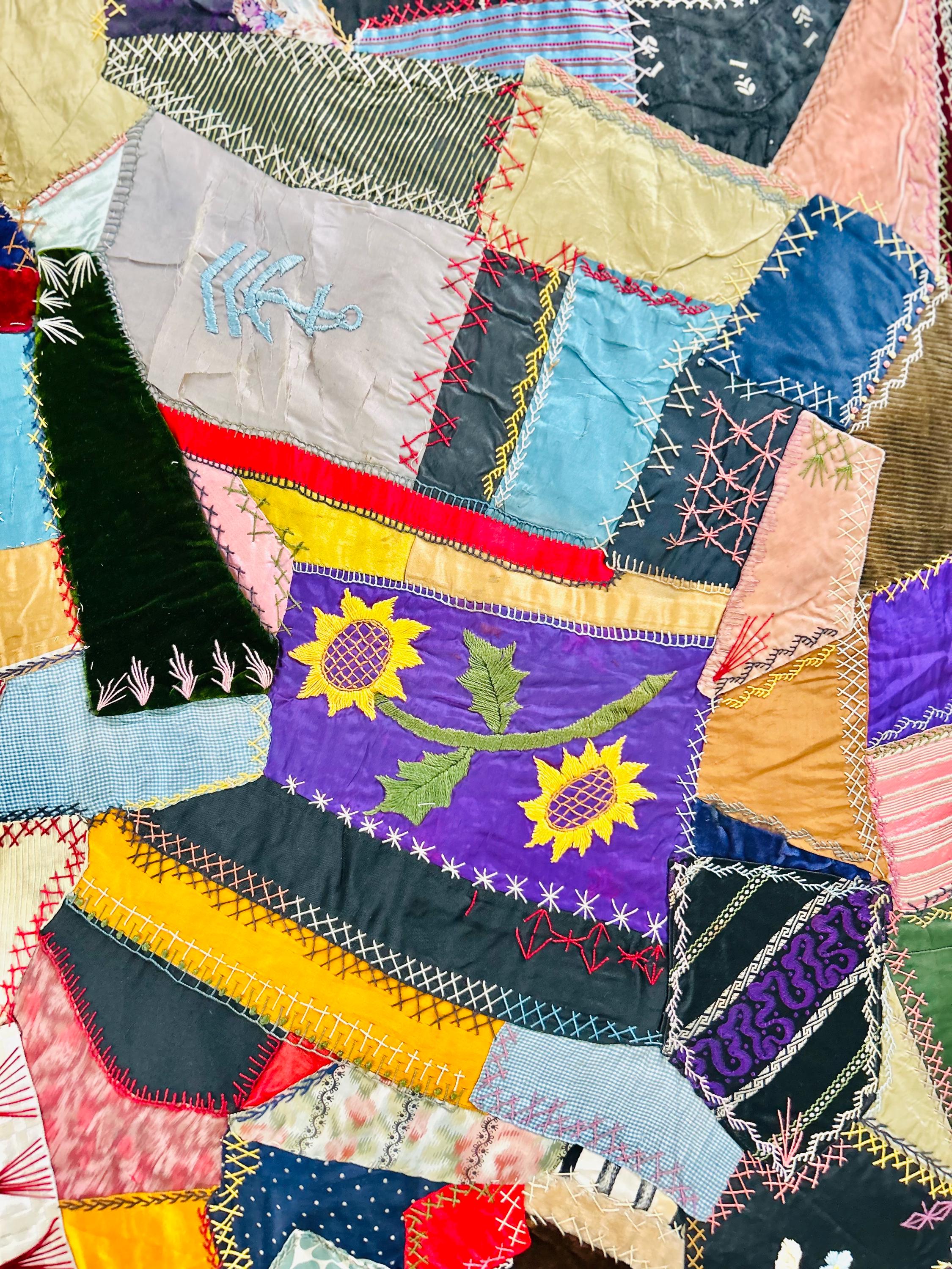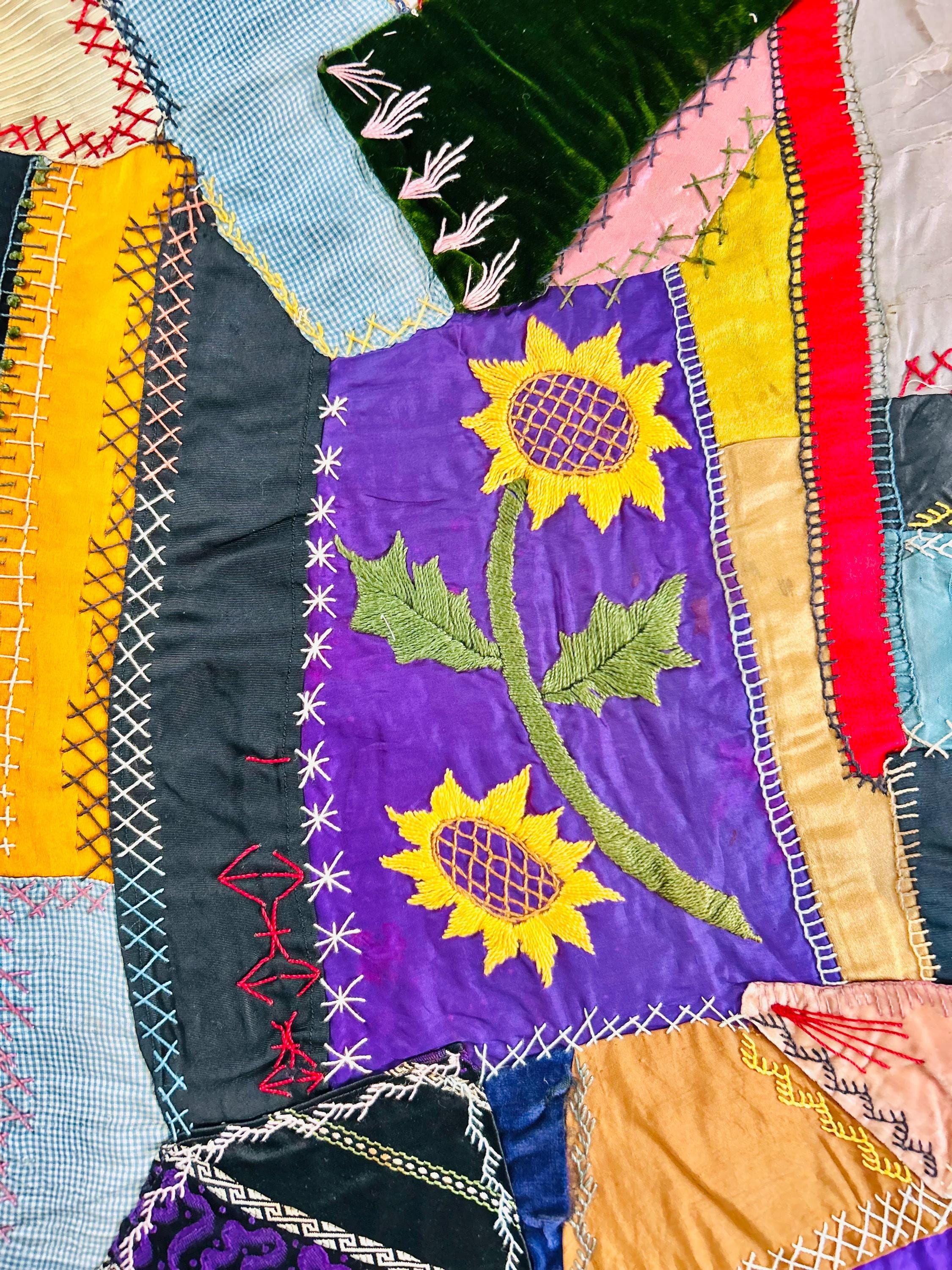 Like many crazy quilts, this one does not have a back except for the feedsacks, and there is no batting.