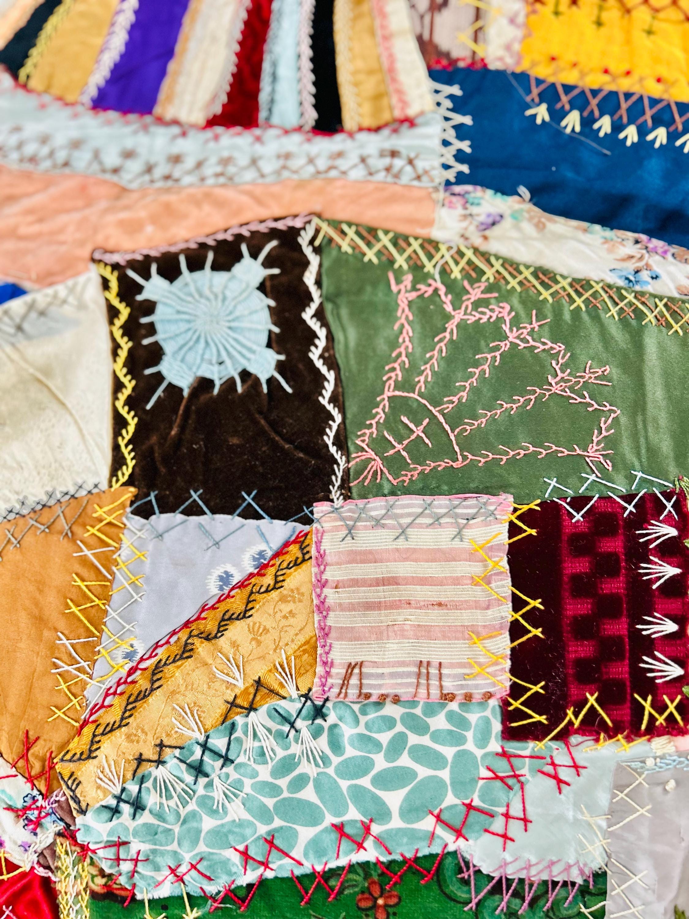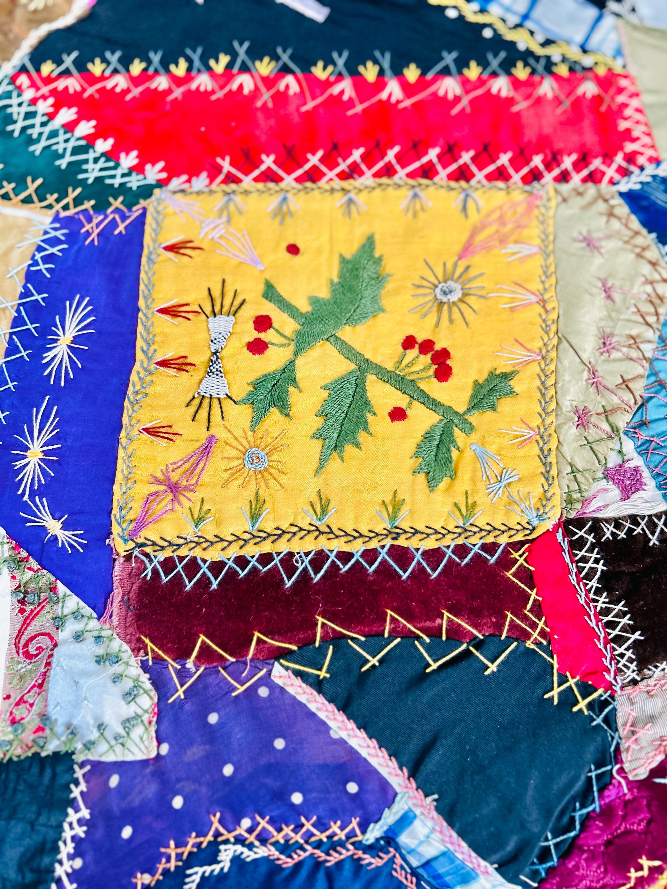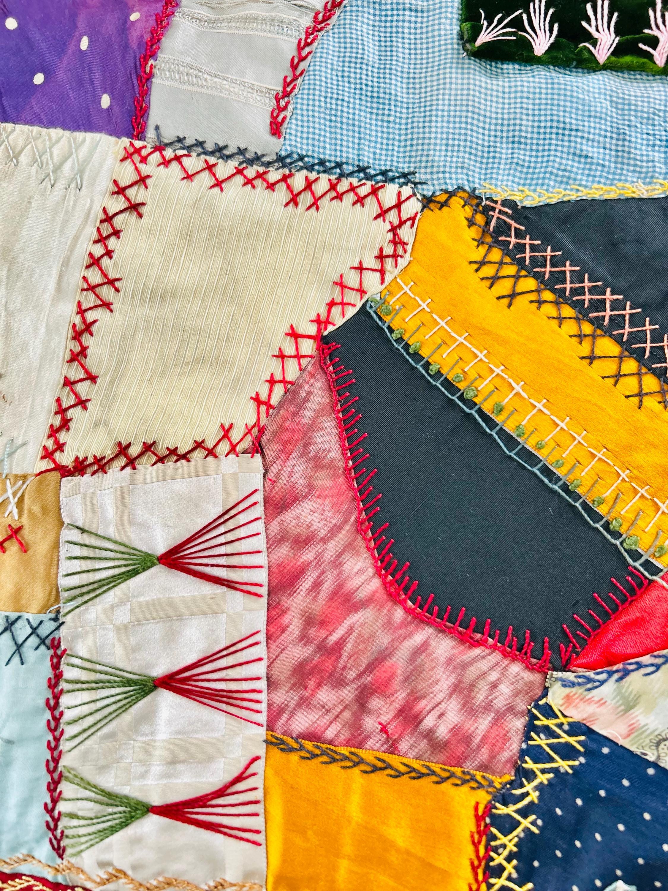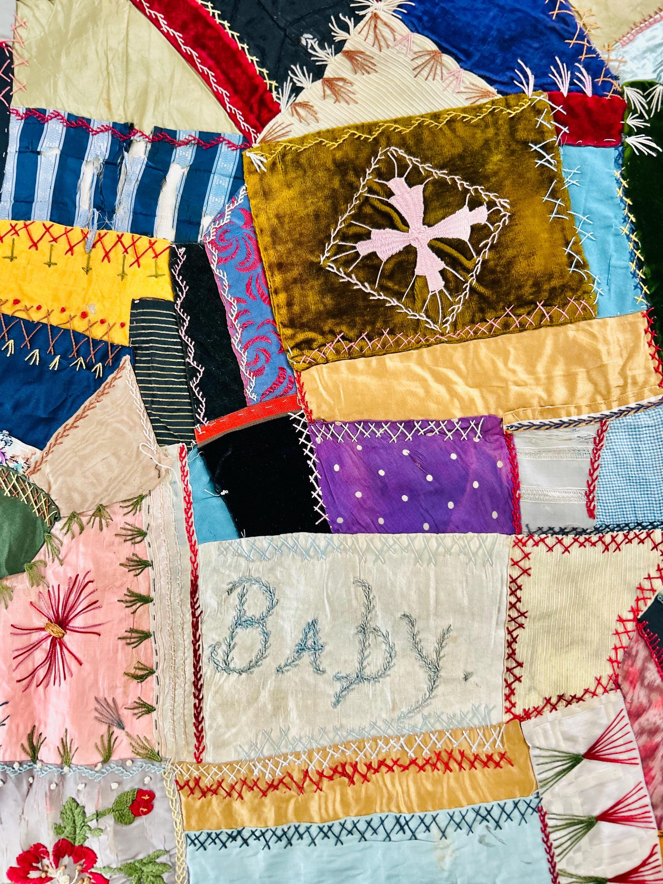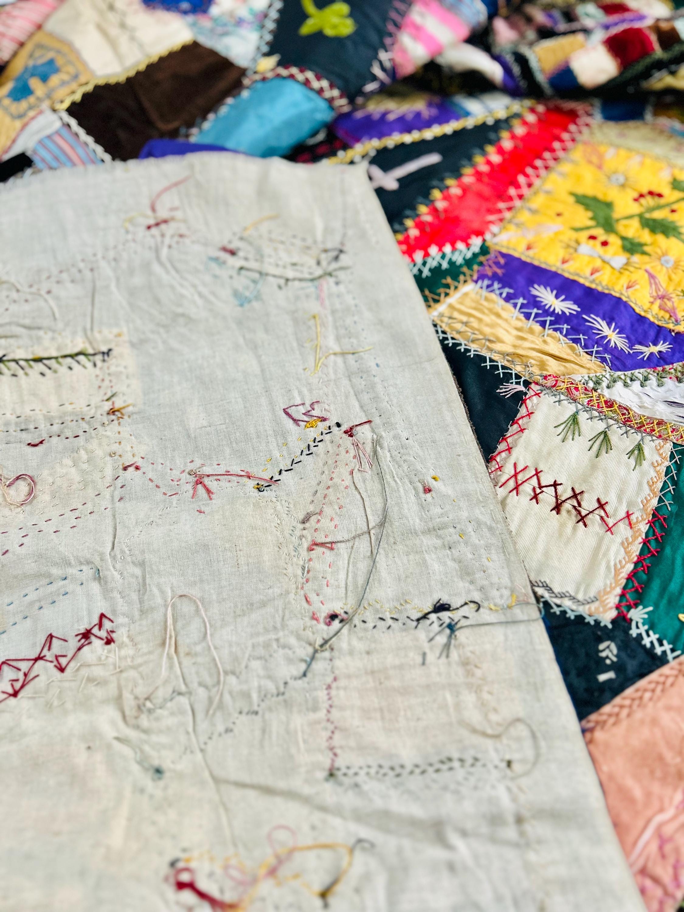 Like many crazy quilts, this one does not have a back except for the feedsacks, and there is no batting.