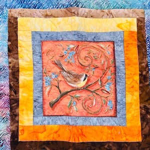 The back is an off-white tiny leaf print and the binding is yet another complementary fabric that matches the sleeve that's been added to the back for display purposes. The cotton-blend batting is lightweight.