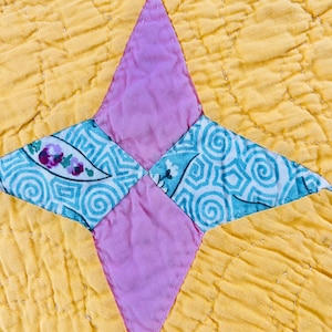 The quilt is in excellent, vintage condition, with some discolorations on the back that do not show on the front and some beginning fabric deterioration in a few of the diamond patches as shown in the photos.