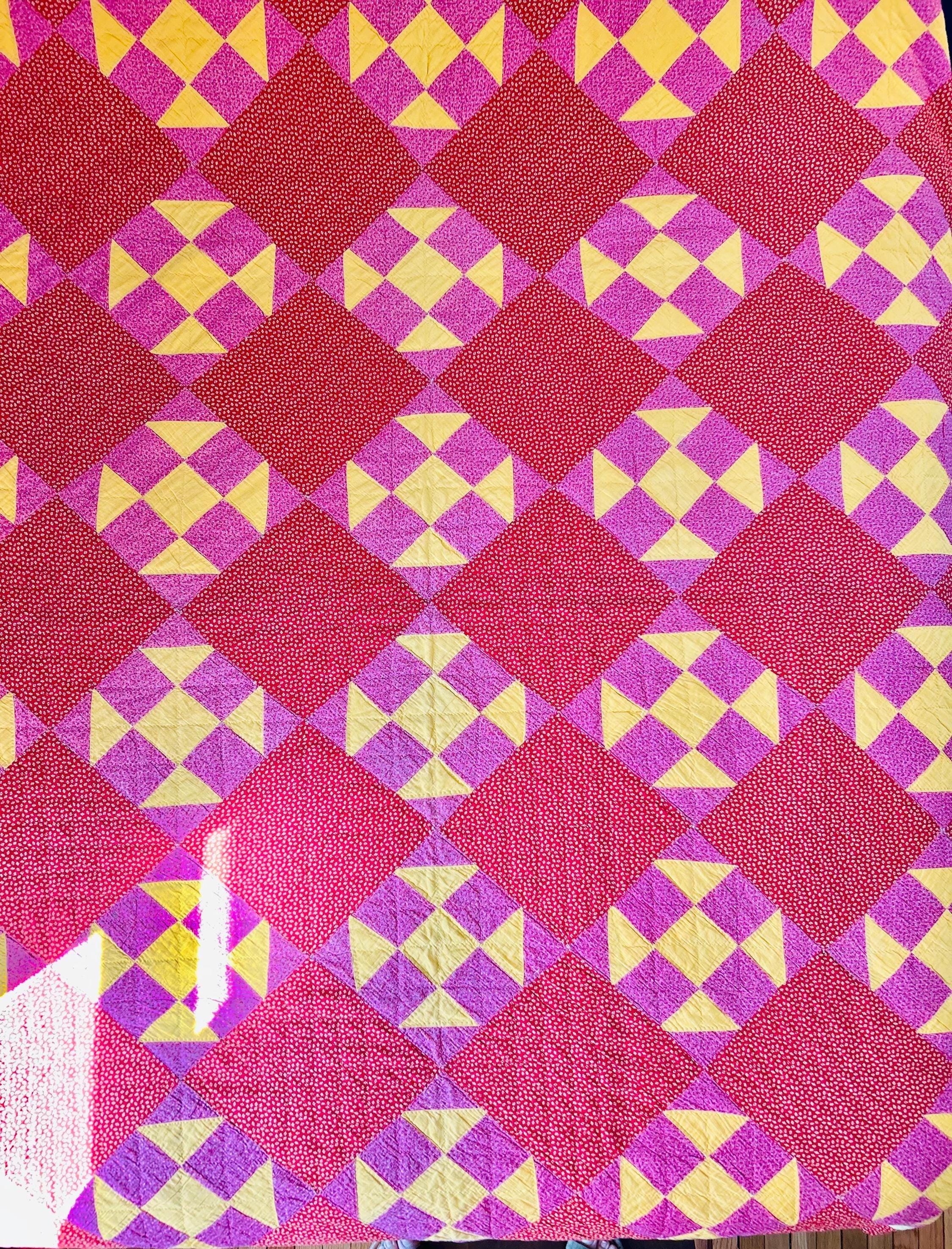 This Shoo Fly Antique Quilt is circa 1890s and is hand-quilted around the patchwork and in diagonals in the areas between the "shoo flies". It is quilted in a twisted rope pattern and in half-shells along the border.