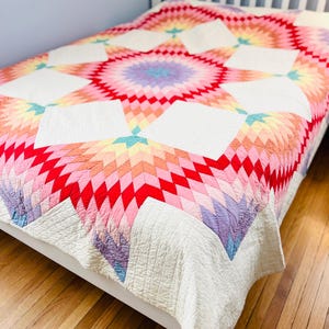 It is approximately 83 inches by 85 inches and comes from a smoke-free and pet-free home. Pictured on a queen-size bed. Display sleeve is sewn to back.