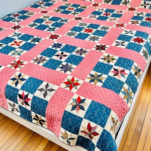 This Sunburst Star Antique Quilt is circa 1910-1920s and incorporates all of the right elements of a Sunburst Star quilt by progressing from light fabrics in the center to darker to light and back to darker again. The hand-quilting is dense and unique, with concentric circles through the diamonds that make up the Star and interlocking circles with very densely quilted centers in each of the white corners. The rest of the quilting in the body is in diamonds, with a rope pattern along the red border and diagonals through the white border.