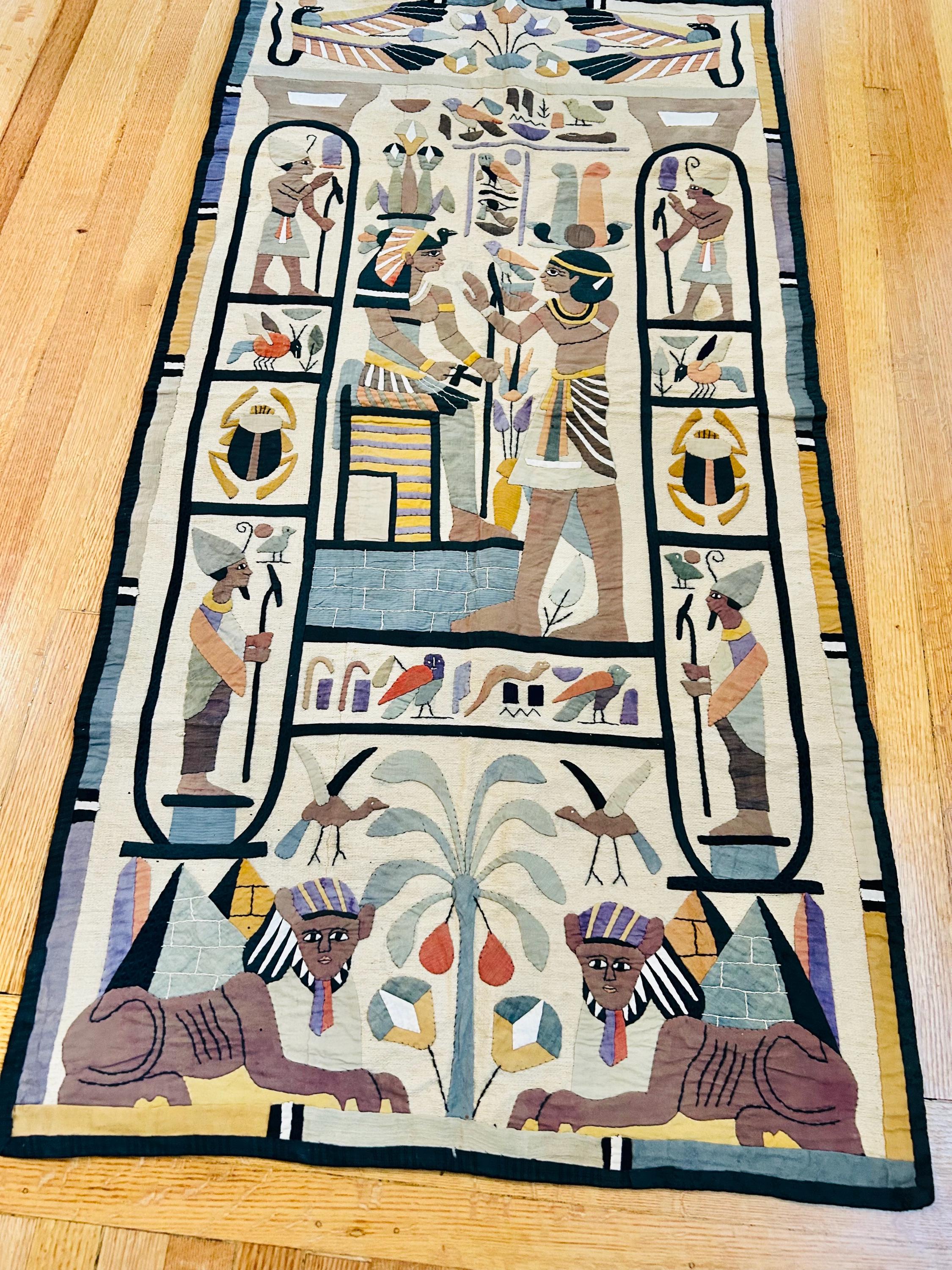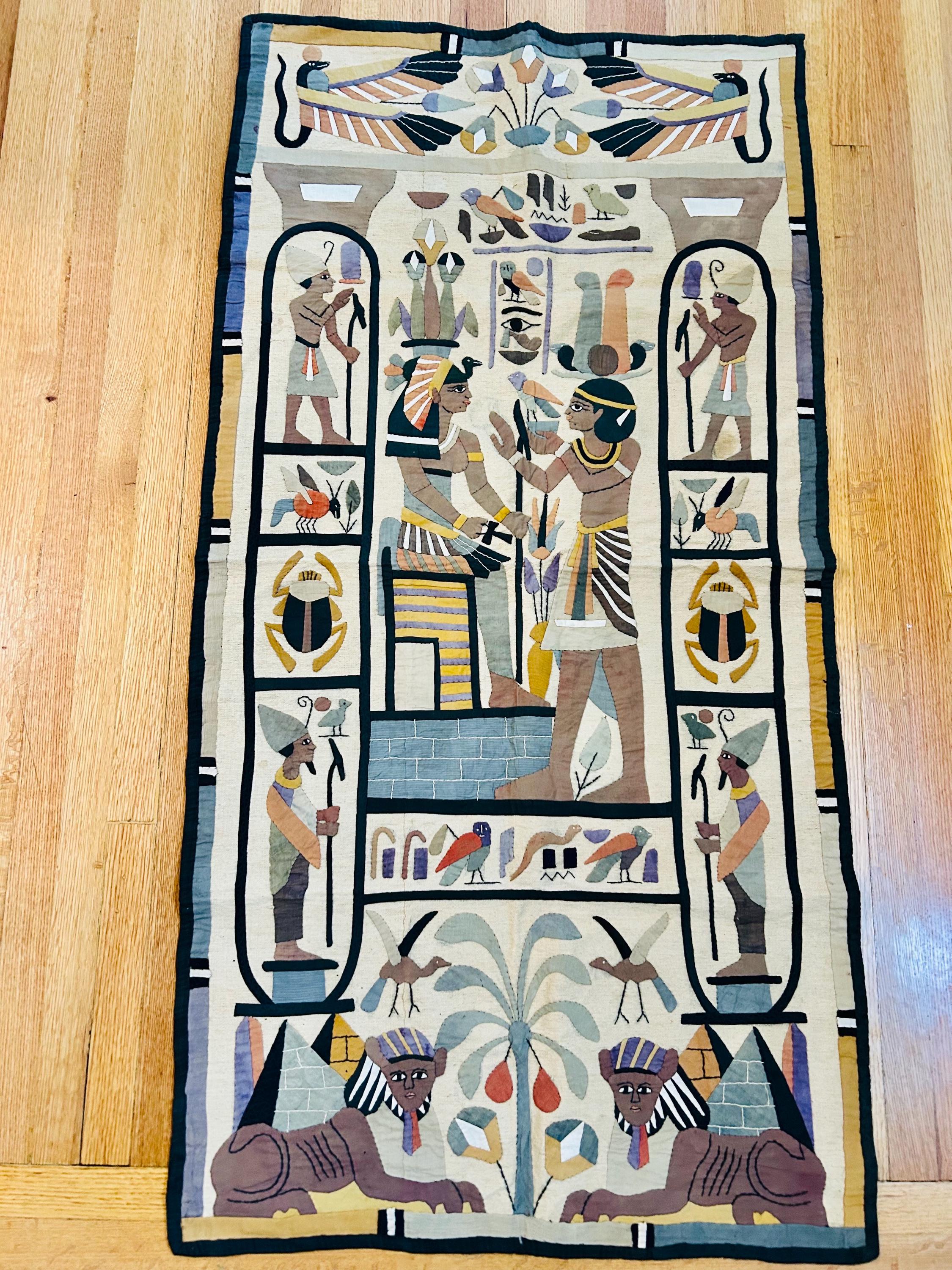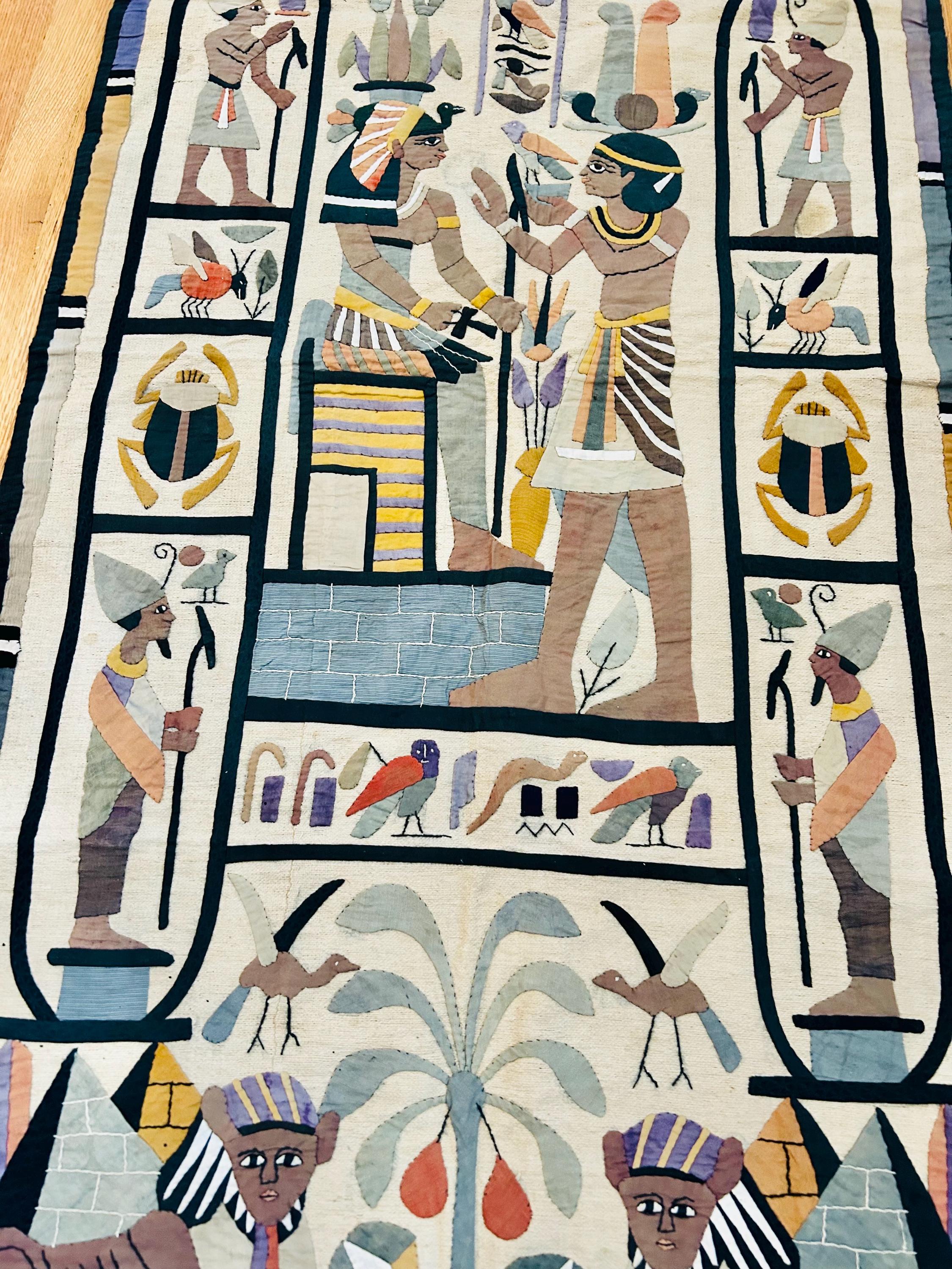 Intricate appliqued tent panels called "khayamiya" have been an art form in Egypt since at least medieval times. They are made by specially trained artisans for a variety of purposes: from massive tents for royal celebrations to small wall hangings for tourists. This is an example of a khayamiya made for tourists sometime between 1900 and the early 1920s. Egyptian art was very popular at that time and became even more so after the discovery of Tutankhamun's tomb in 1922.