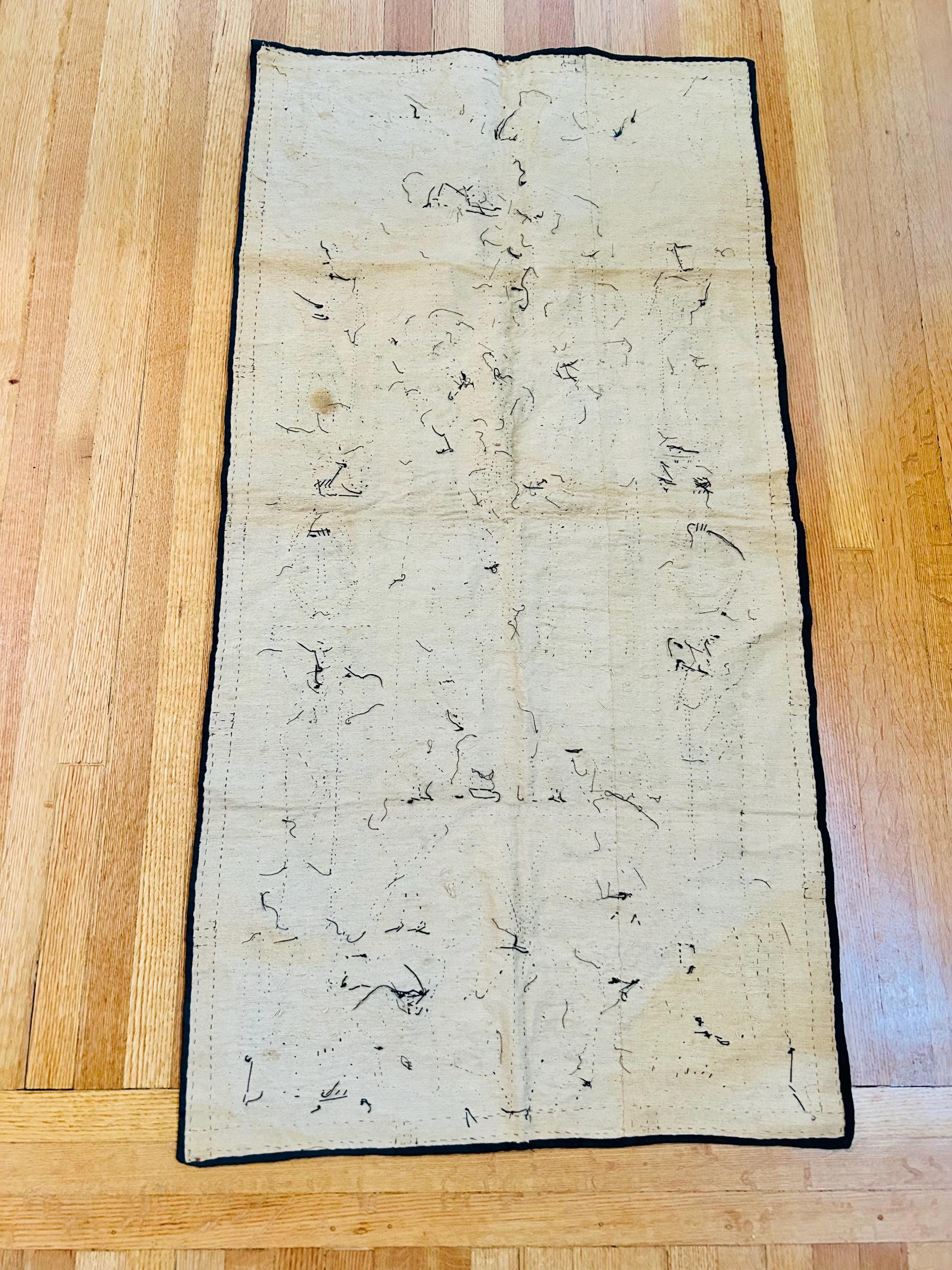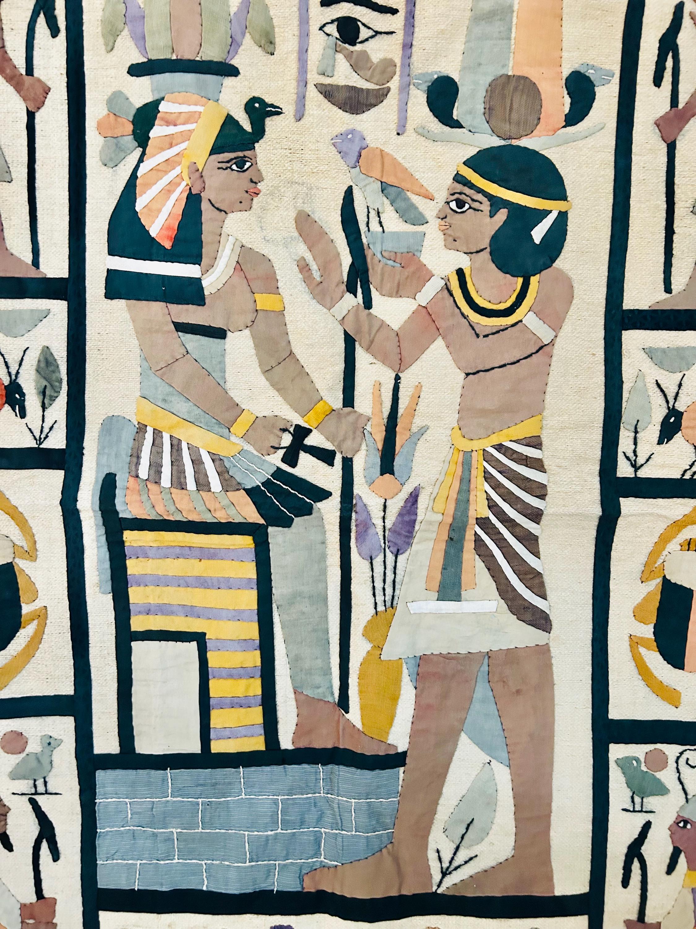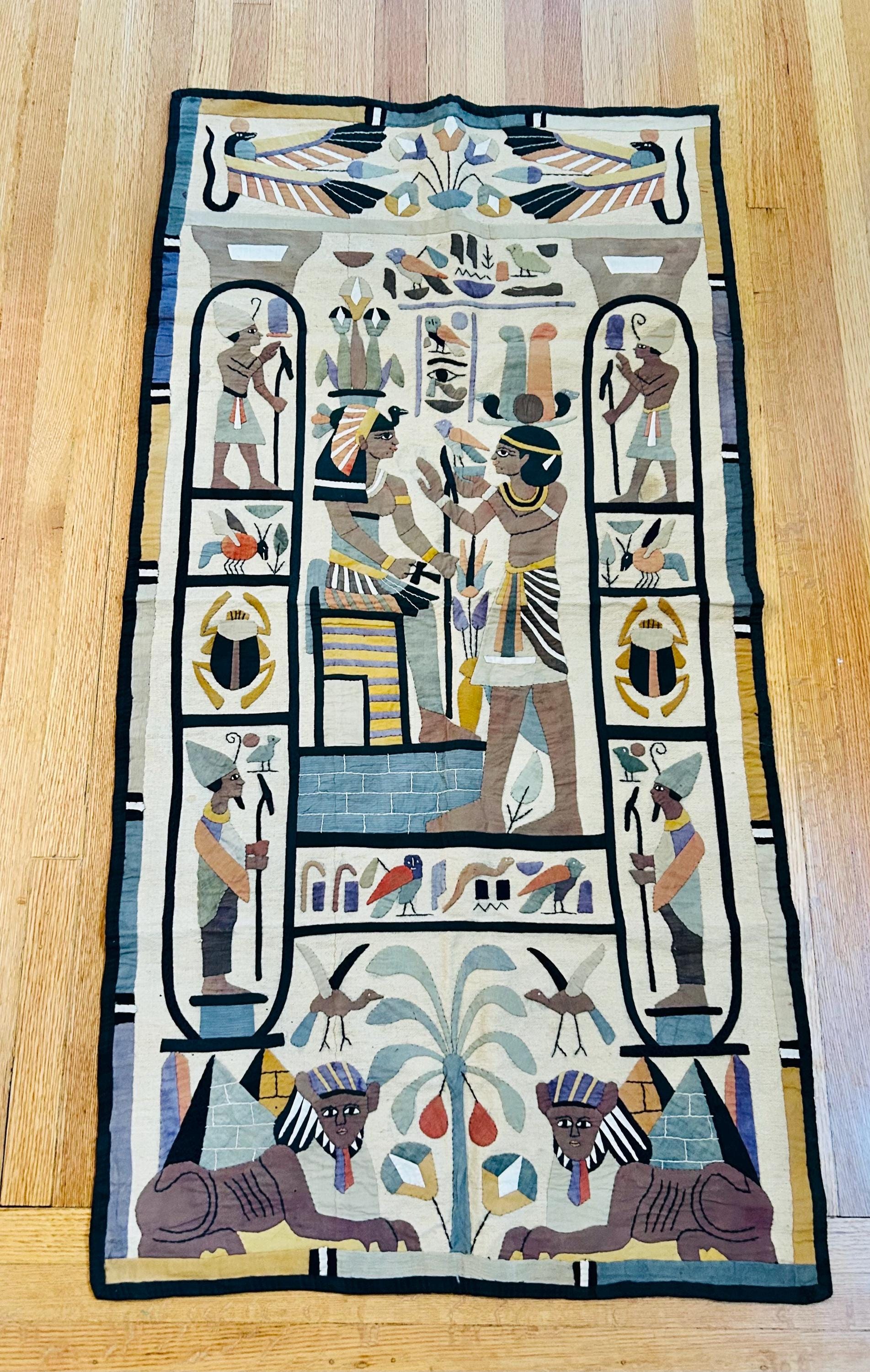 Intricate appliqued tent panels called "khayamiya" have been an art form in Egypt since at least medieval times. They are made by specially trained artisans for a variety of purposes: from massive tents for royal celebrations to small wall hangings for tourists. This is an example of a khayamiya made for tourists sometime between 1900 and the early 1920s. Egyptian art was very popular at that time and became even more so after the discovery of Tutankhamun's tomb in 1922.
