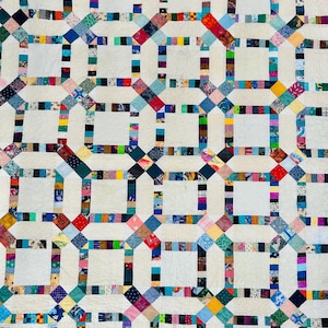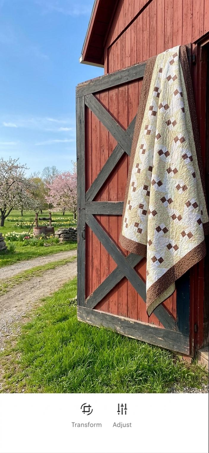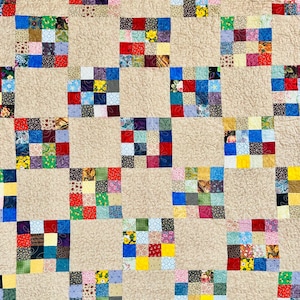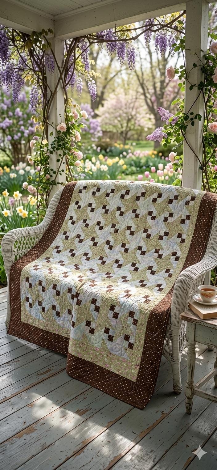 This beautiful Milky Way Quilt, circa 2000, is made of high-quality cottons and has been expertly long-arm quilted in swirls and curly cues. The polka-dot hazel/brown border goes around all four sides.