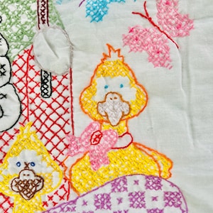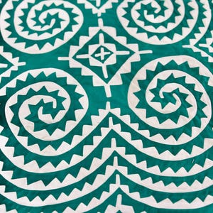 The back is a bright blue geometric pattern while the binding is a very pale pink and white heart pattern. The batting is lightweight.