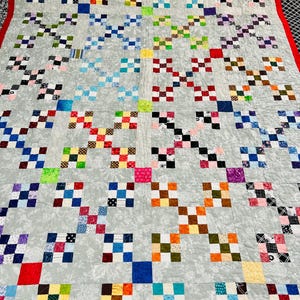 The back is a deep red and black cotton print as is the binding which has been machine stitched to the front and hand-stitched to the back. The batting is lightweight.