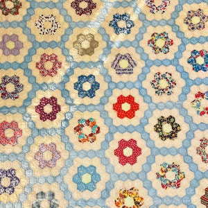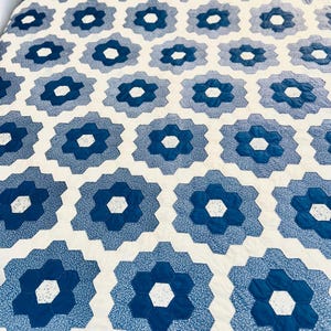 The back is white cotton, while the binding is blue cotton that has been machine stitched to the back and hand-stitched to the front. The cotton batting is lightweight.