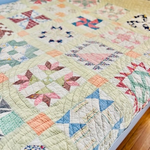 This Bowtie Quilt, circa 1930s, has been hand-stitched and hand-quilted in outlines of the patchwork.