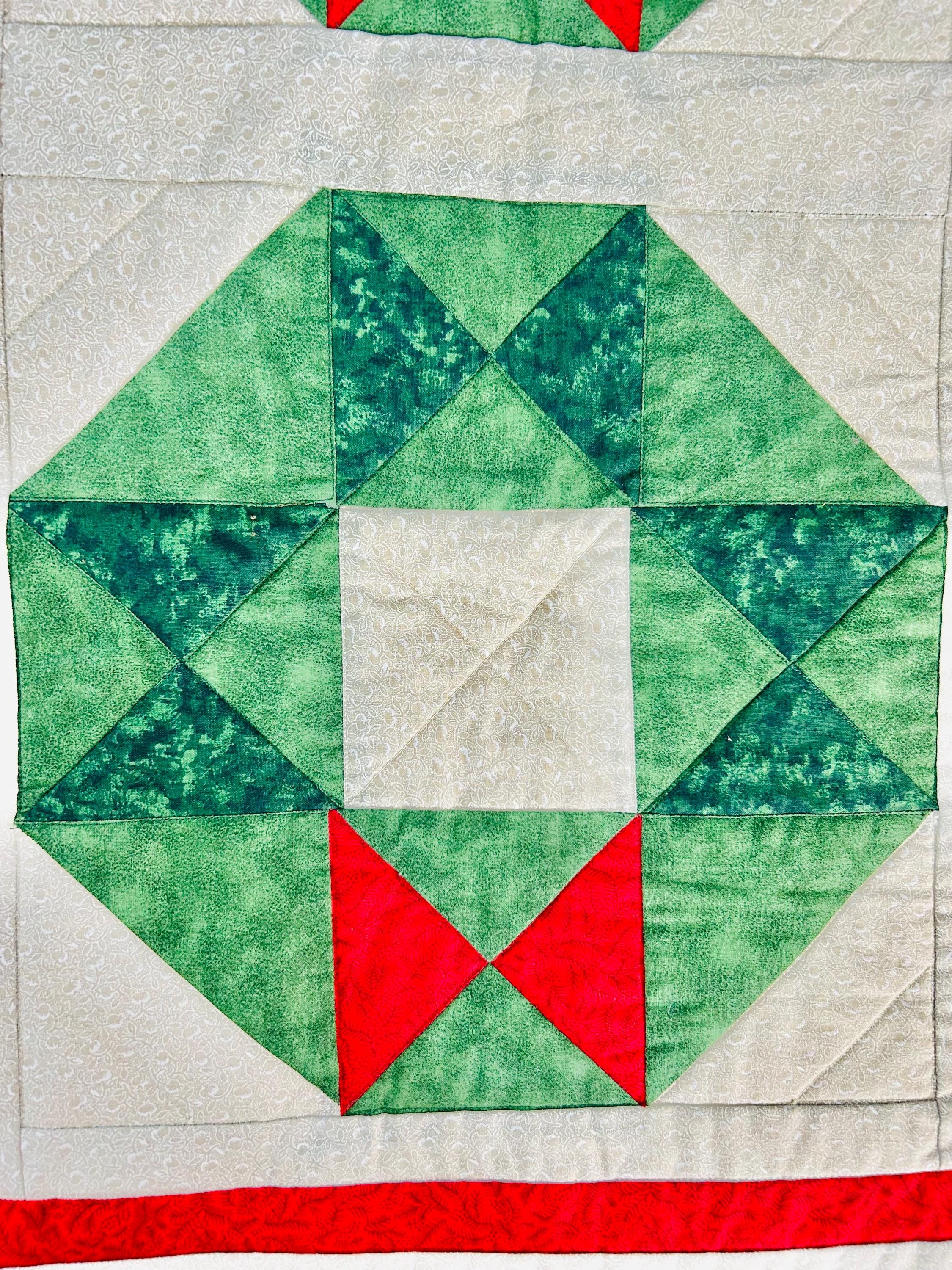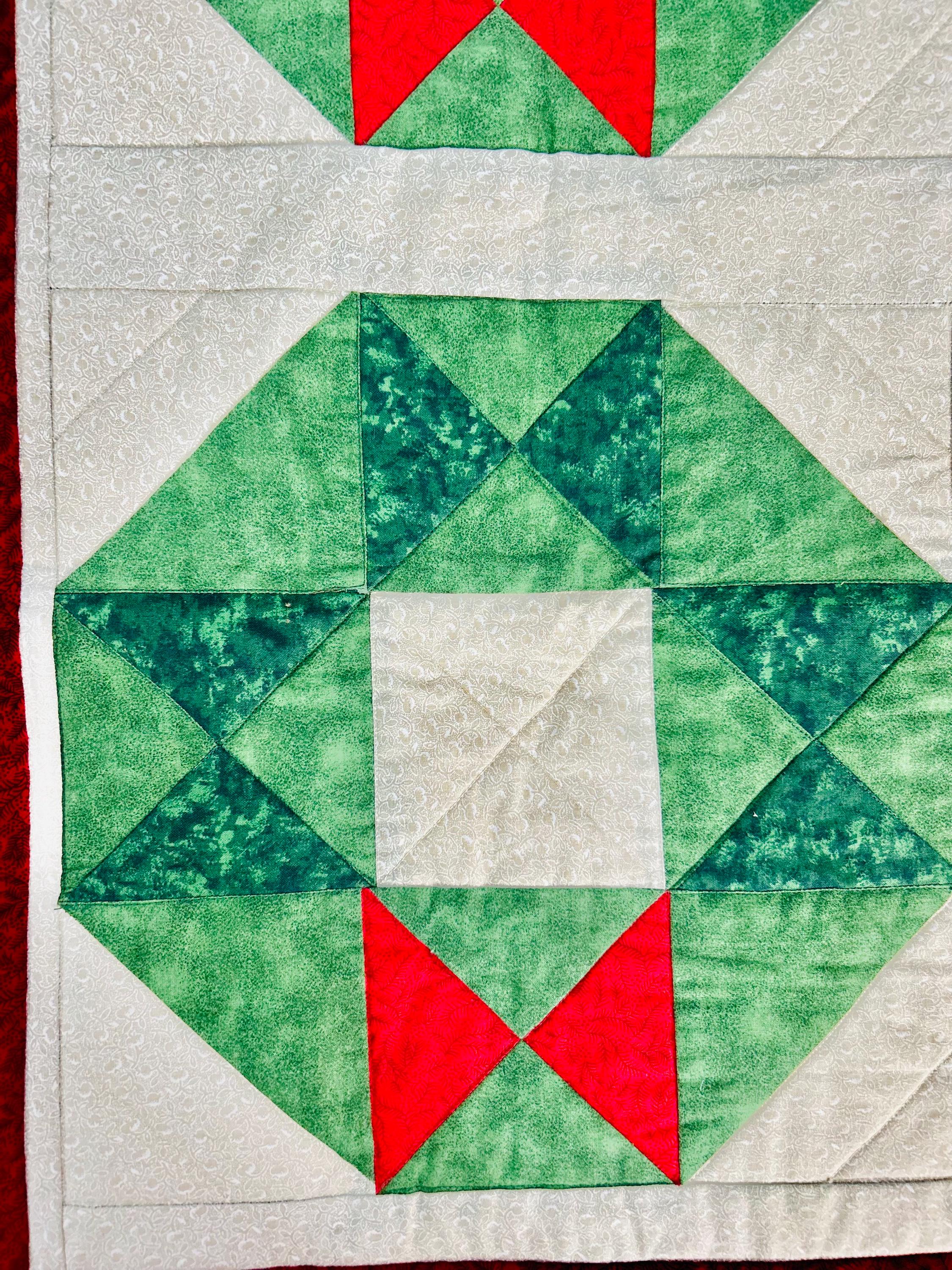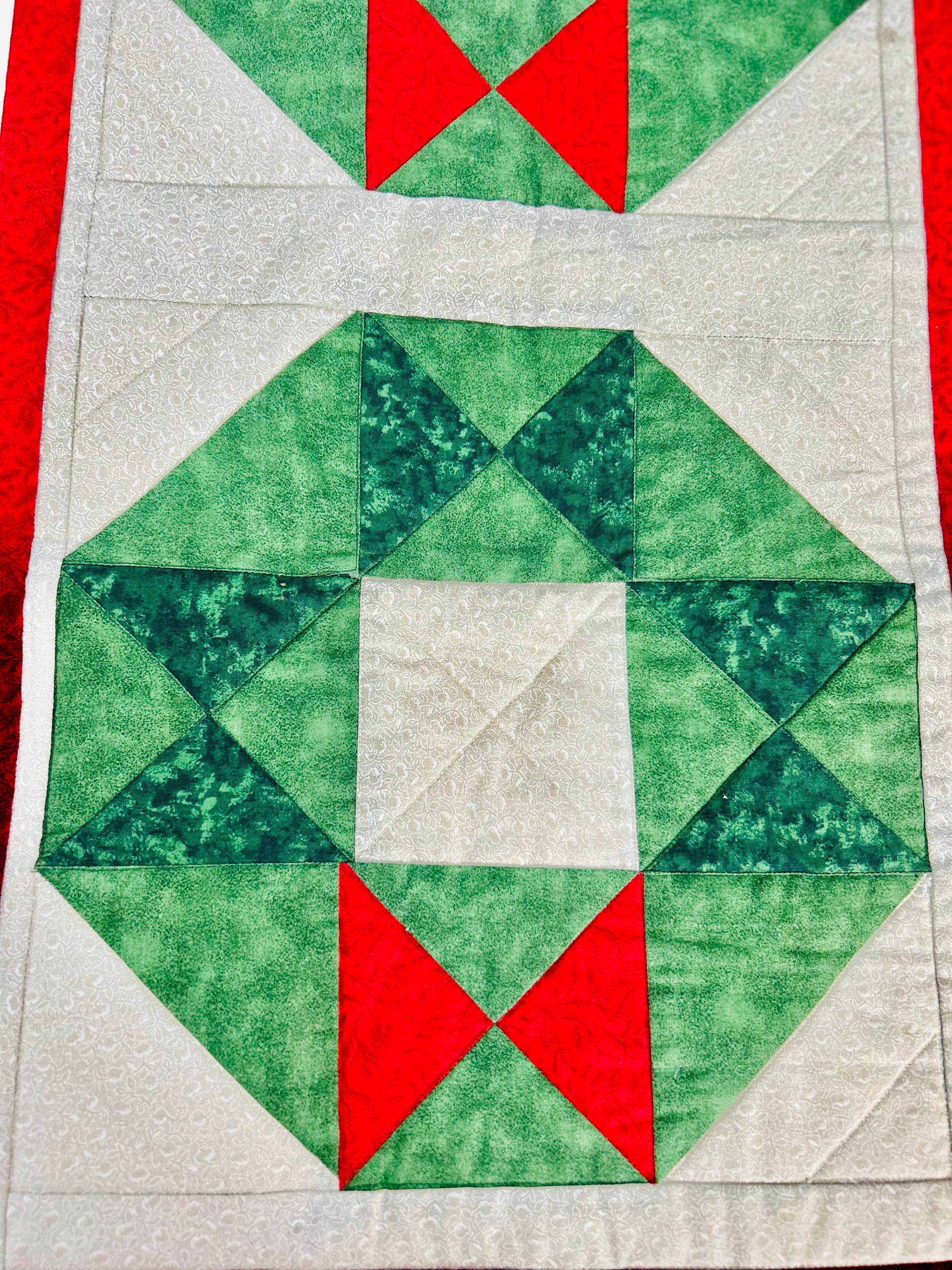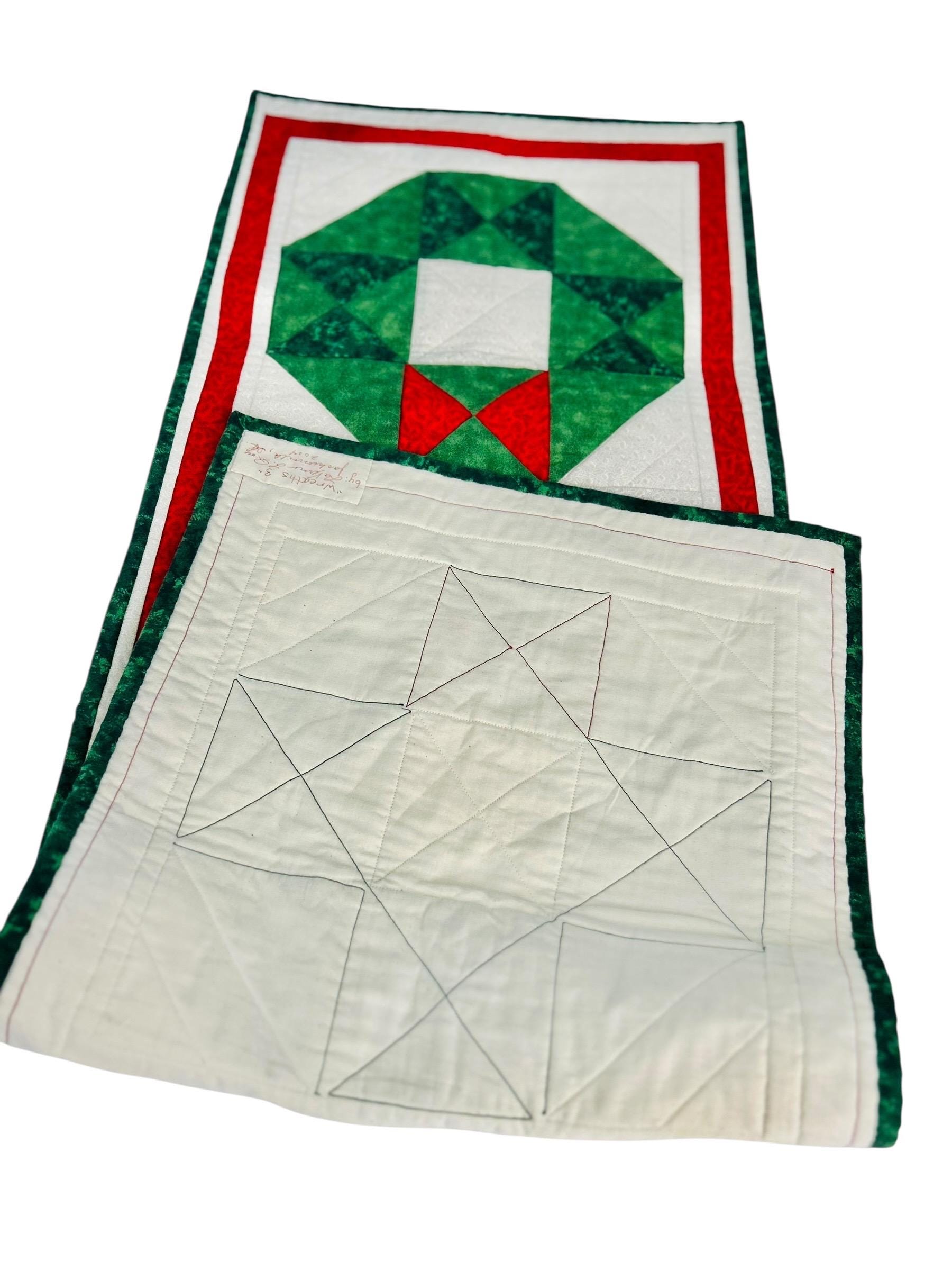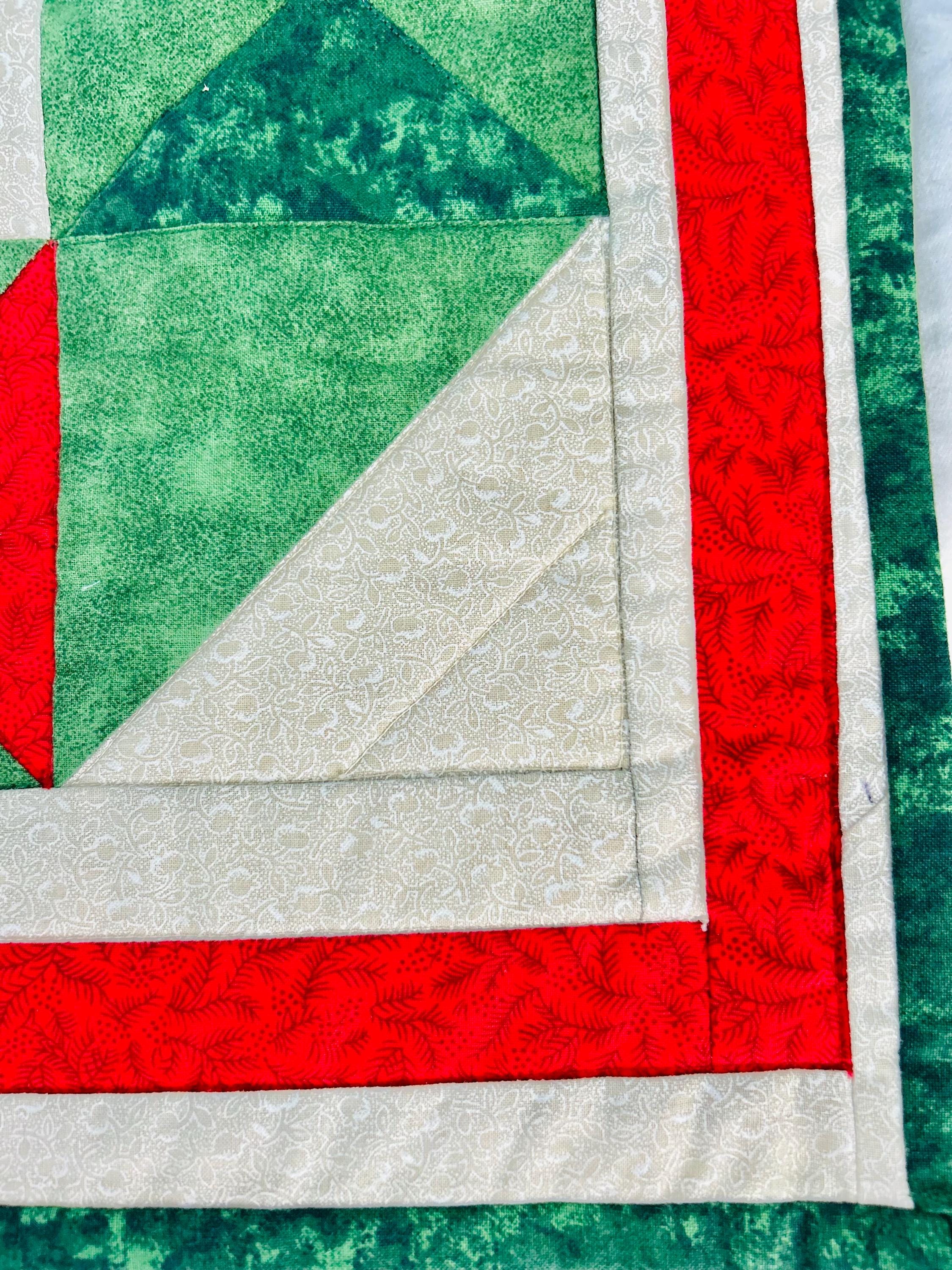 This is a Vintage Handmade Christmas Tree Table Runner or Table Mat that has been machine pieced and machine quilted in high-quality cottons. The back is a dark green and the batting is very lightweight.