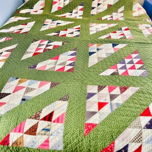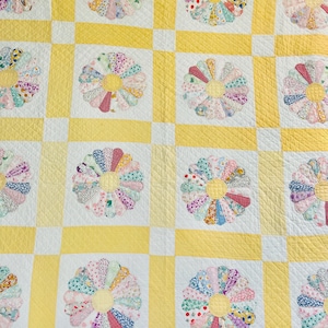 This lively Tree of Paradise Quilt is circa 1930s-1940s and has been pieced from a variety of eclectic blue, red, green, pink and yellow florals and bordered on all four sides by a yellow and red flower border. It is hand-quilted in arches and shells.
