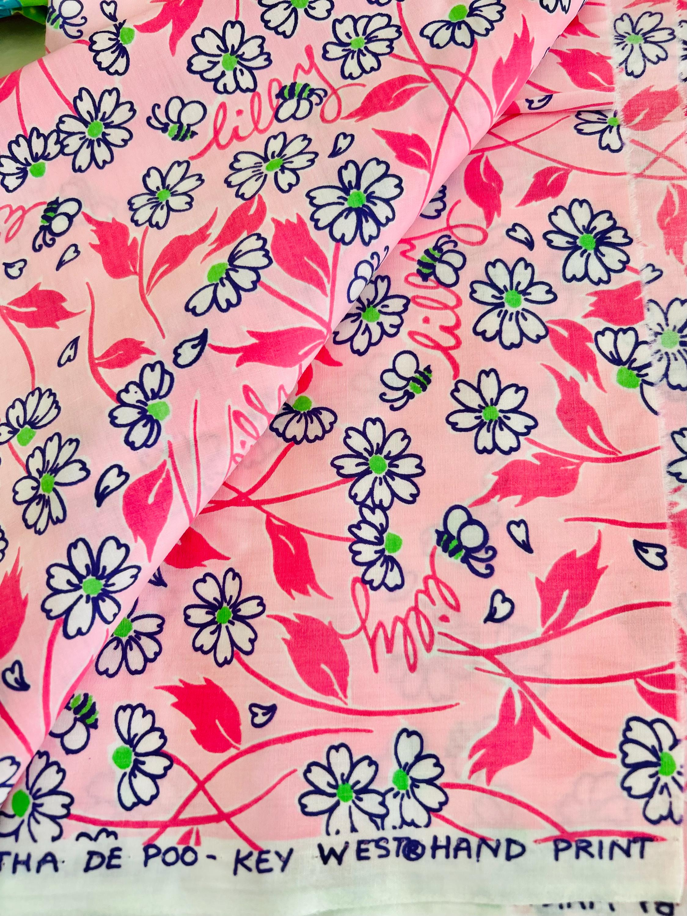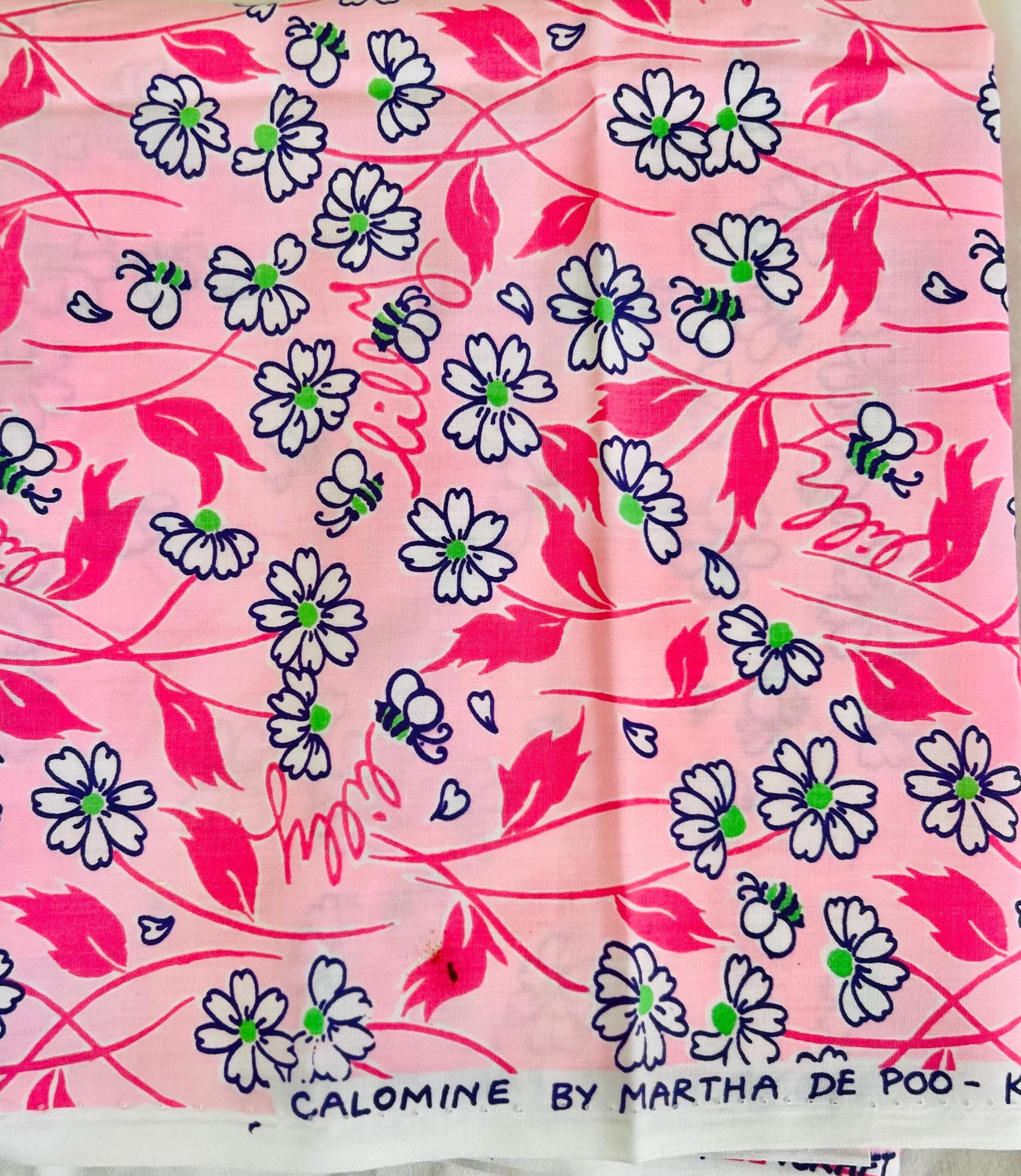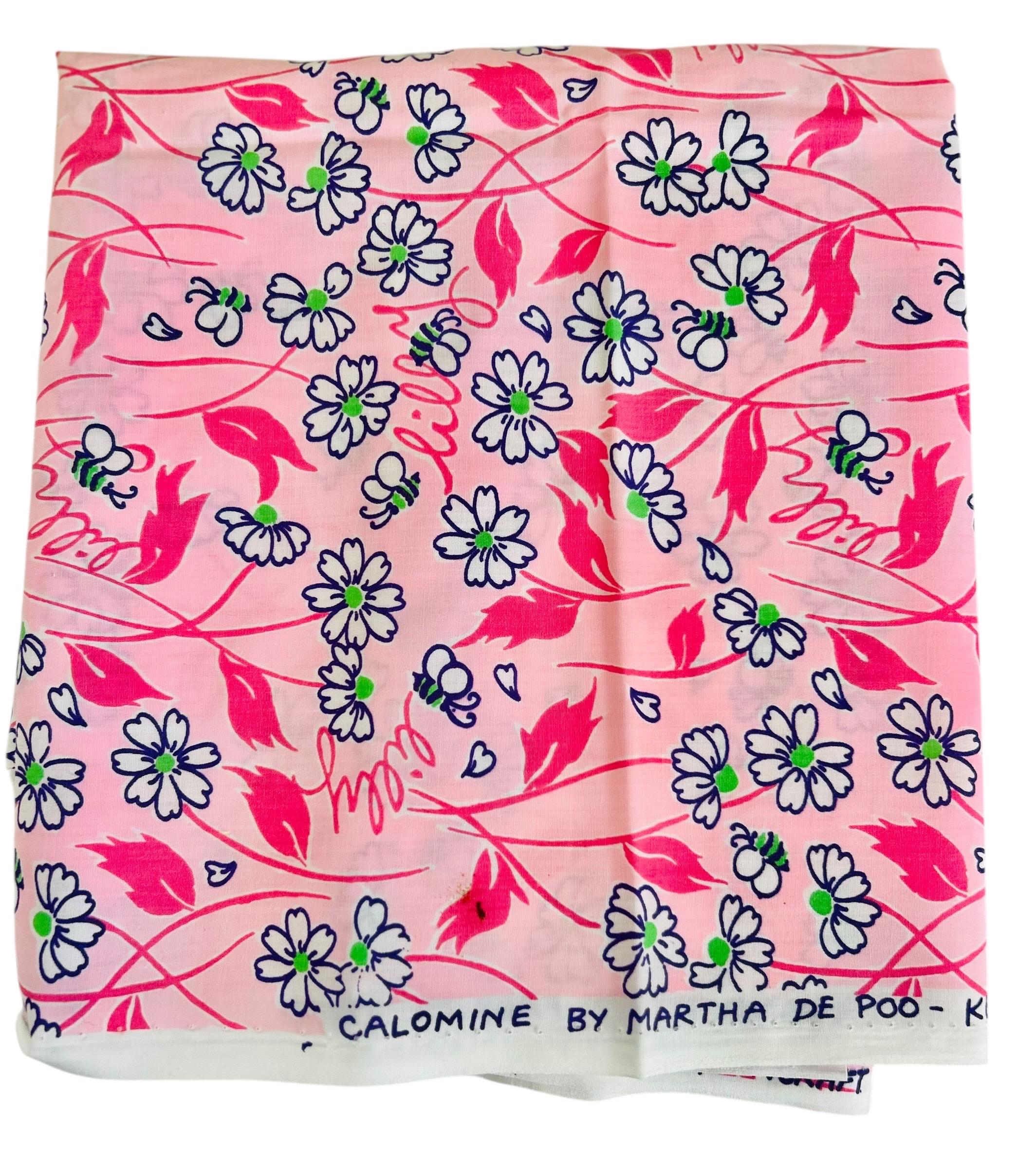 Rare remnant of hand-printed cotton fabric "Picnic" by Martha De Poo of Key West Hand Print Fabrics, Inc., circa 1970s. Fabric is light pink with darker pink stems and leaves and white, purple and green flowers.