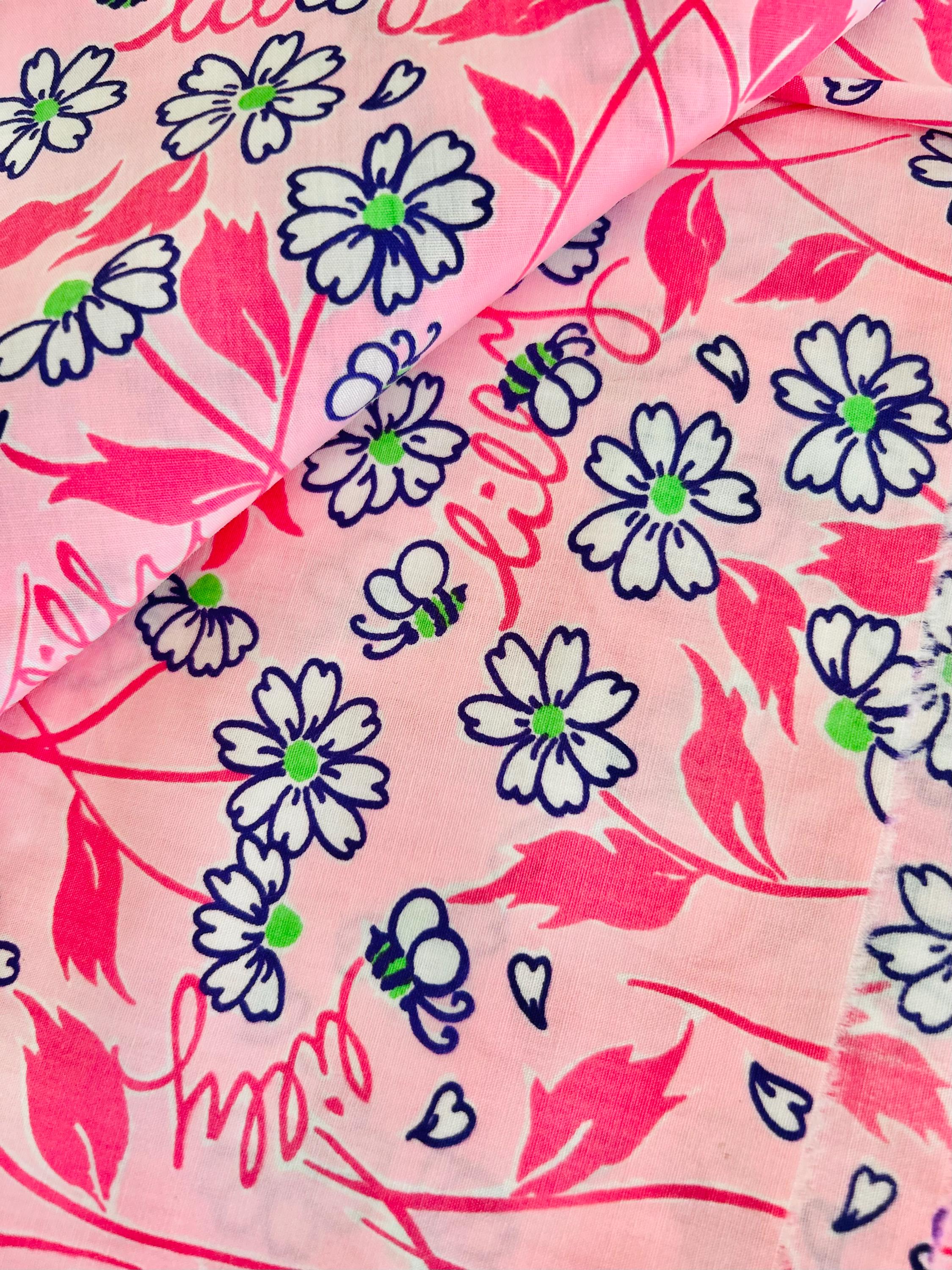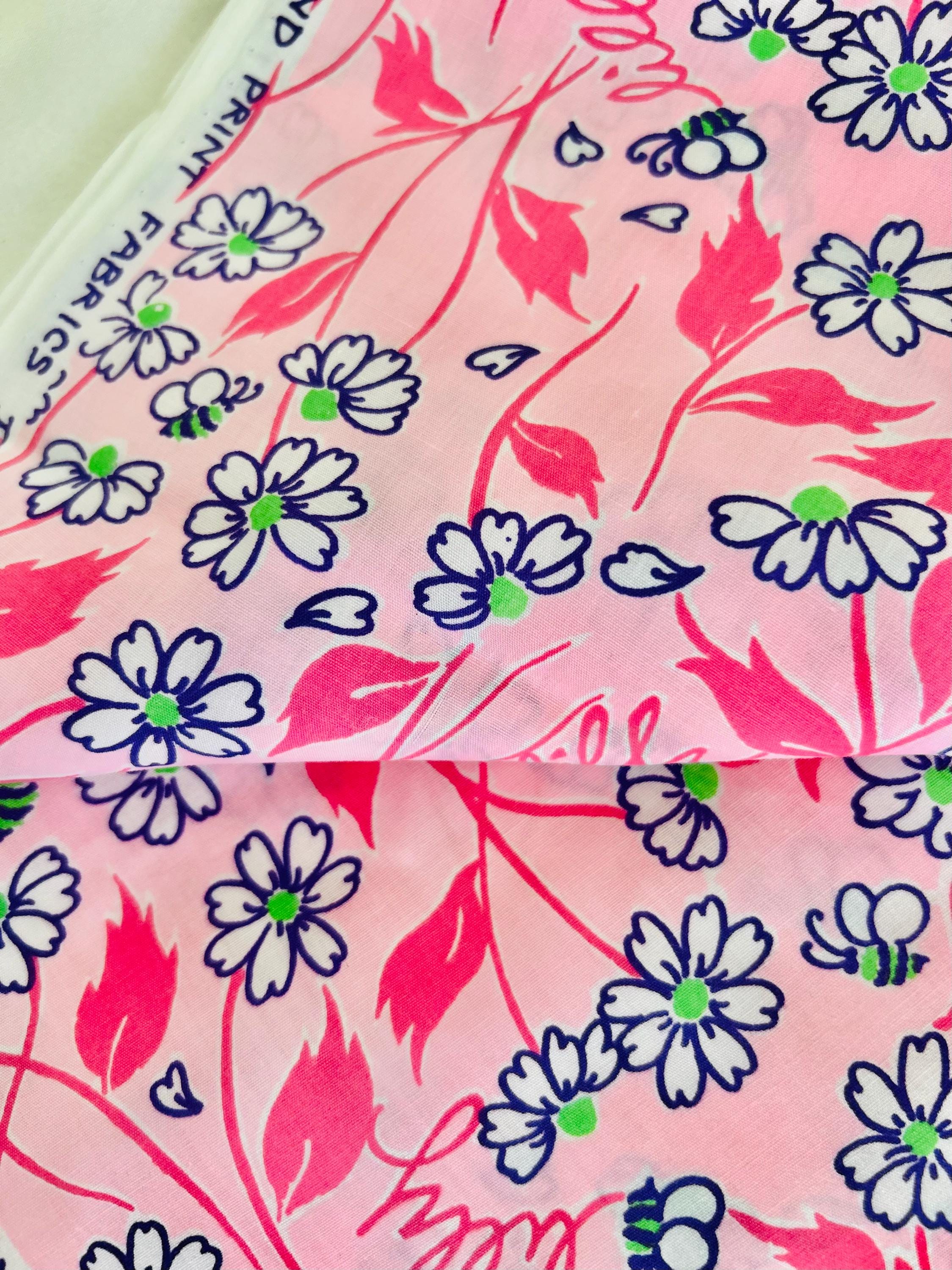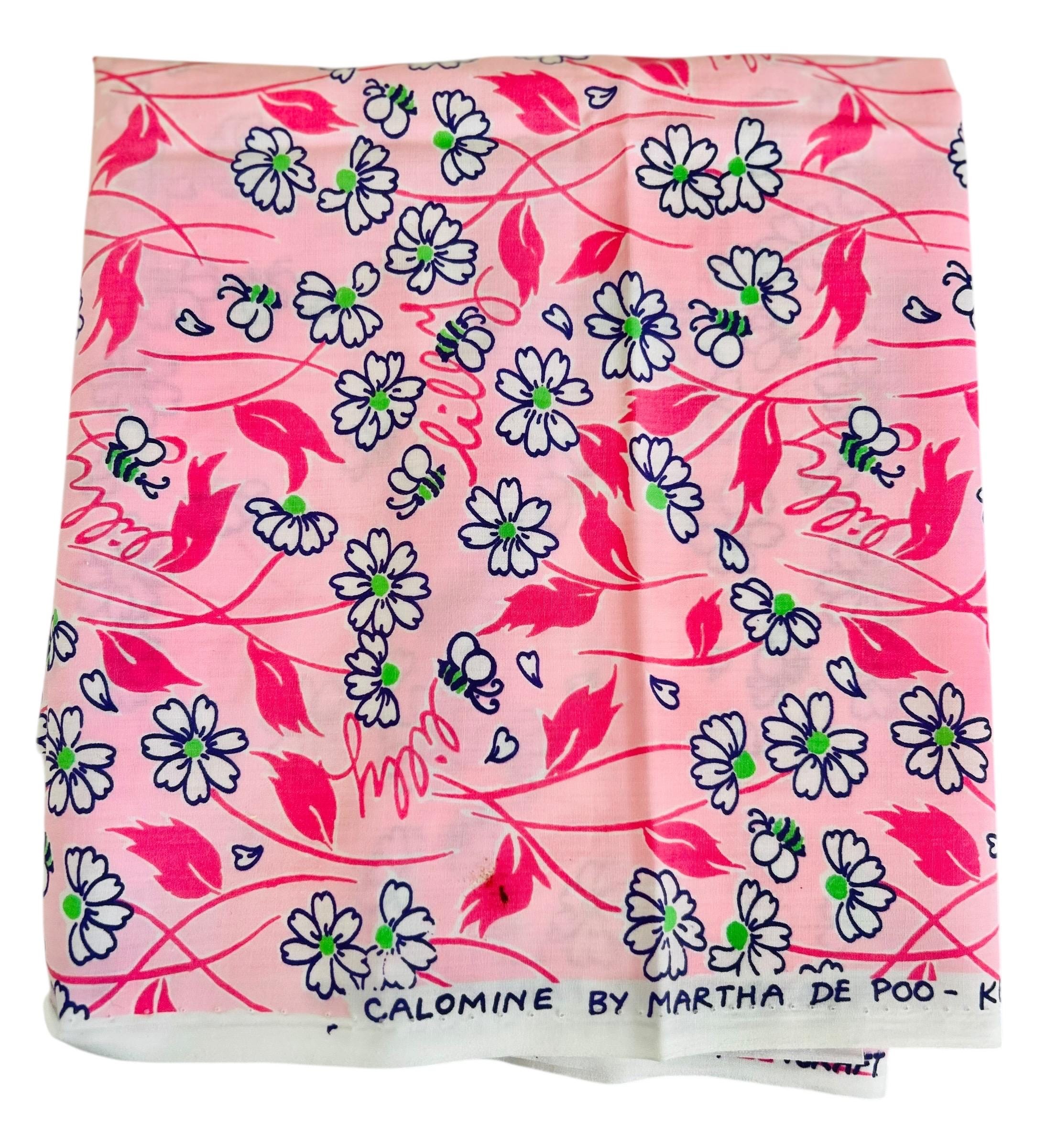 Rare remnant of hand-printed cotton fabric "Picnic" by Martha De Poo of Key West Hand Print Fabrics, Inc., circa 1970s. Fabric is light pink with darker pink stems and leaves and white, purple and green flowers.
