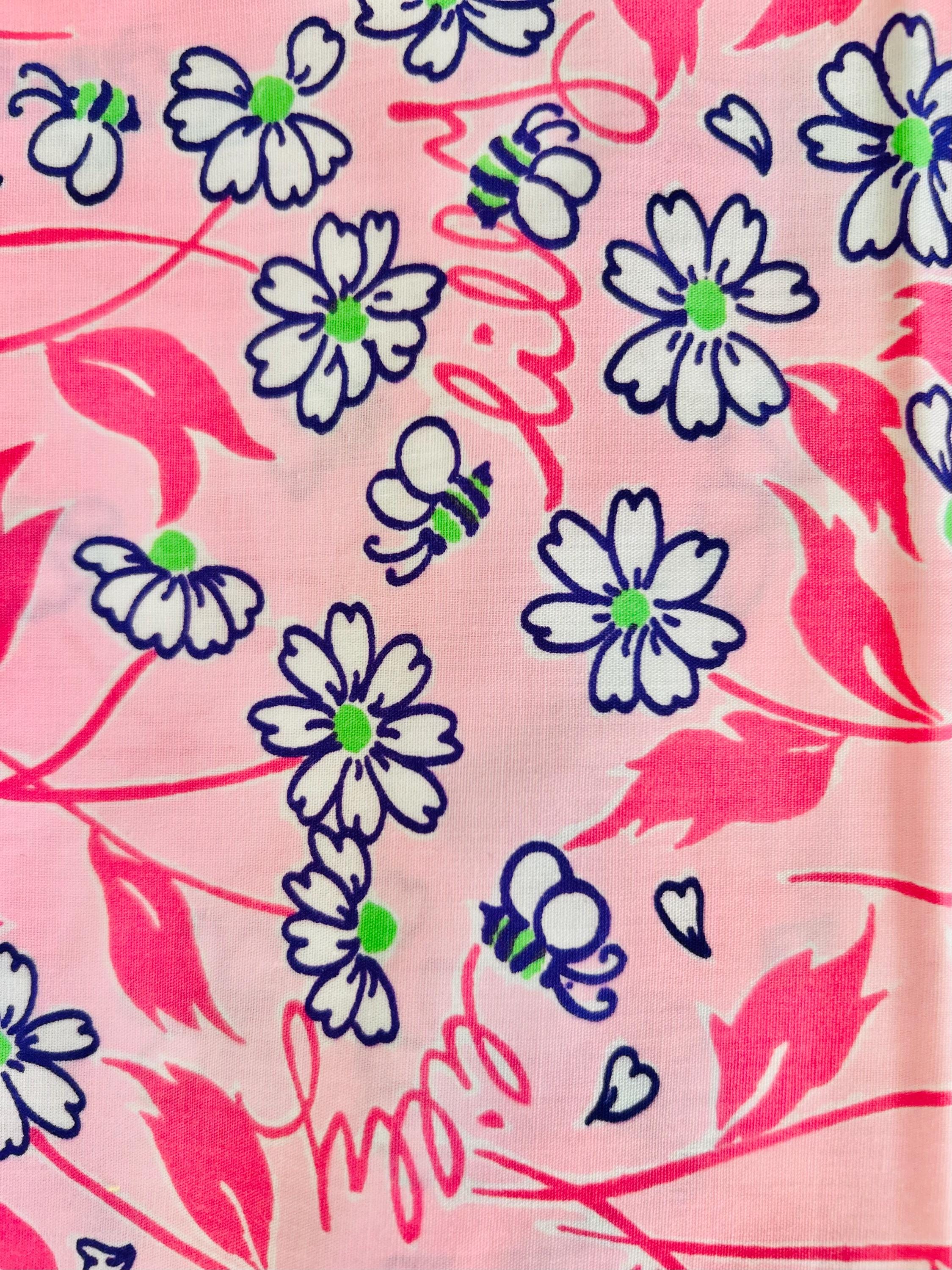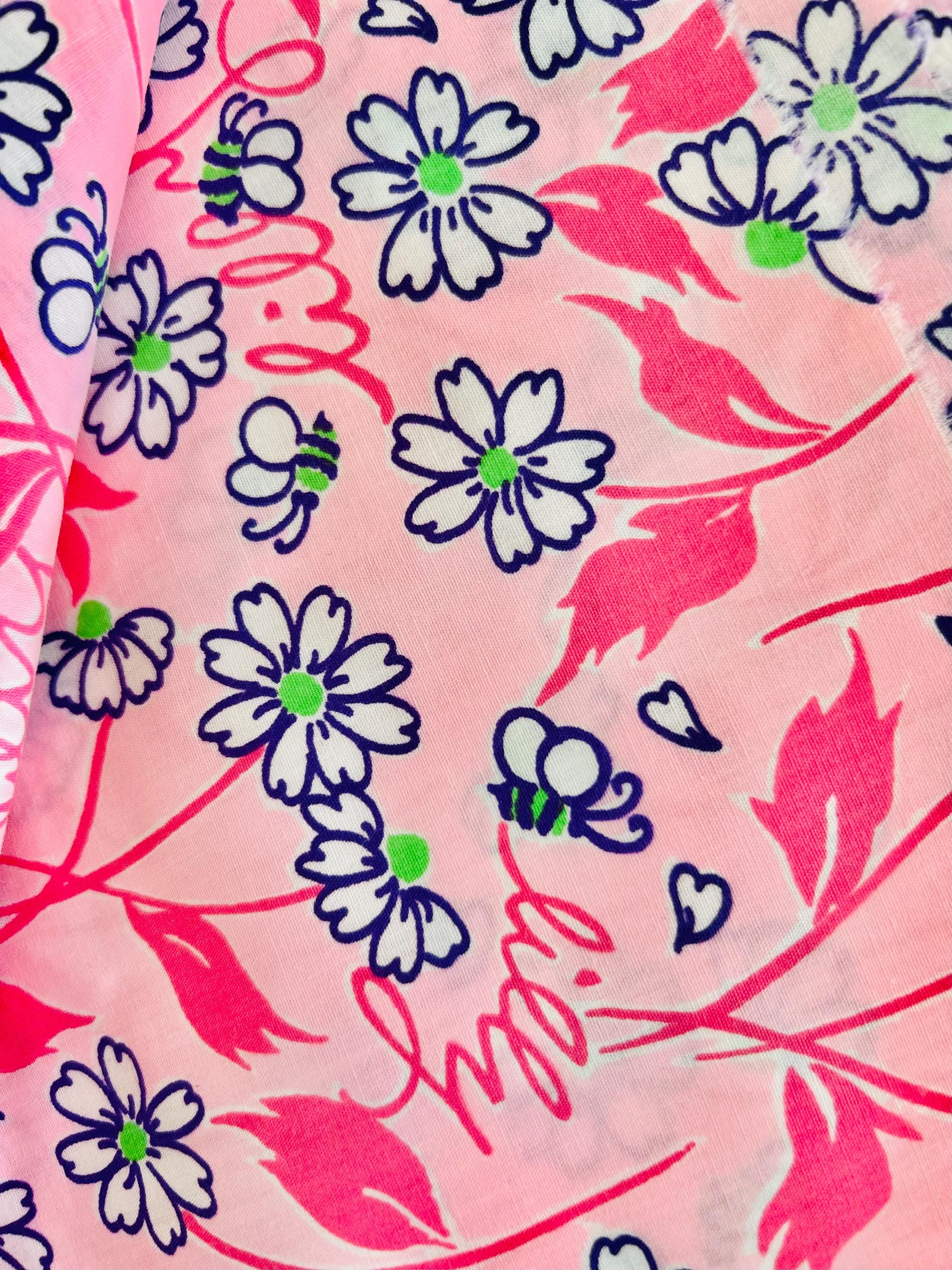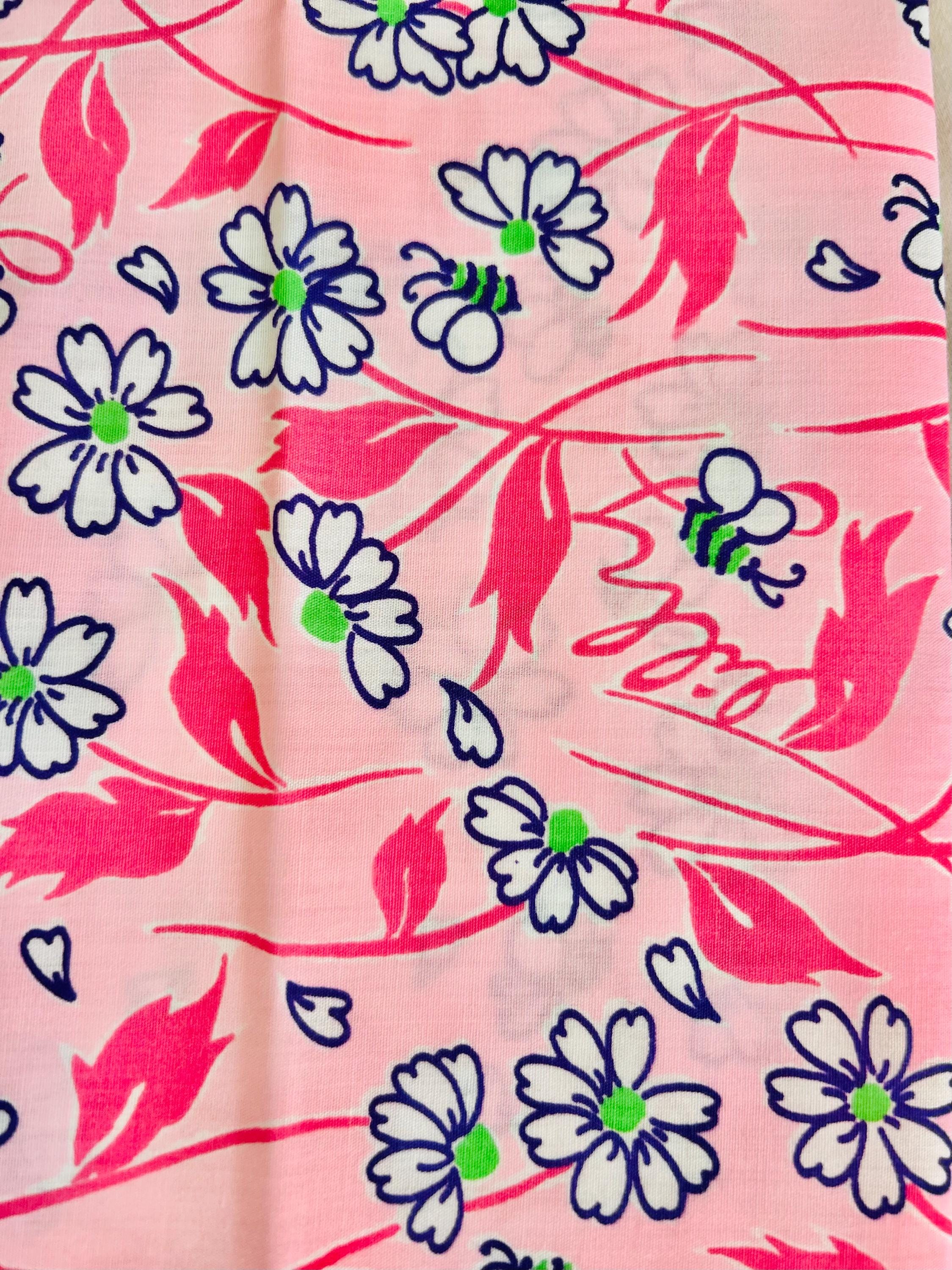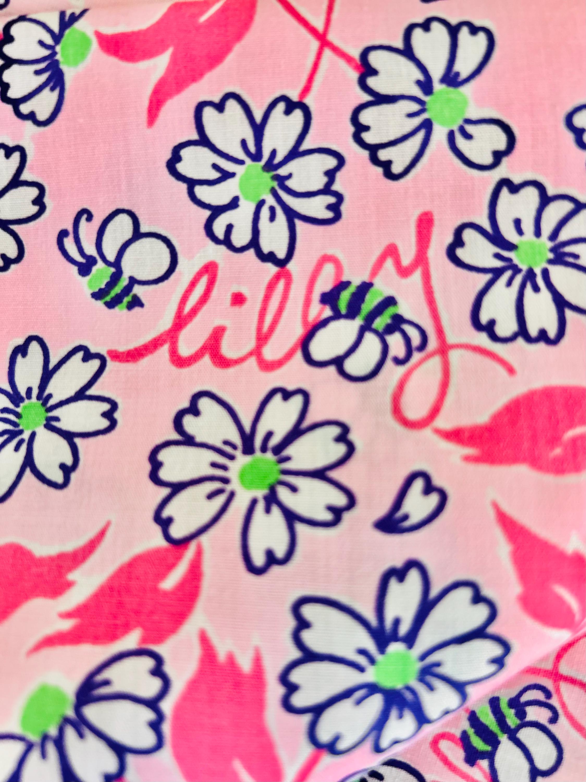 The name "Lilly" that appears between some of the flowers is a reference to the designer Lilly Pulitzer who for 15 years starting in 1962 purchased her fabrics exclusively from Key West Hand Print Fabrics.