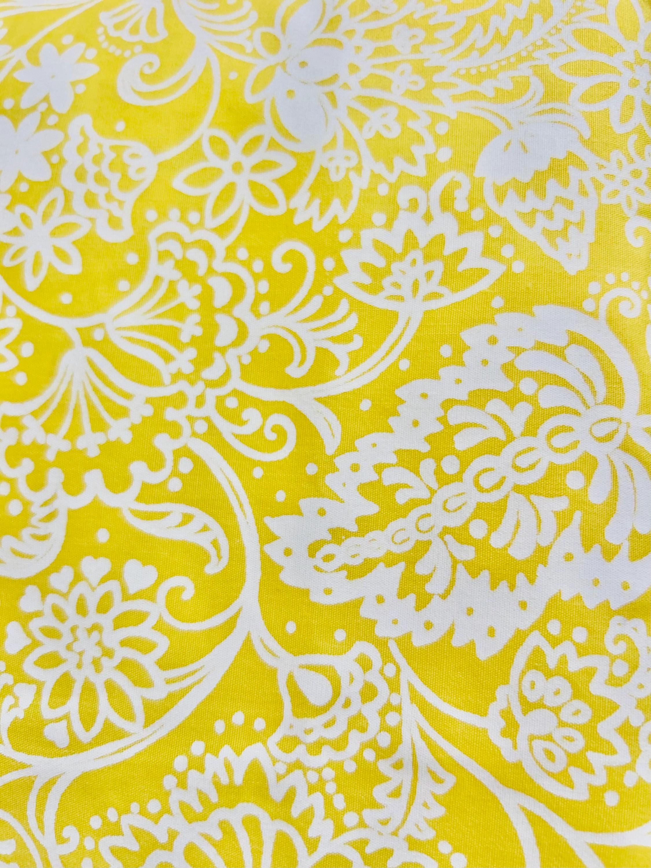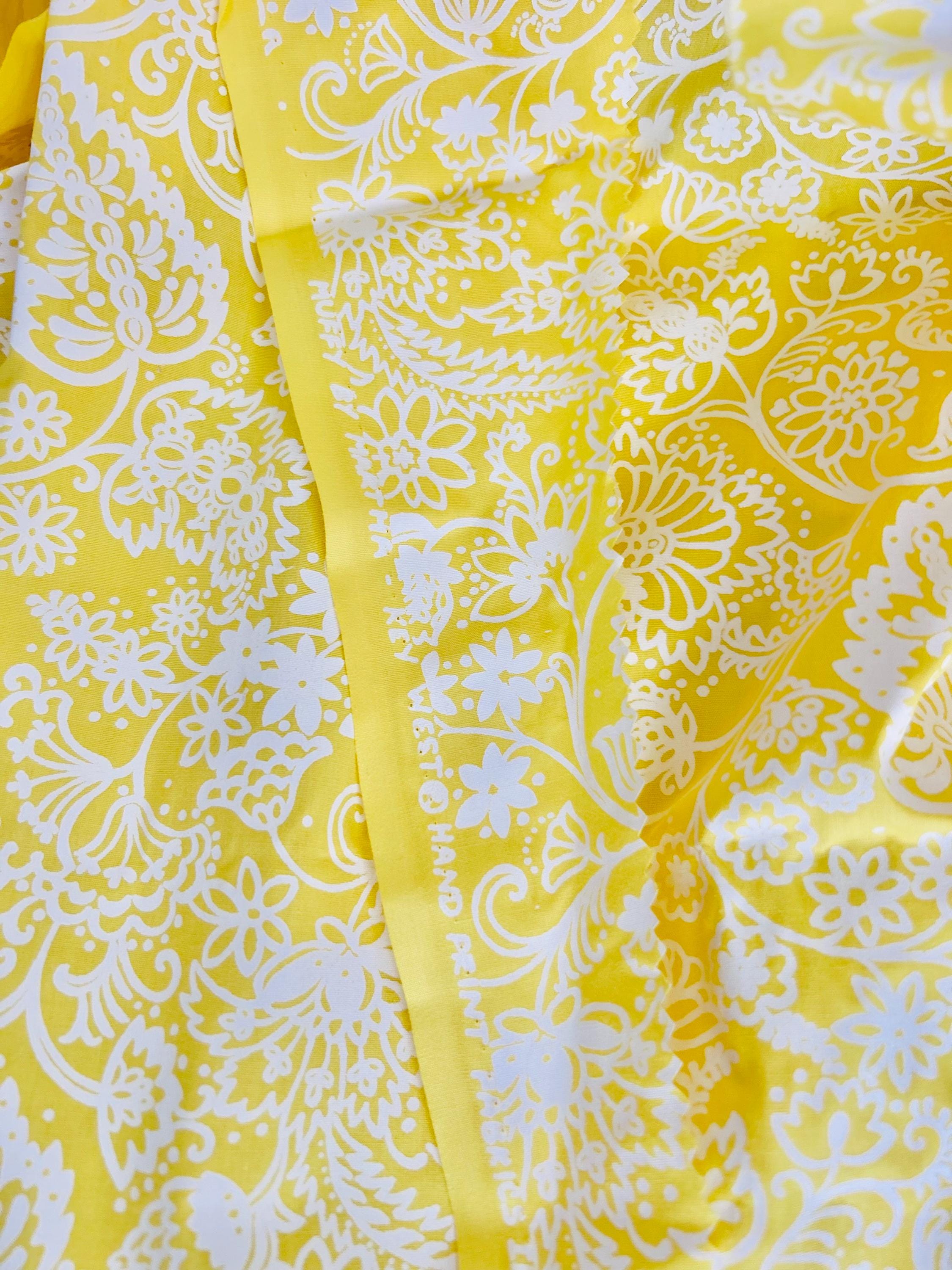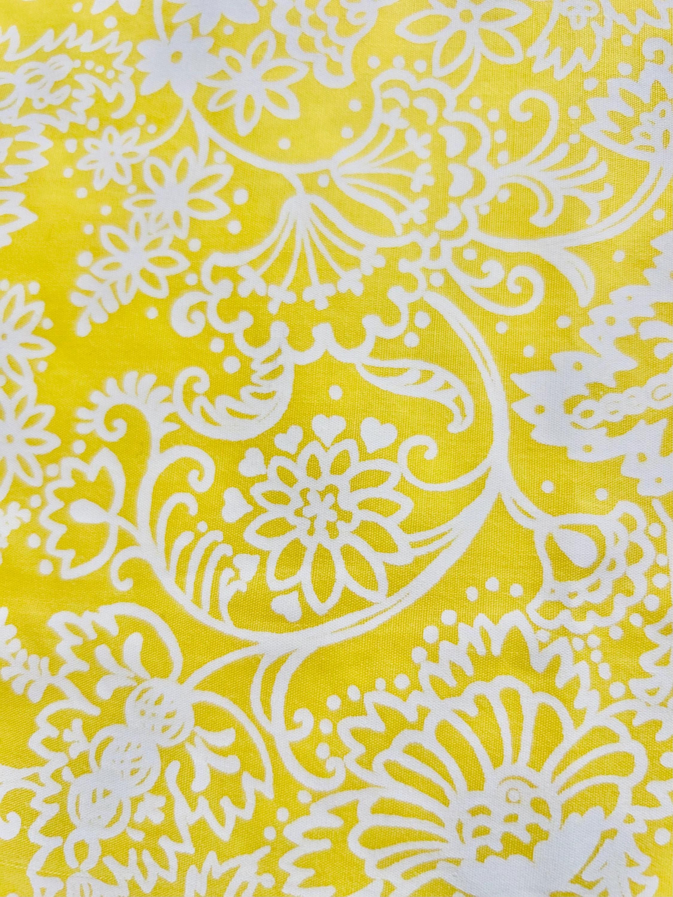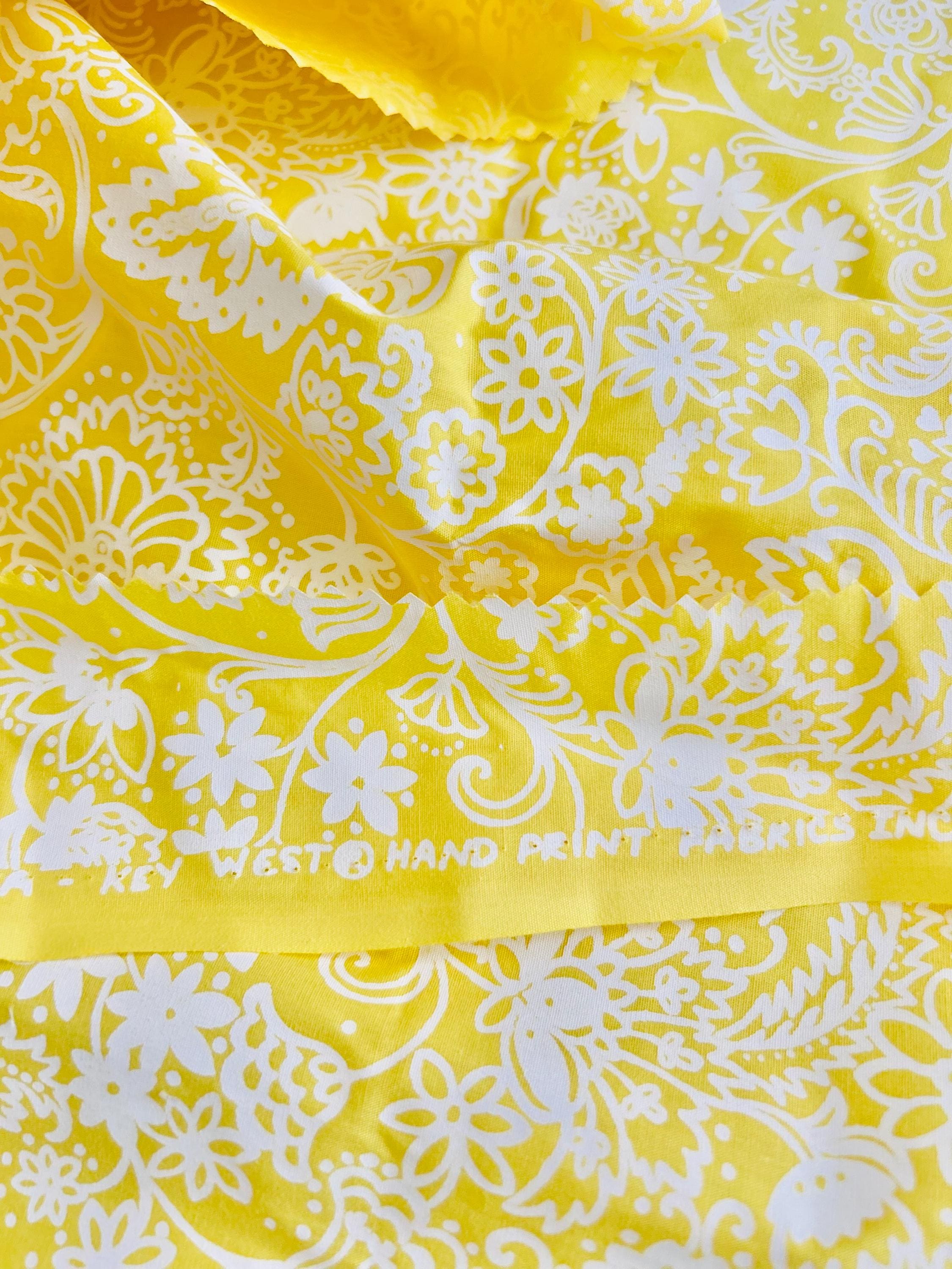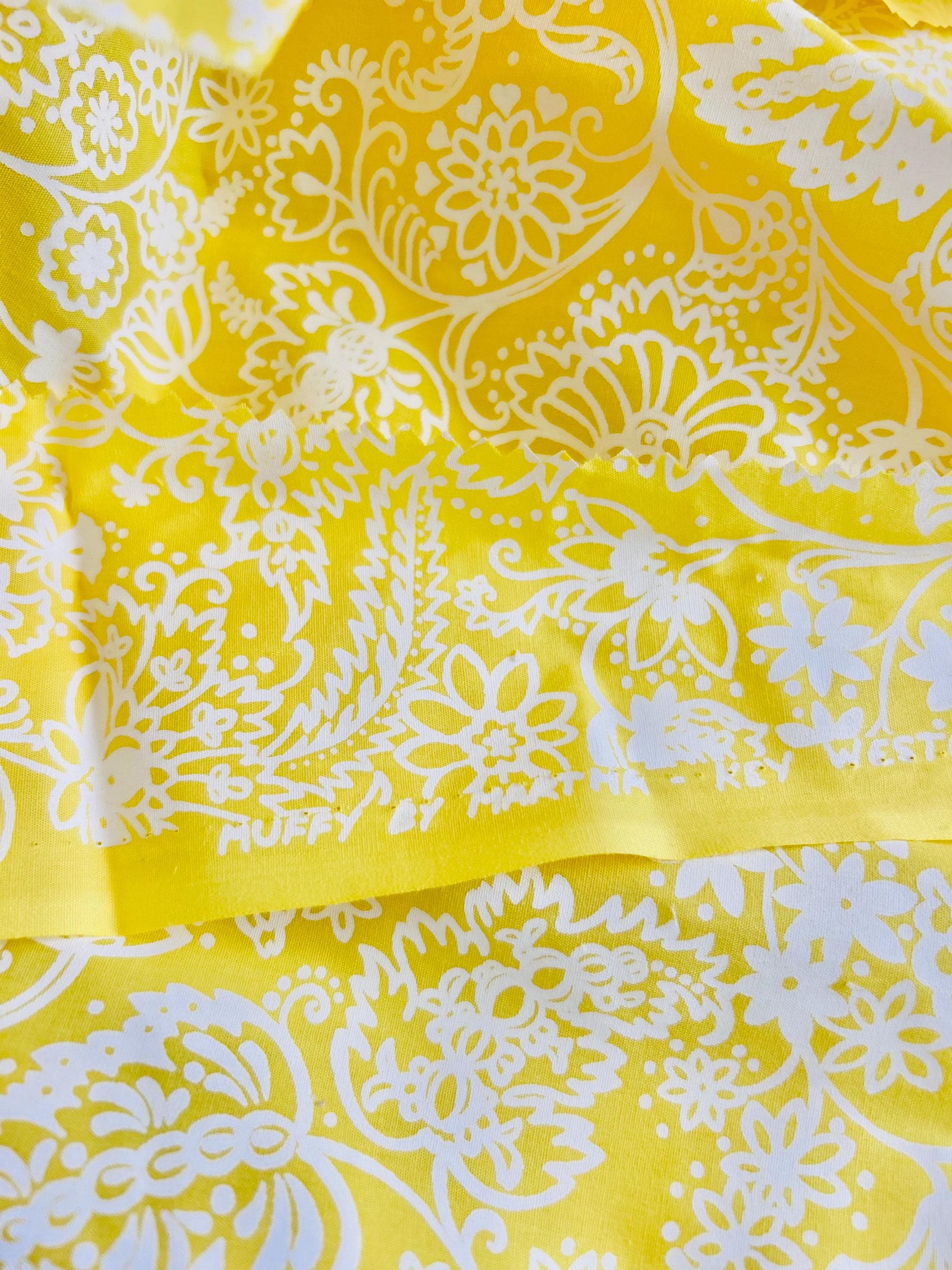 Rare fabric remnant of hand-printed cotton fabric "Huffy" by Martha of Key West Hand Print Fabrics, Inc., circa 1970s. Fabric is yellow and white.