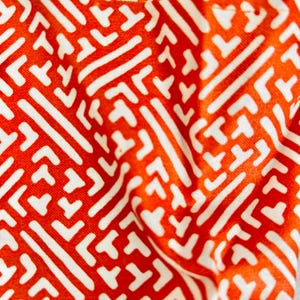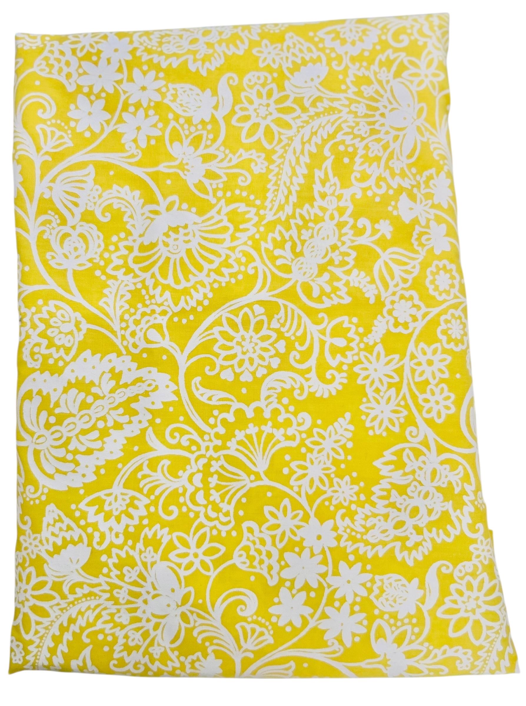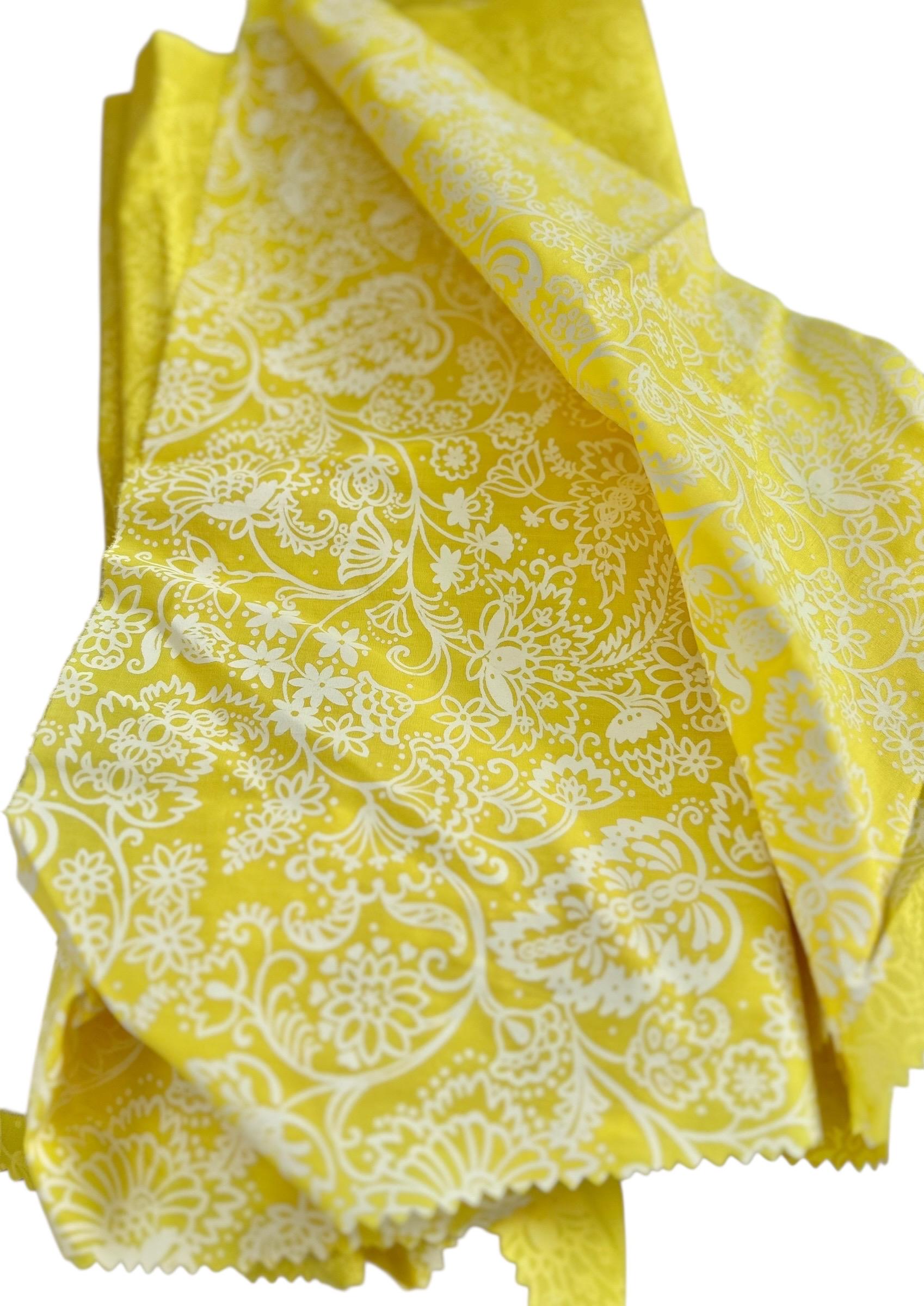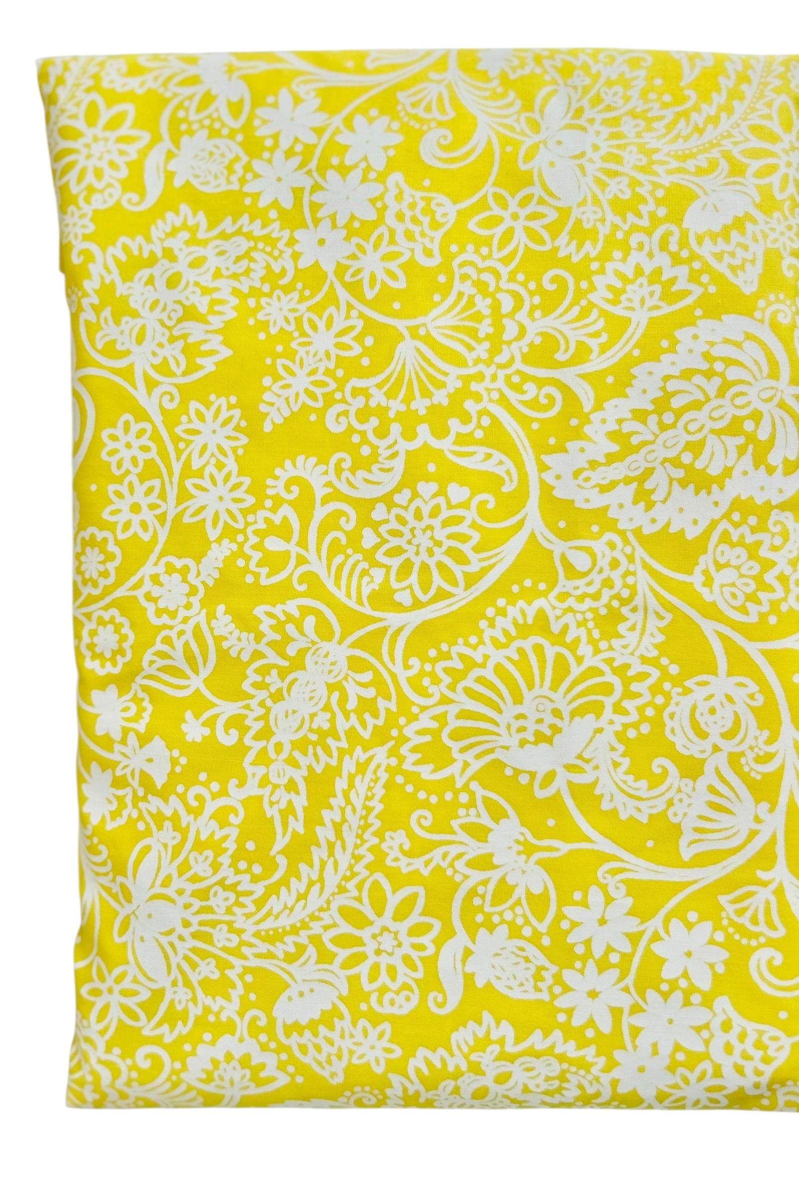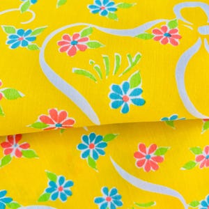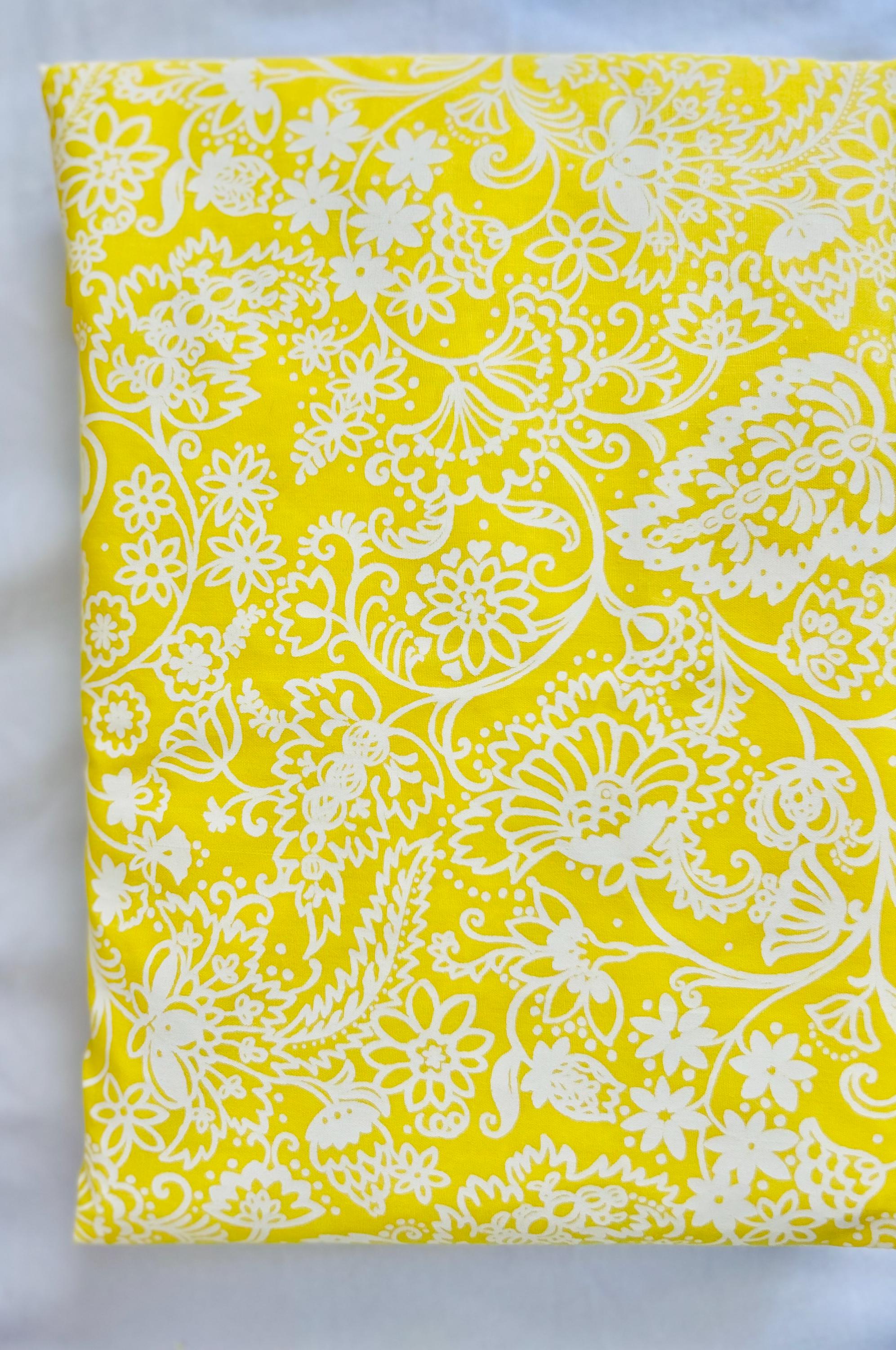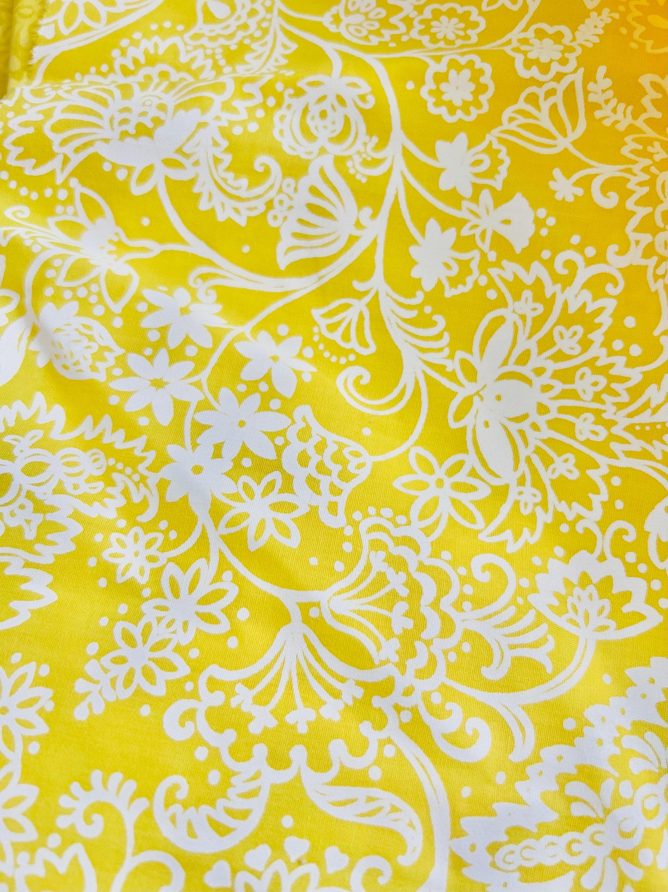 Rare fabric remnant of hand-printed cotton fabric "Huffy" by Martha of Key West Hand Print Fabrics, Inc., circa 1970s. Fabric is yellow and white.