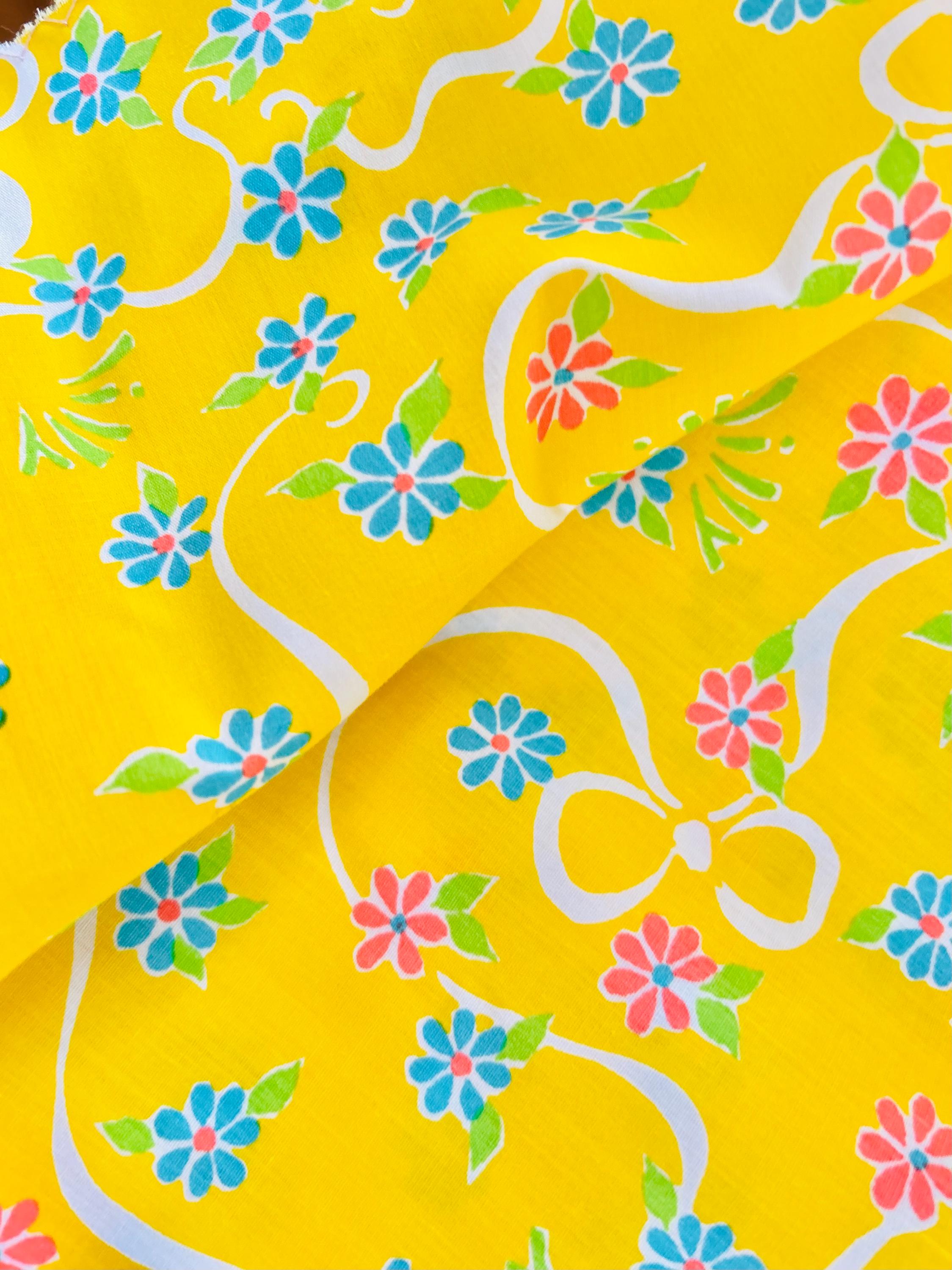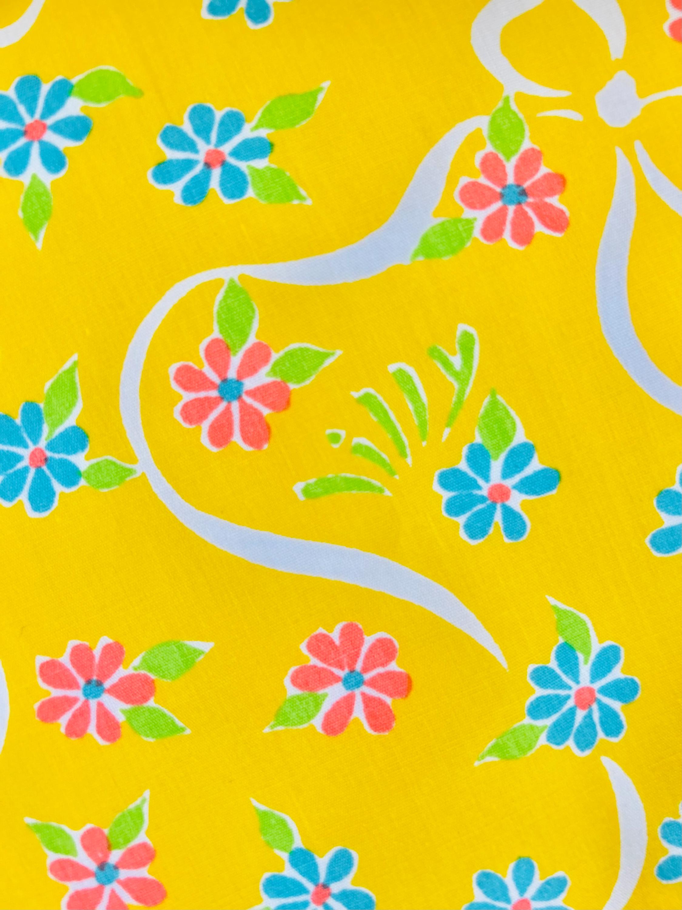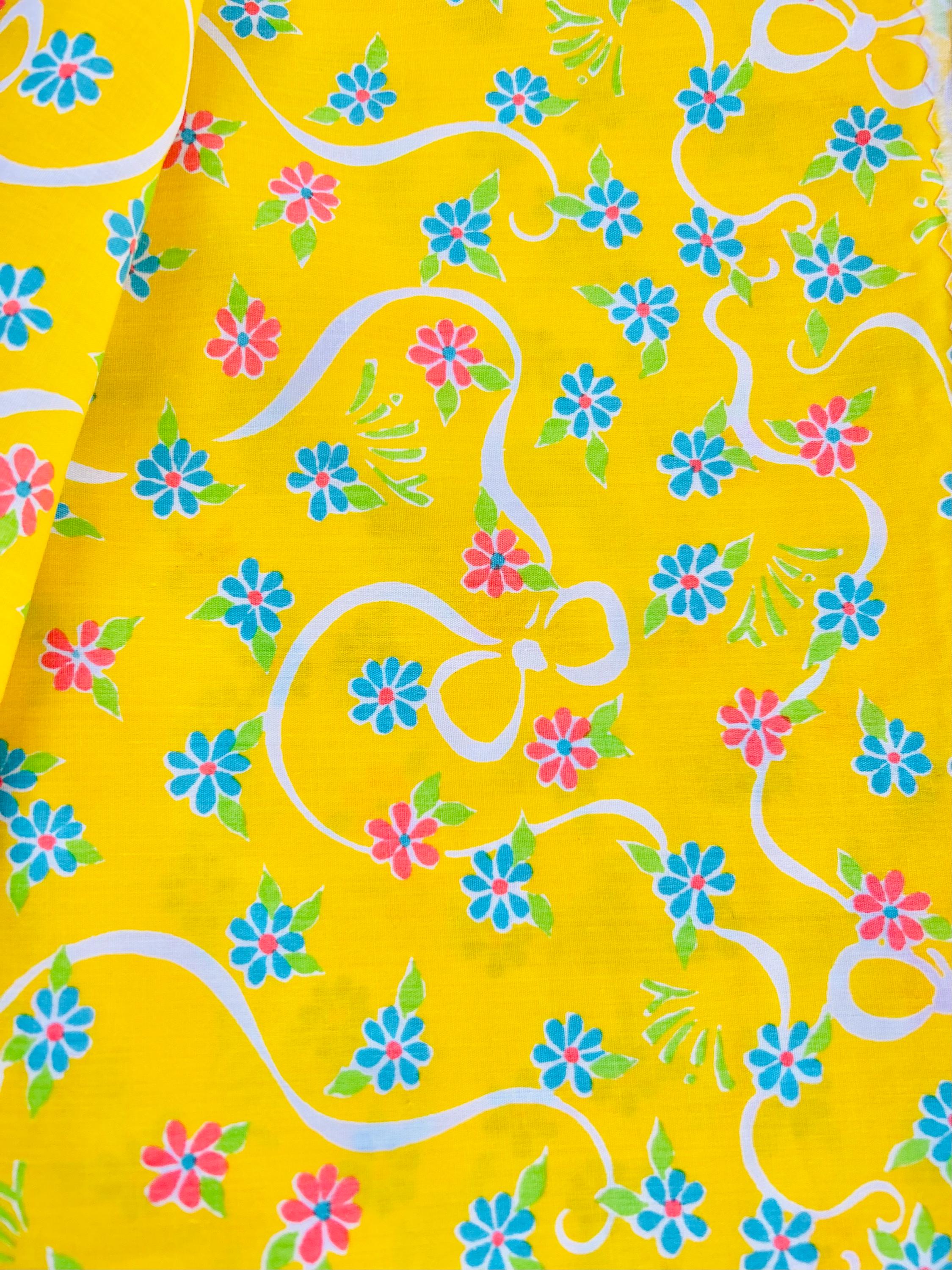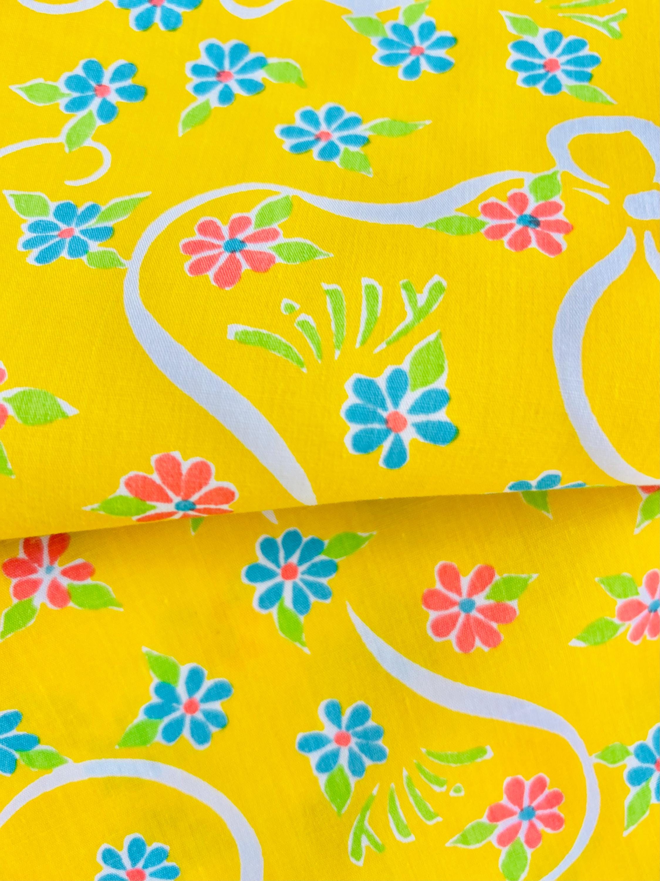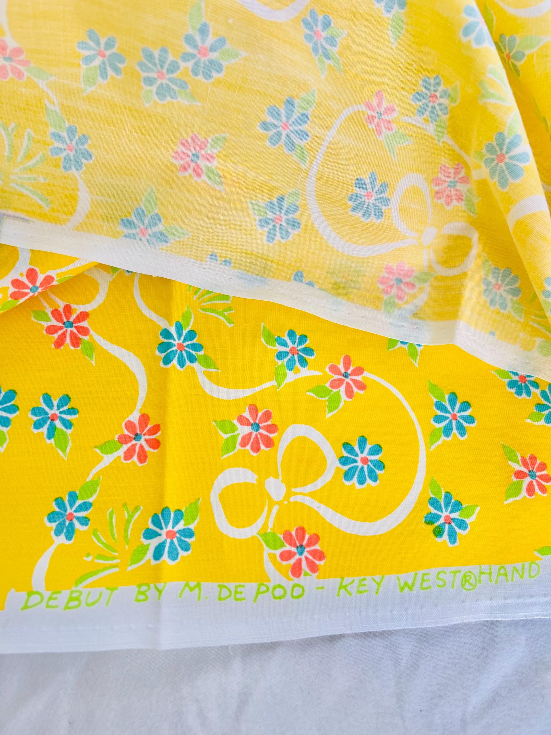 Rare hand-printed cotton fabric "Debut" by M. DePoo of Key West Hand Print Fabrics, Inc., circa 1970s. Fabric is yellow, blue, red, green and white.