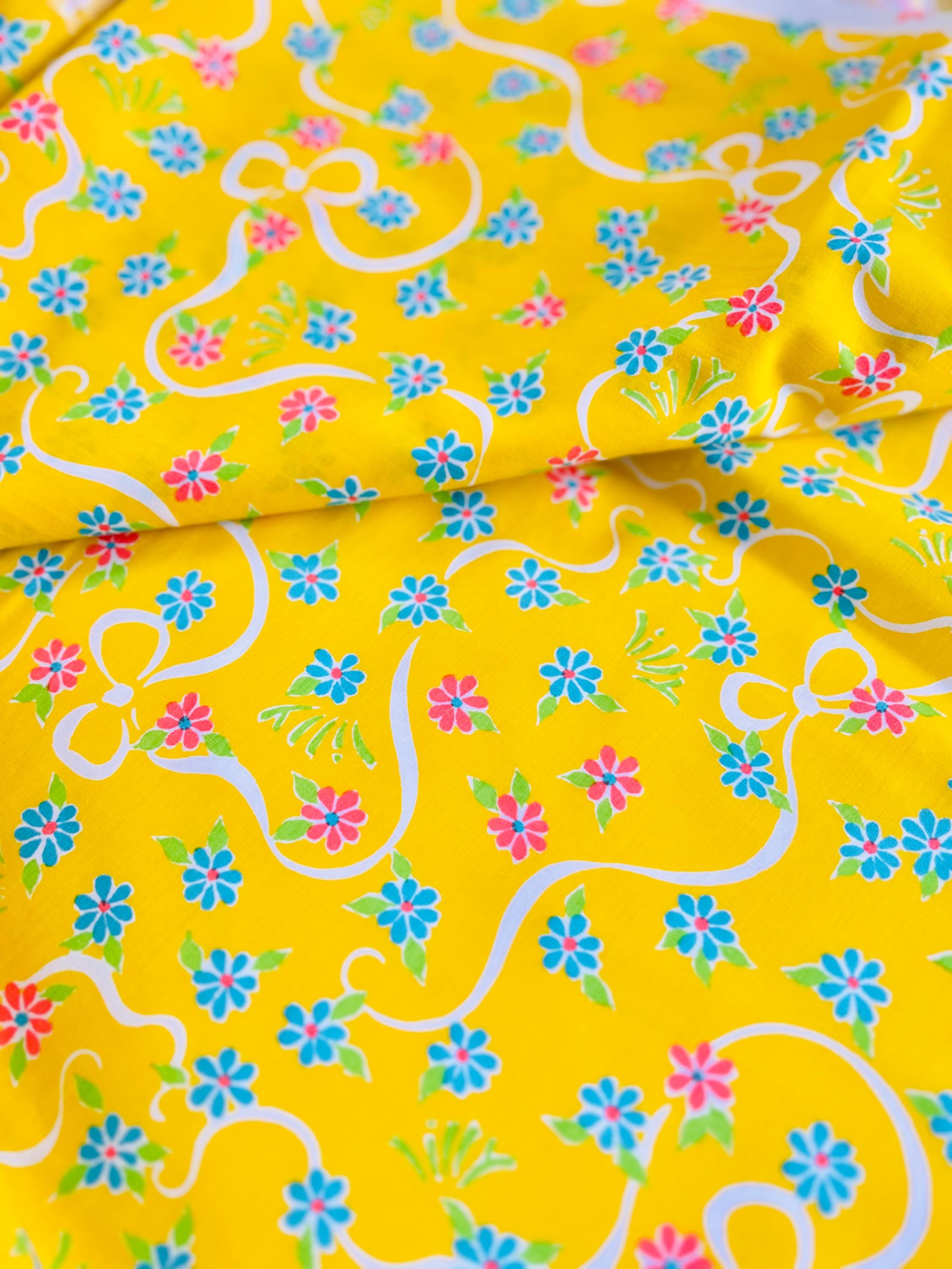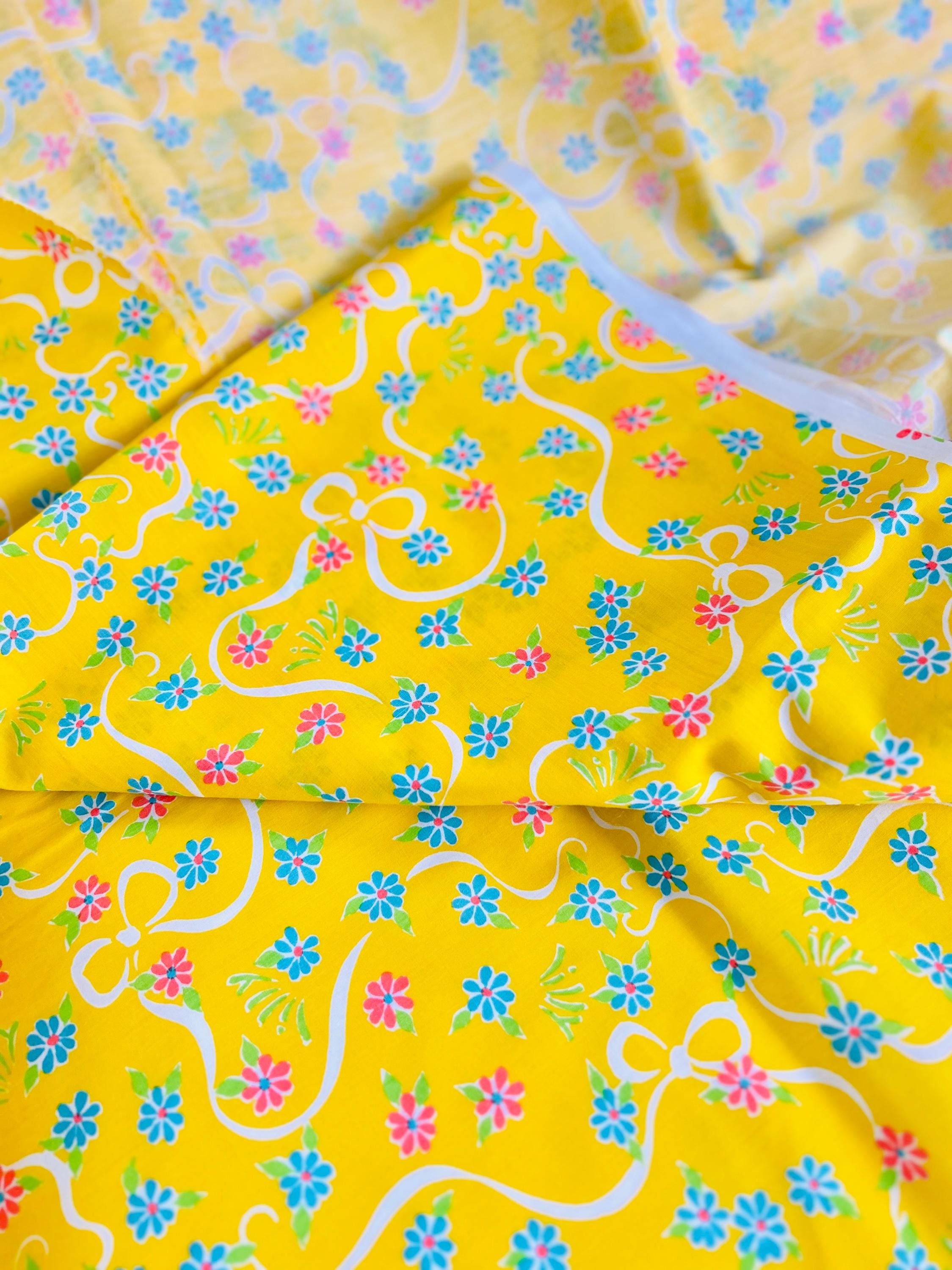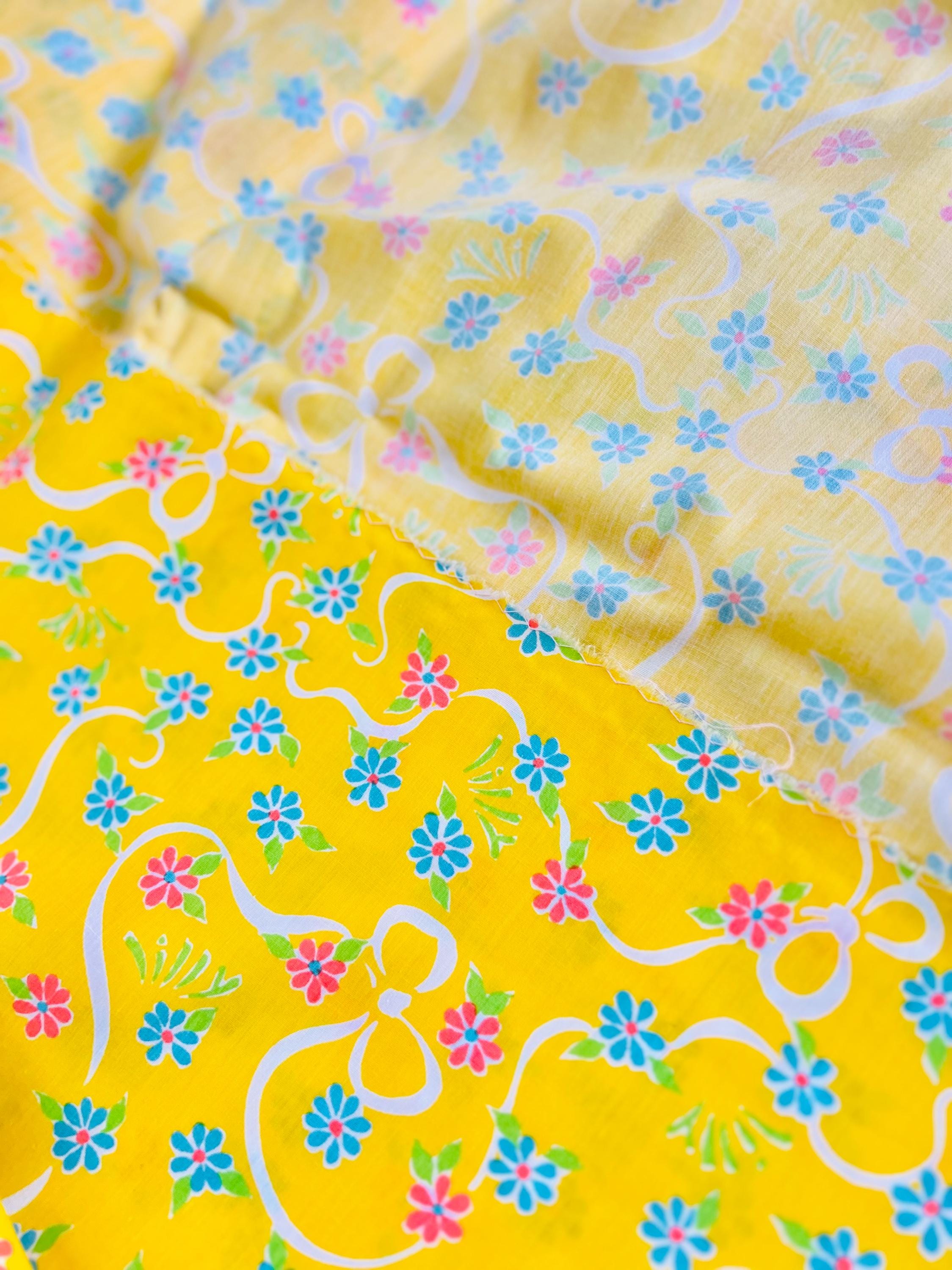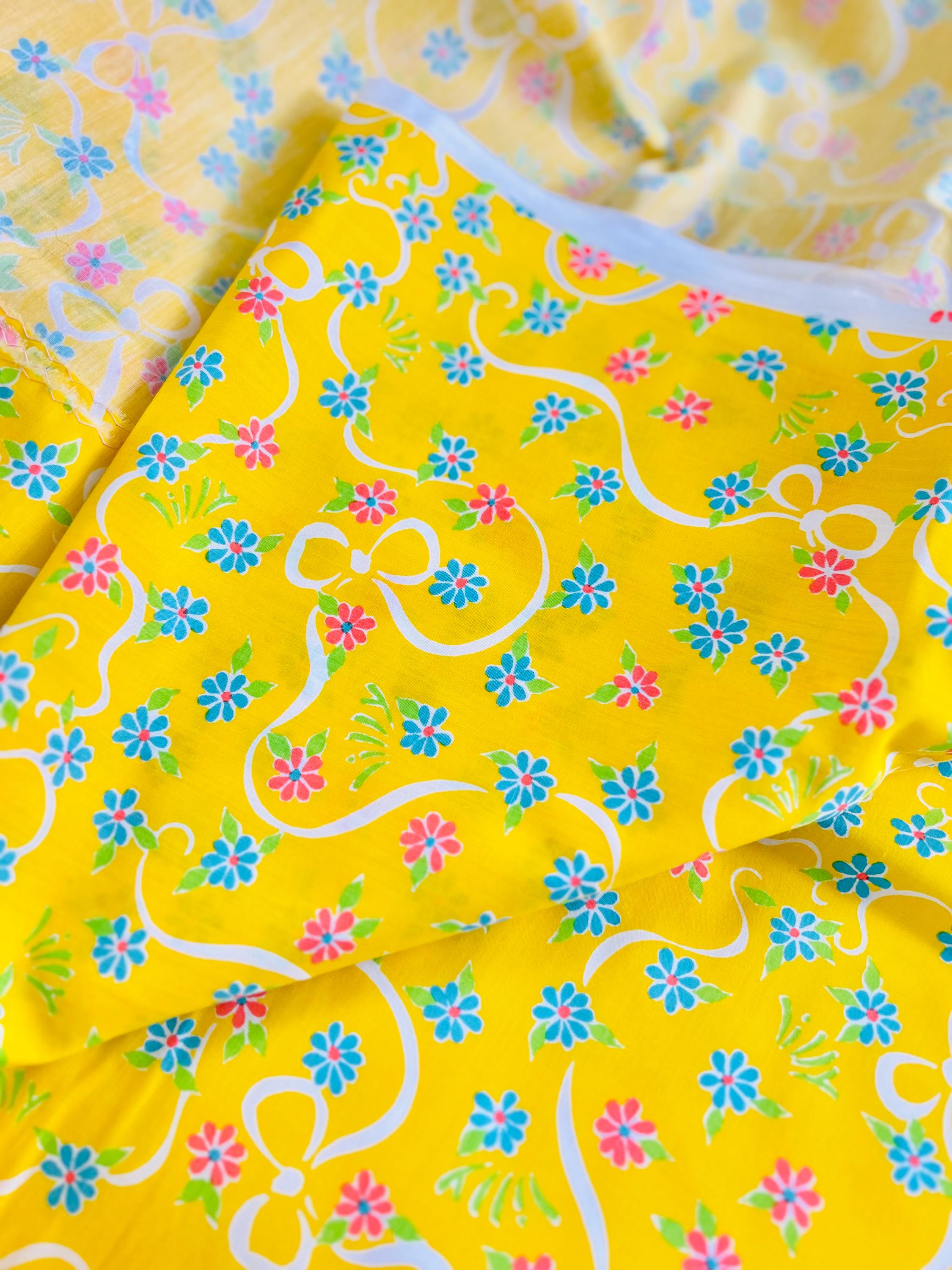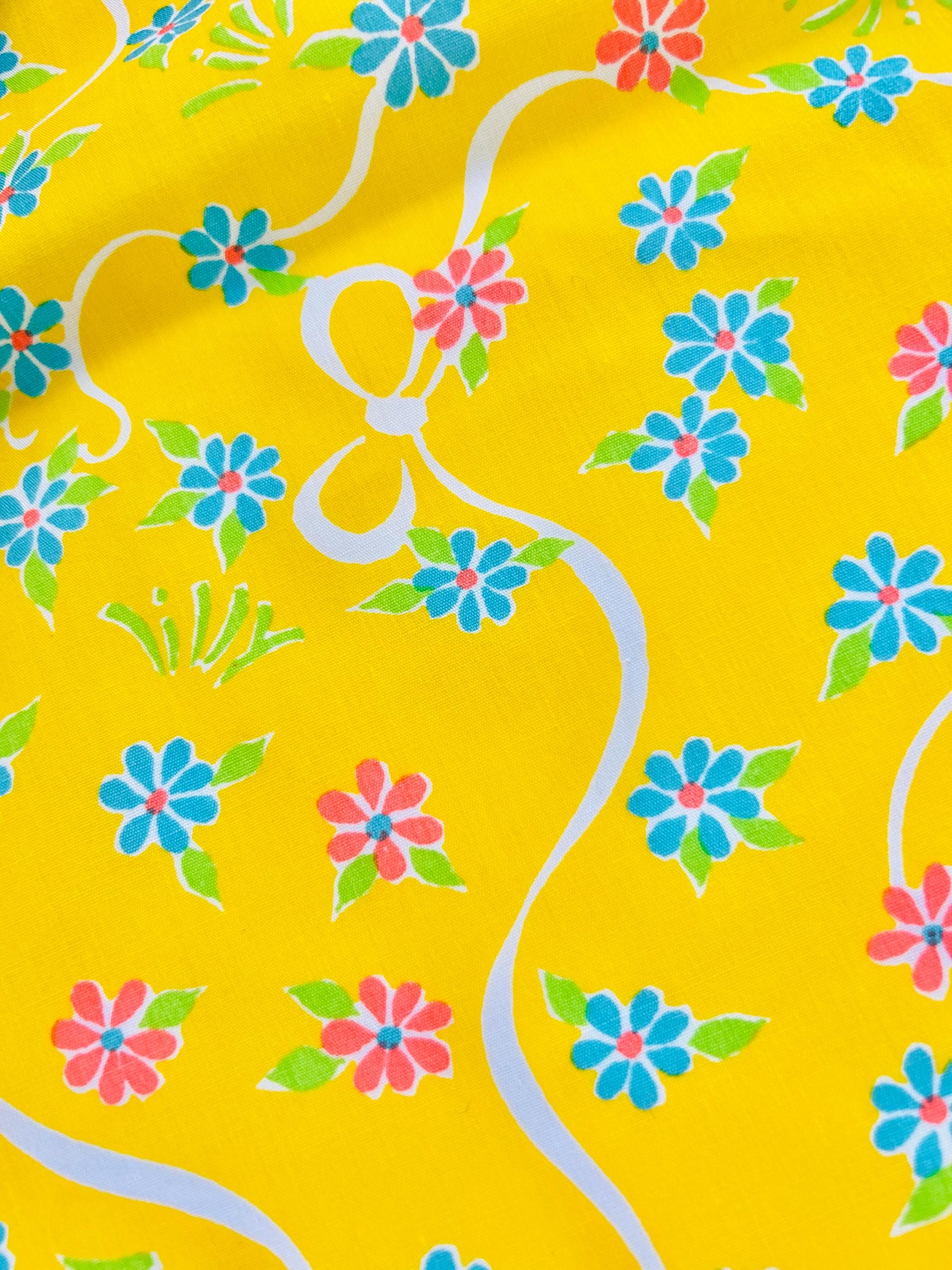 Rare hand-printed cotton fabric "Debut" by M. DePoo of Key West Hand Print Fabrics, Inc., circa 1970s. Fabric is yellow, blue, red, green and white.