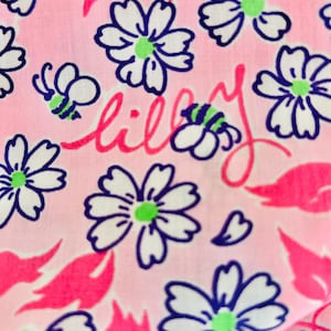 The name "Lilly" that appears between some of the flowers is a reference to the designer Lilly Pulitzer who for 15 years starting in 1962 purchased her fabrics exclusively from Key West Hand Print Fabrics.