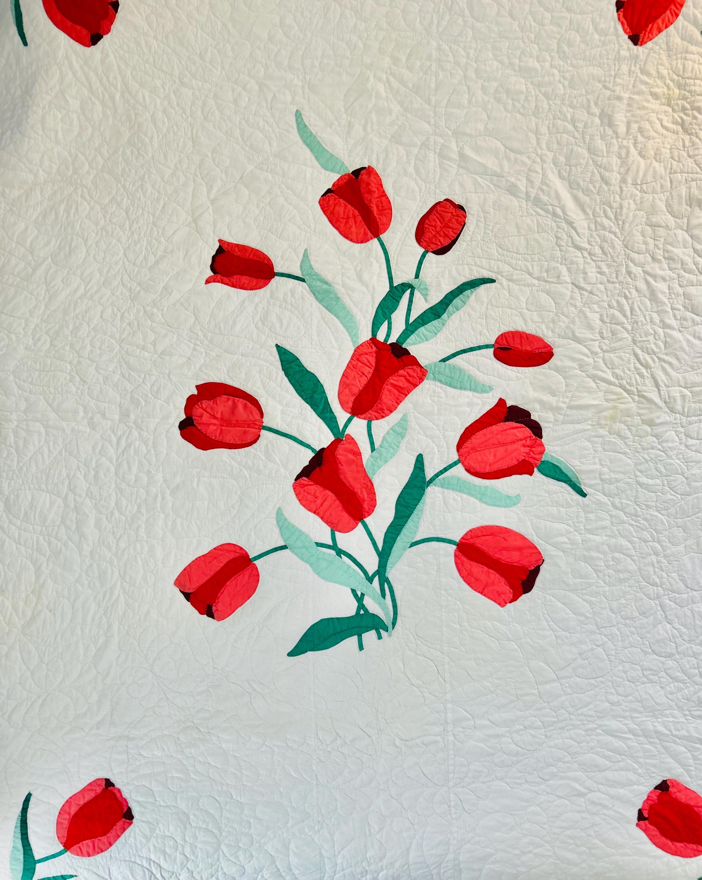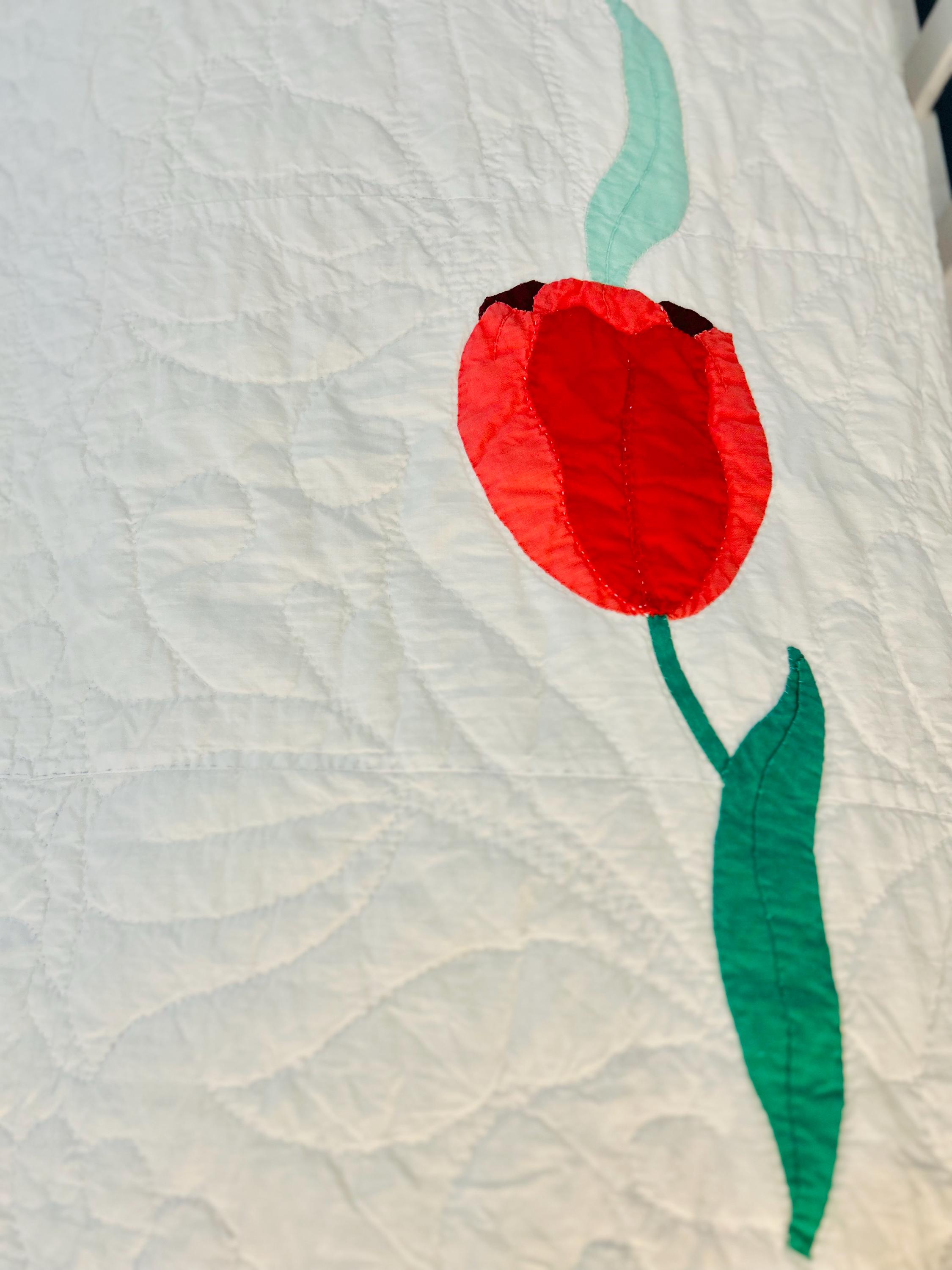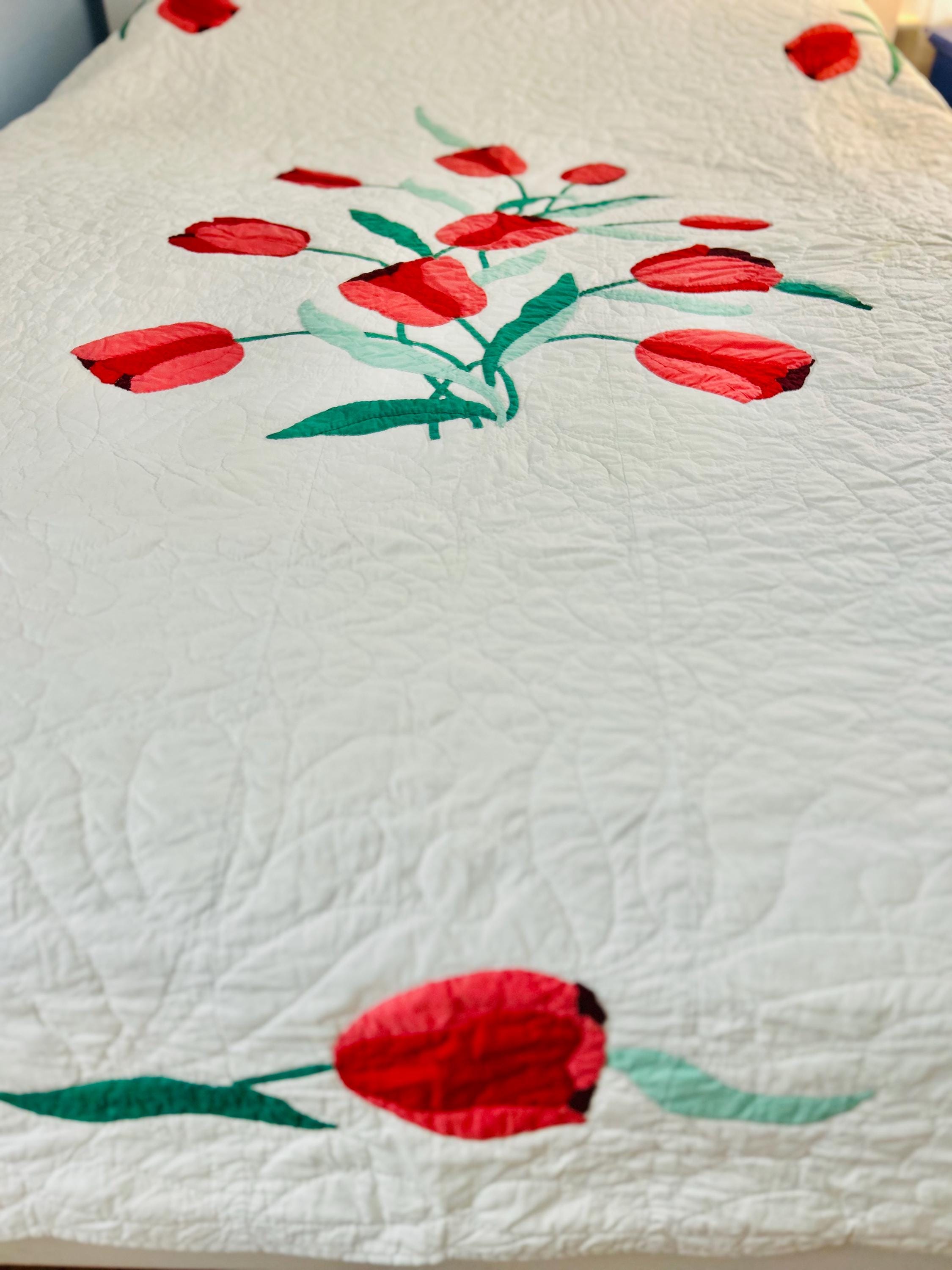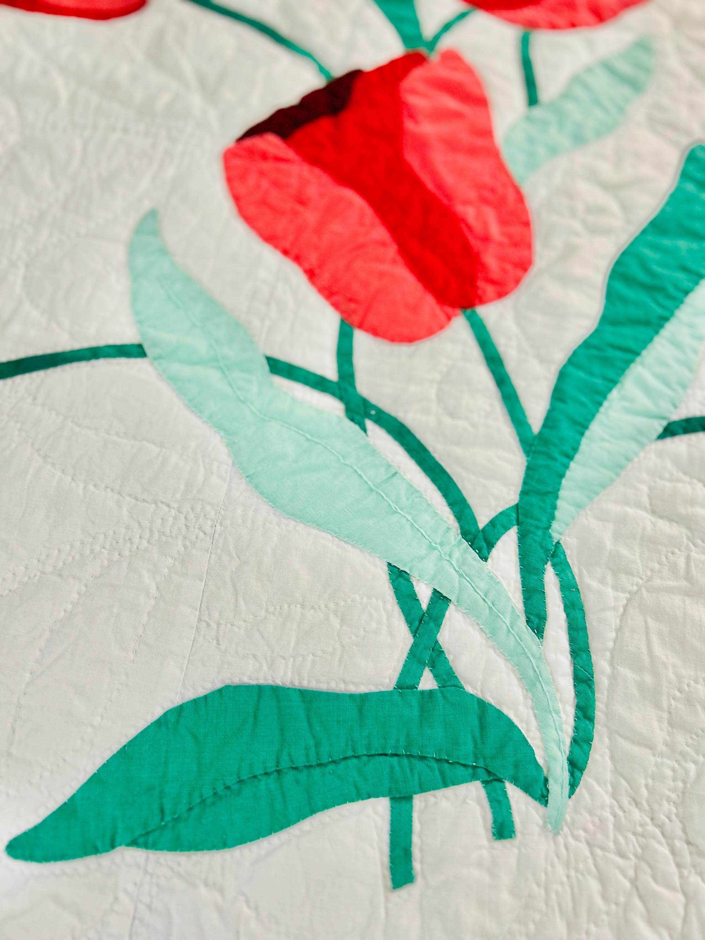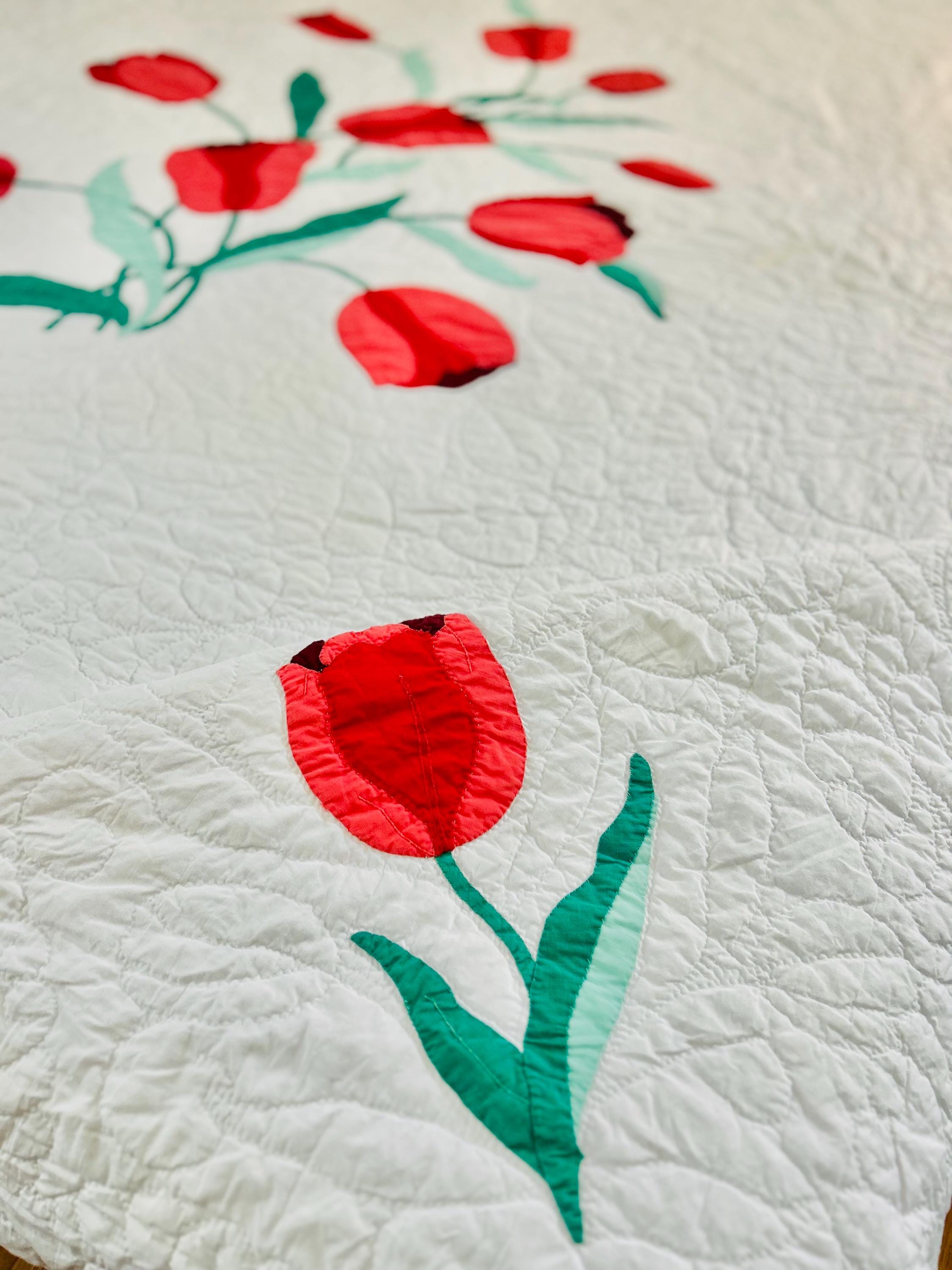 This Twirling Tulips Quilt is circa 1940s-1950s and appears to have been made from a kit sold by Monarch in the 1940s. The applique has been hand-stitched and hand embroidered and the quilting is entirely by hand in feathers and flowers.