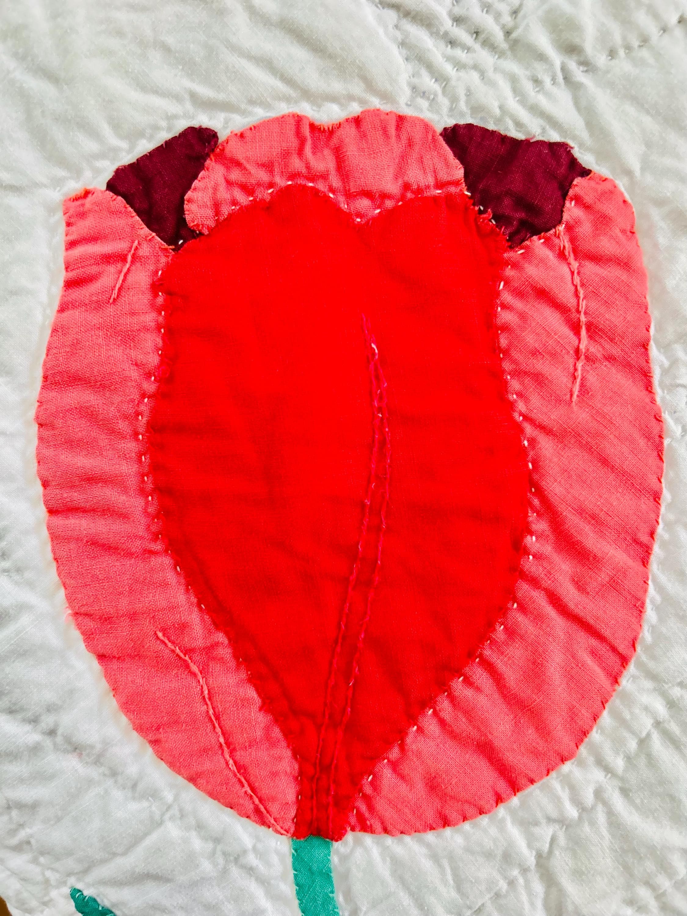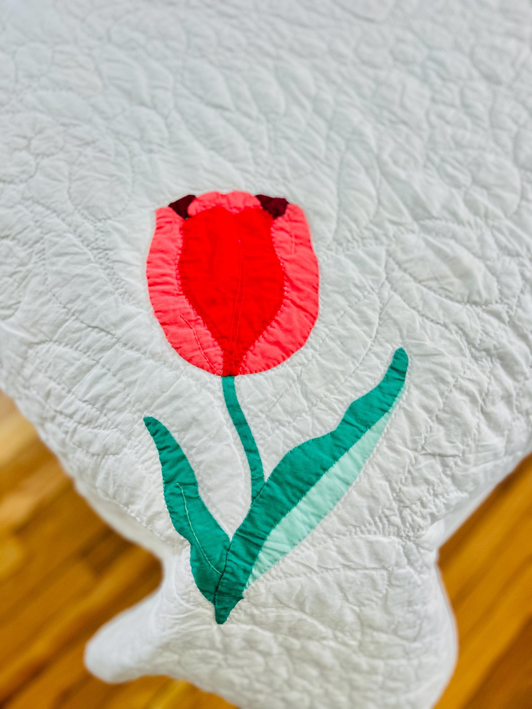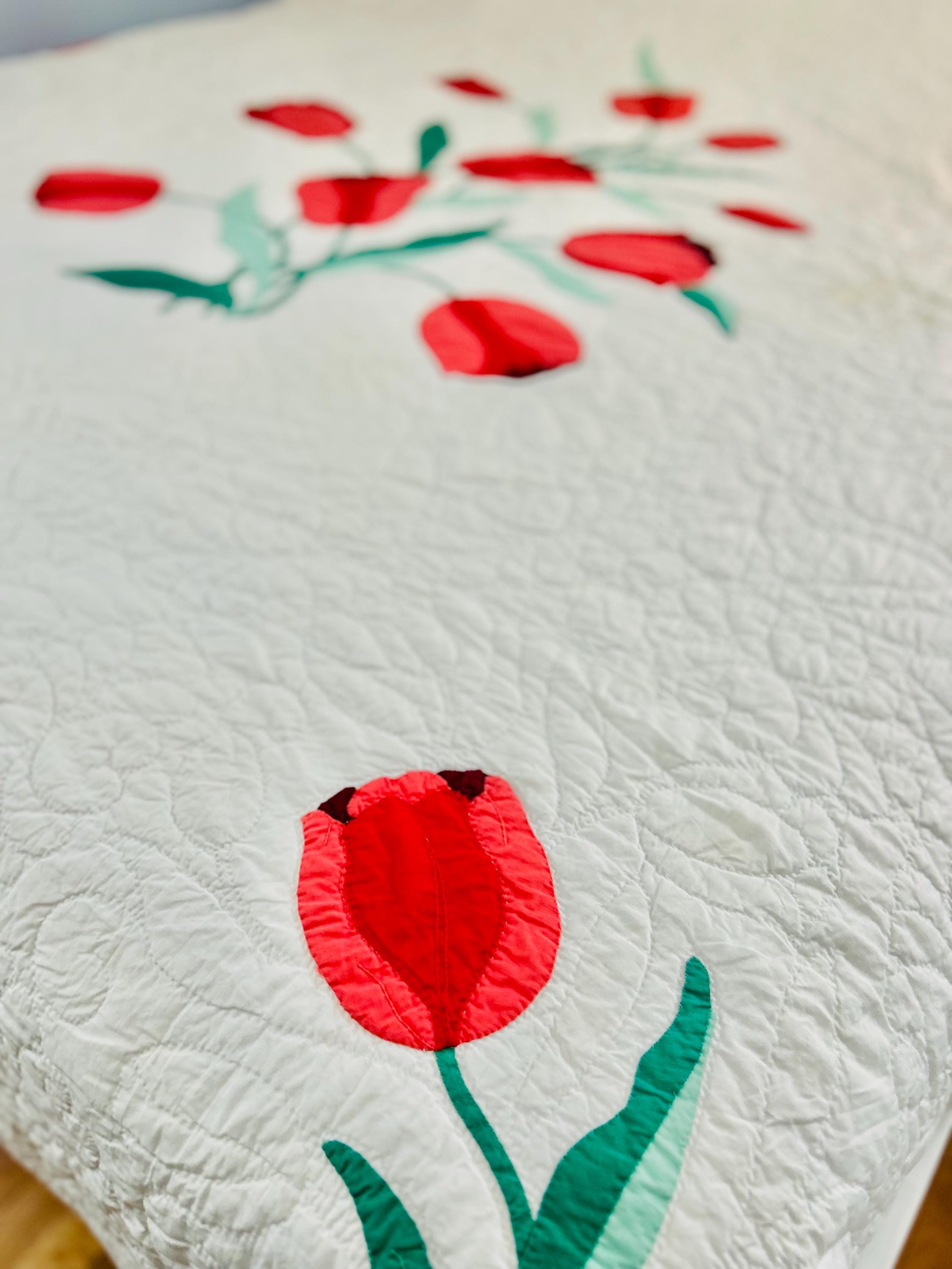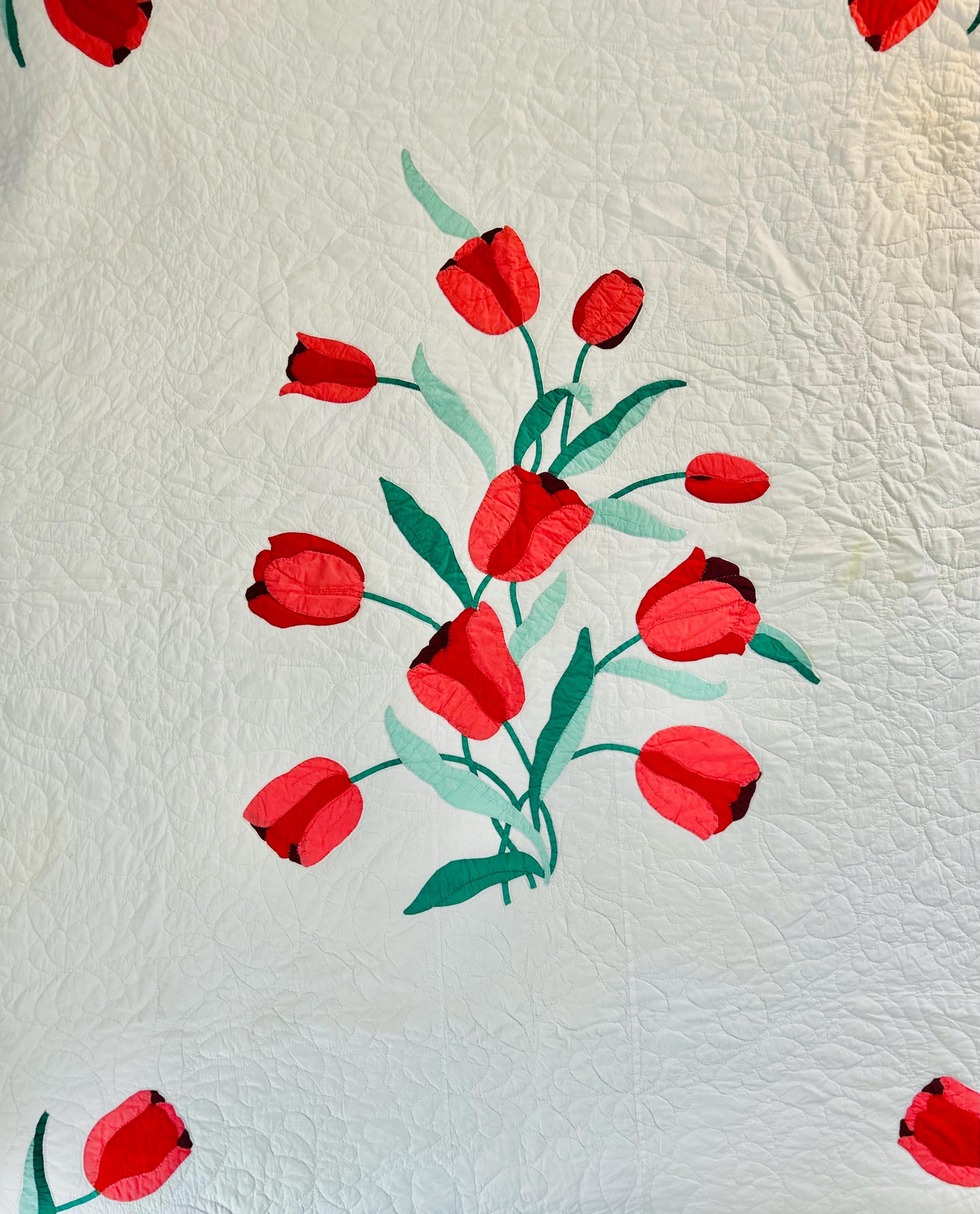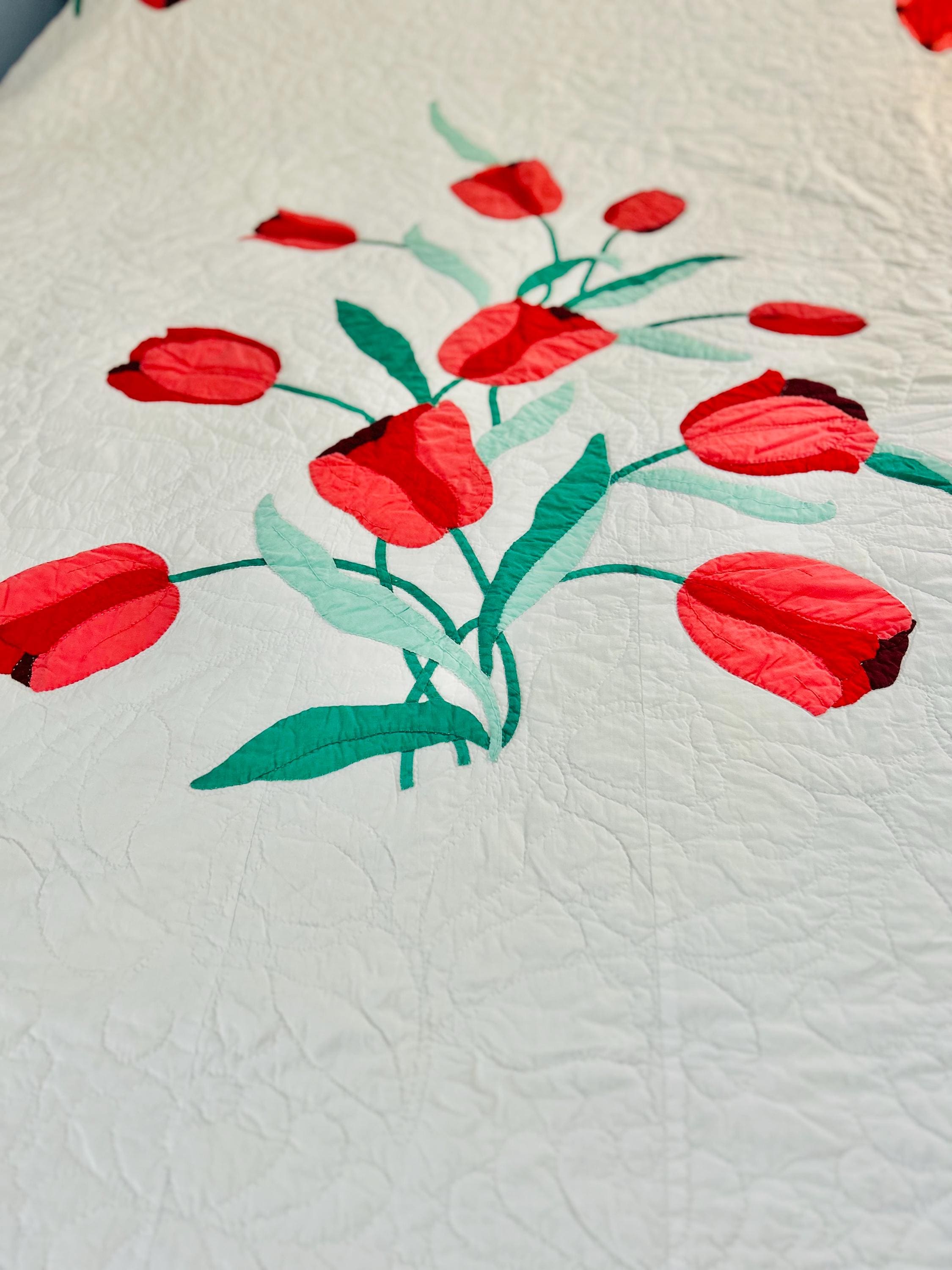 This Twirling Tulips Quilt is circa 1940s-1950s and appears to have been made from a kit sold by Monarch in the 1940s. The applique has been hand-stitched and hand embroidered and the quilting is entirely by hand in feathers and flowers.