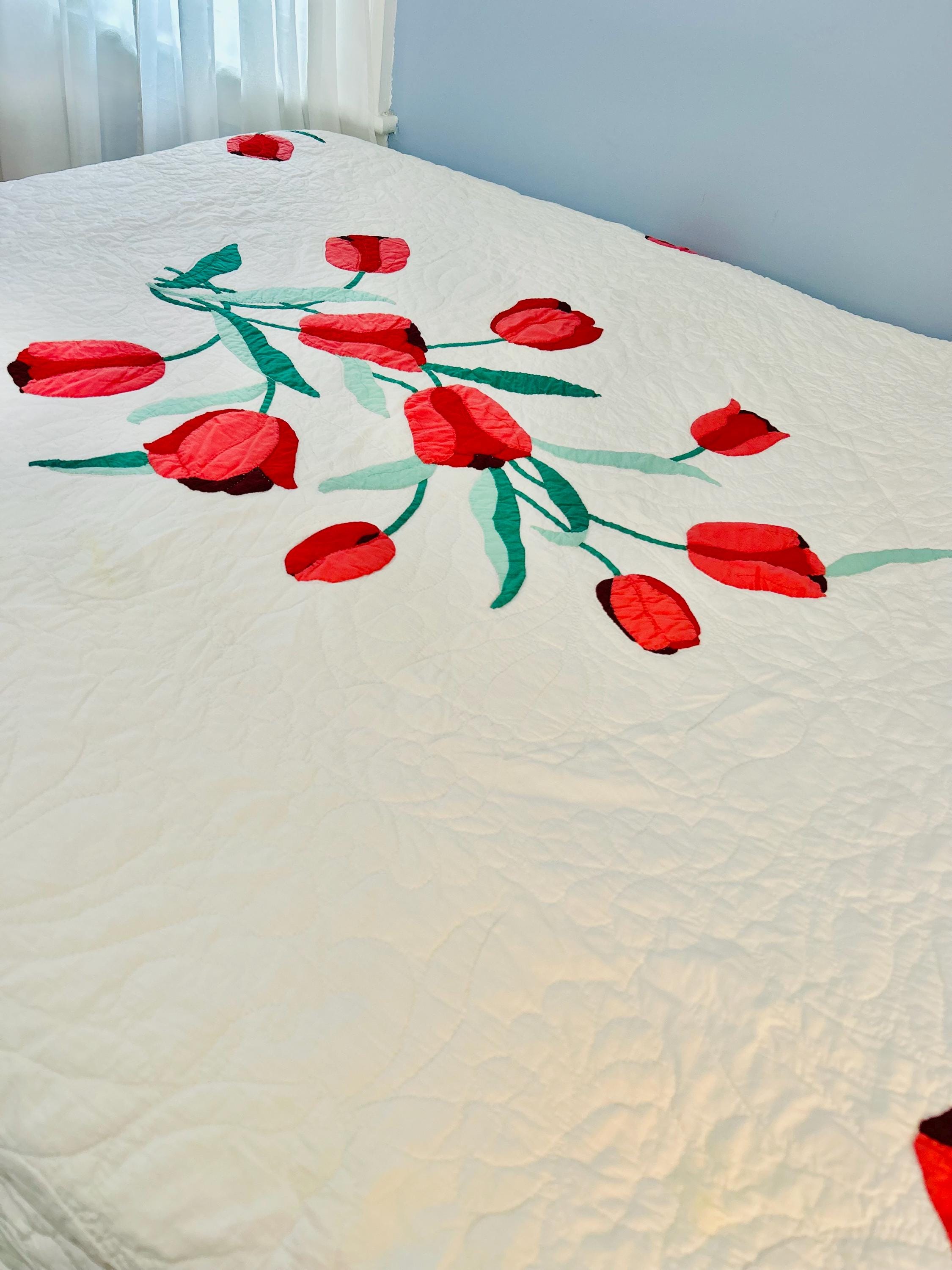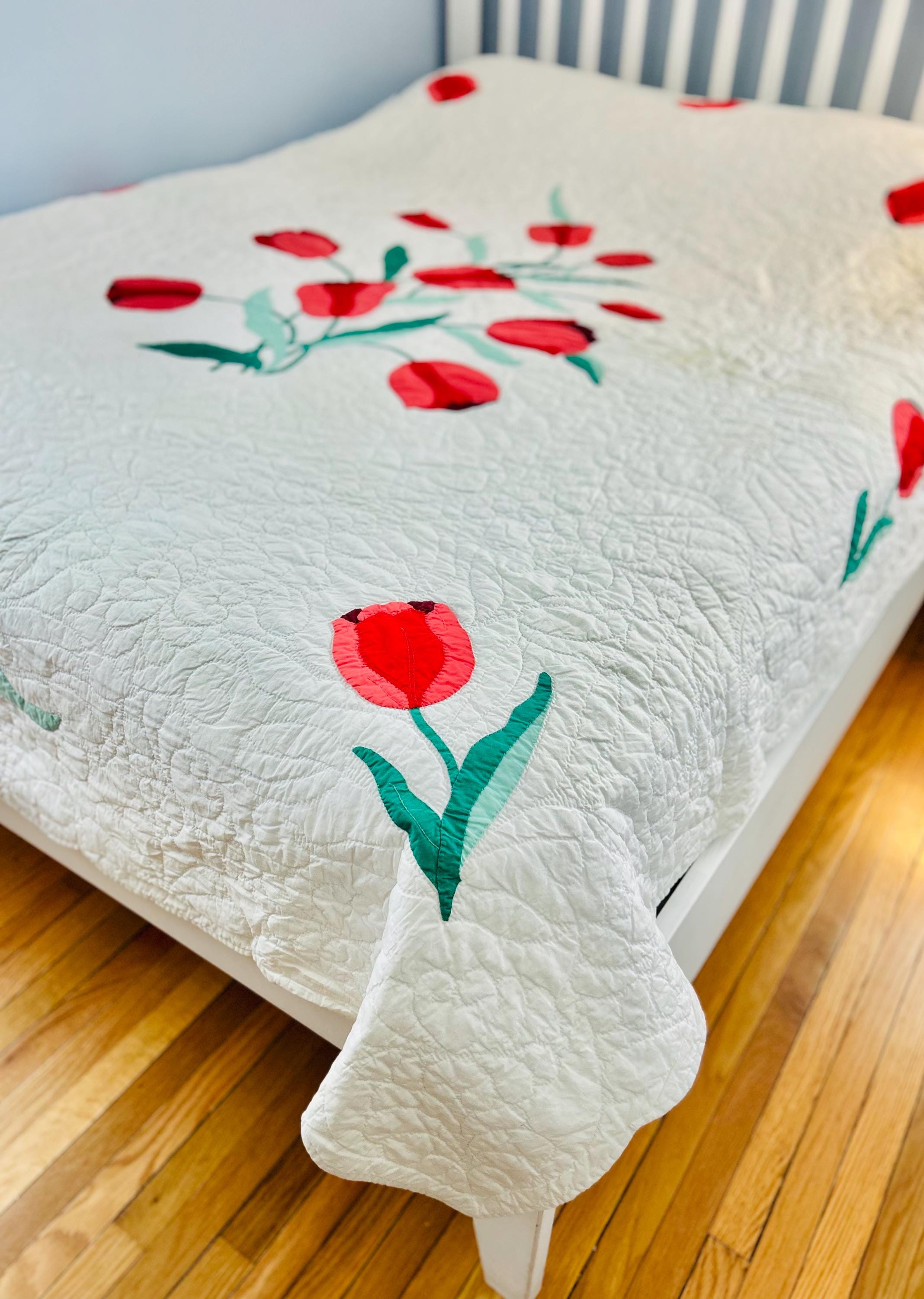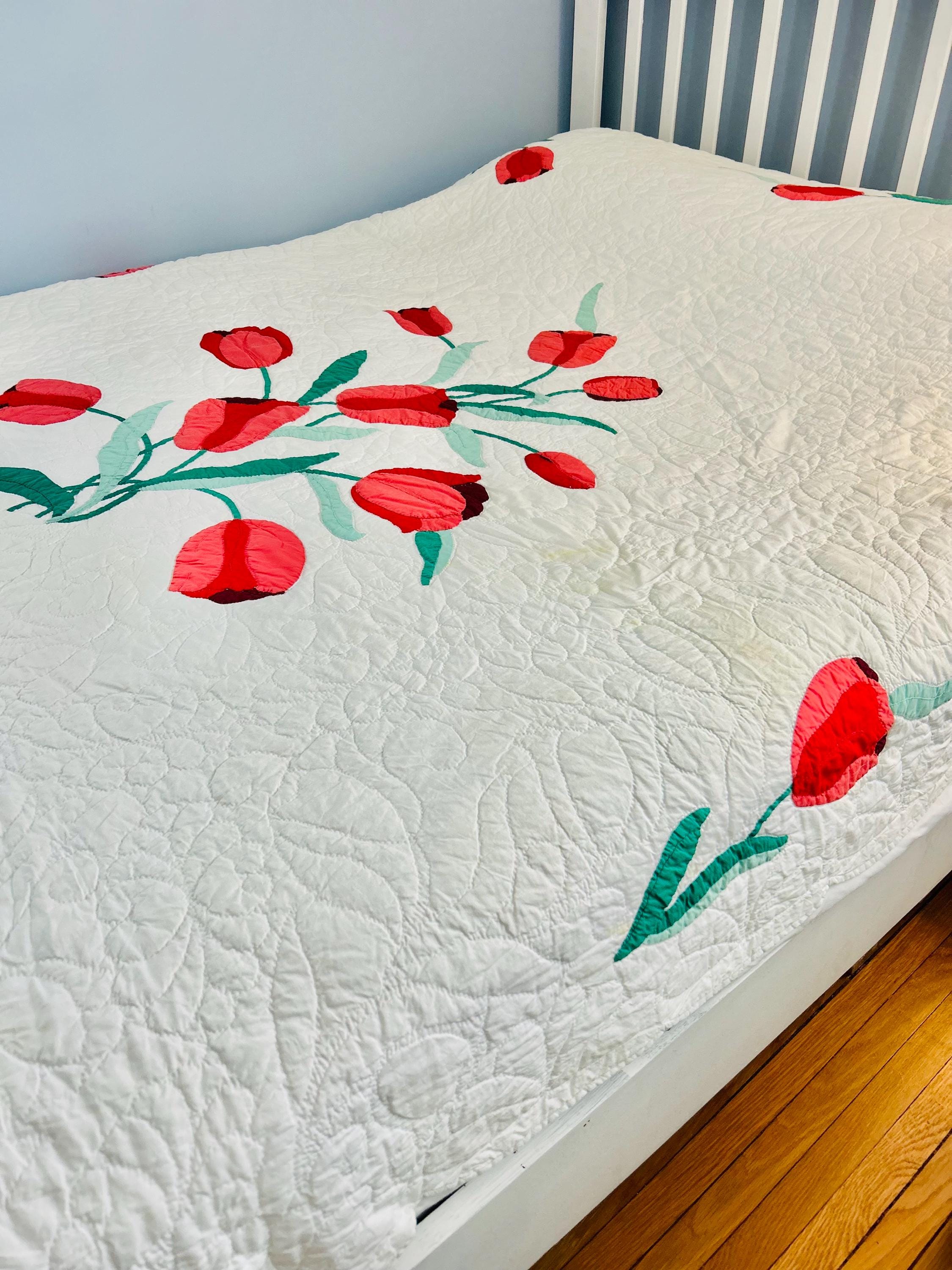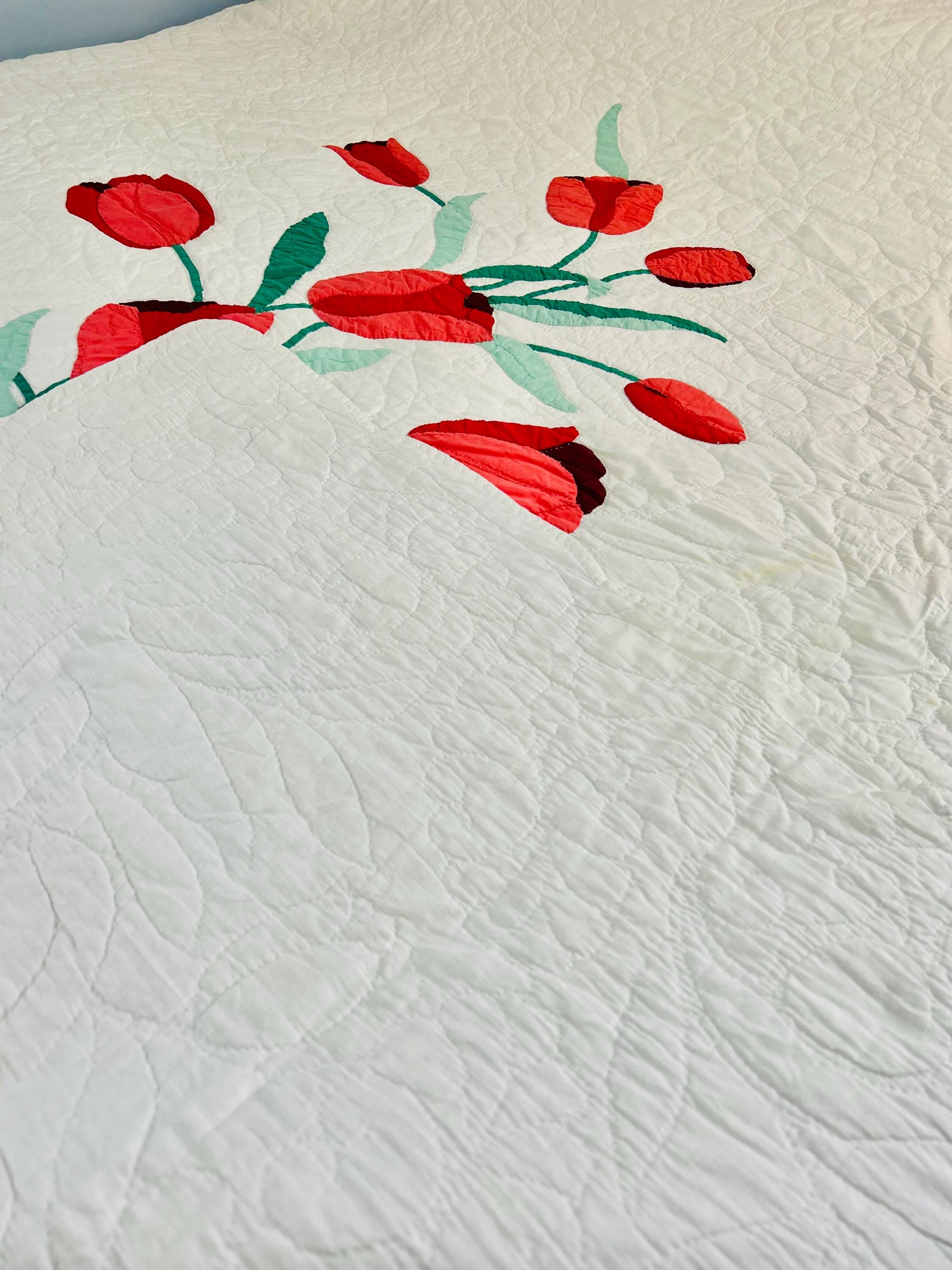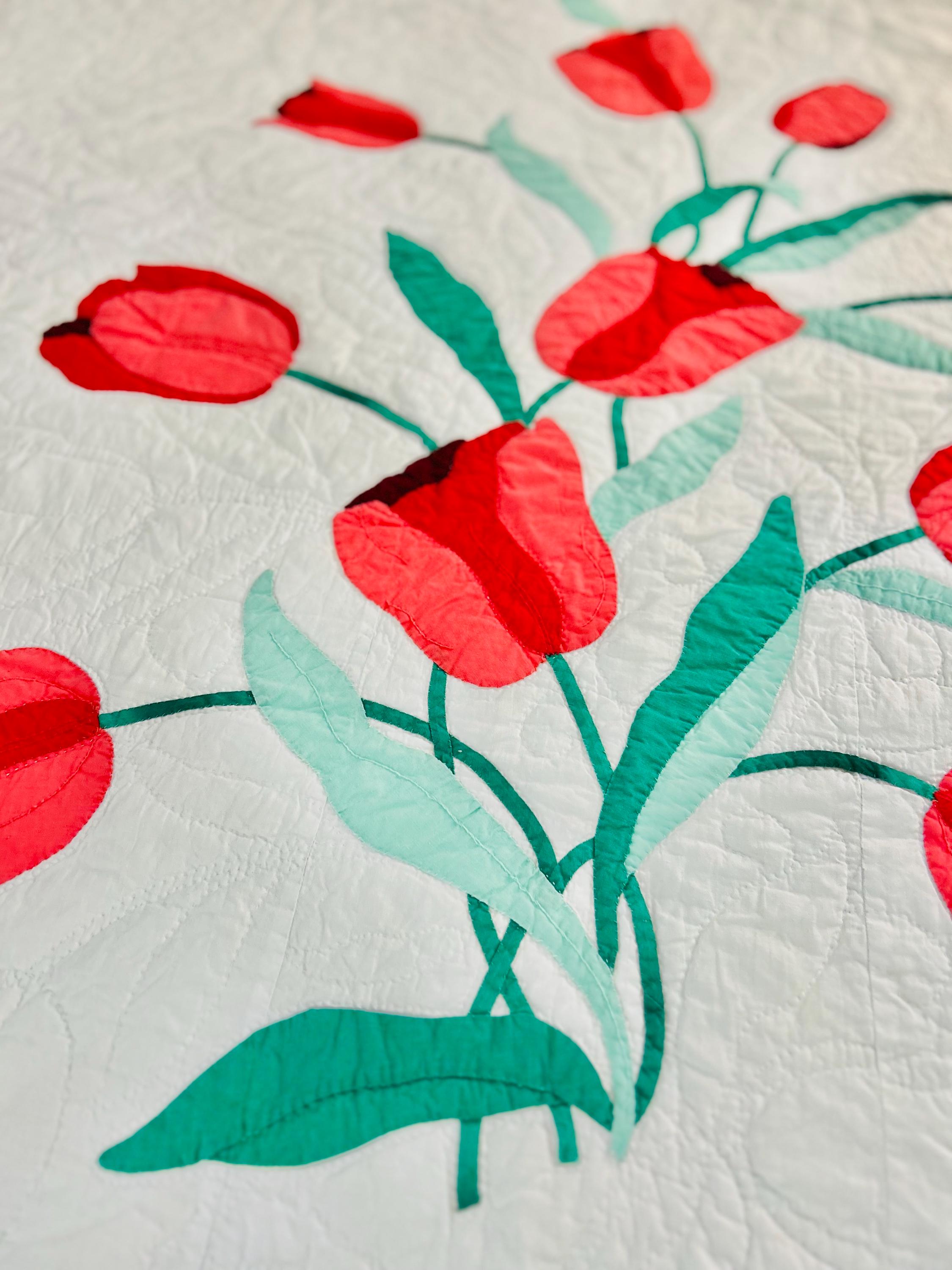 This Twirling Tulips Quilt is circa 1940s-1950s and appears to have been made from a kit sold by Monarch in the 1940s. The applique has been hand-stitched and hand embroidered and the quilting is entirely by hand in feathers and flowers.