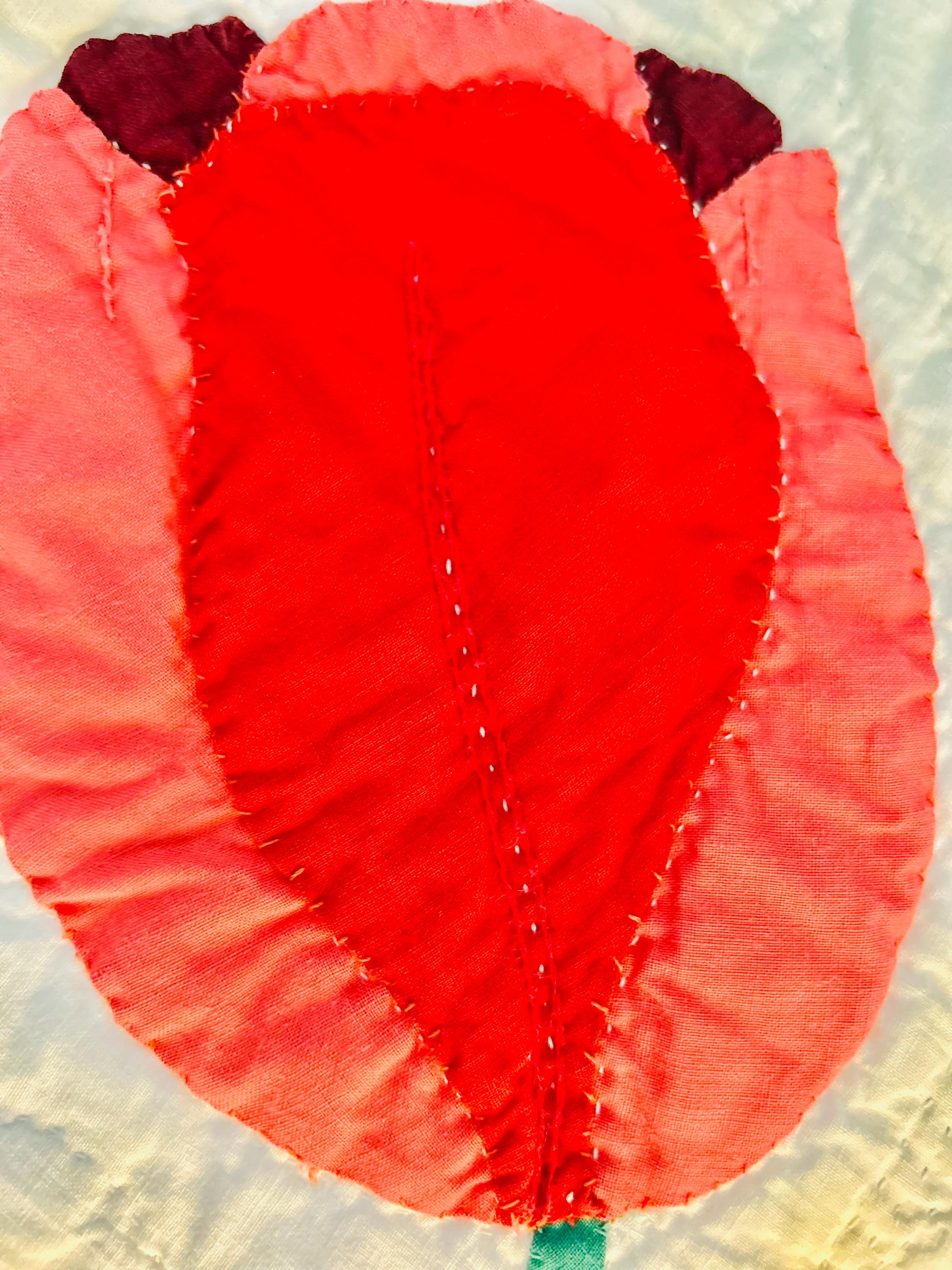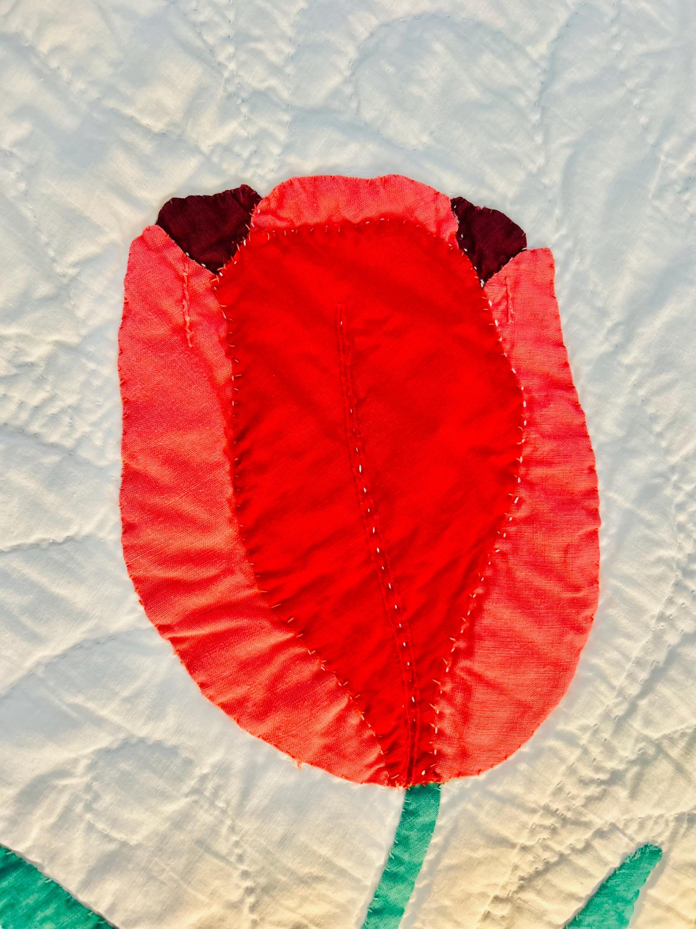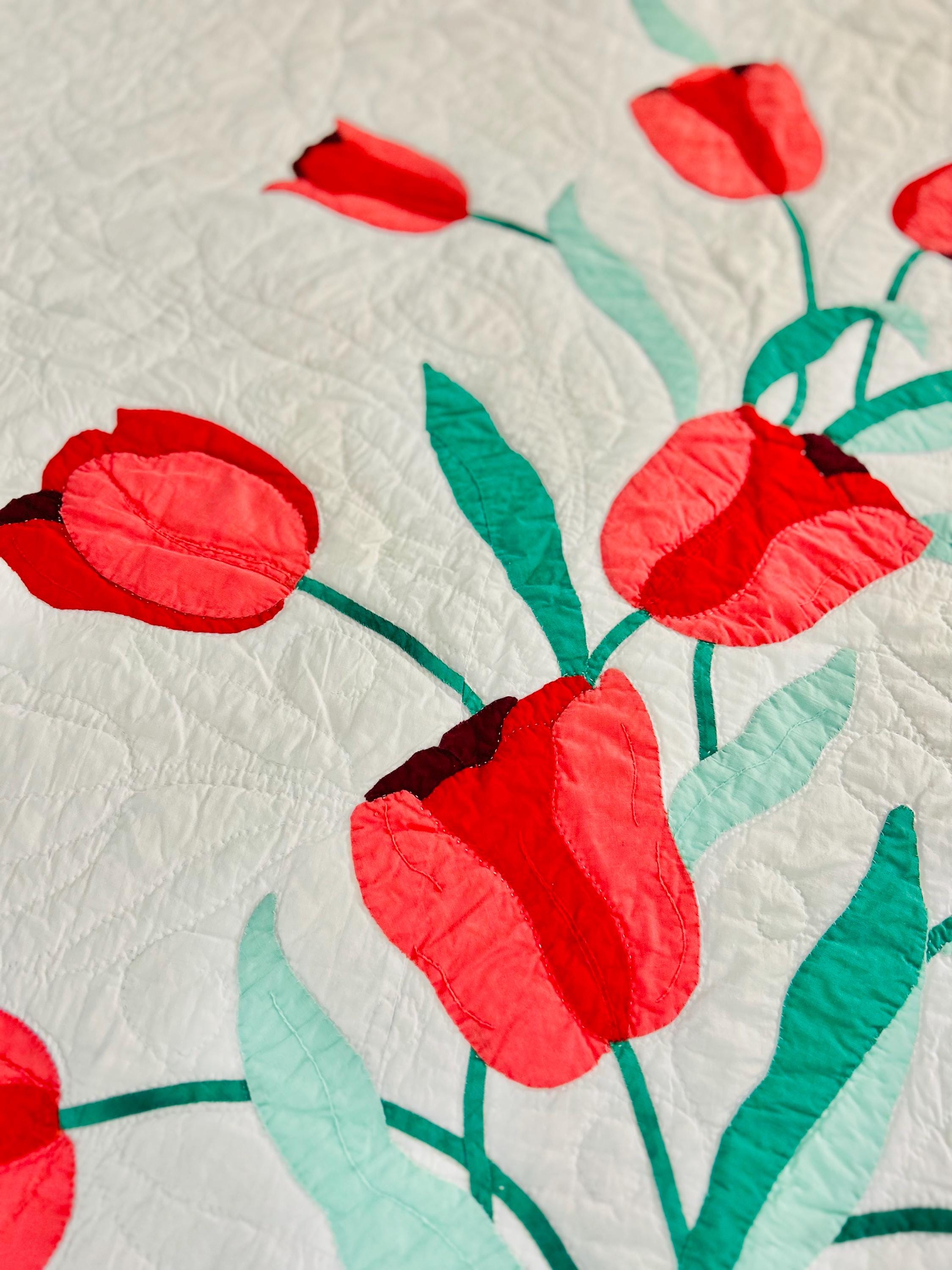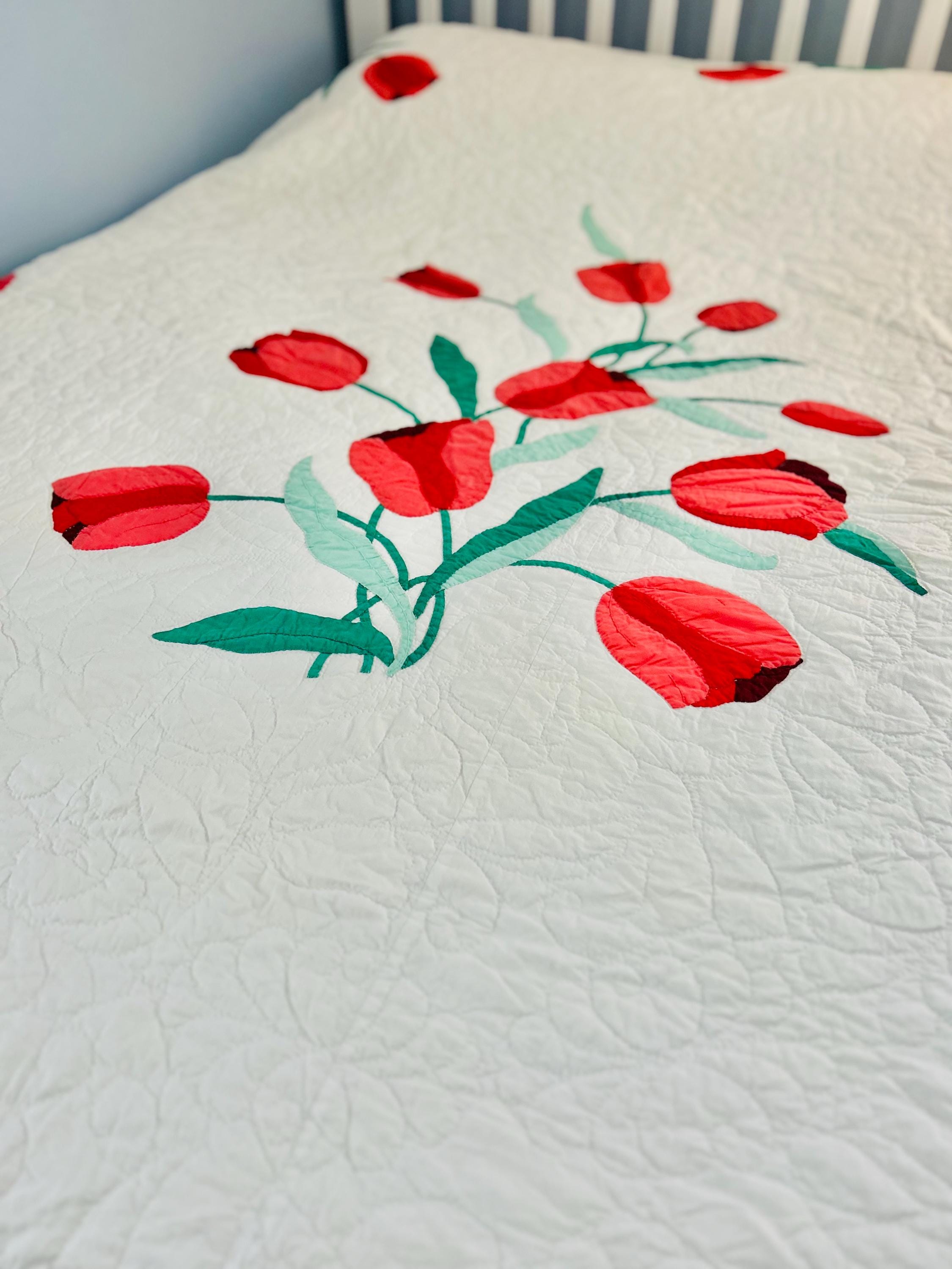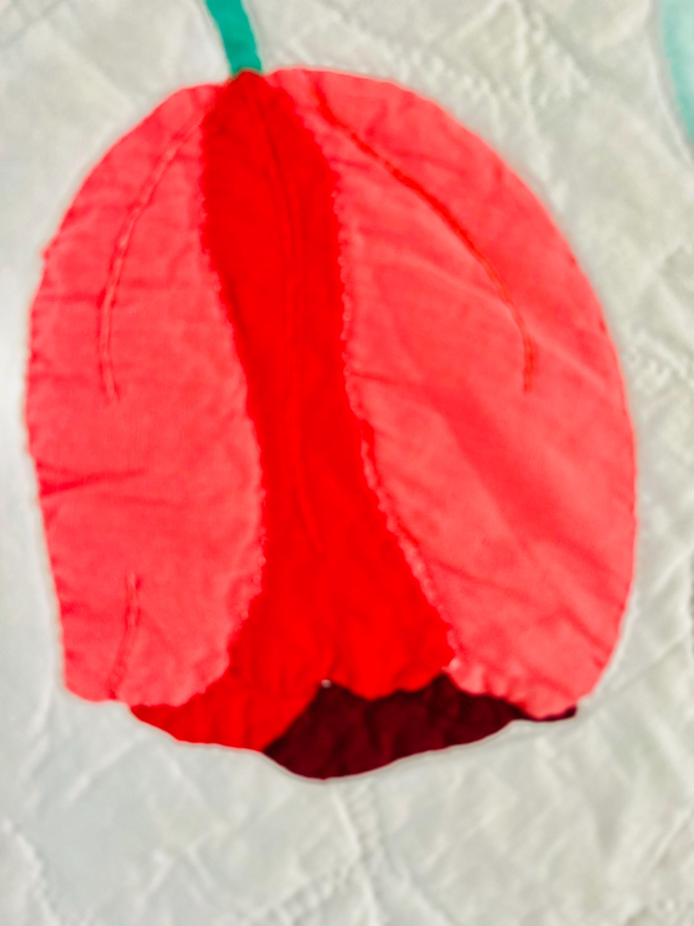 This Twirling Tulips Quilt is circa 1940s-1950s and appears to have been made from a kit sold by Monarch in the 1940s. The applique has been hand-stitched and hand embroidered and the quilting is entirely by hand in feathers and flowers.