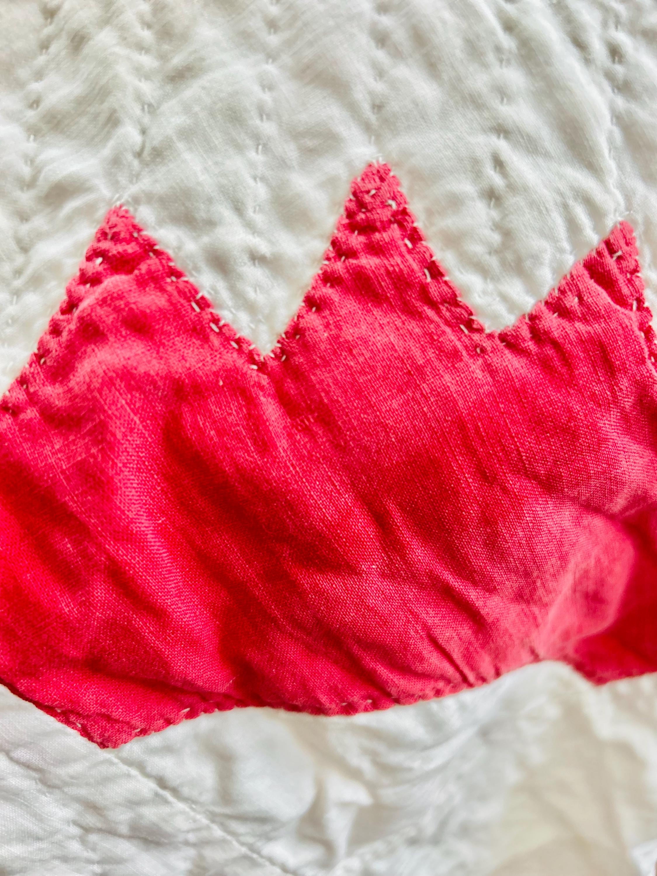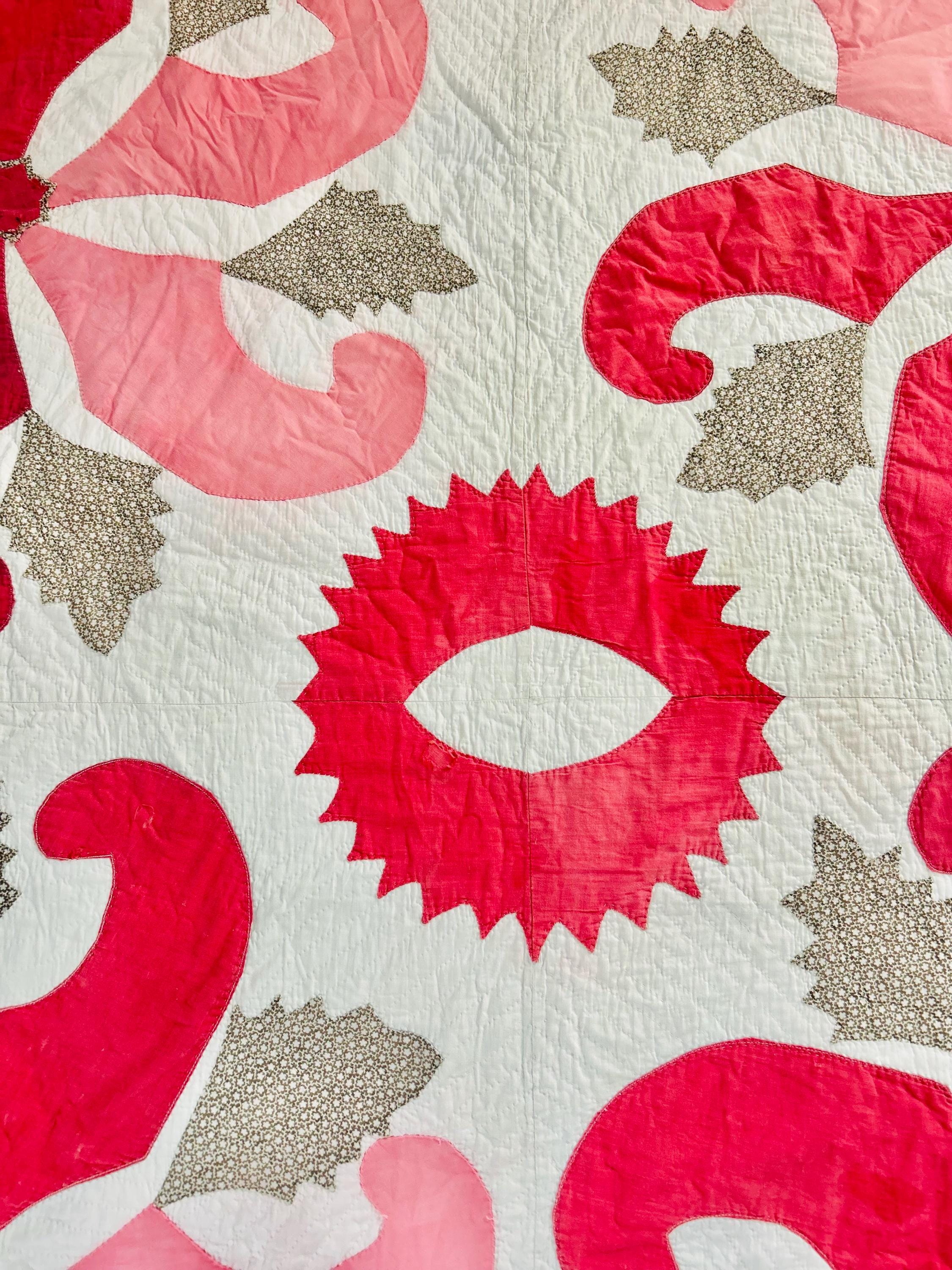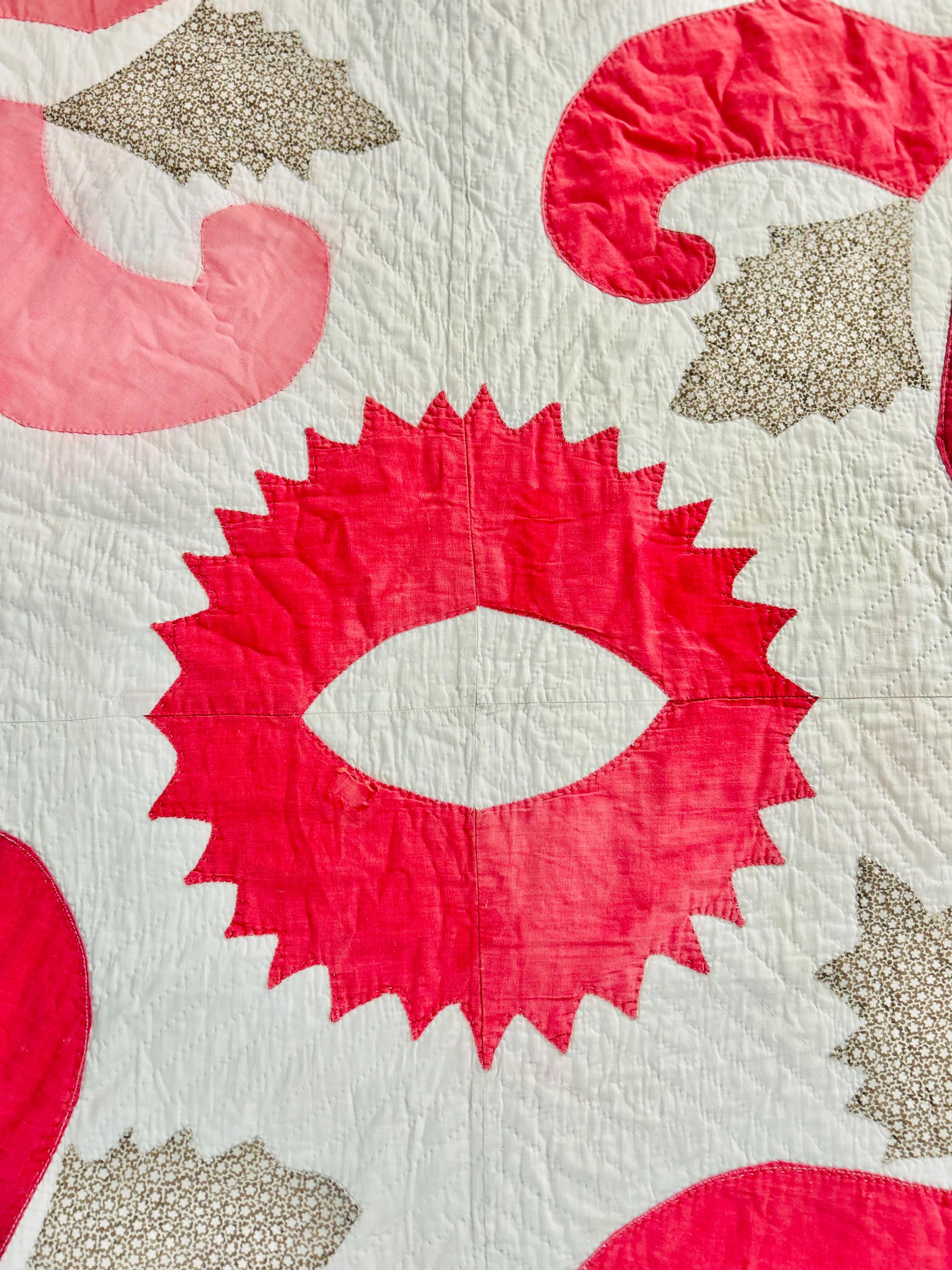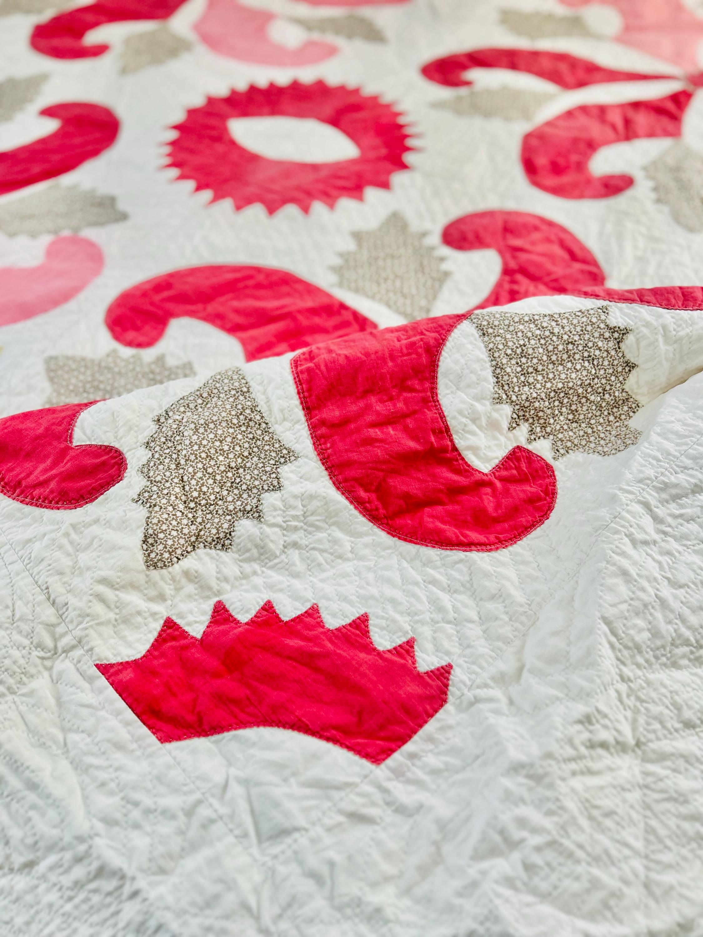 The embellishments on this Princess Feather Quilt (circa 1890-1910) are unique, quirky and playful. What look like oak leaves in a tan print hang from the hand-appliqued Princess Feathers and the quilter has added jagged edged half-circles and circles to the corners, the top and bottom and in the center. The quilting is in a complex braided rope pattern along the four-sided border while diagonals and diamonds are quilted in the body of the quilt. The hand-quilting also outlines the applique.