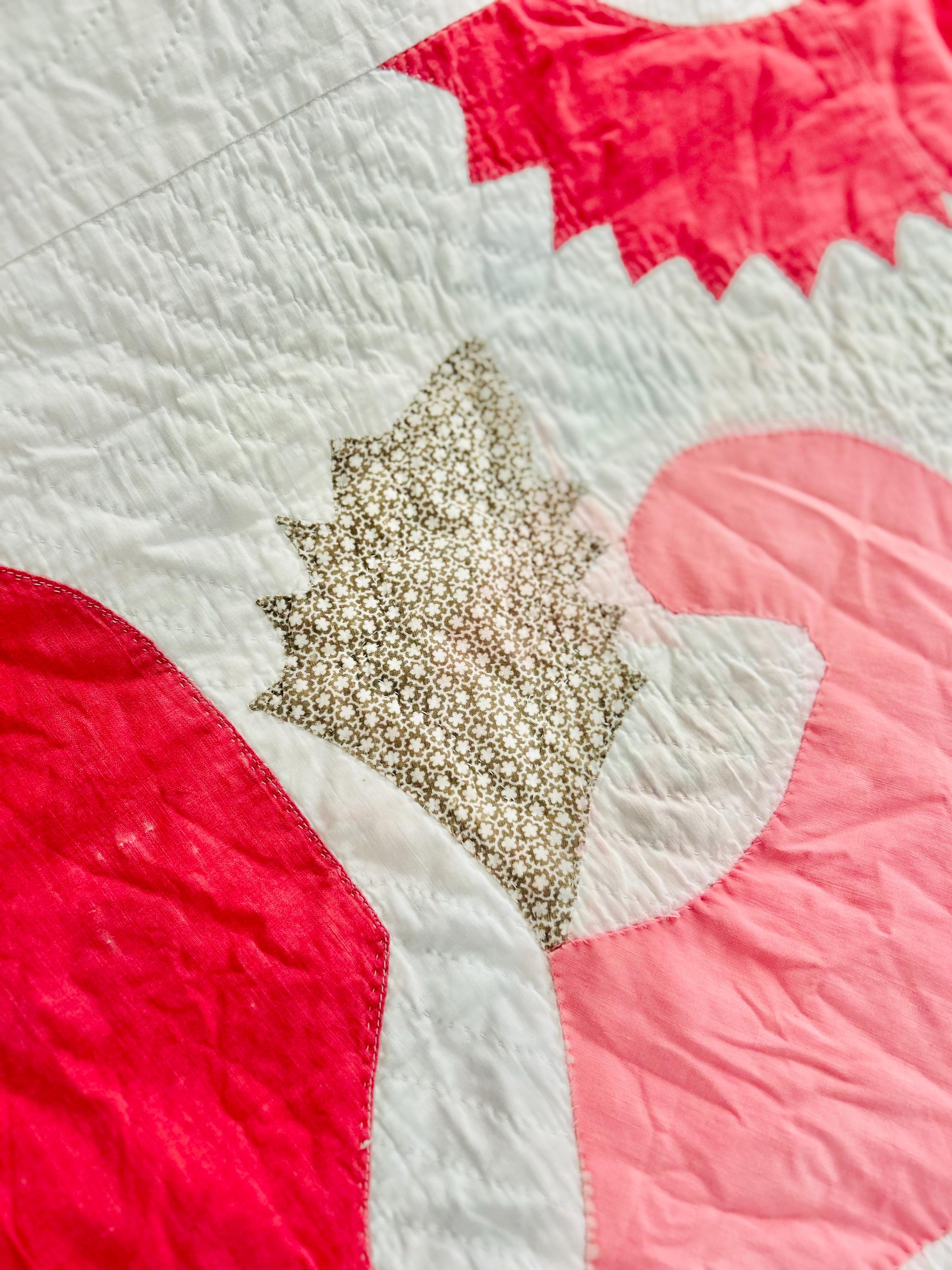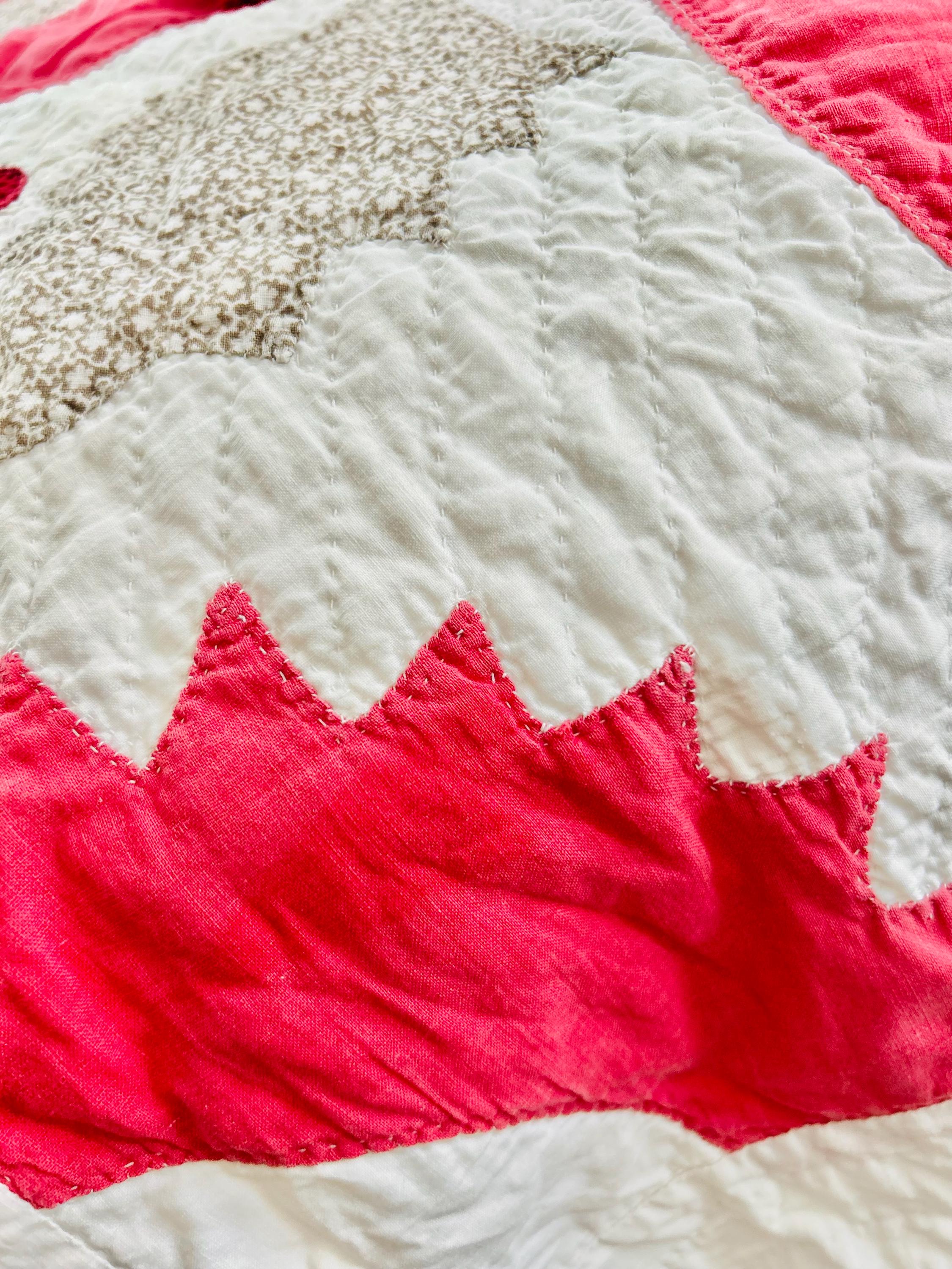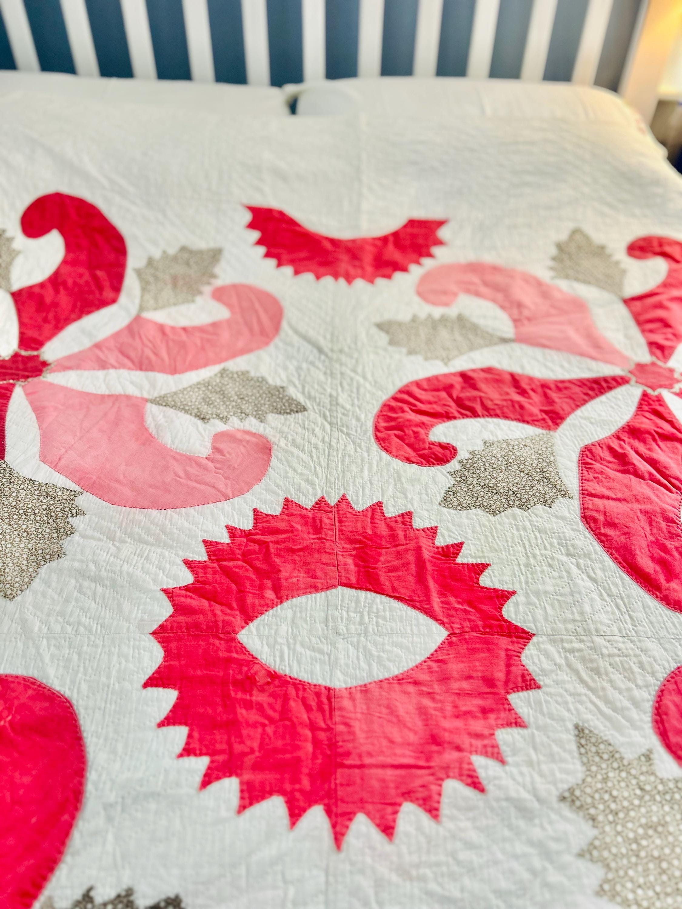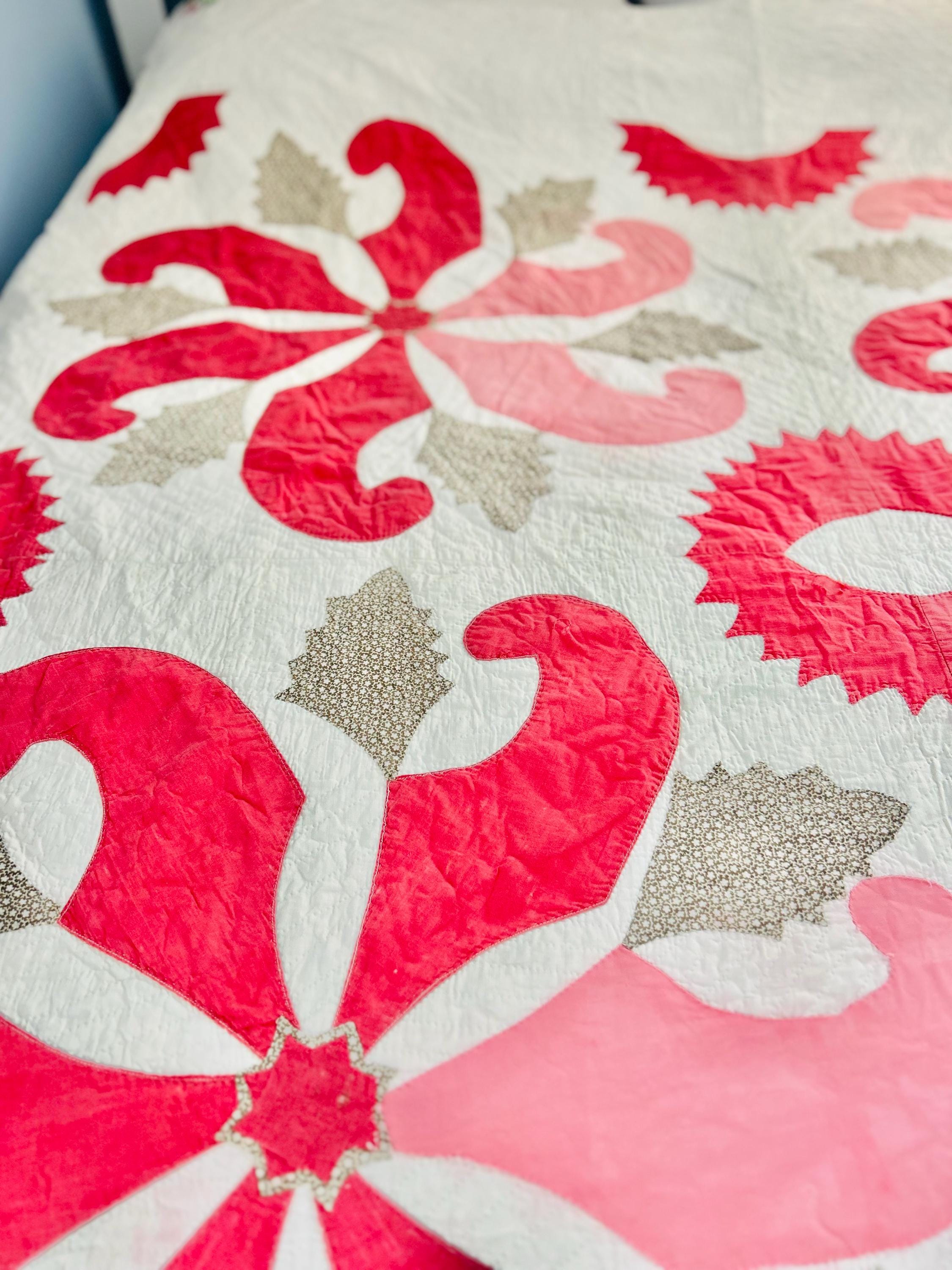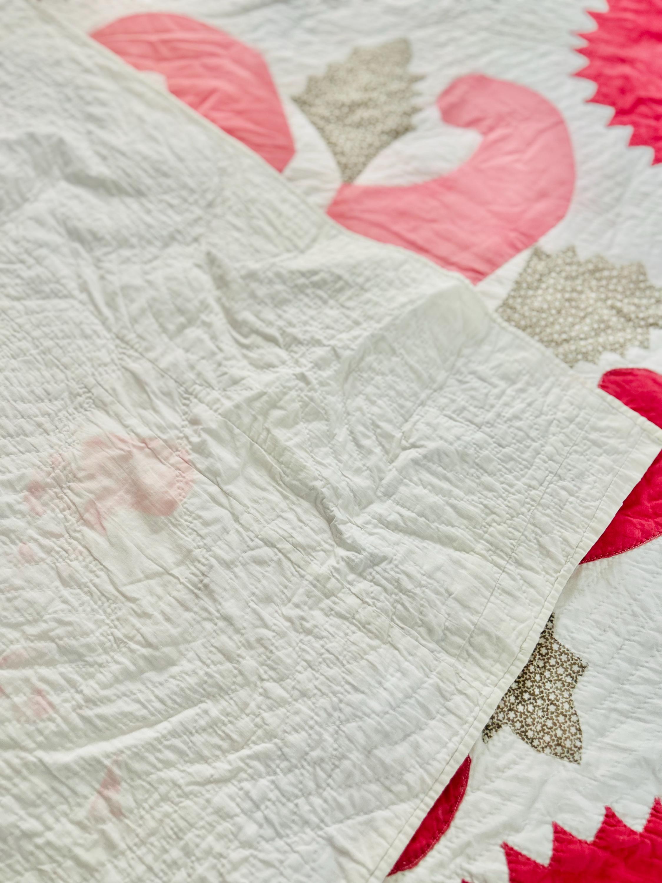 The embellishments on this Princess Feather Quilt (circa 1890-1910) are unique, quirky and playful. What look like oak leaves in a tan print hang from the hand-appliqued Princess Feathers and the quilter has added jagged edged half-circles and circles to the corners, the top and bottom and in the center. The quilting is in a complex braided rope pattern along the four-sided border while diagonals and diamonds are quilted in the body of the quilt. The hand-quilting also outlines the applique.
