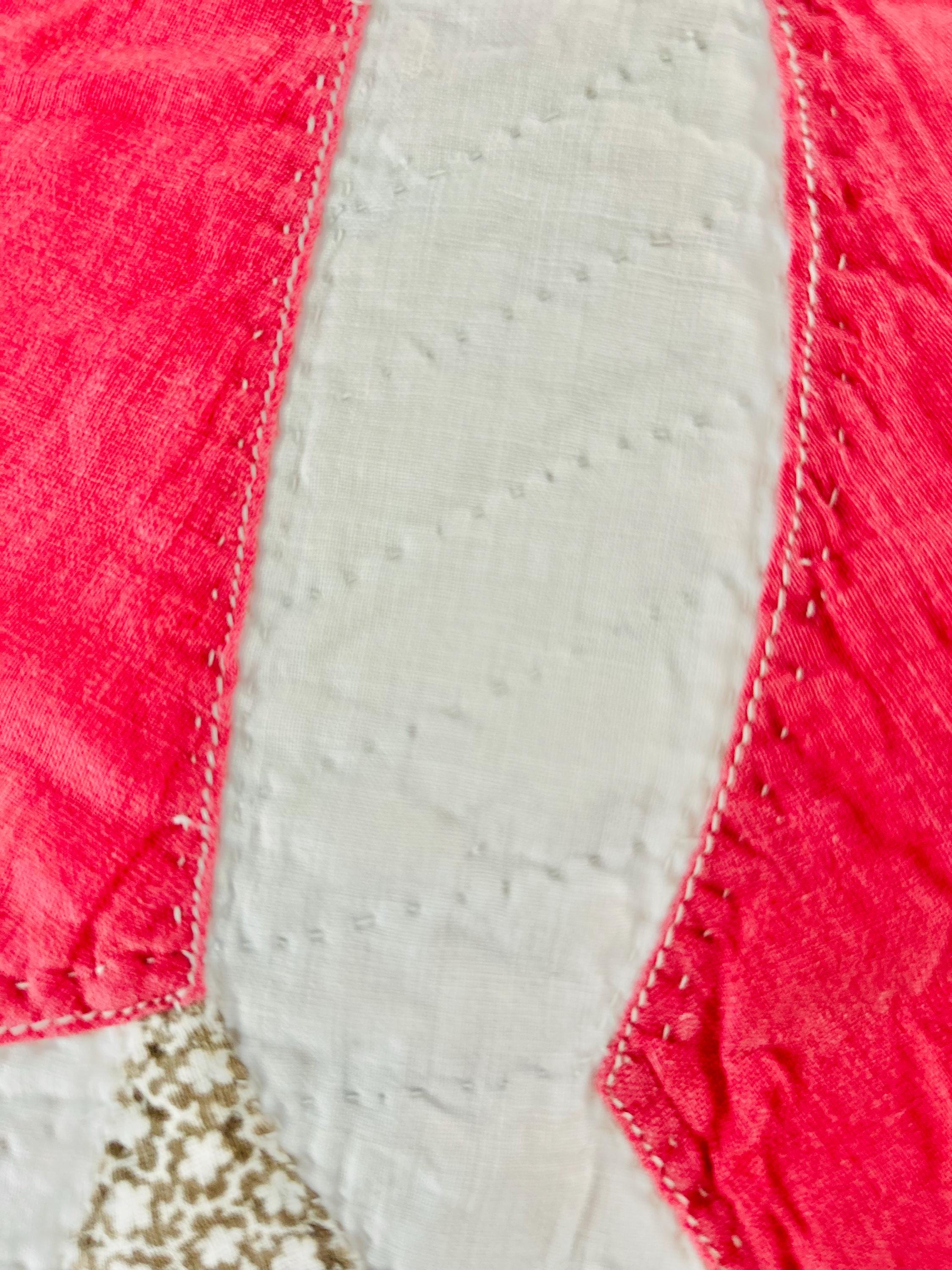 The back is white cotton while the white cotton from the front border has been turned to the back and hand-stitched to form the binding. The cotton batting is very lightweight.