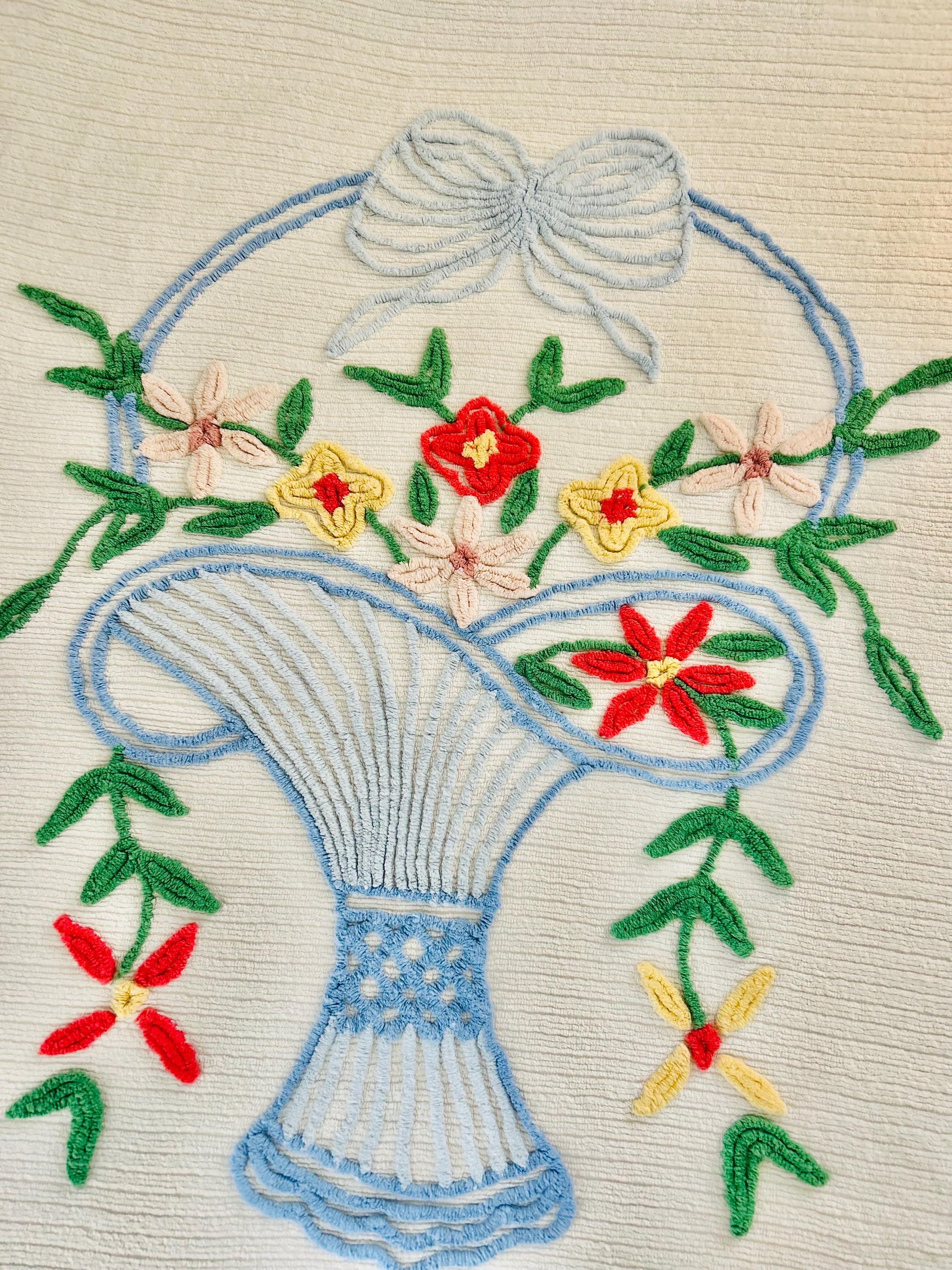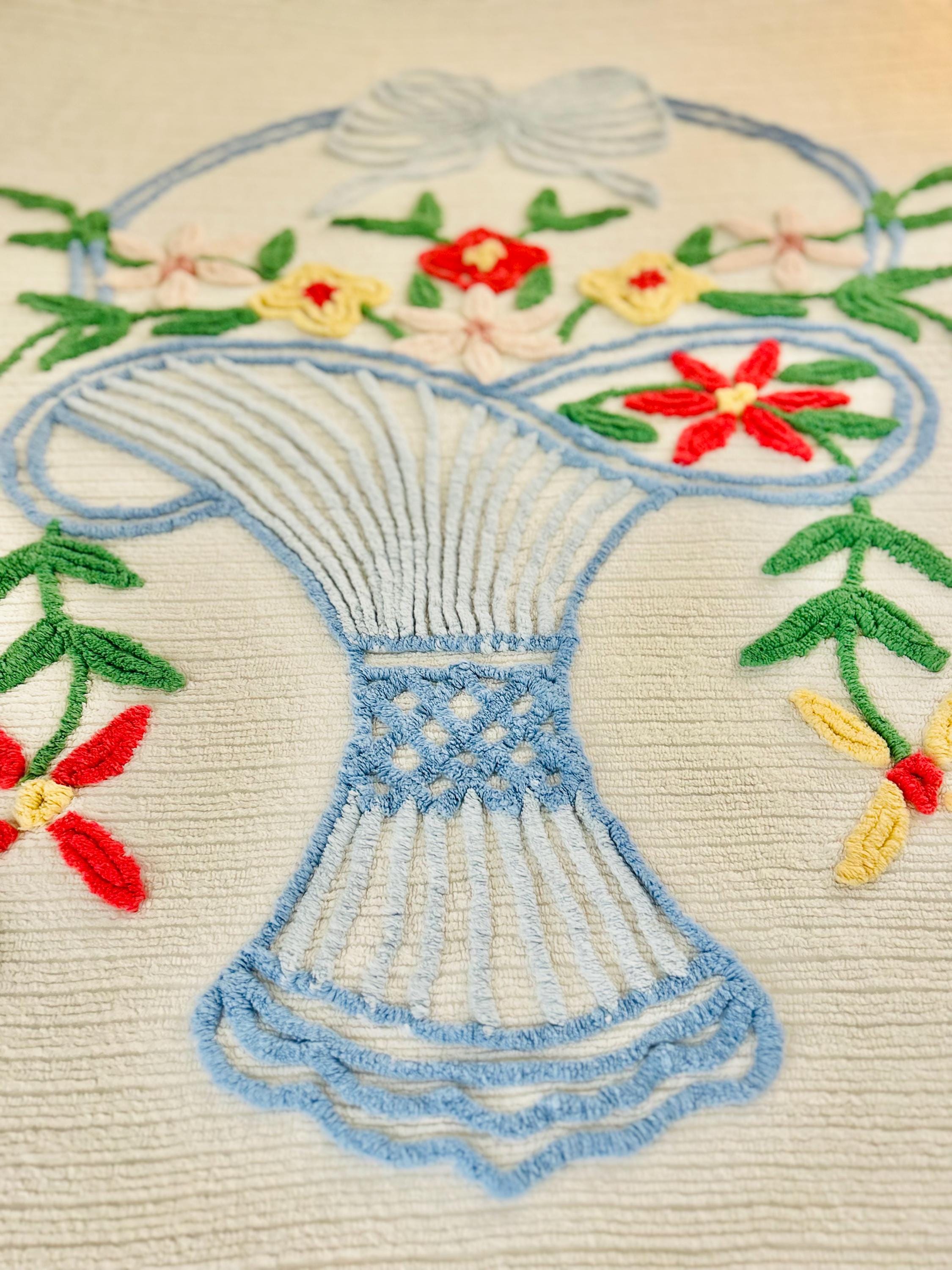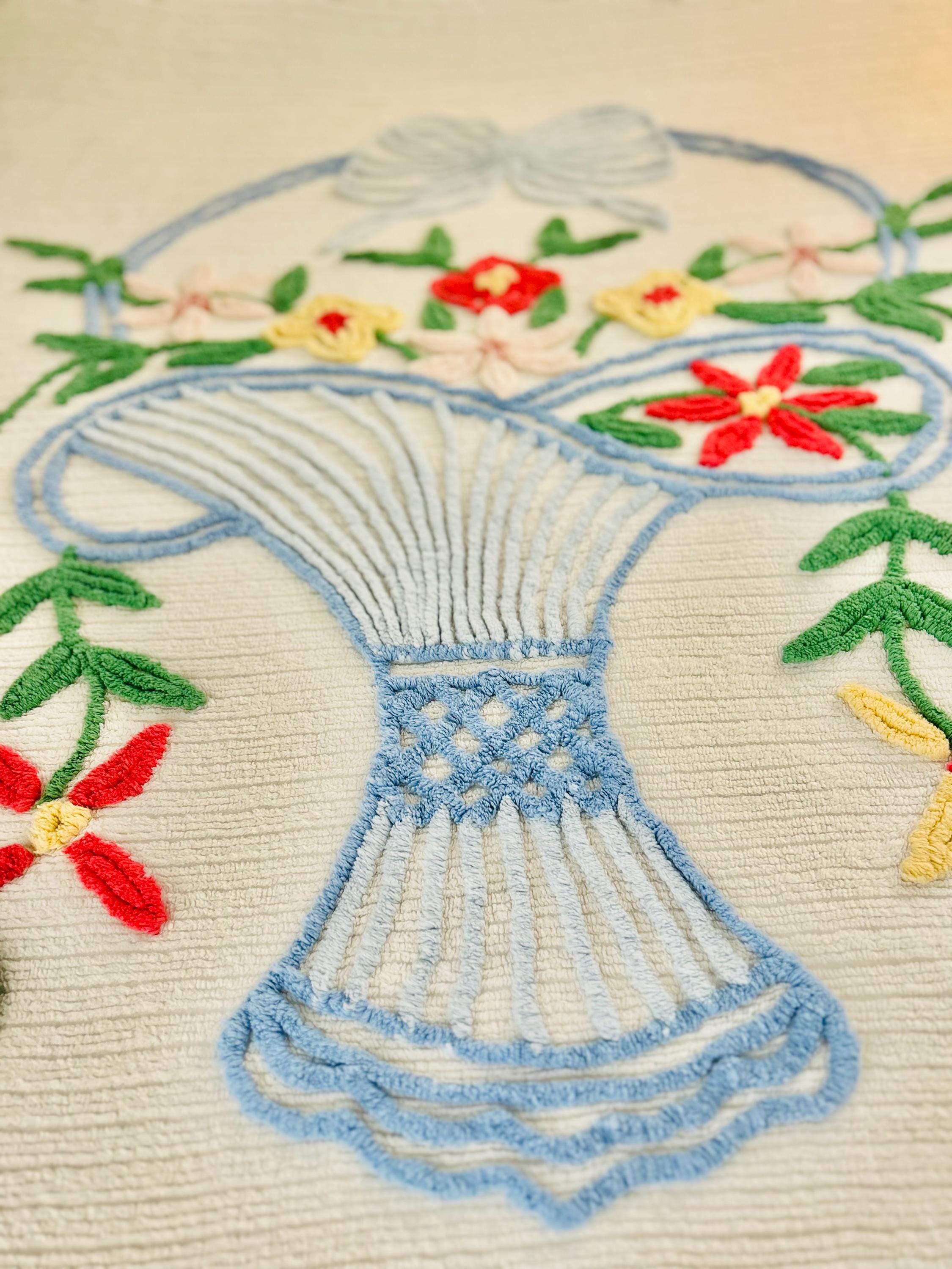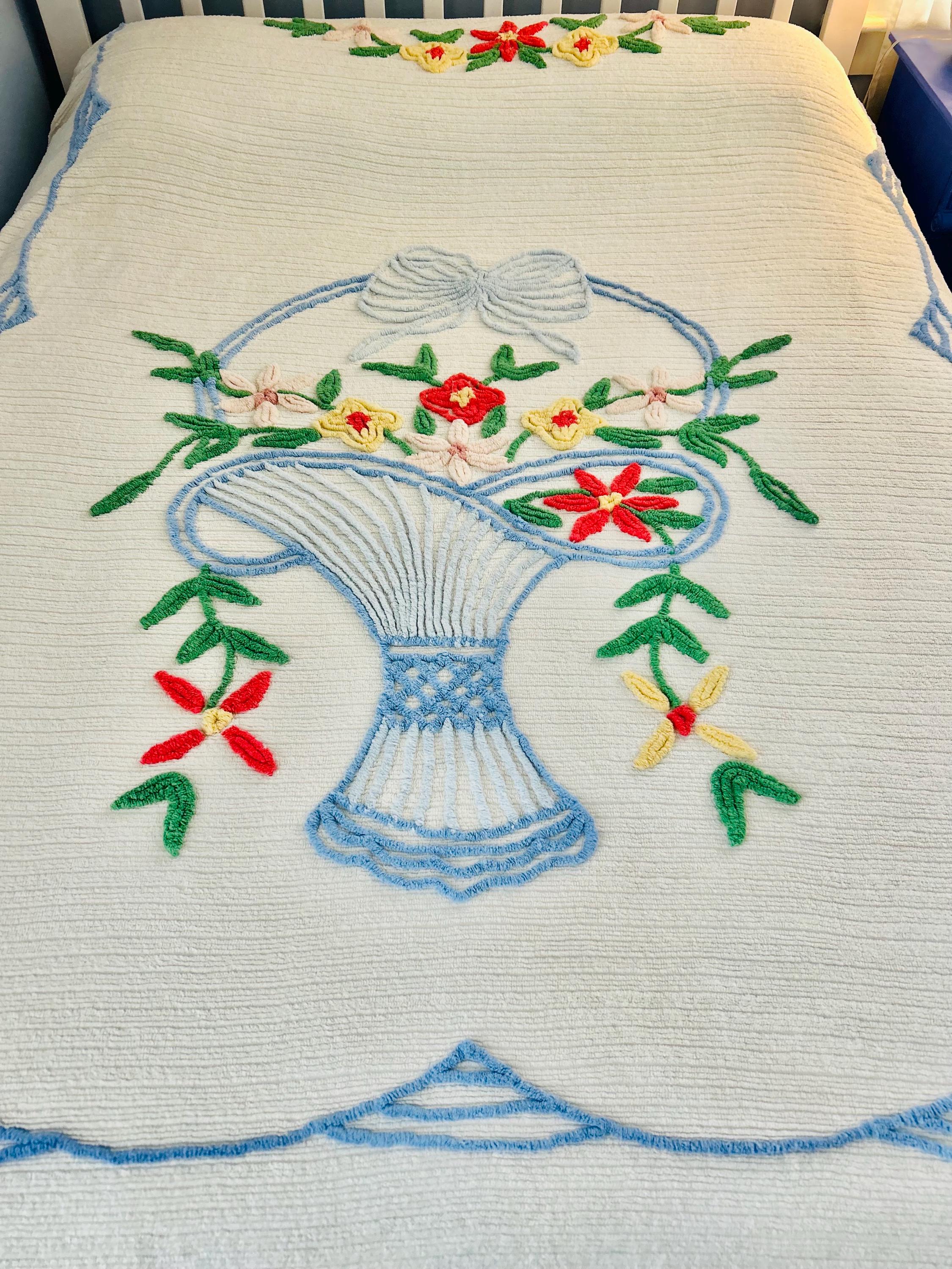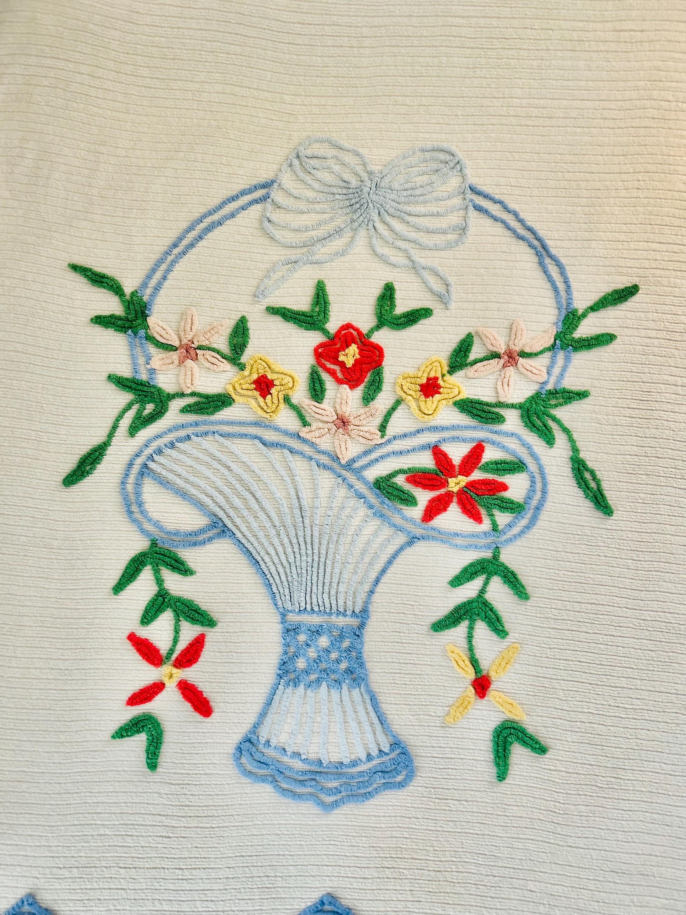 This Basket of Flowers Mid-Century Modern Chenille bedspread is circa 1950s-1960s and is bright and fluffy all over with no bald spots, holes or stains. The top is straight across while the bottom two edges are curved (see photos). It is in excellent vintage condition.