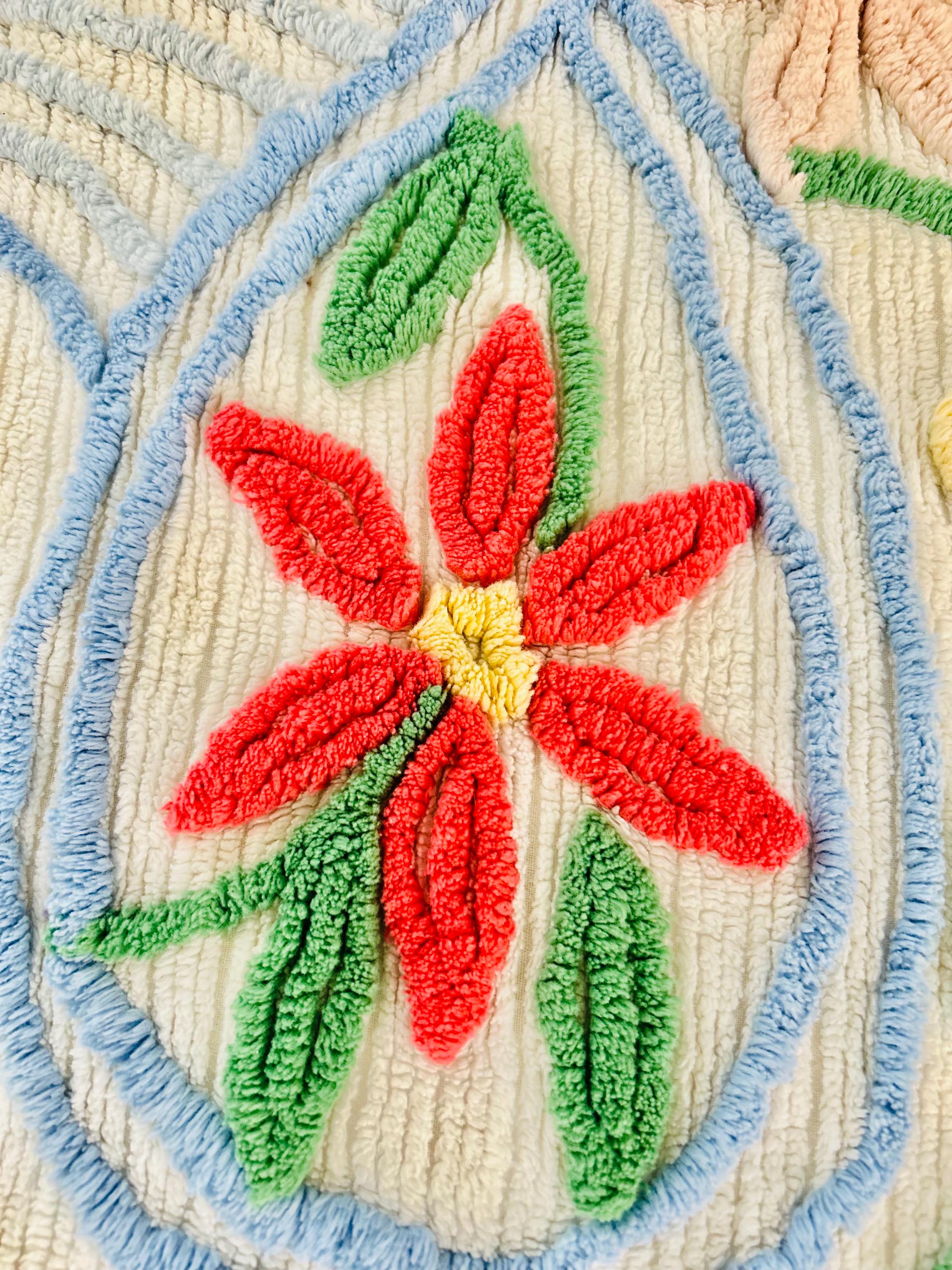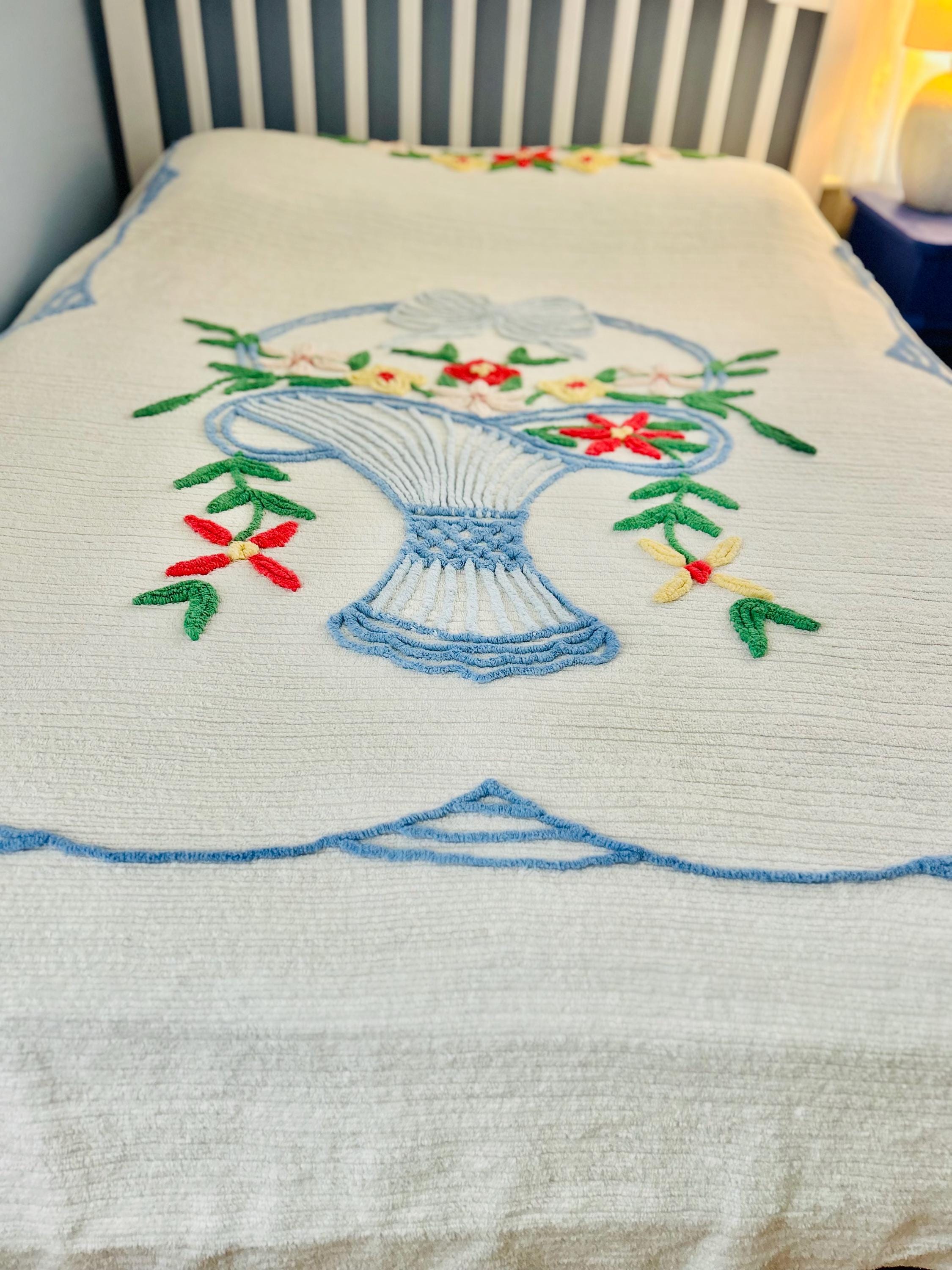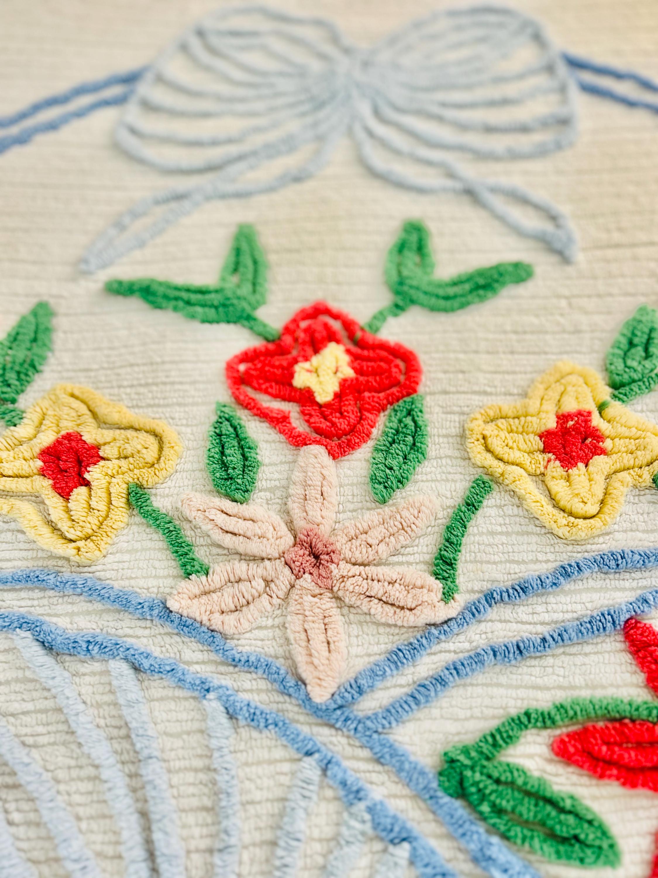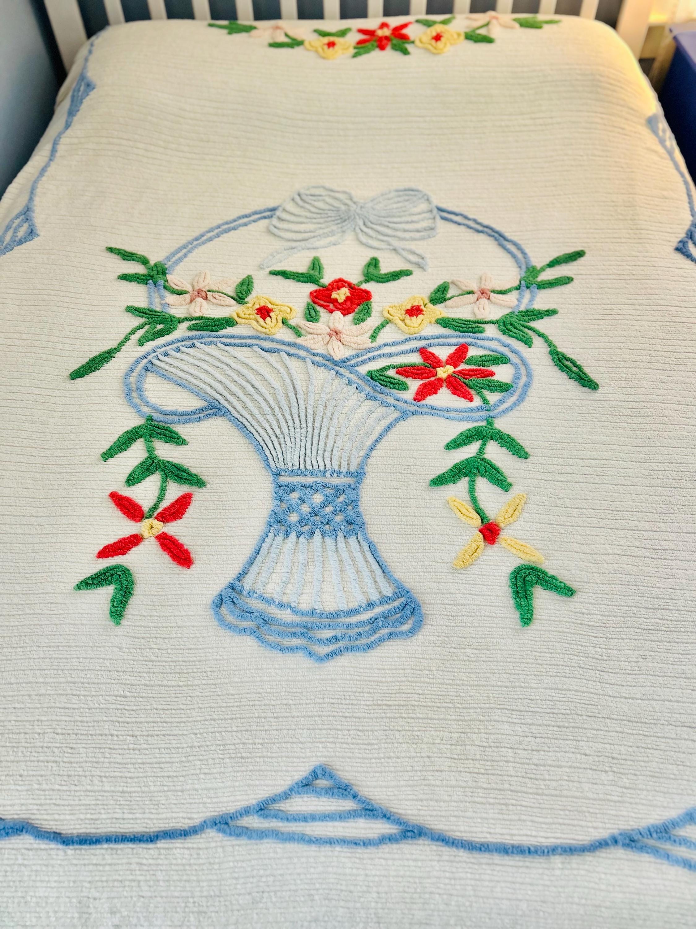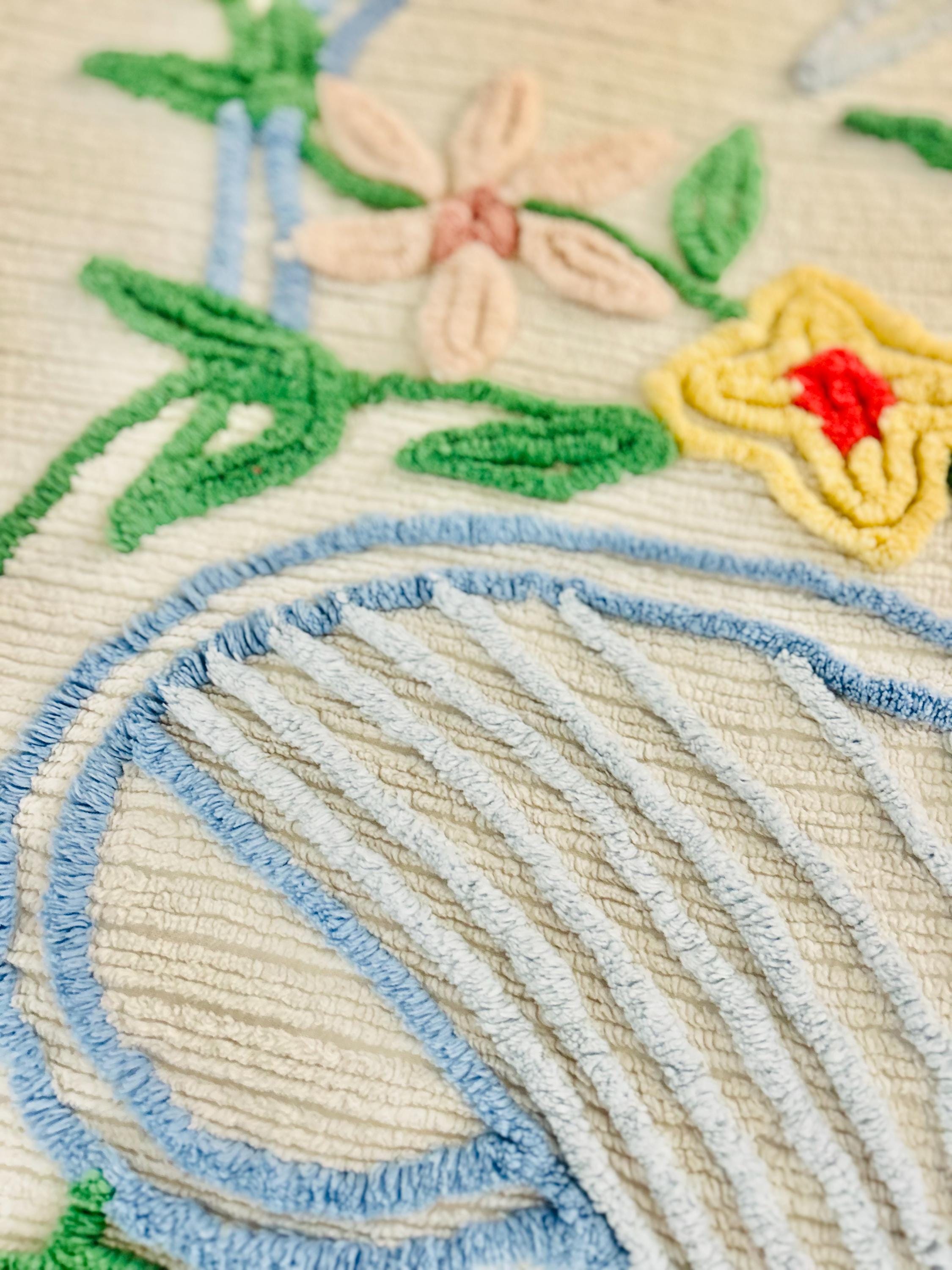 This Basket of Flowers Mid-Century Modern Chenille bedspread is circa 1950s-1960s and is bright and fluffy all over with no bald spots, holes or stains. The top is straight across while the bottom two edges are curved (see photos). It is in excellent vintage condition.