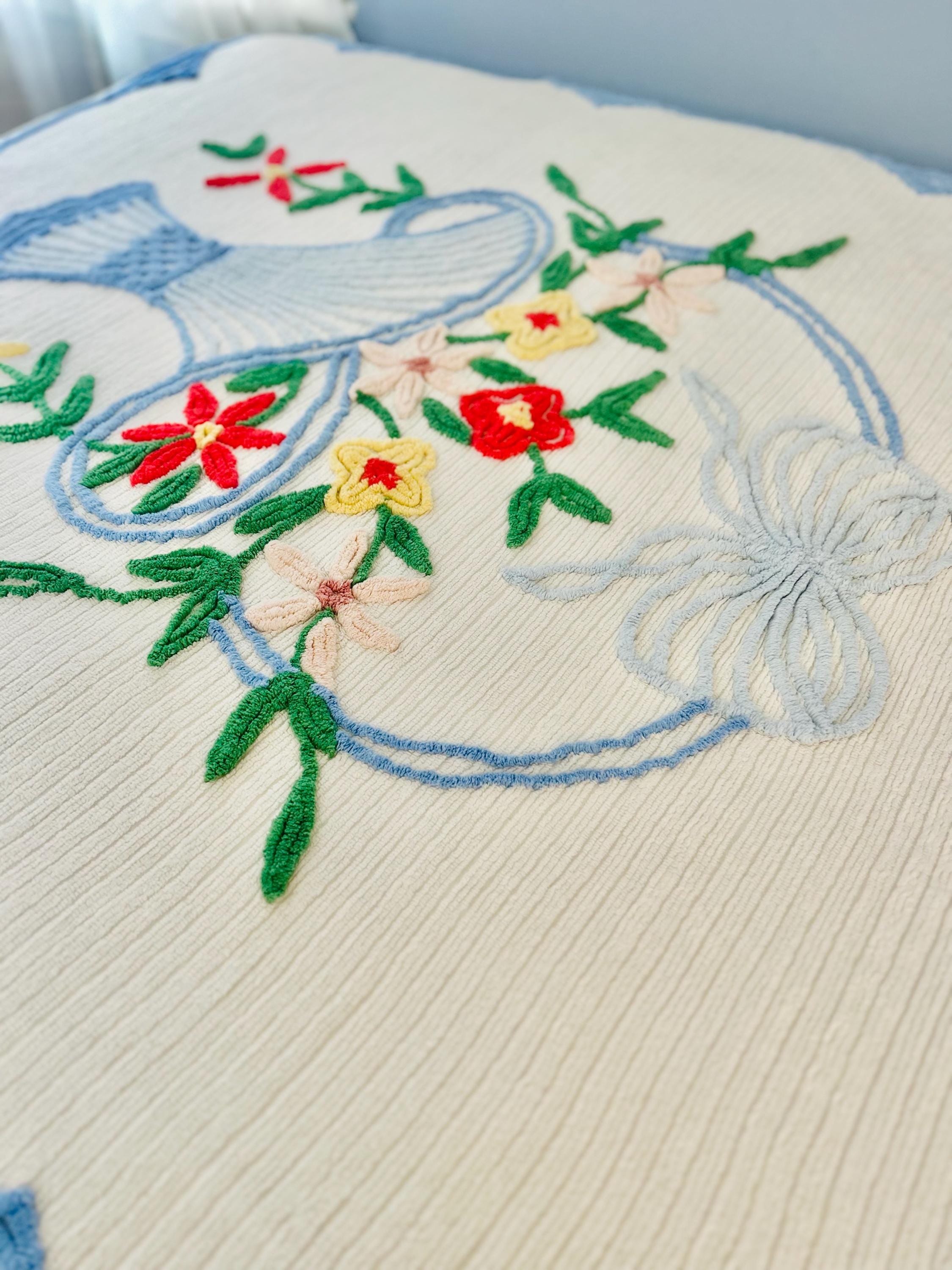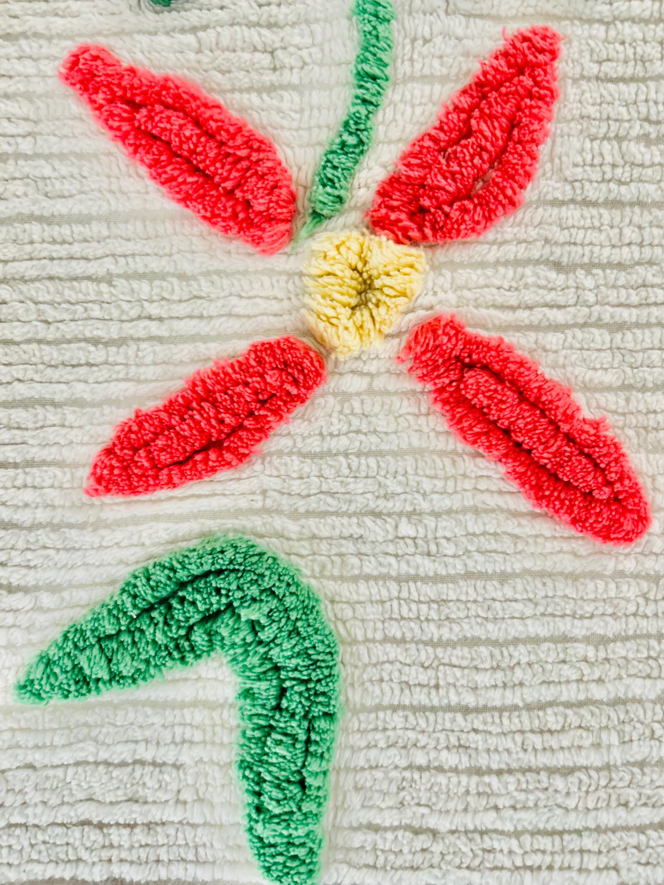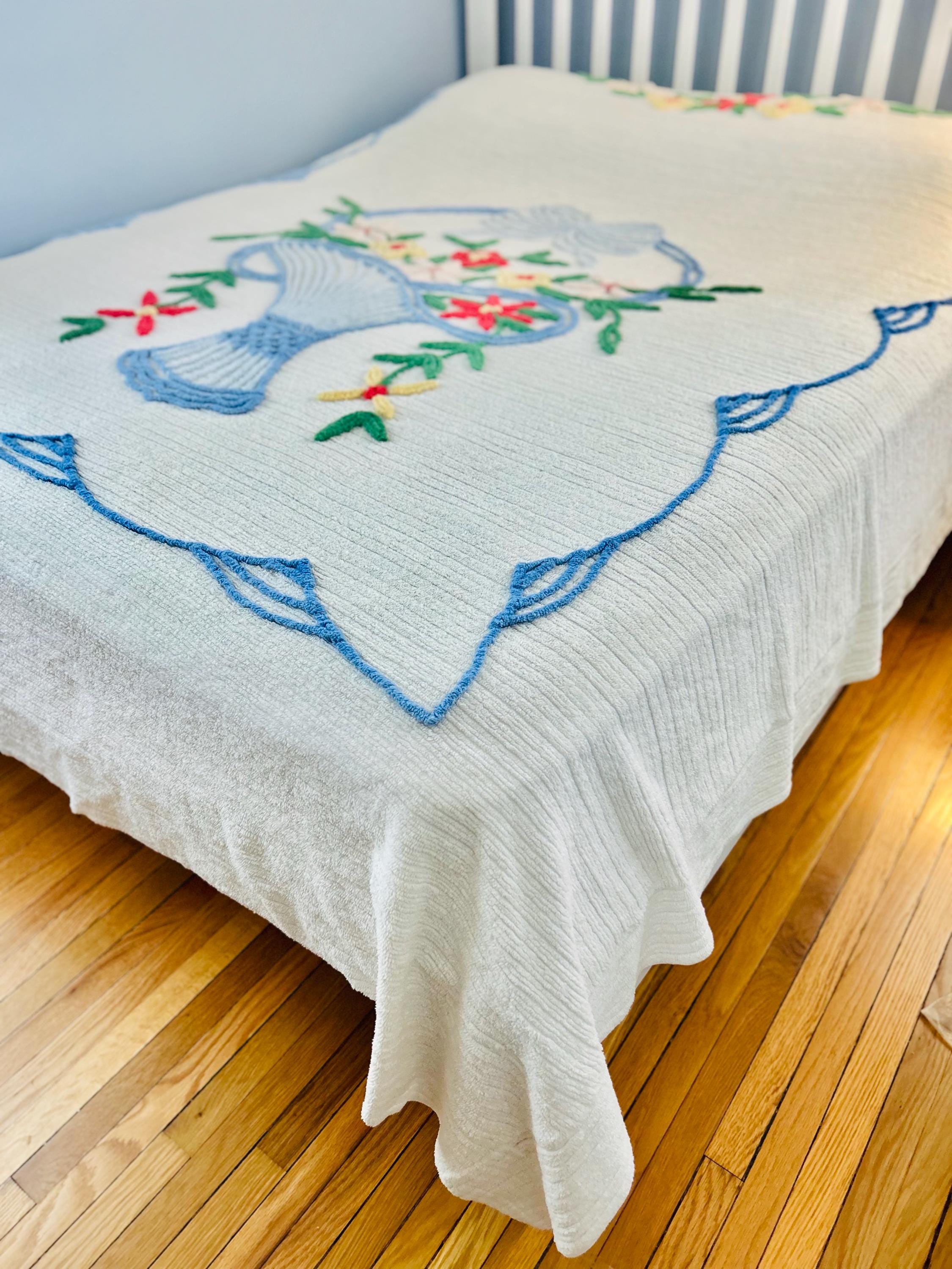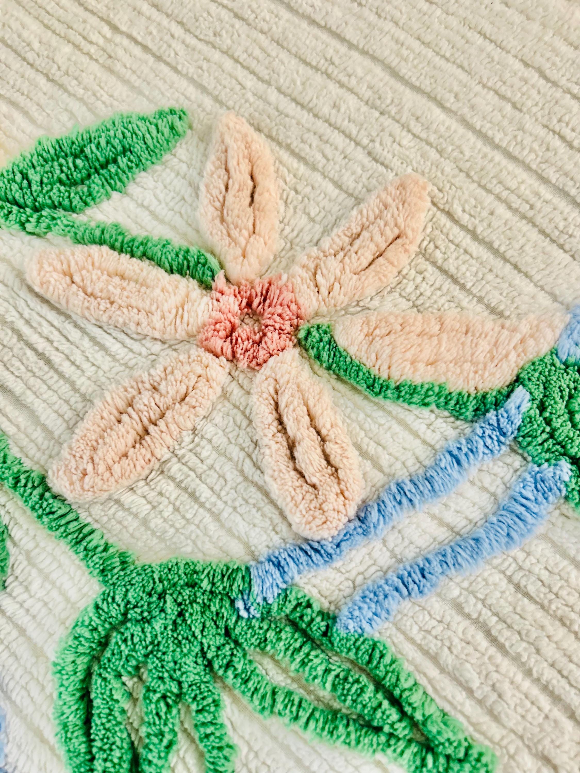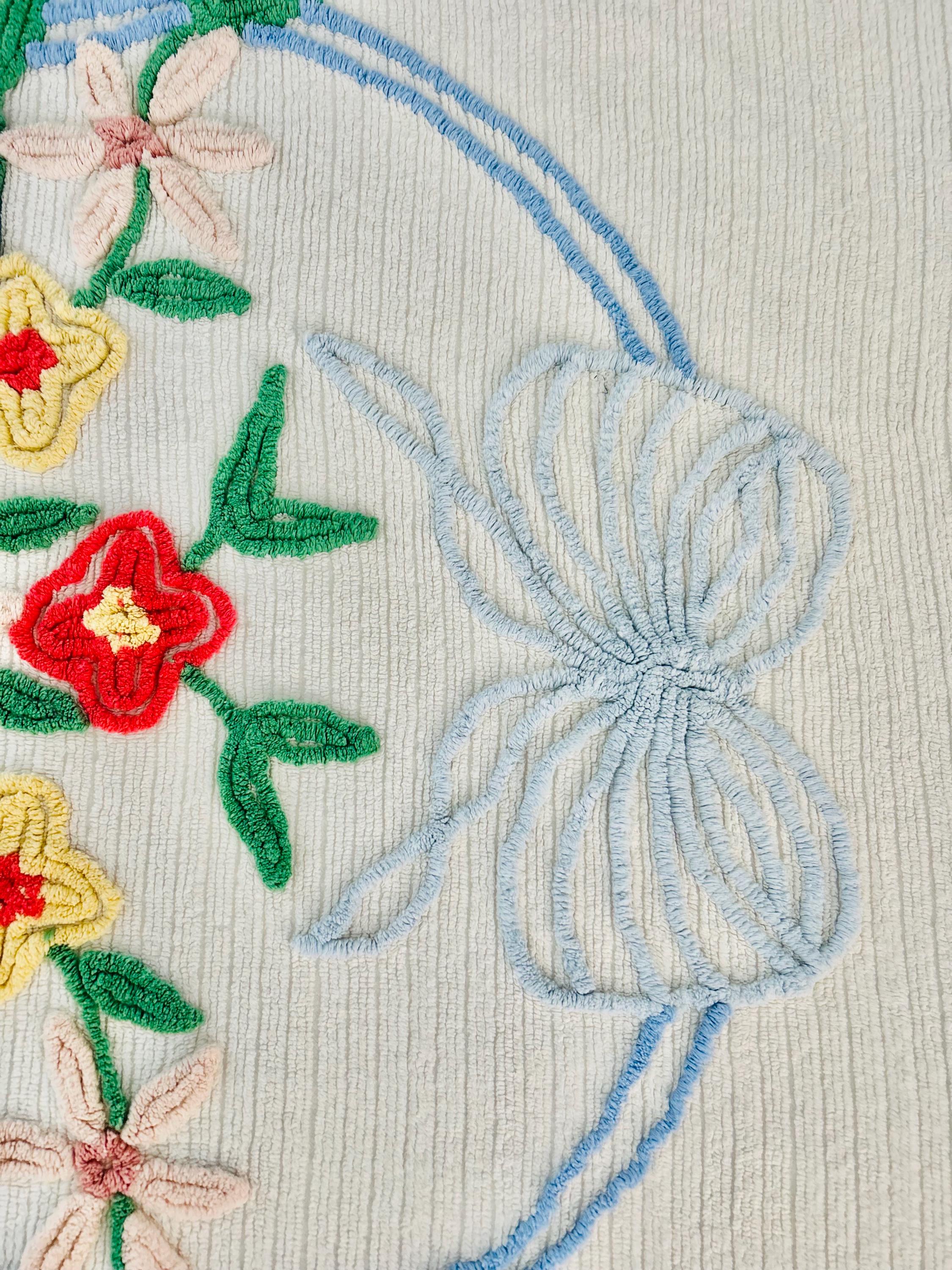 This Basket of Flowers Mid-Century Modern Chenille bedspread is circa 1950s-1960s and is bright and fluffy all over with no bald spots, holes or stains. The top is straight across while the bottom two edges are curved (see photos). It is in excellent vintage condition.