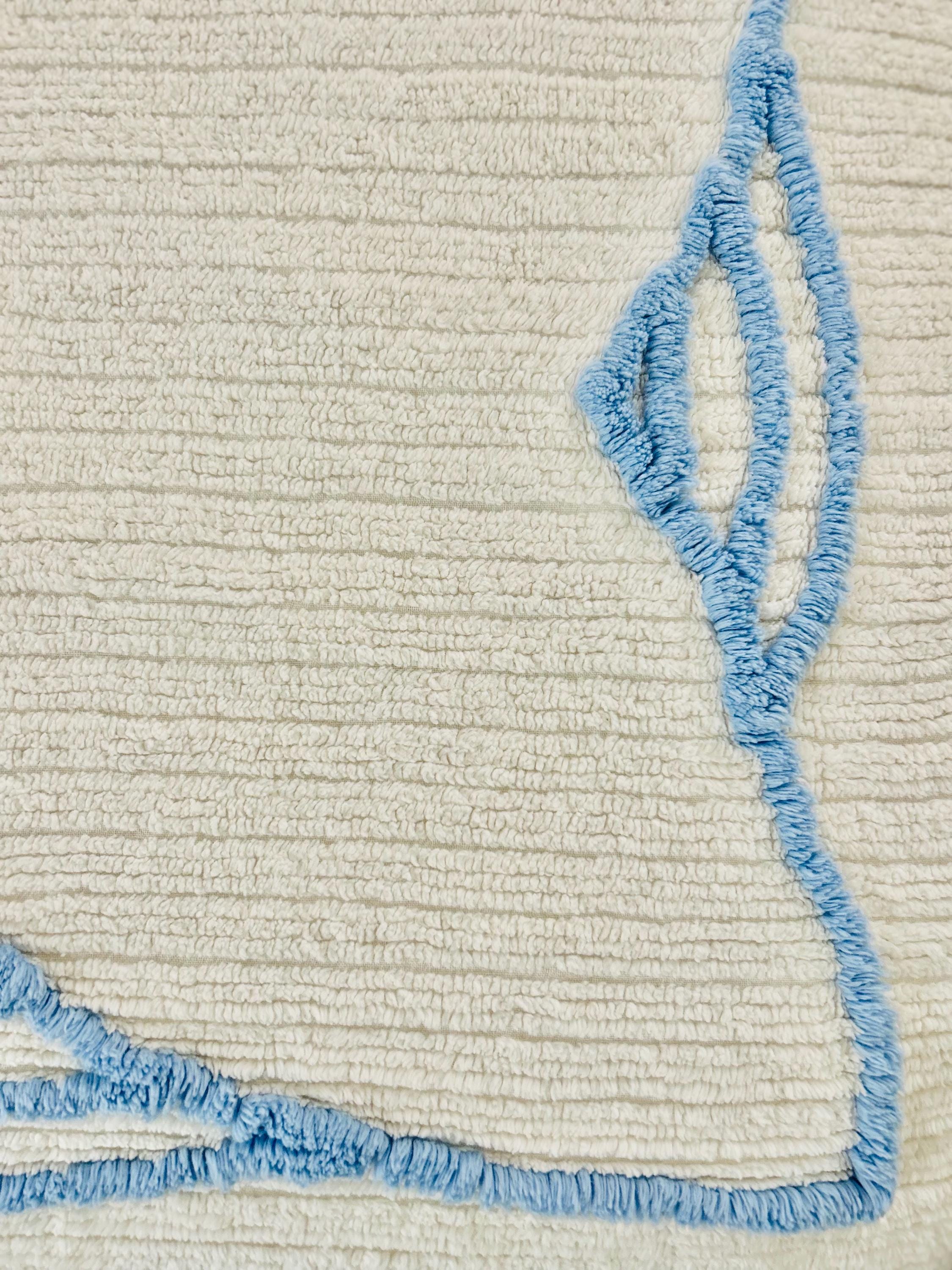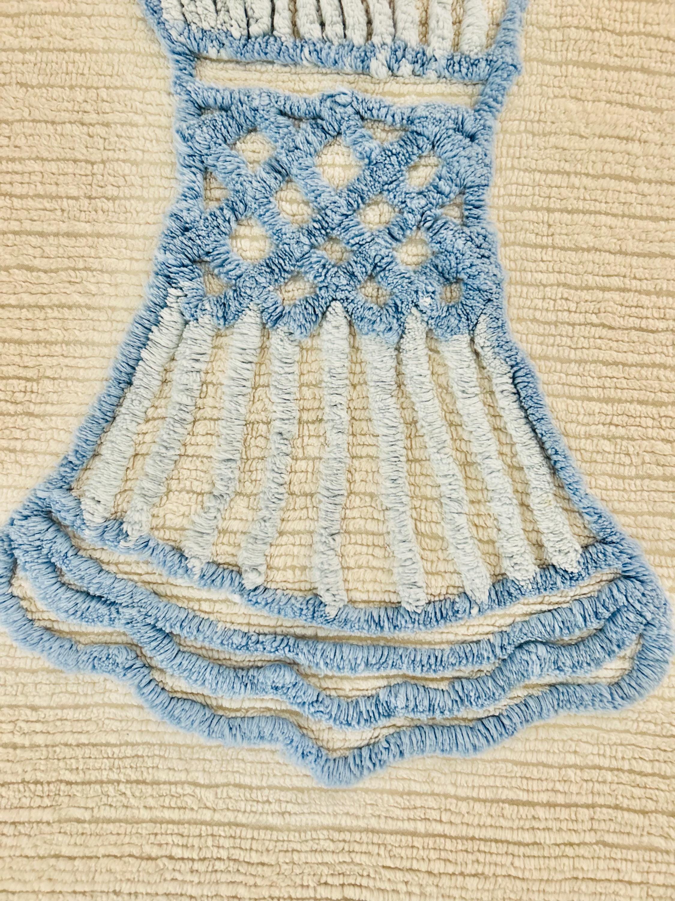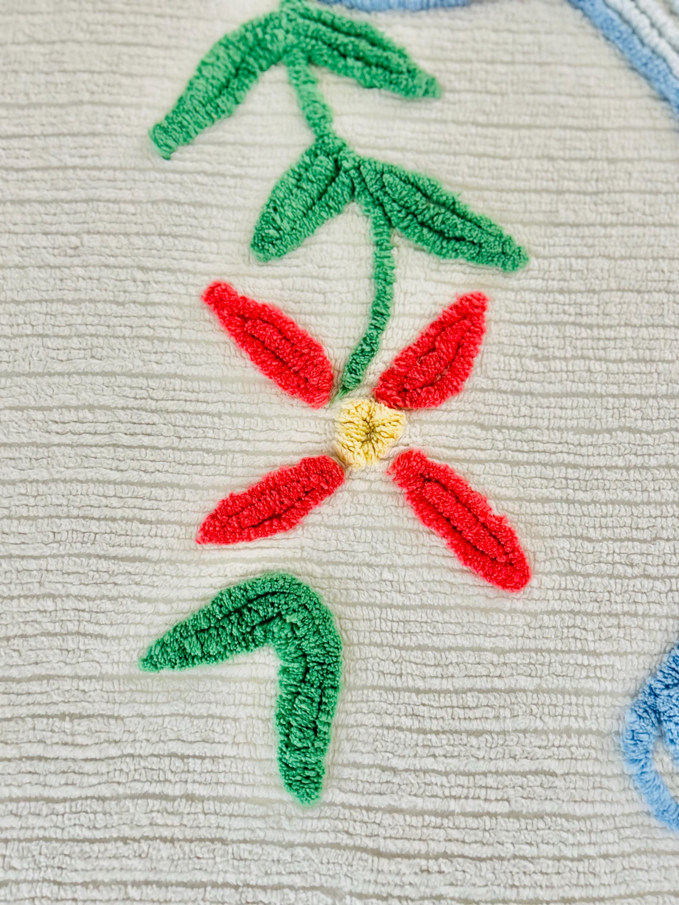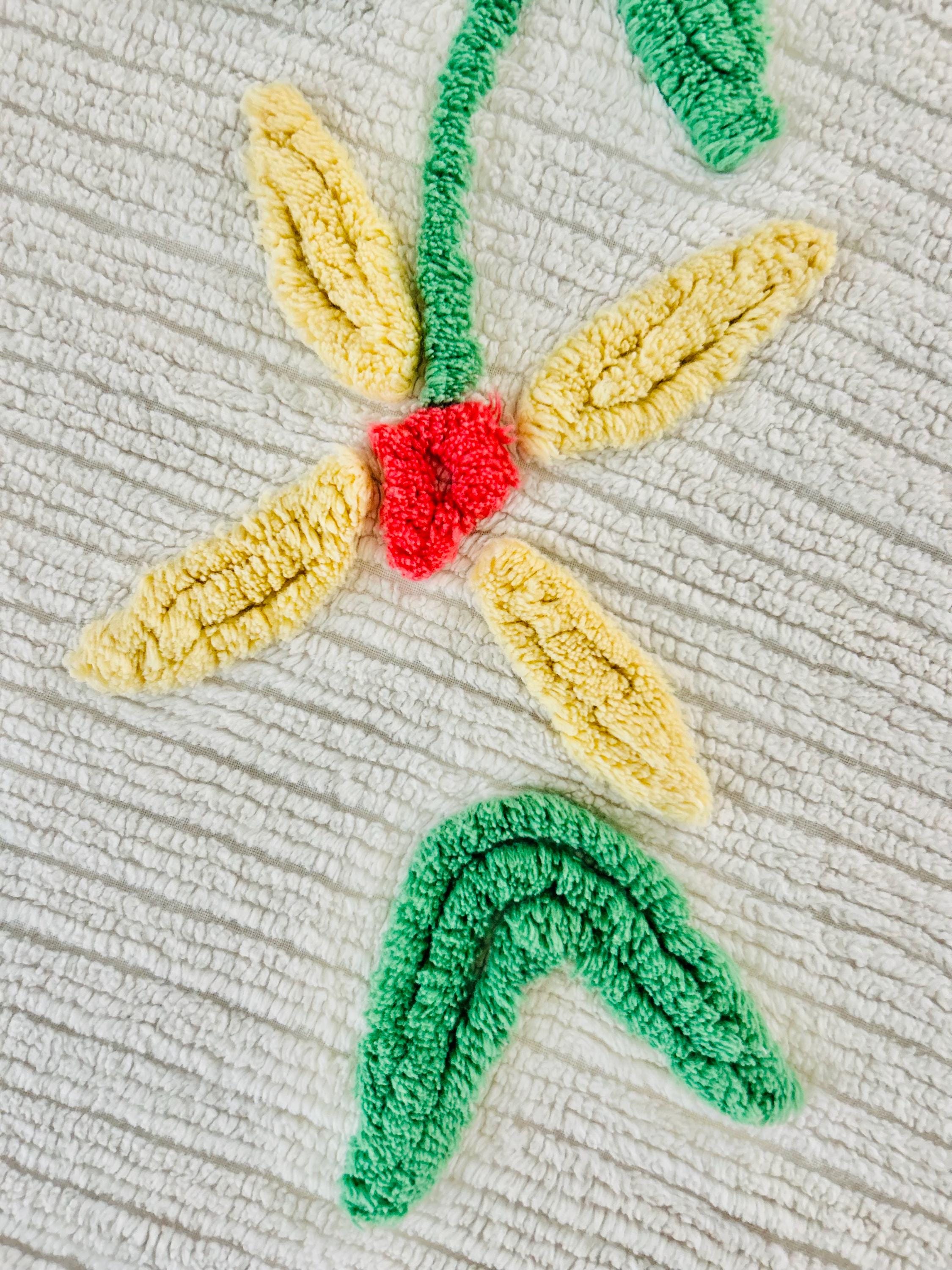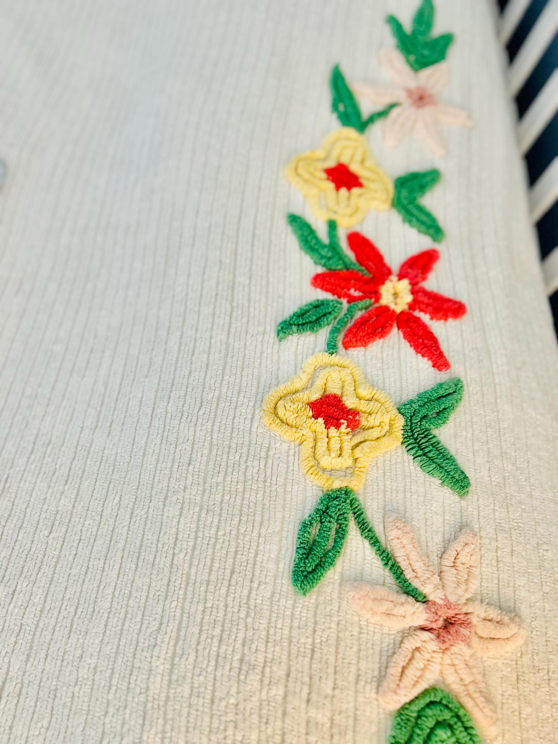 This Basket of Flowers Mid-Century Modern Chenille bedspread is circa 1950s-1960s and is bright and fluffy all over with no bald spots, holes or stains. The top is straight across while the bottom two edges are curved (see photos). It is in excellent vintage condition.