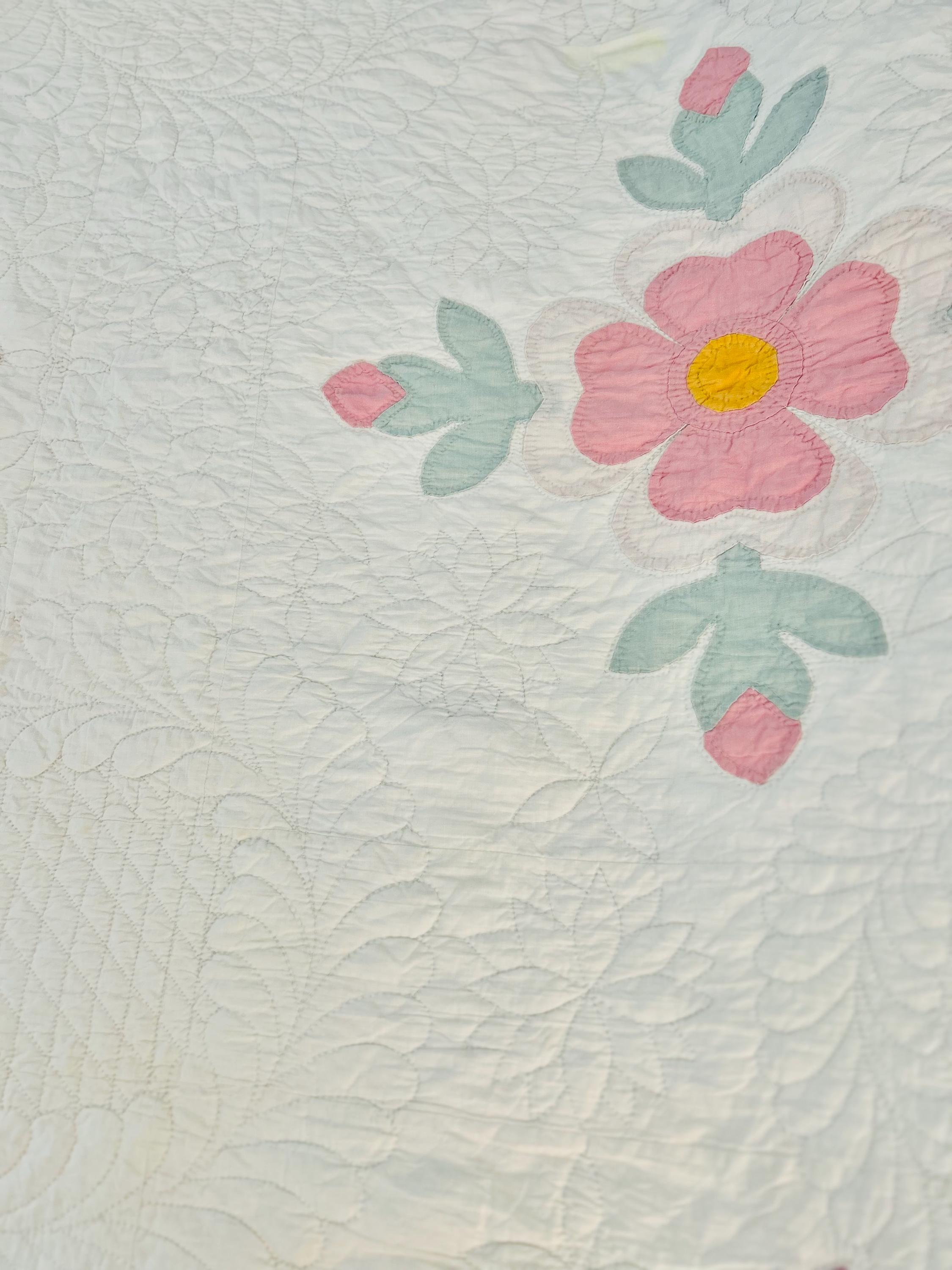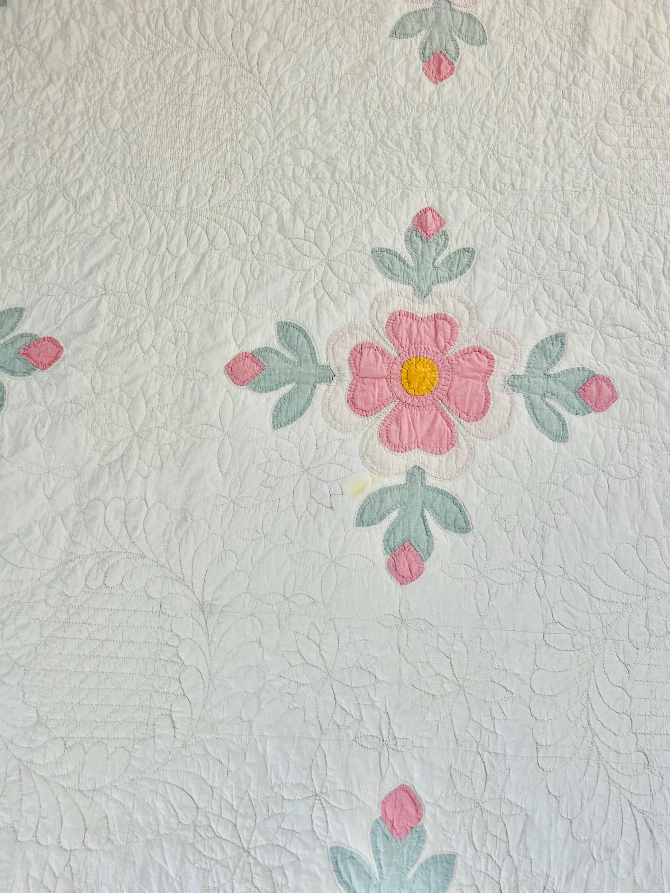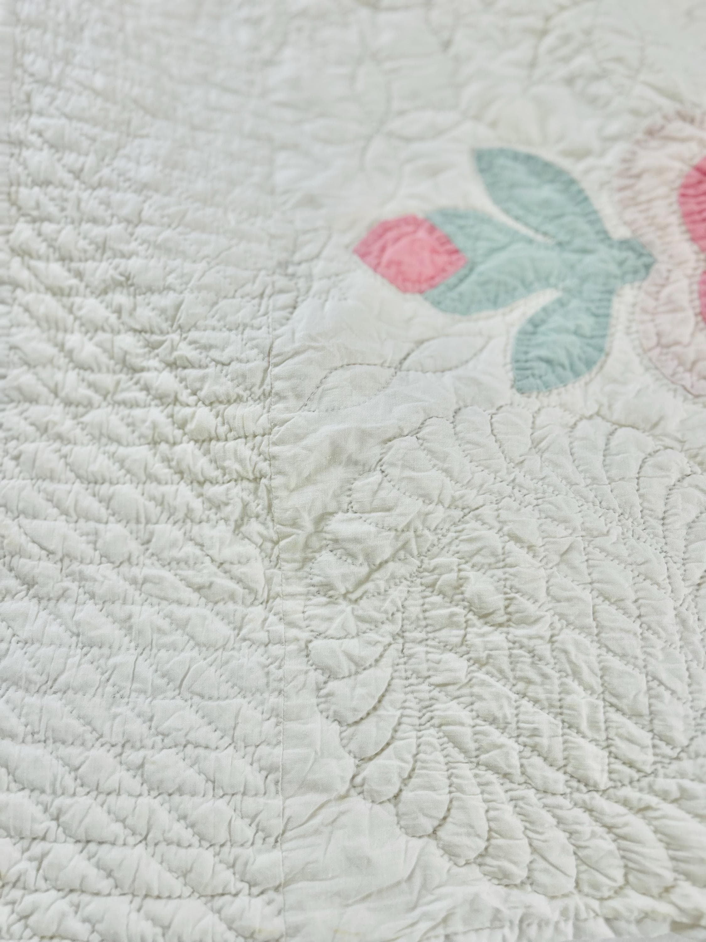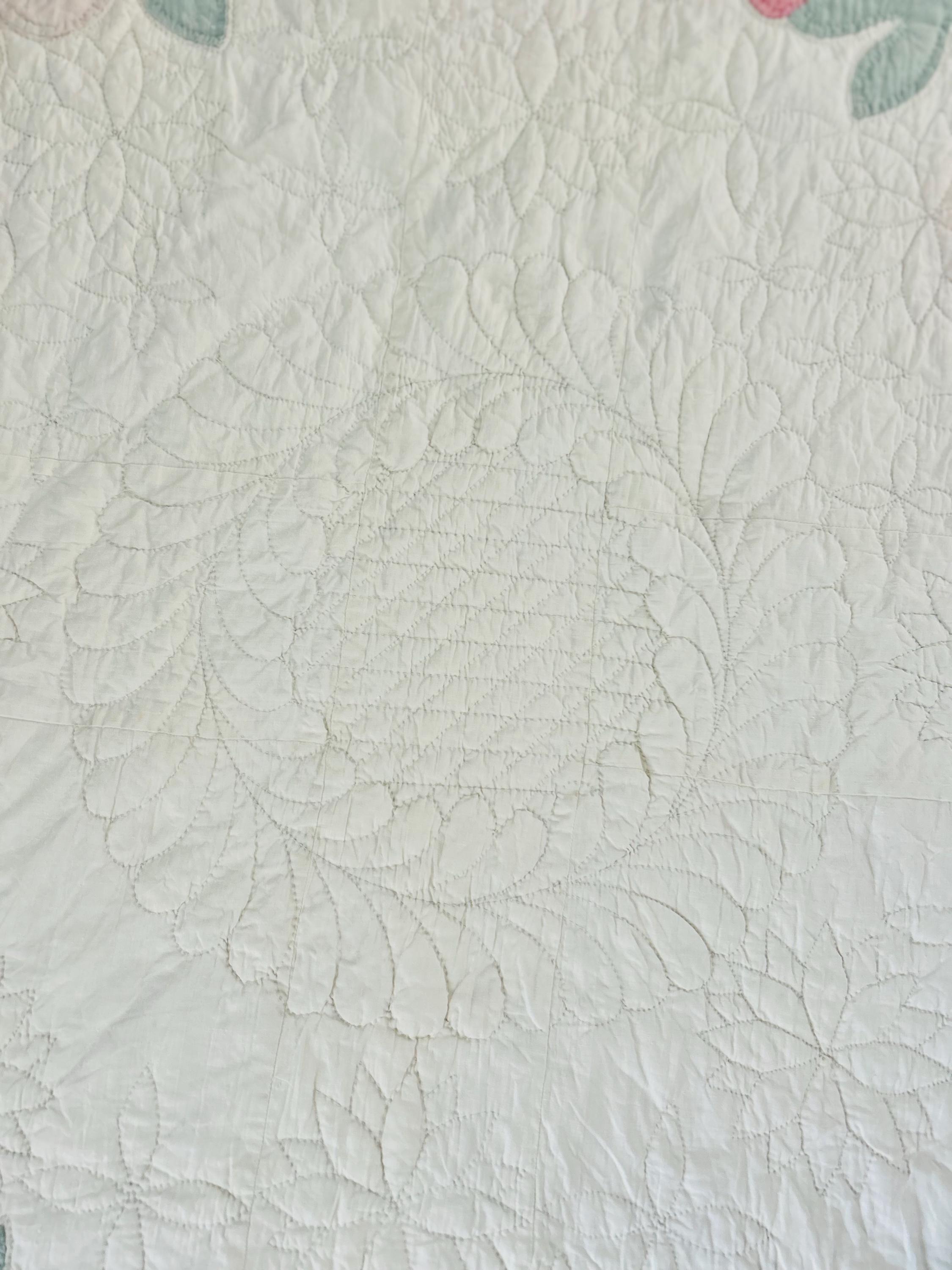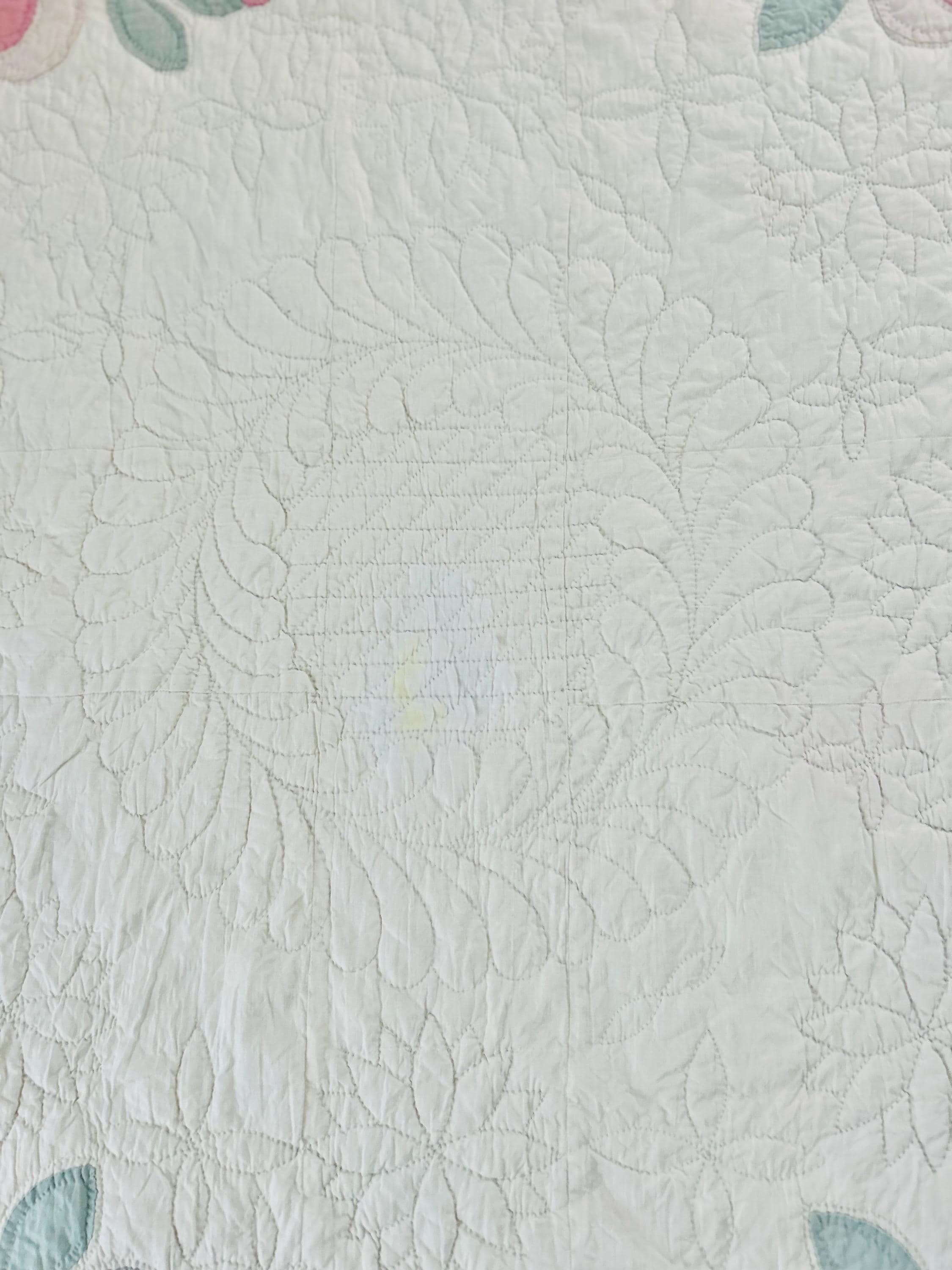 This Ohio Rose Quilt with Feather Wreaths is circa 1920-1930s and has been intricately hand-quilted and hand-appliqued in very tiny stitches. See photos.. The hand-quilting is in feathers, feather wreaths, diagonals and very tiny diamond patterns.