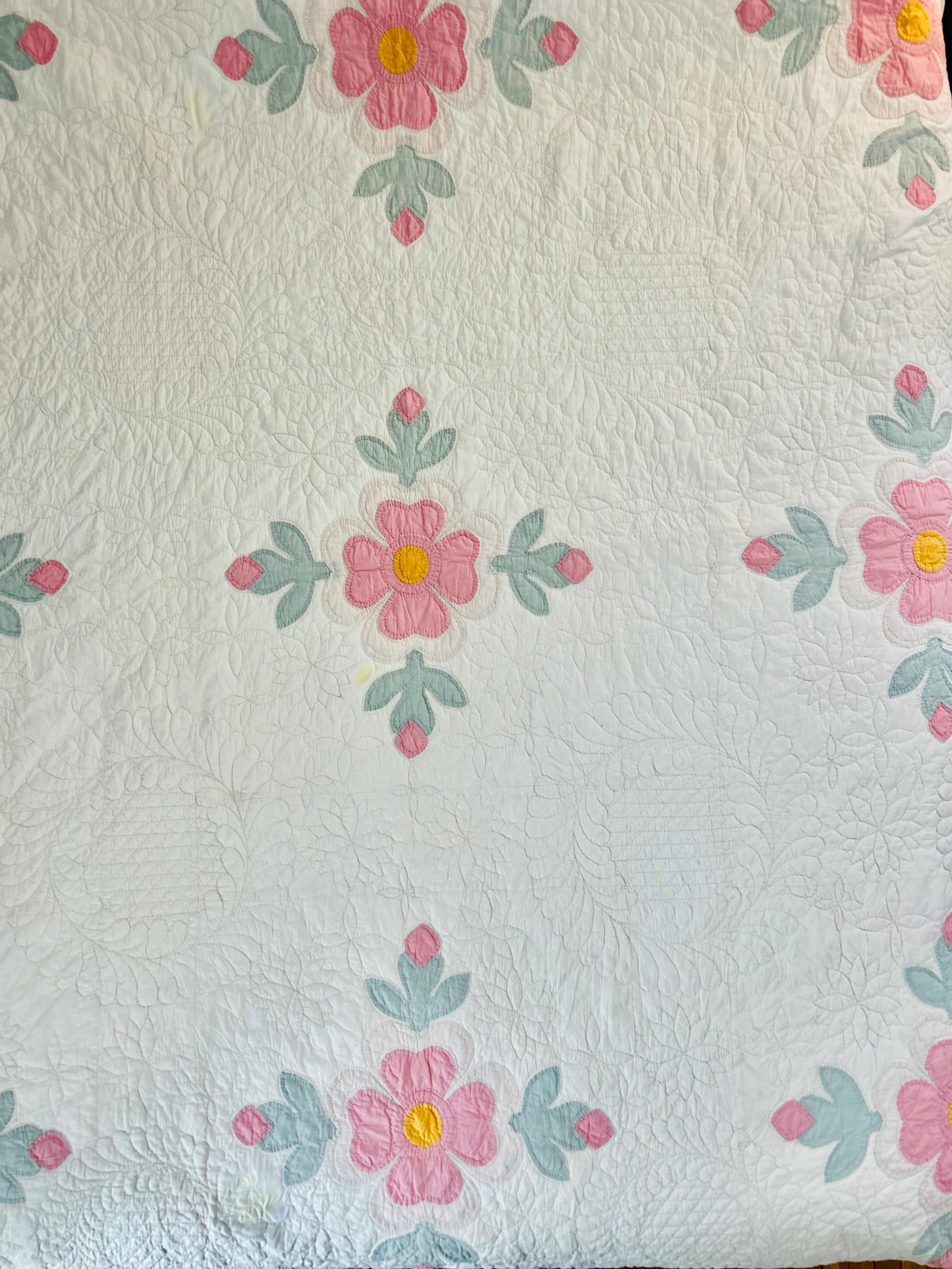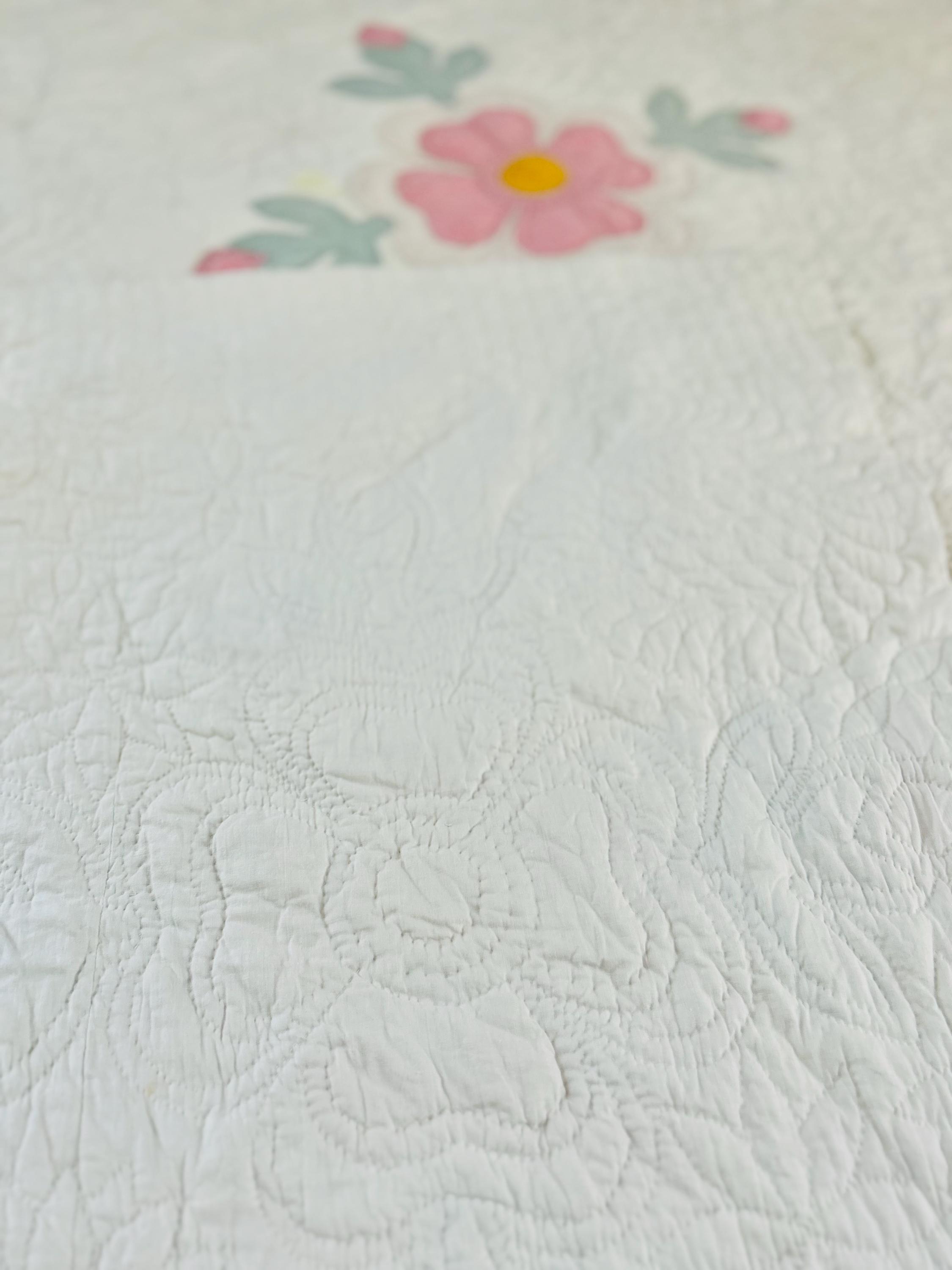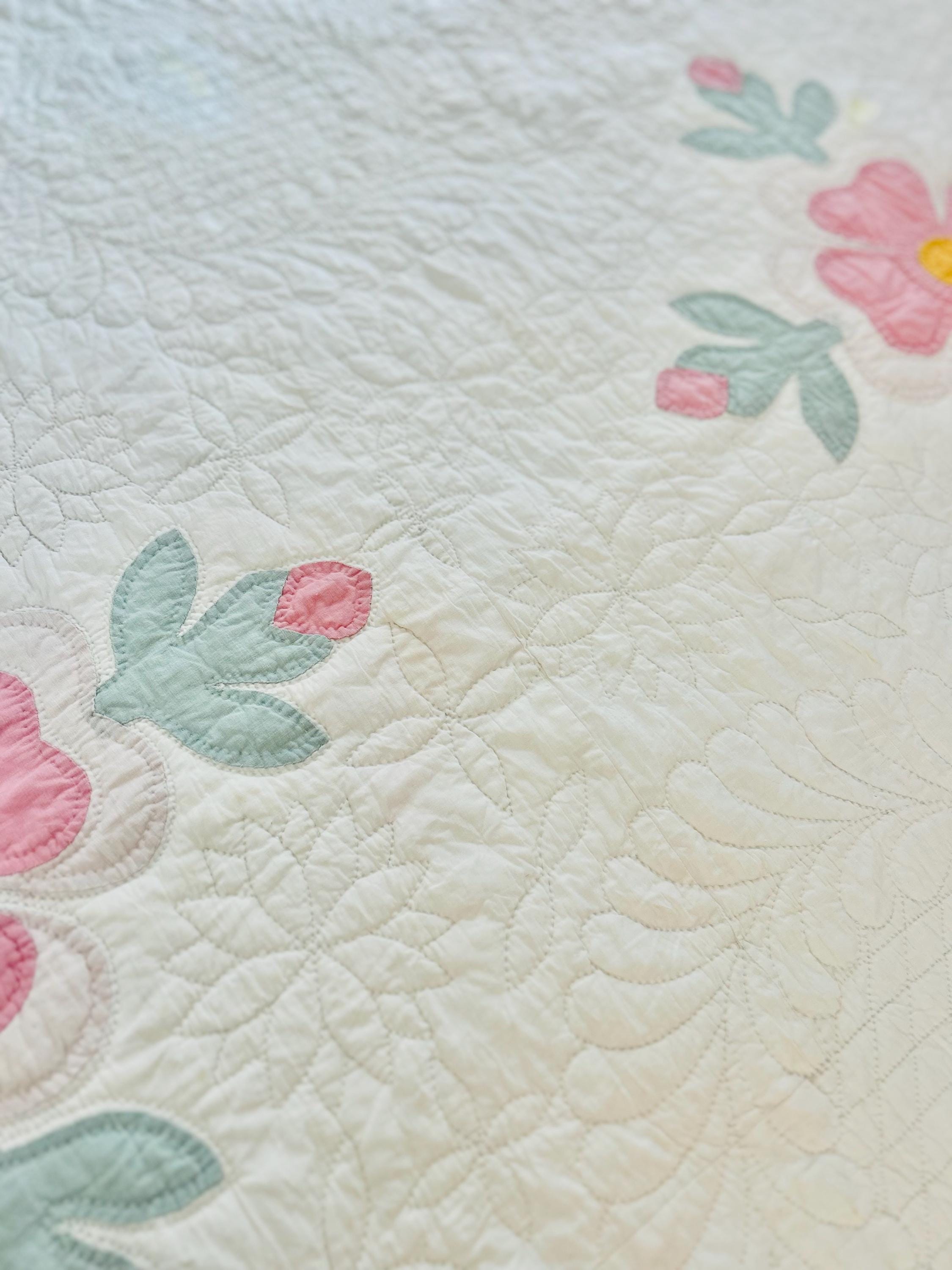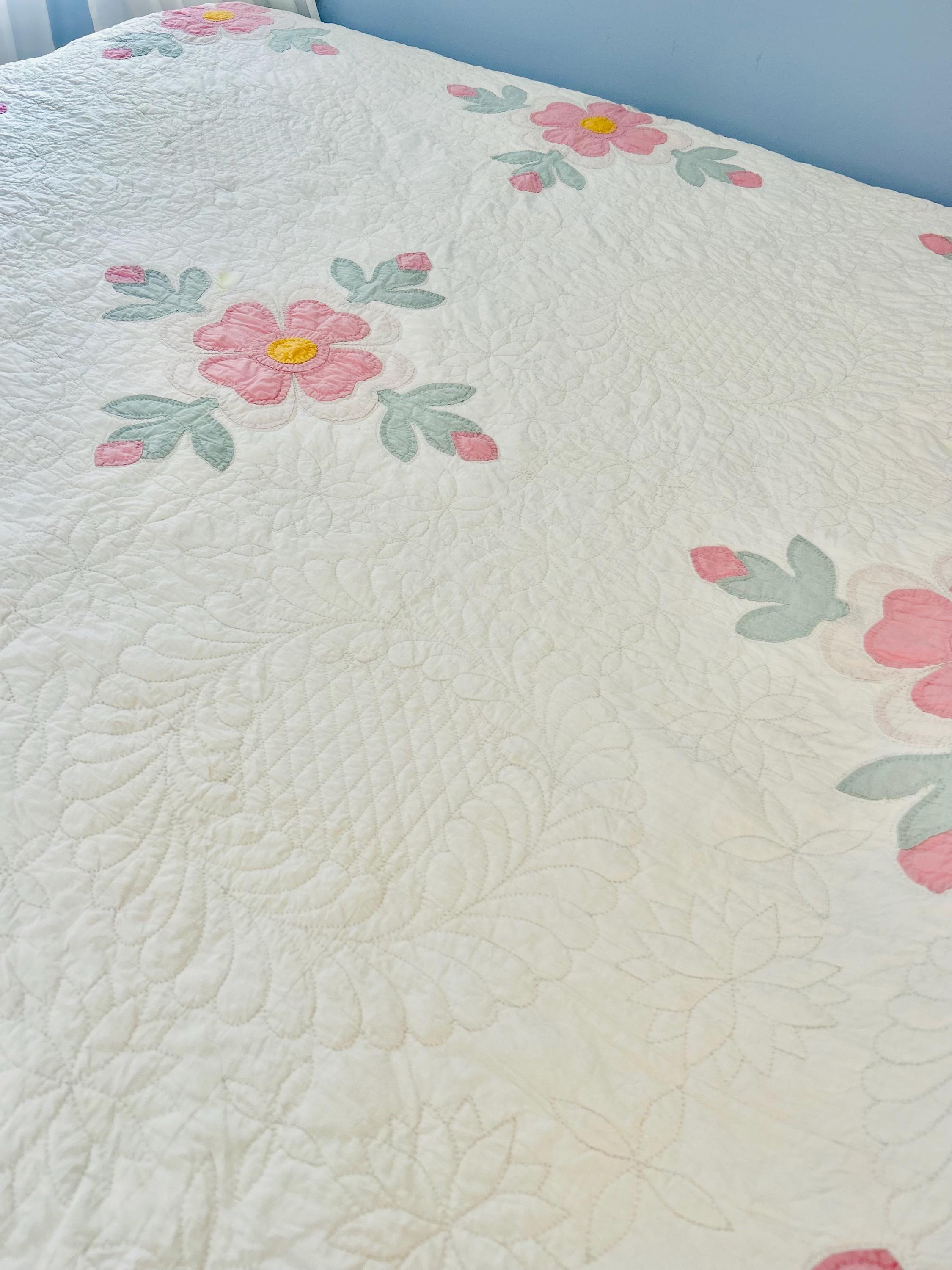 This Ohio Rose Quilt with Feather Wreaths is circa 1920-1930s and has been intricately hand-quilted and hand-appliqued in very tiny stitches. See photos.. The hand-quilting is in feathers, feather wreaths, diagonals and very tiny diamond patterns.