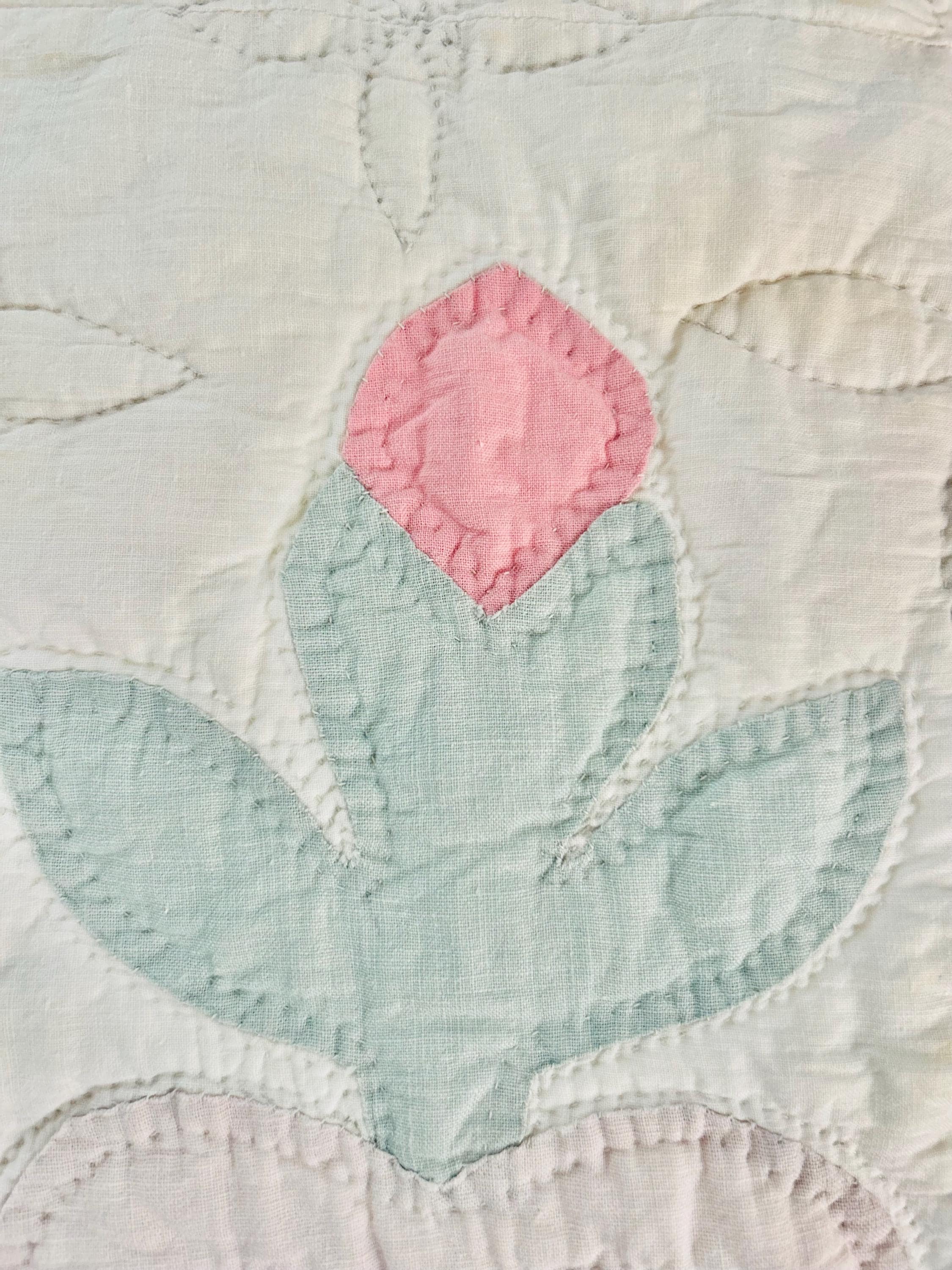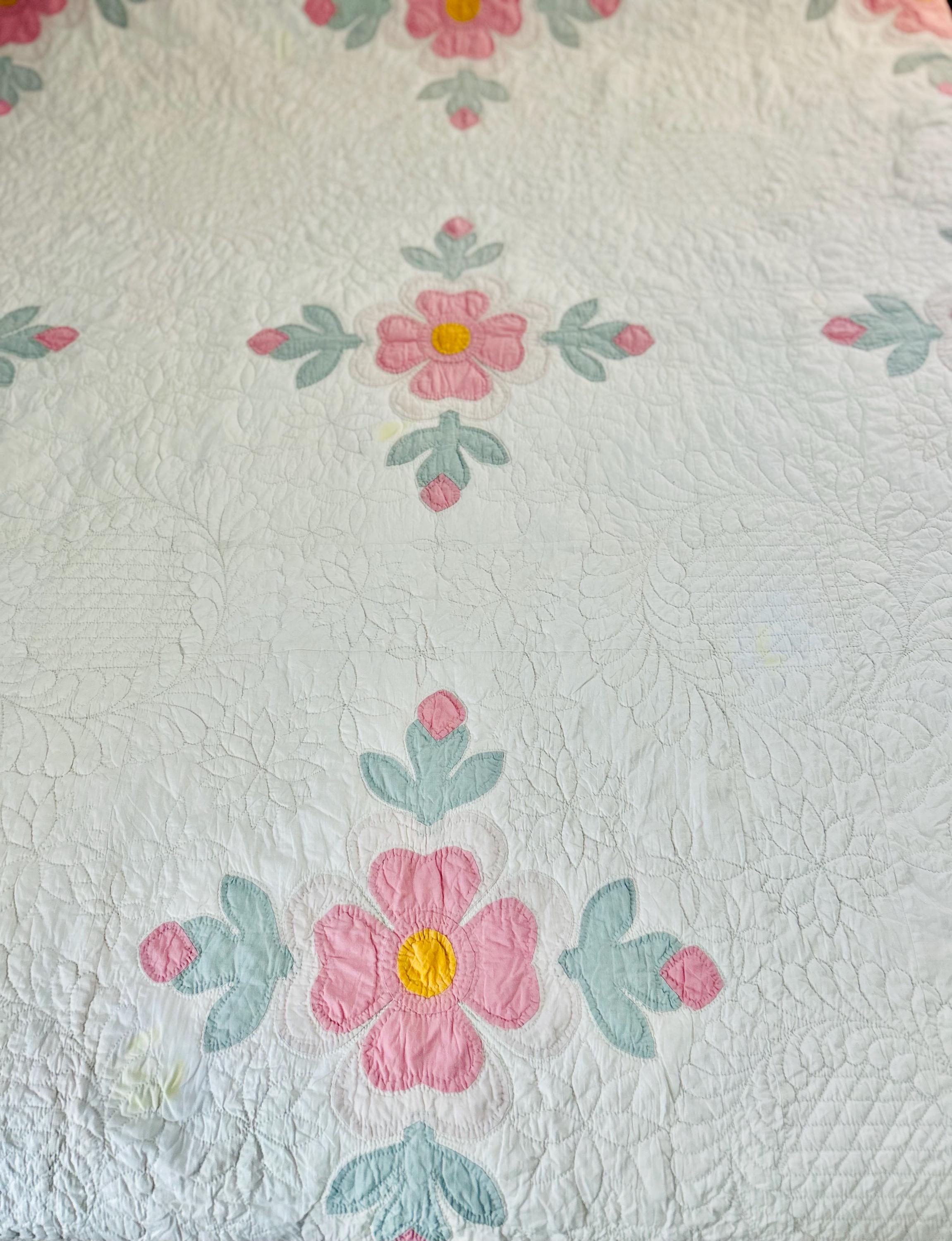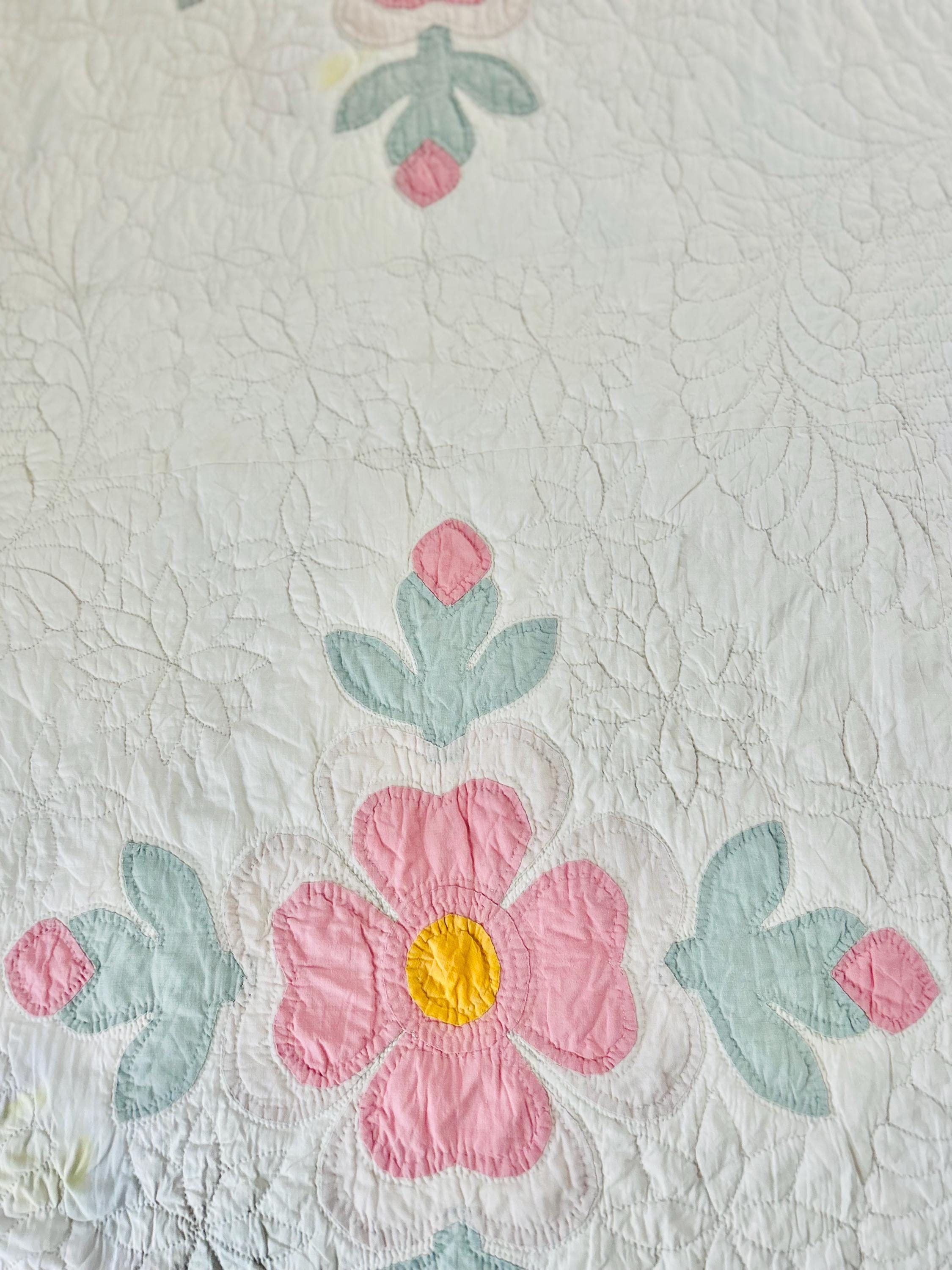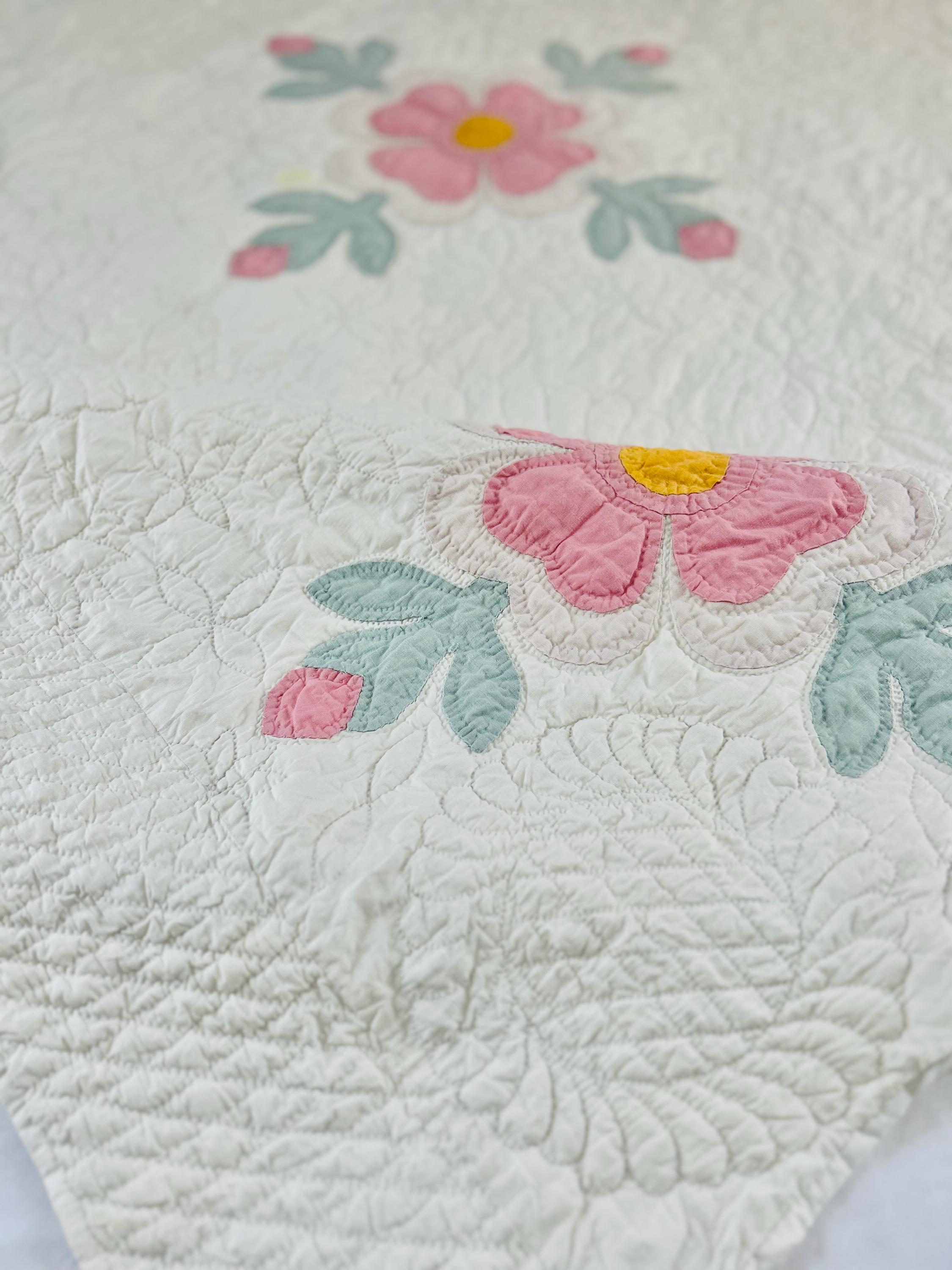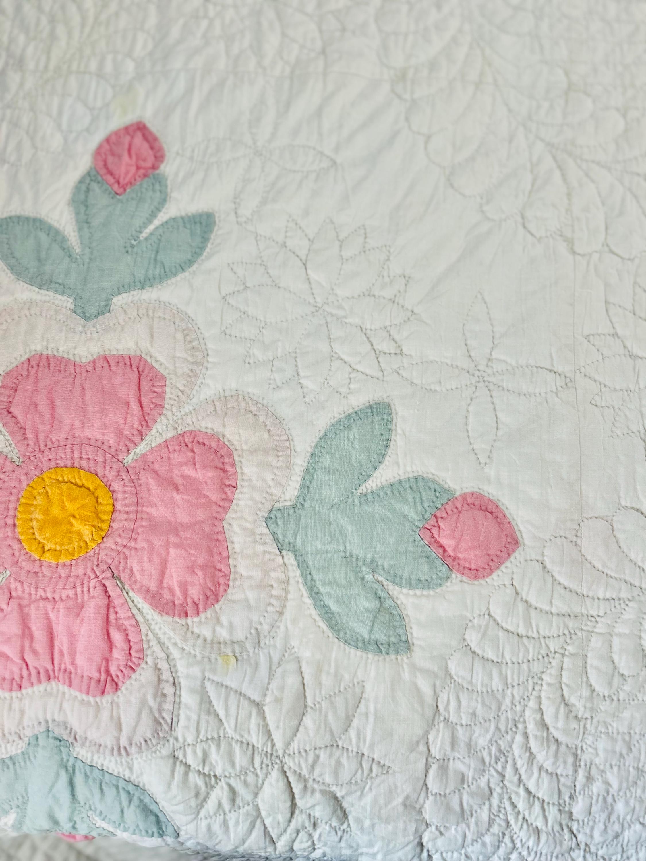 This Ohio Rose Quilt with Feather Wreaths is circa 1920-1930s and has been intricately hand-quilted and hand-appliqued in very tiny stitches. See photos.. The hand-quilting is in feathers, feather wreaths, diagonals and very tiny diamond patterns.