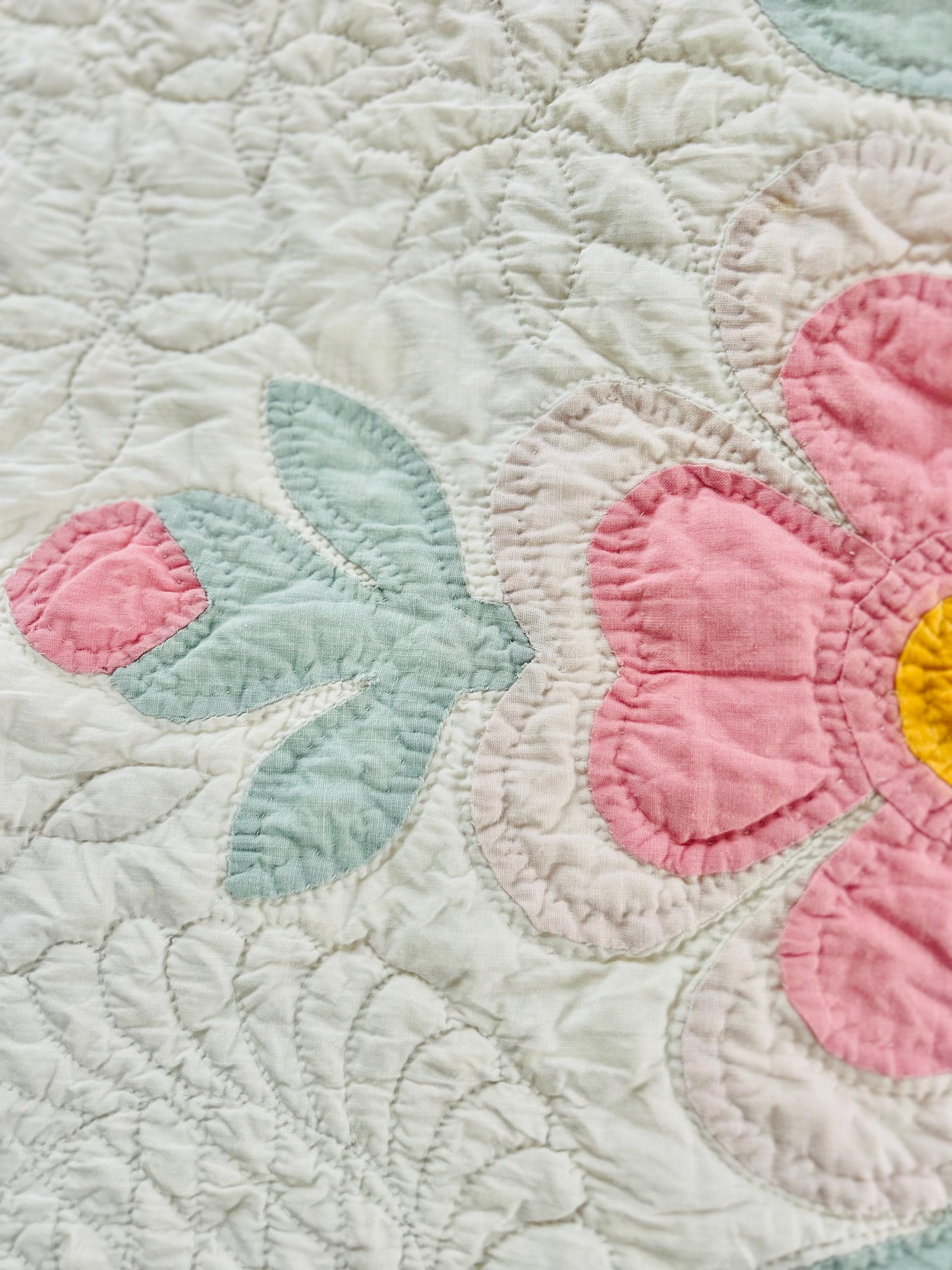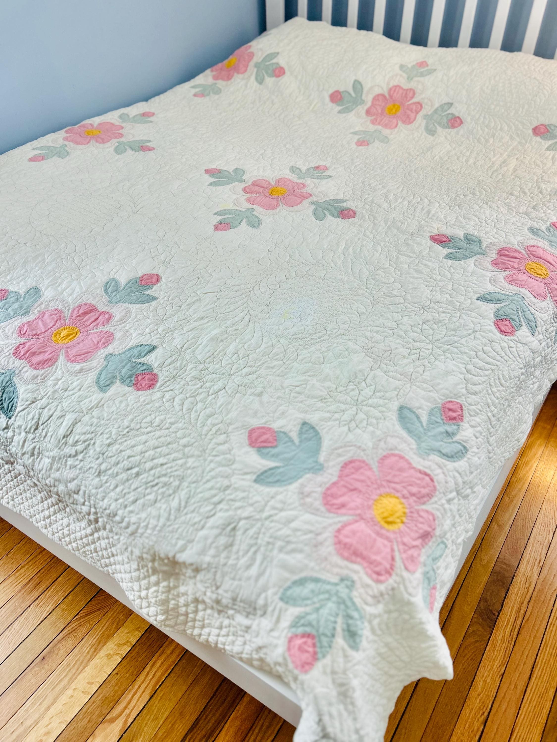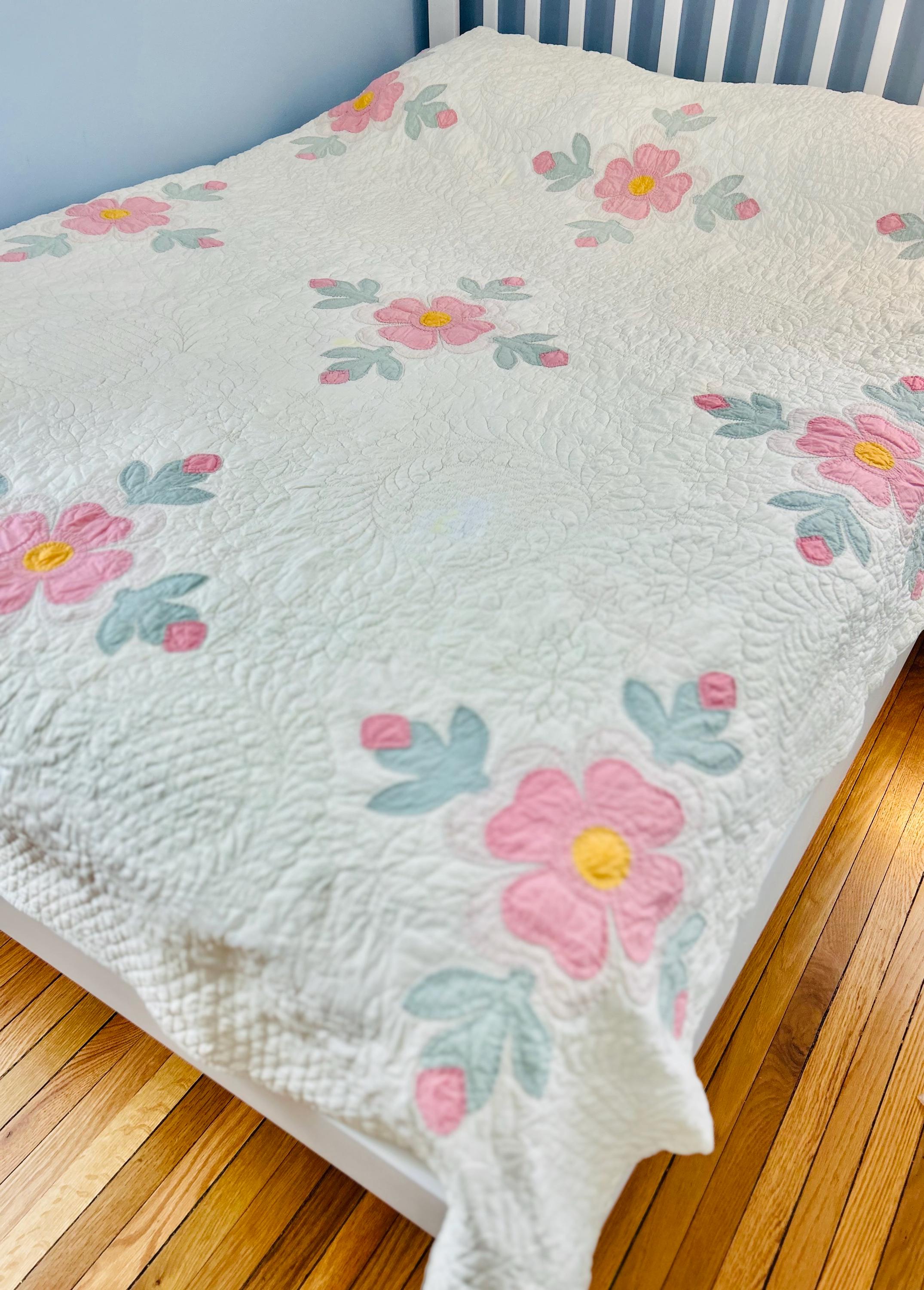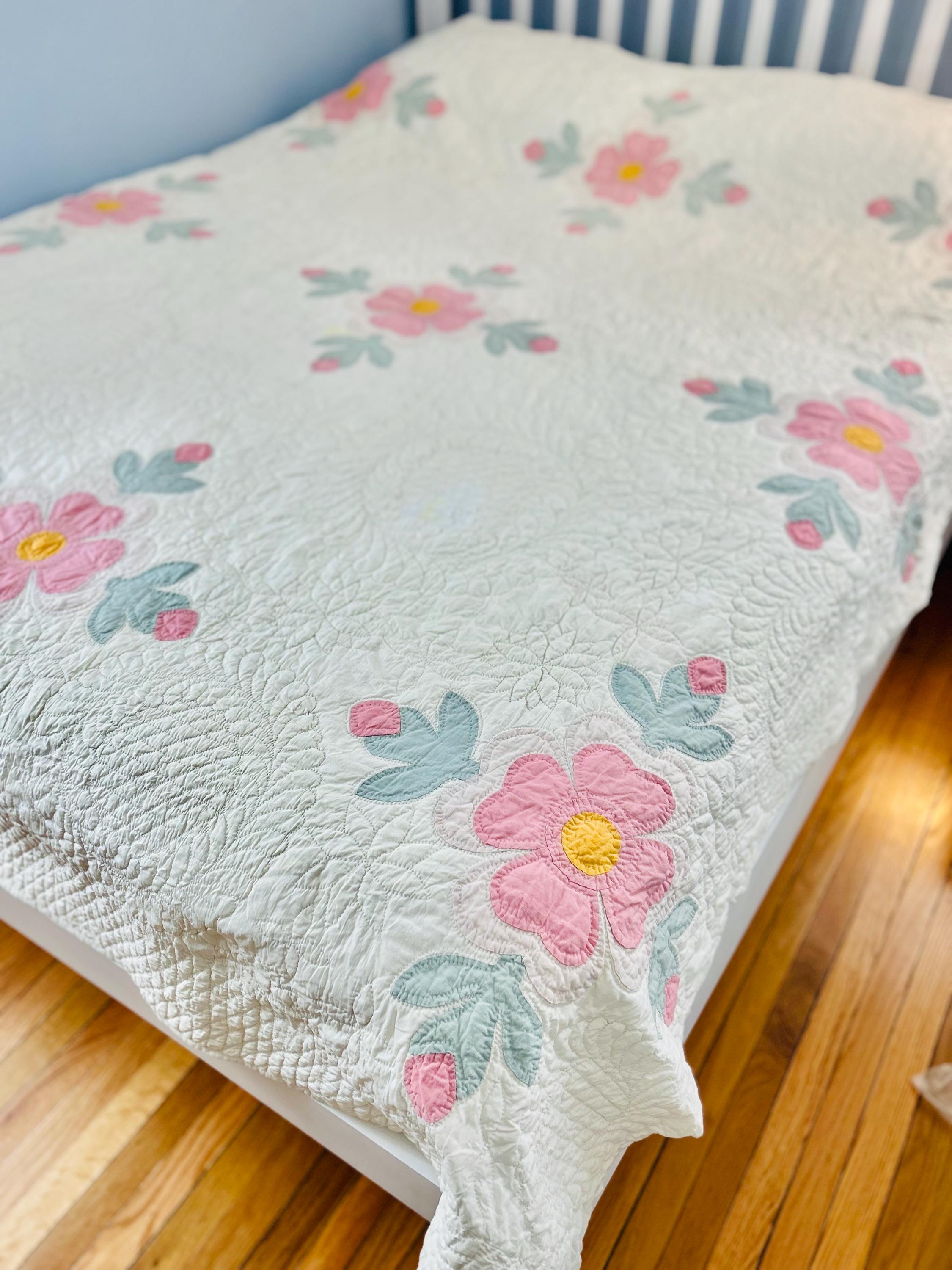 This quilt has been soaked, hand-washed and line-dried. It measures 72 inches by 85 inches and comes from a smoke-free and pet-free home. Pictured on a queen-size bed.
