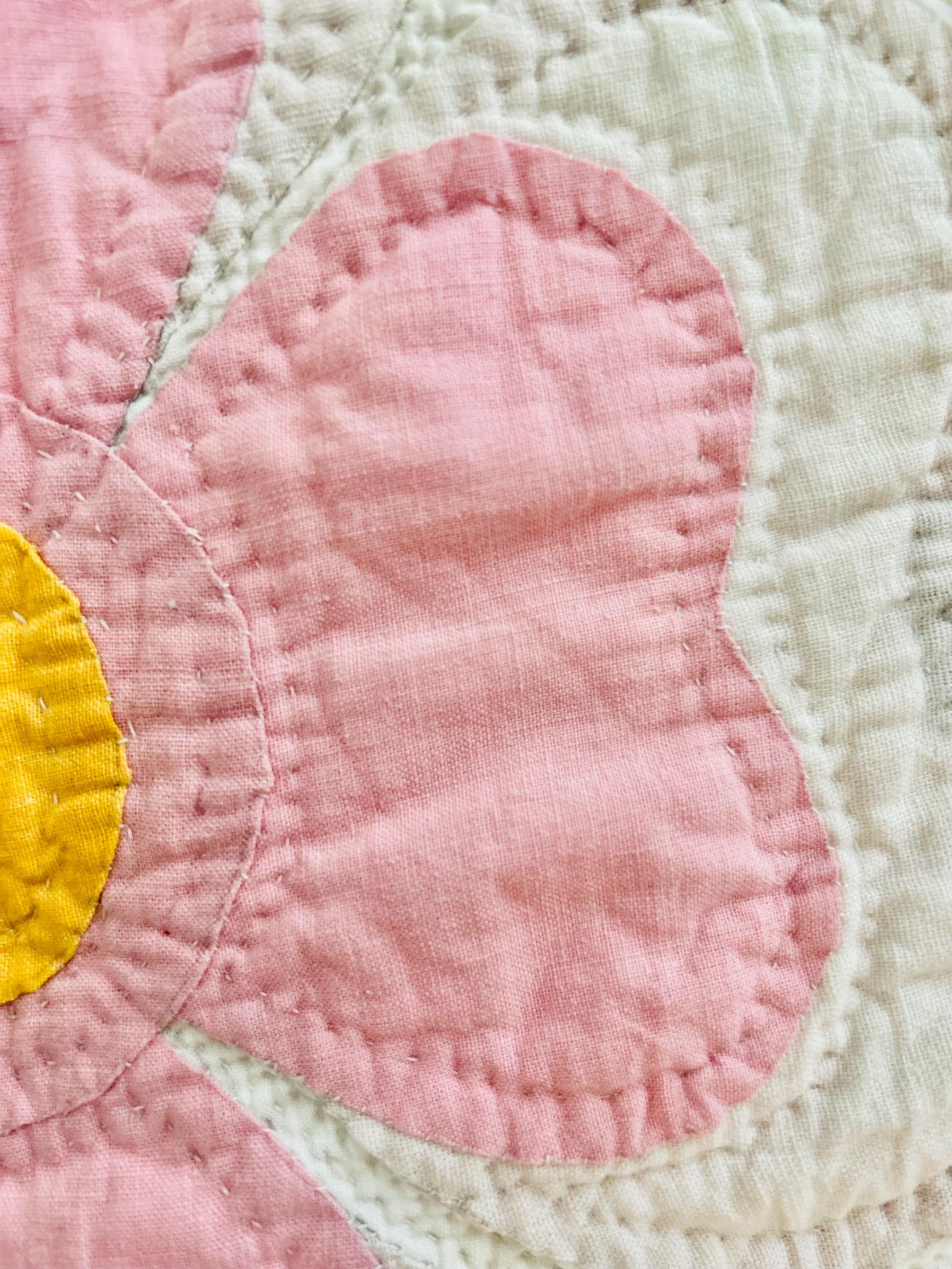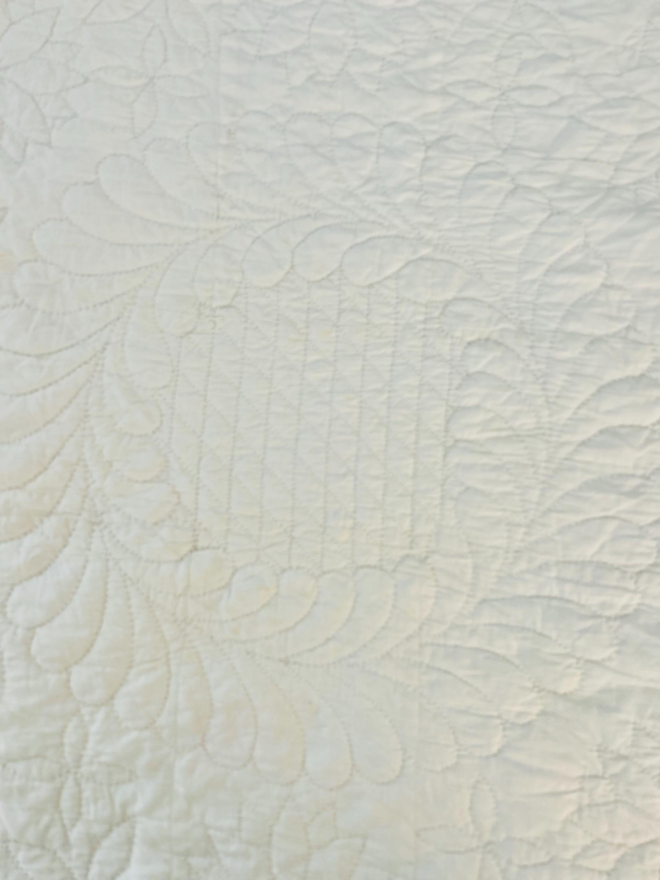 The back is white cotton that has been turned to the front and hand-stitched to form the binding. The cotton batting is lightweight.