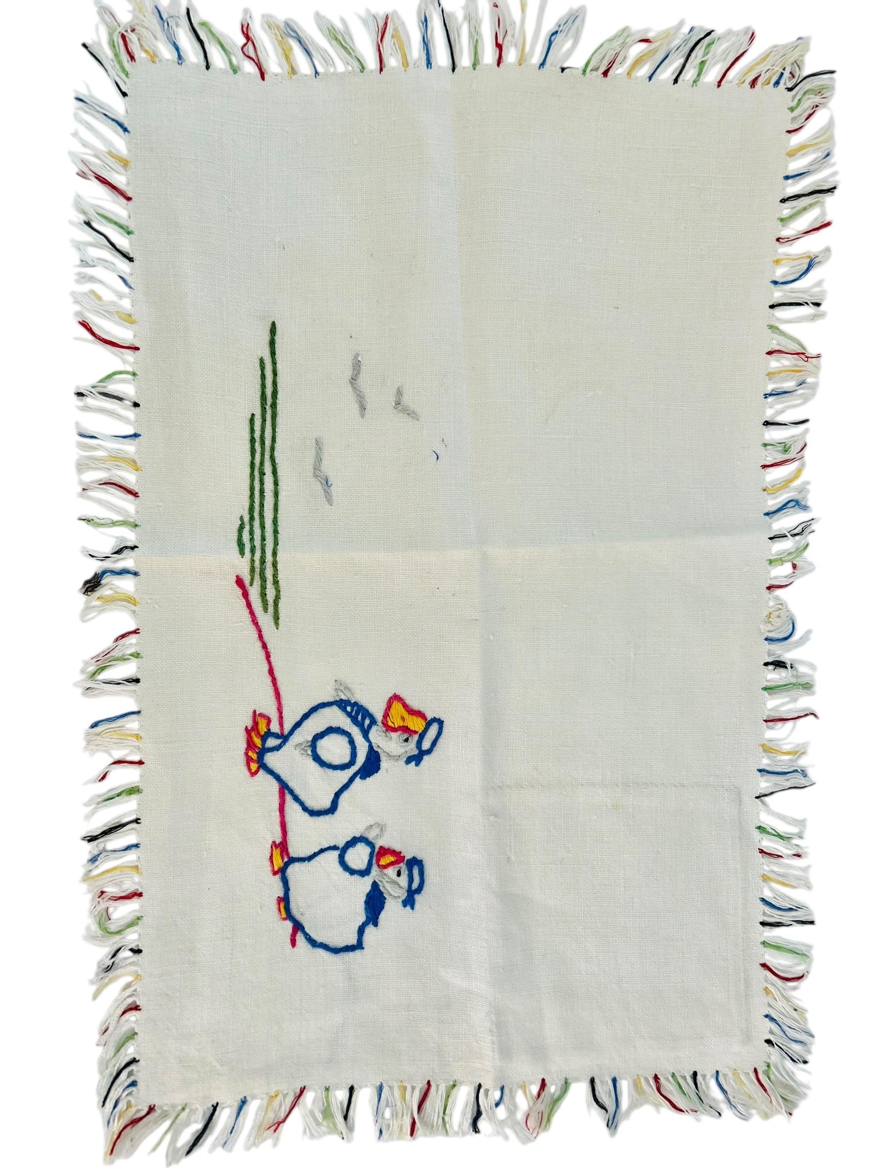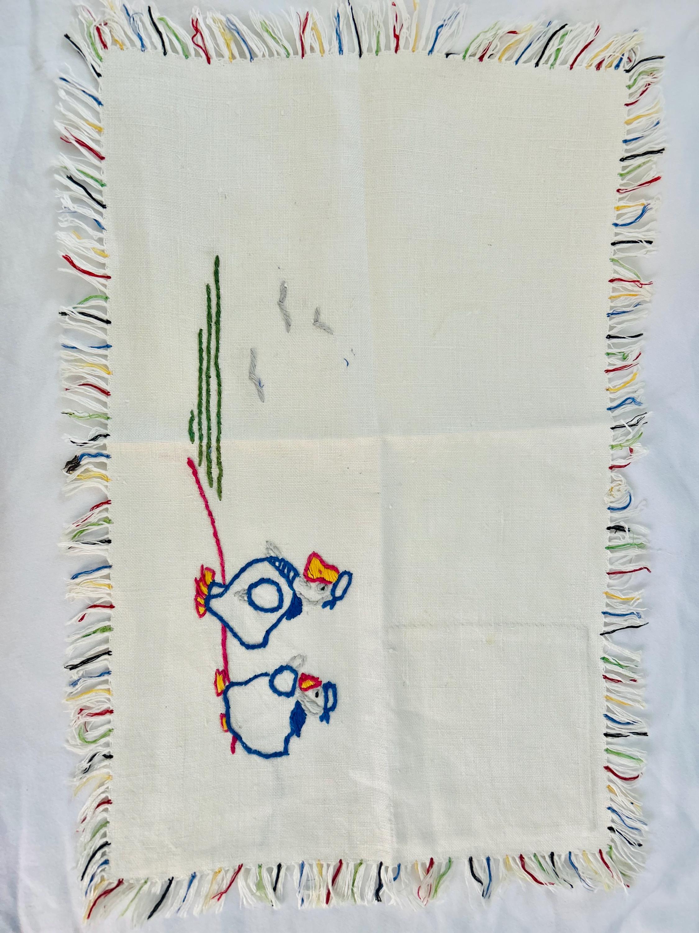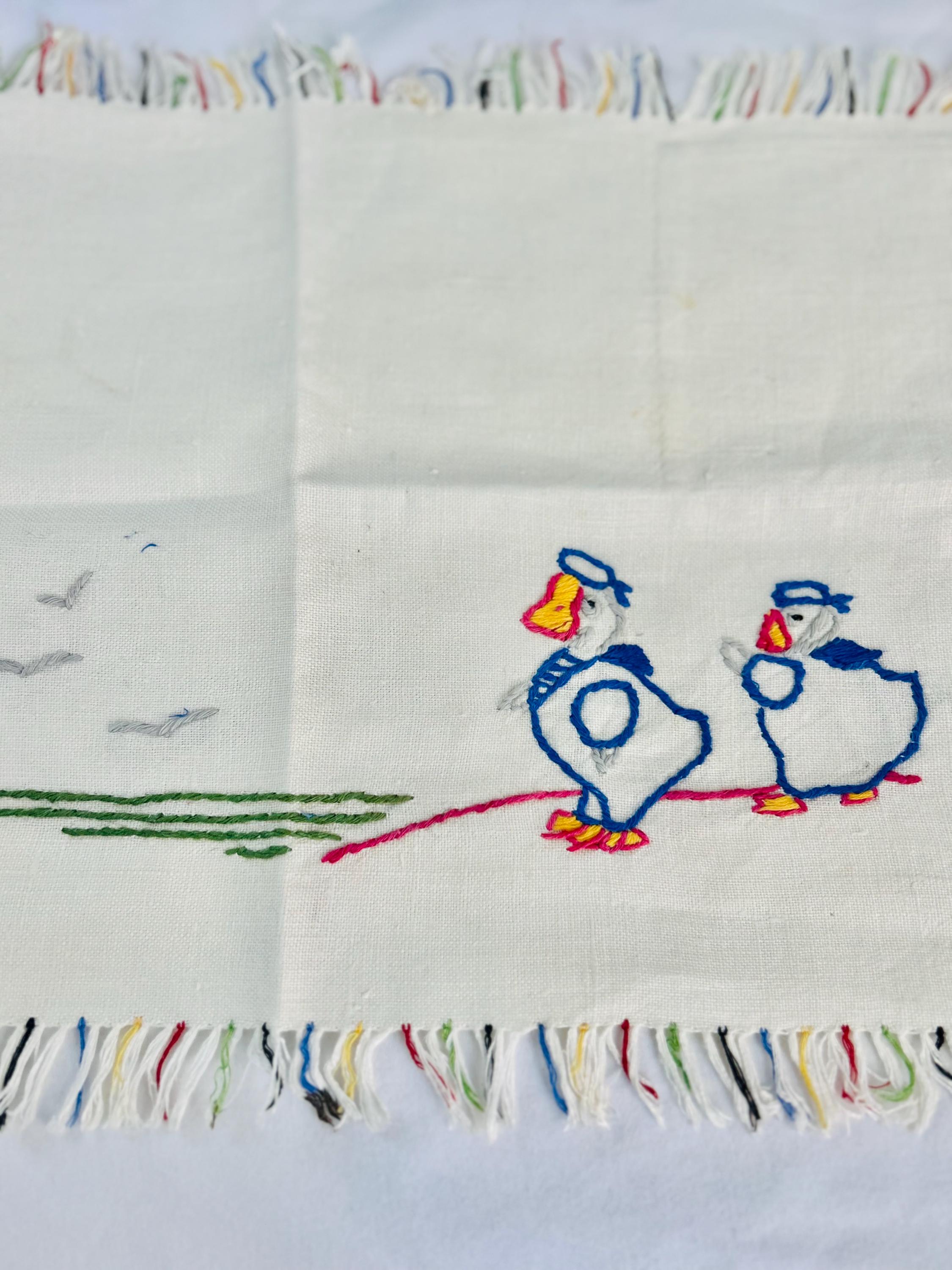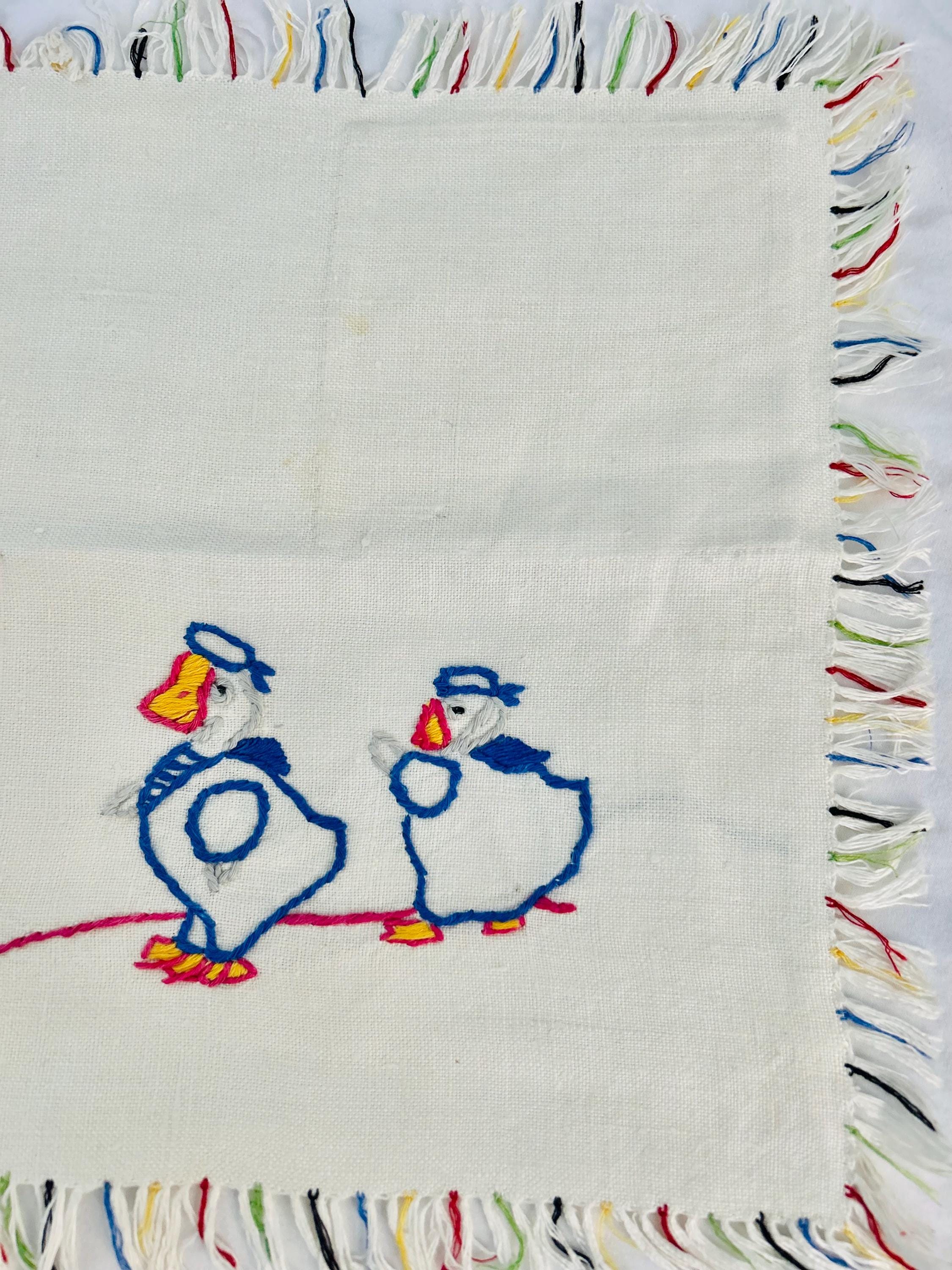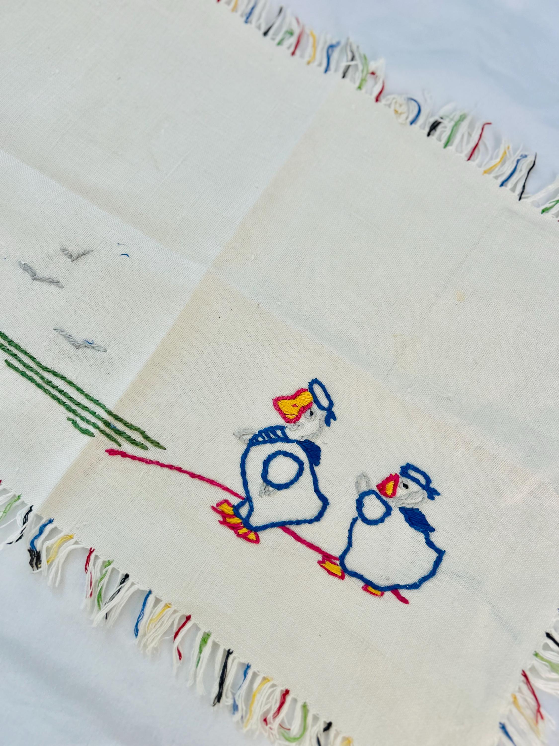 Delightful hand-embroidered ducks on linen table mat with fringe, There is a small linen pocket sewn into the back, though I'm not sure of its purpose...