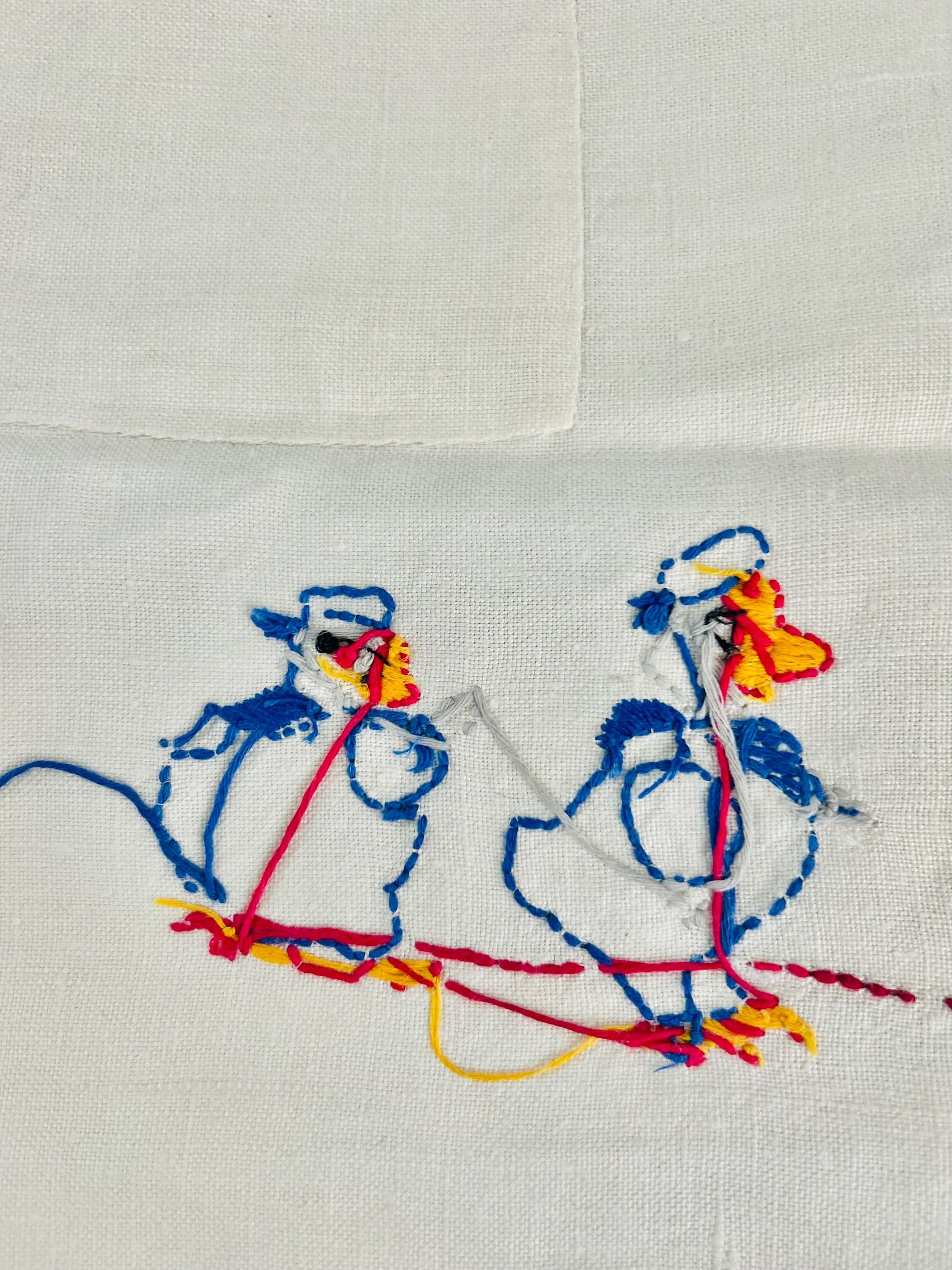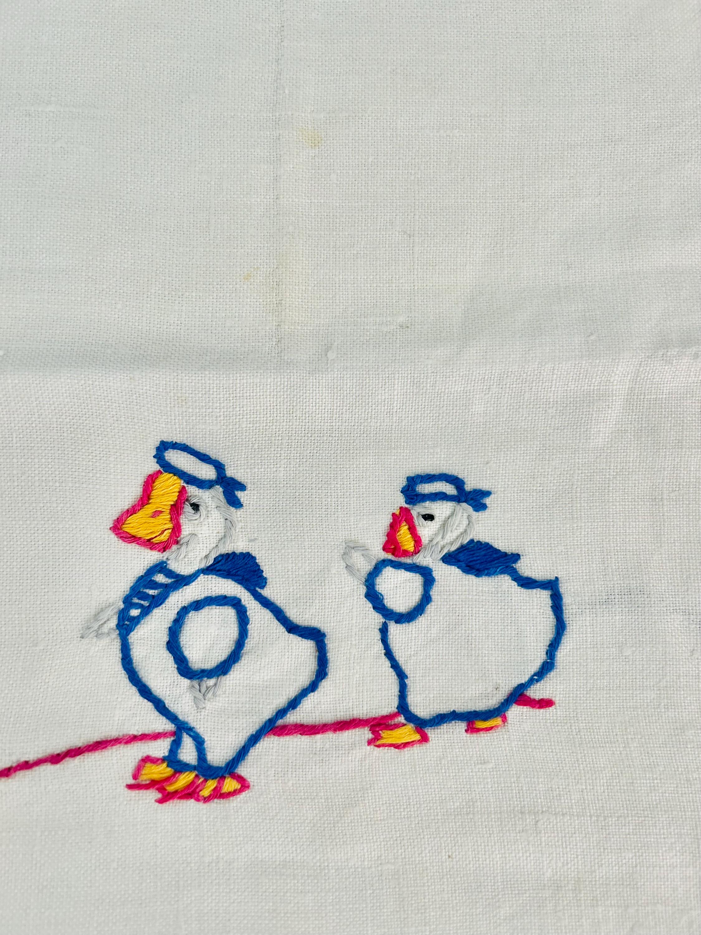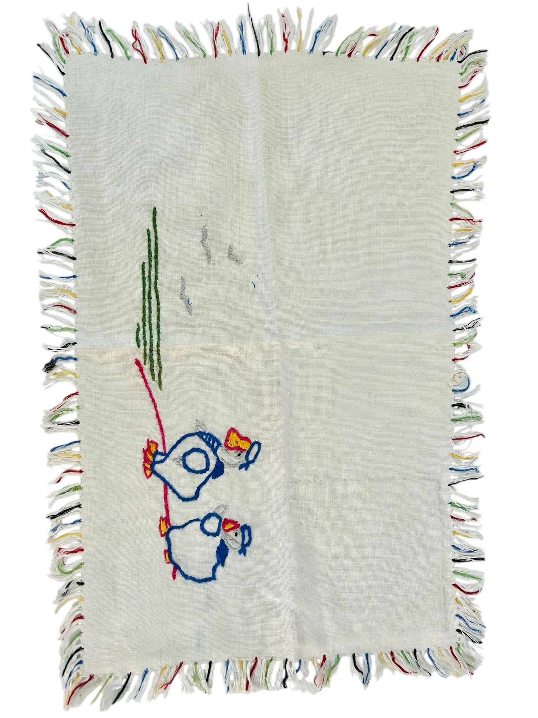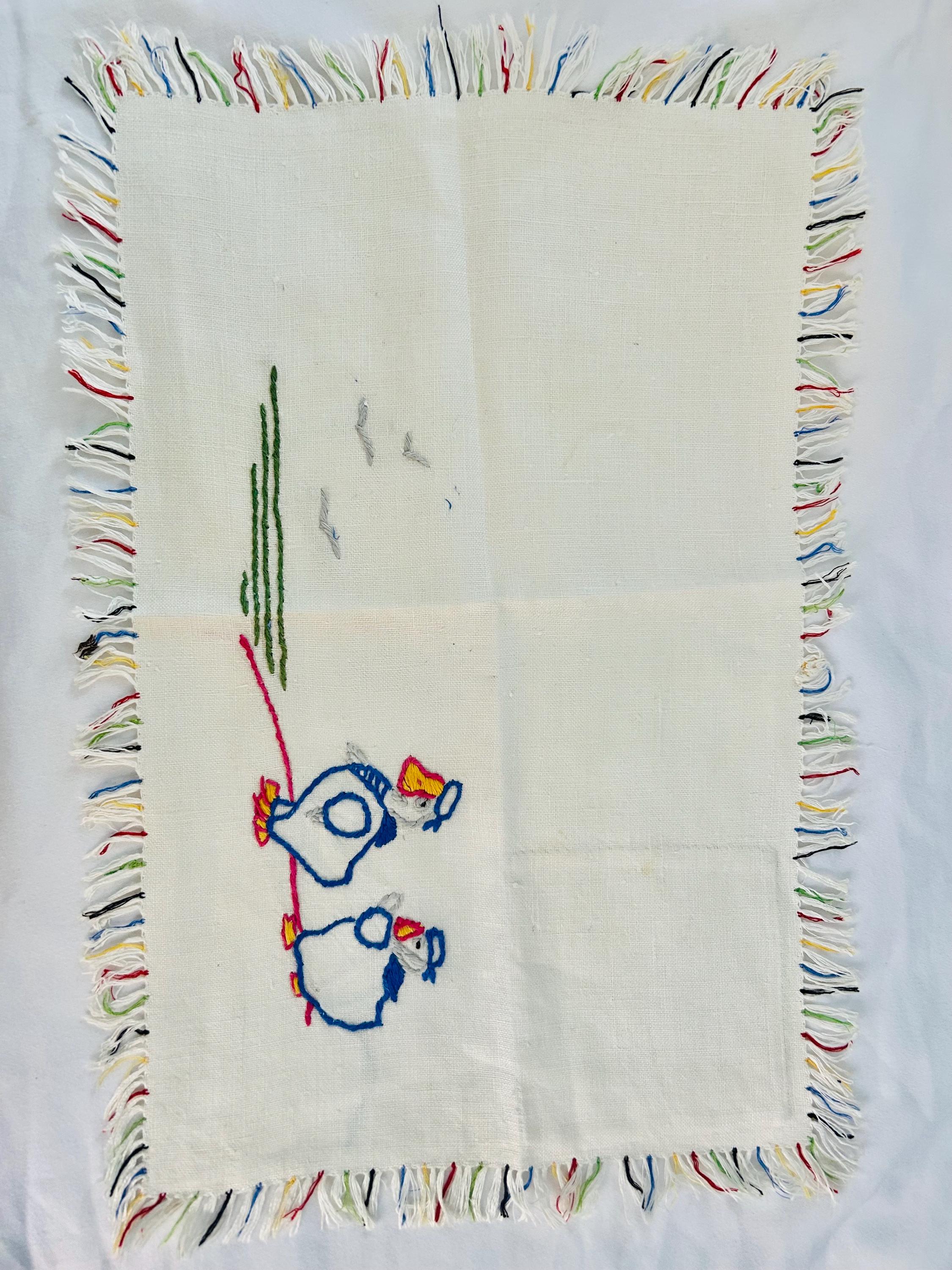 Delightful hand-embroidered ducks on linen table mat with fringe, There is a small linen pocket sewn into the back, though I'm not sure of its purpose...