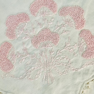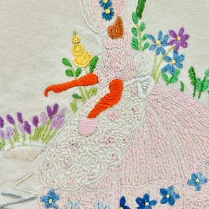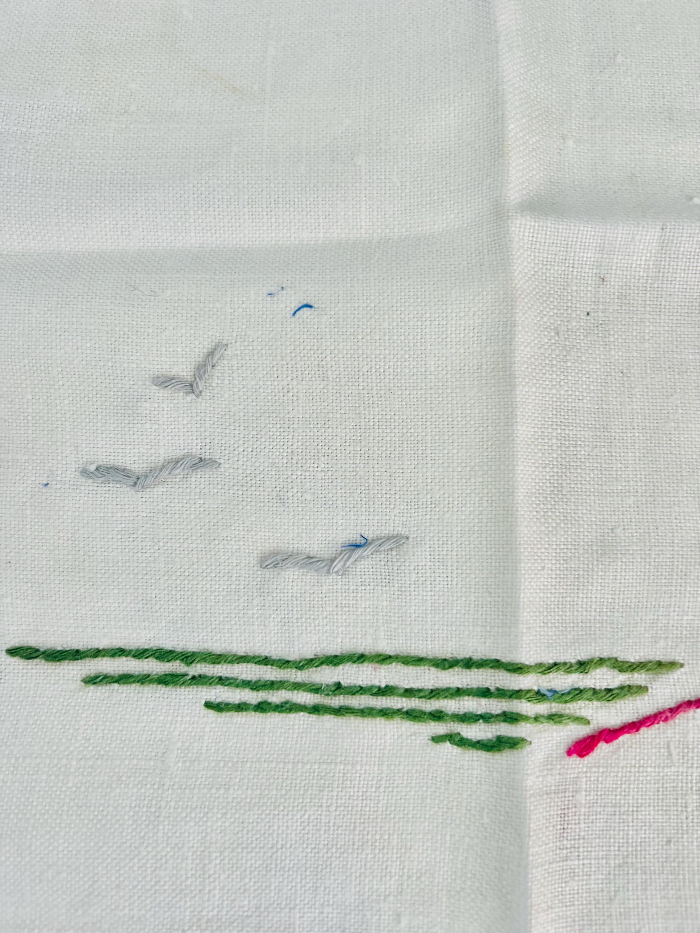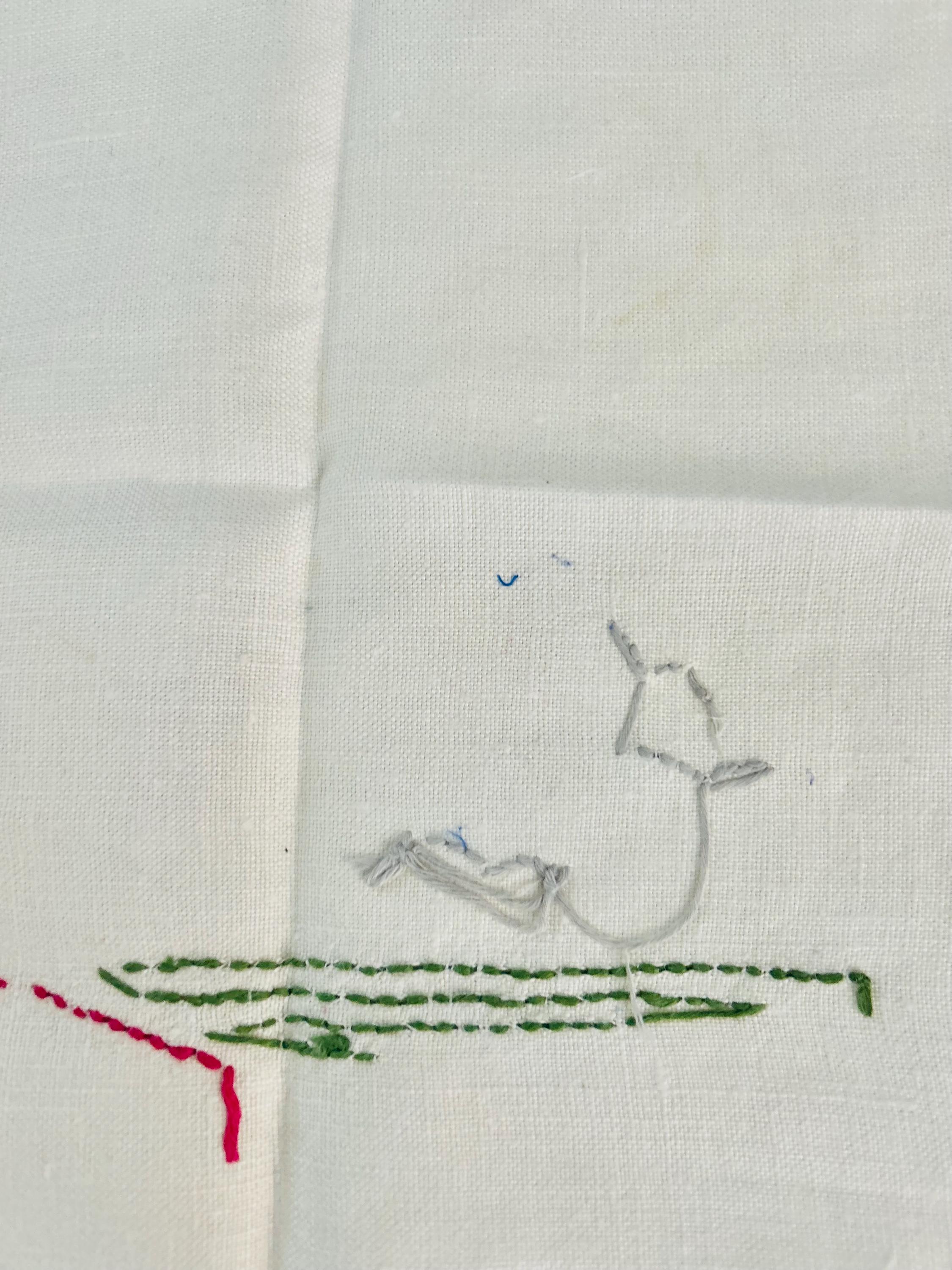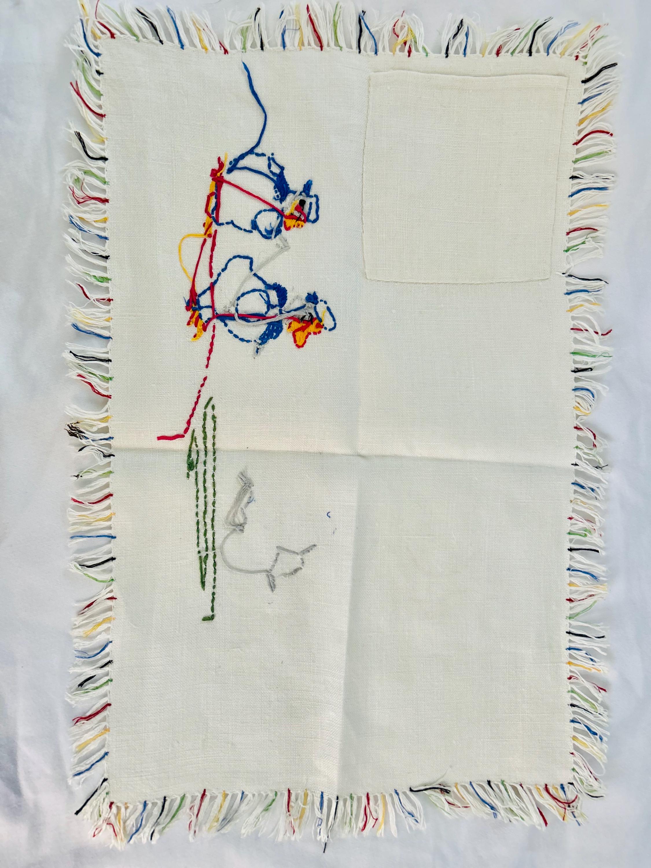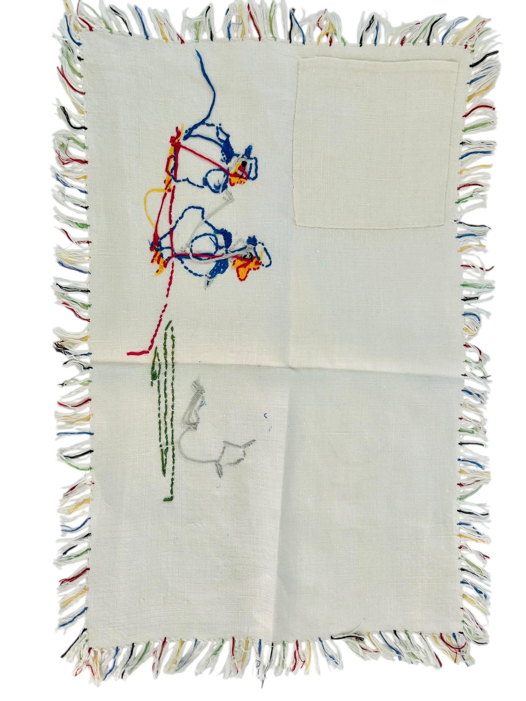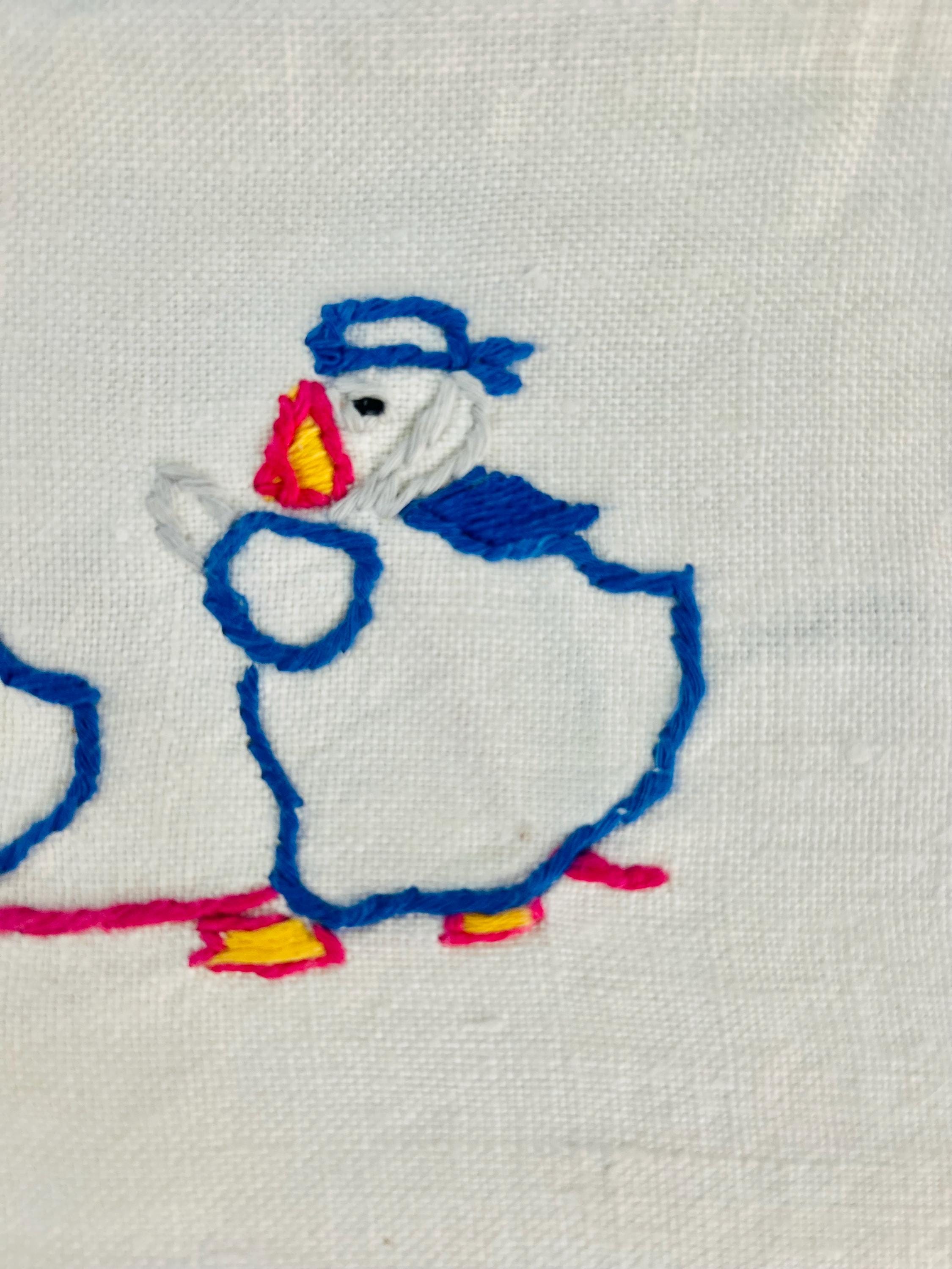Delightful hand-embroidered ducks on linen table mat with fringe, There is a small linen pocket sewn into the back, though I'm not sure of its purpose...