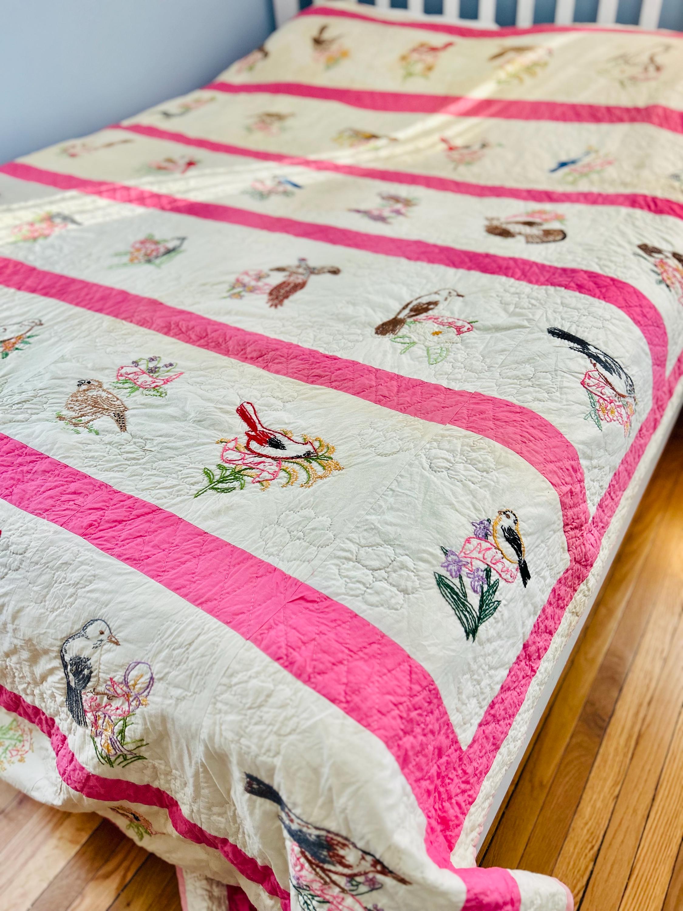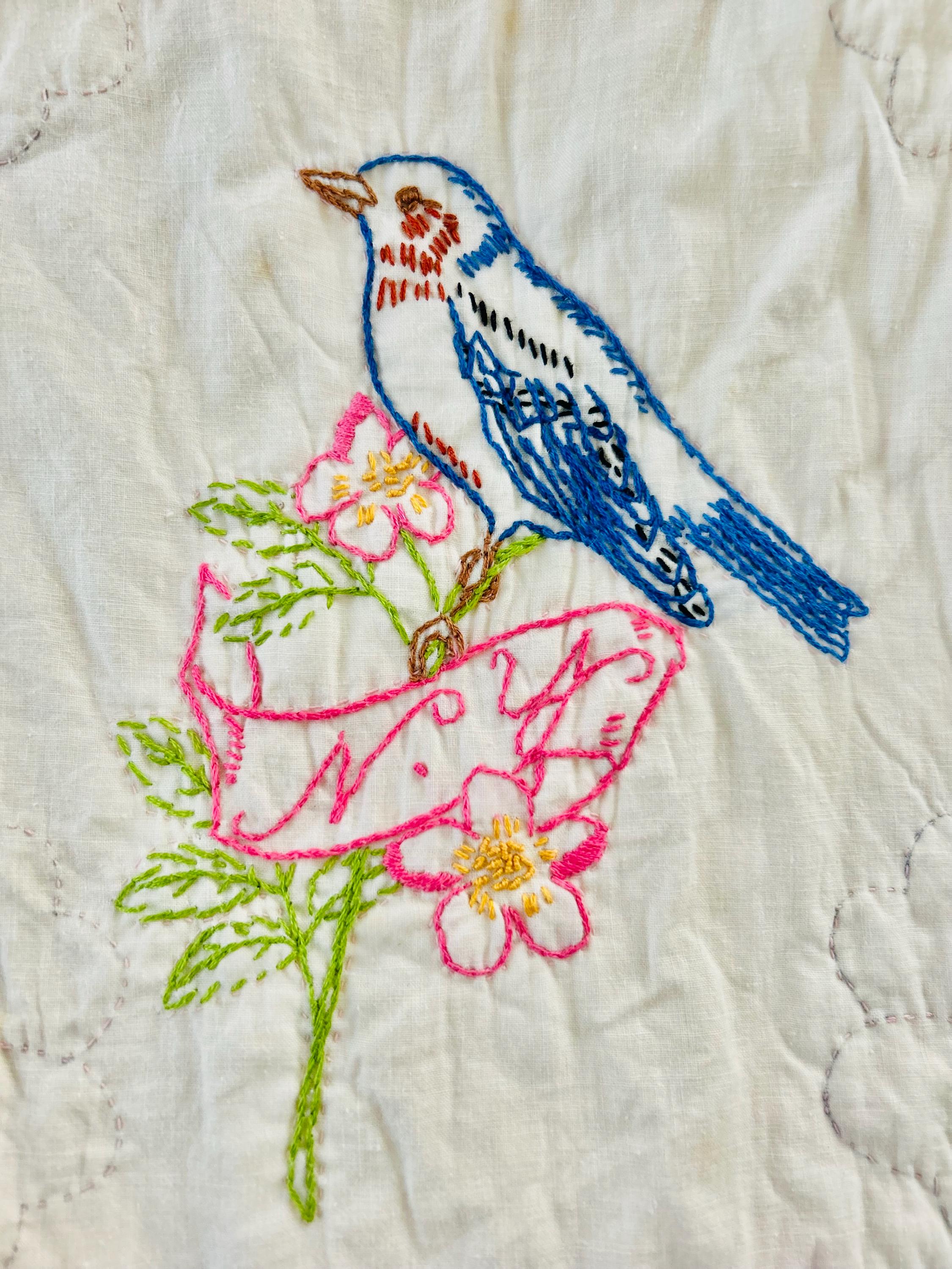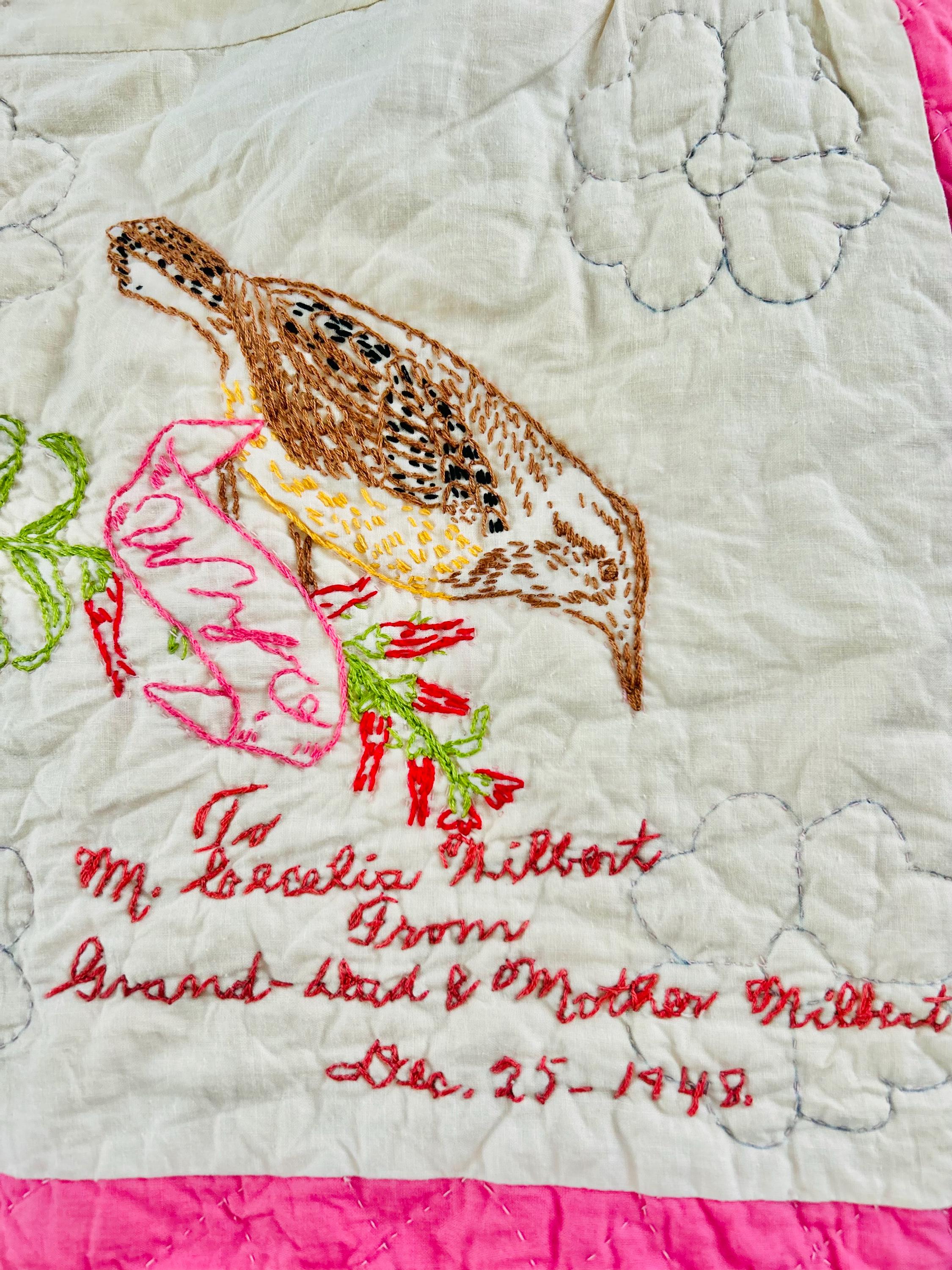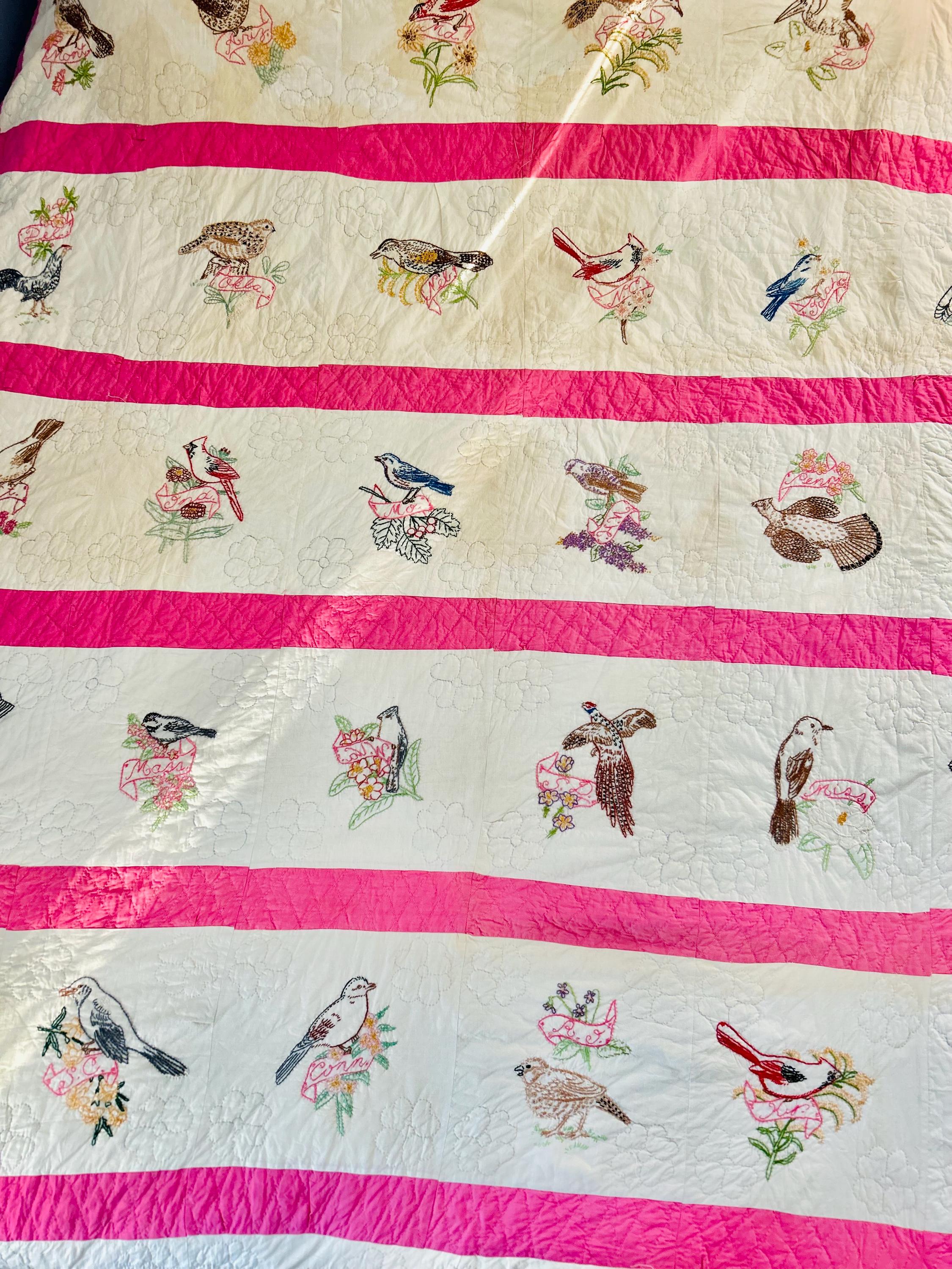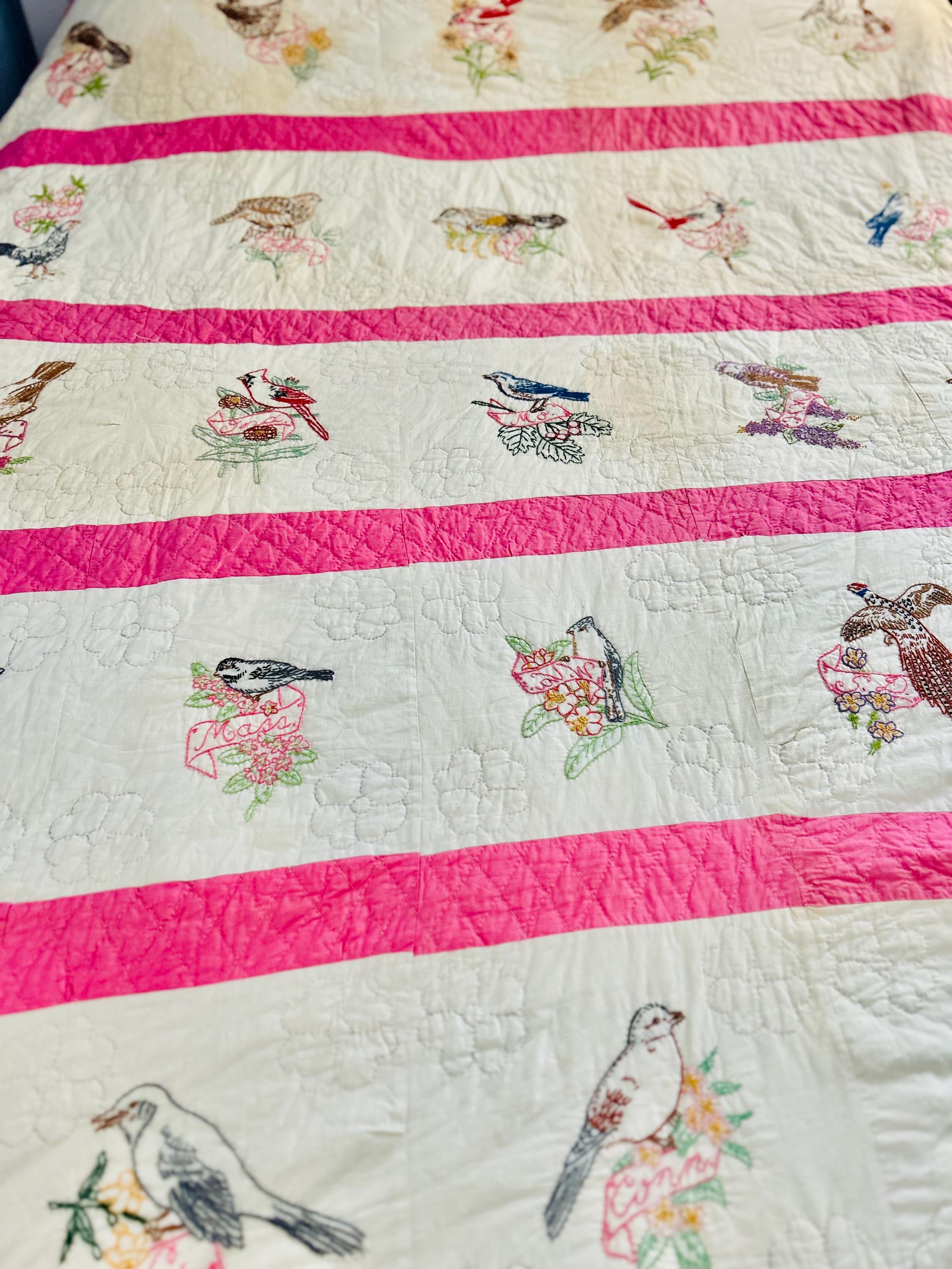 This is a very interesting quilt, signed "Grand-dad and Mother Nilbert" and dated 1948, and made up of beautifully and intricately embroidered birds of each state. Note there are only 48 states represented since Hawaii and Alaska did not become states until 1959. In addition, whether intentionally or by accident, some of the quilt blocks have been embroidered on the wrong side - which does not affect the birds, but results in a few of the names, like Iowa, embroidered as awoI. The quilting is intricate for a "bird" quilt and includes flowers, outlines of the embroidery squares and diamonds along the sashing and border.