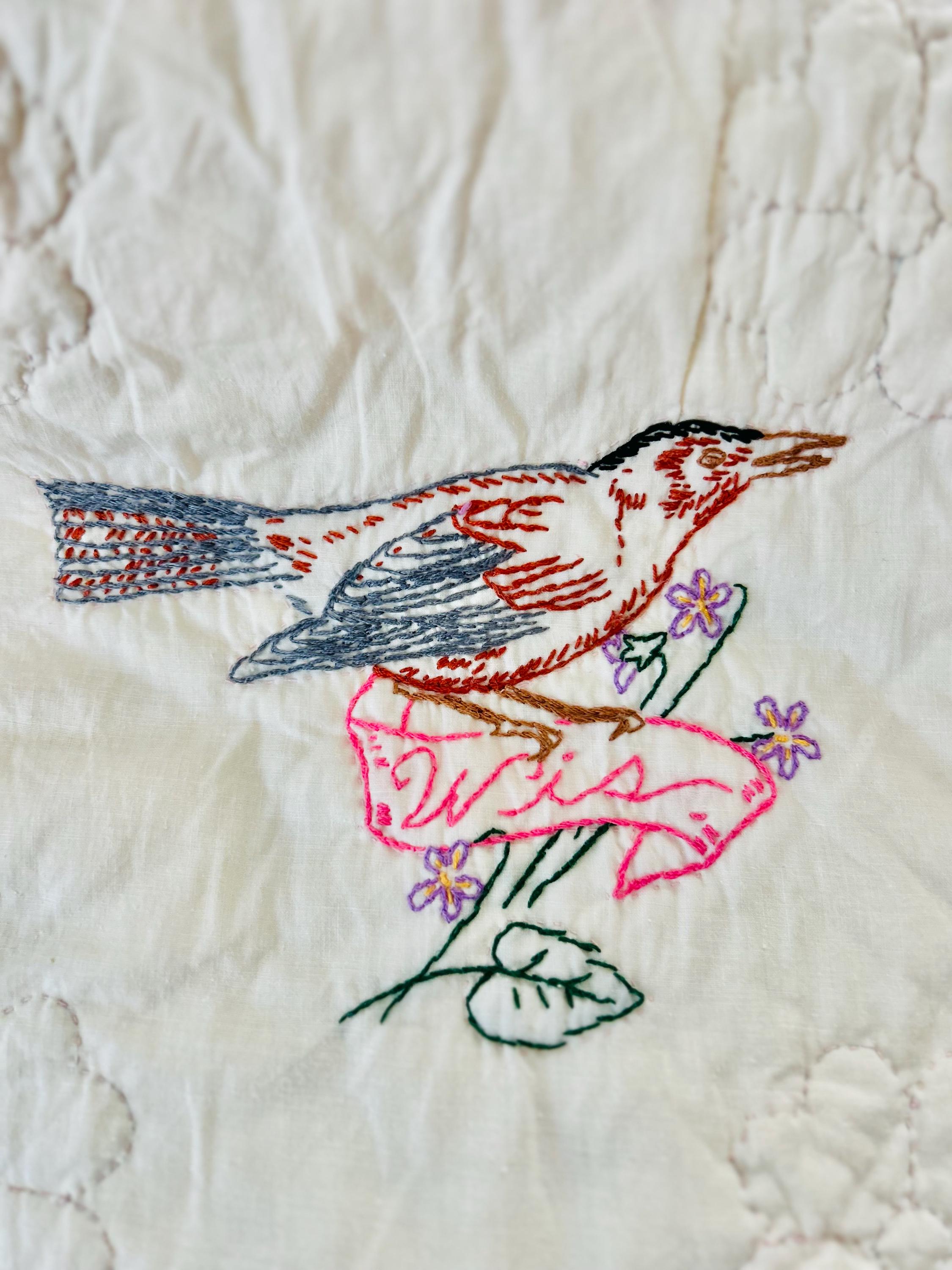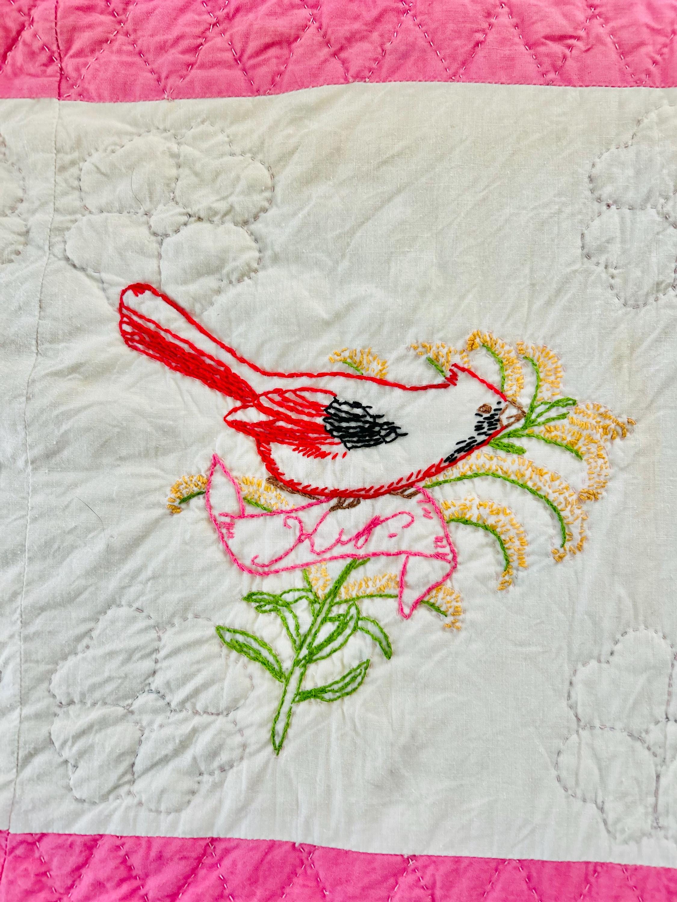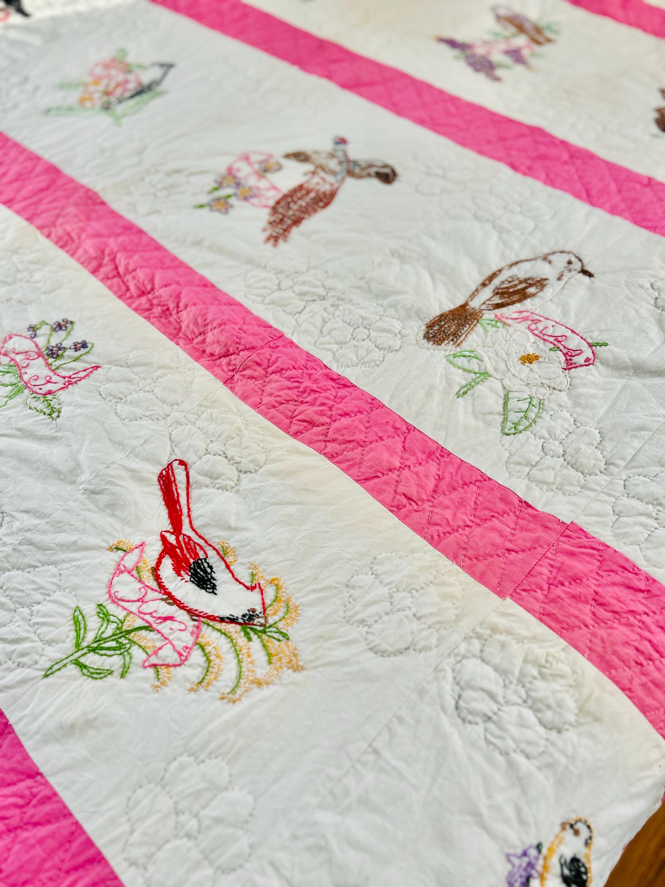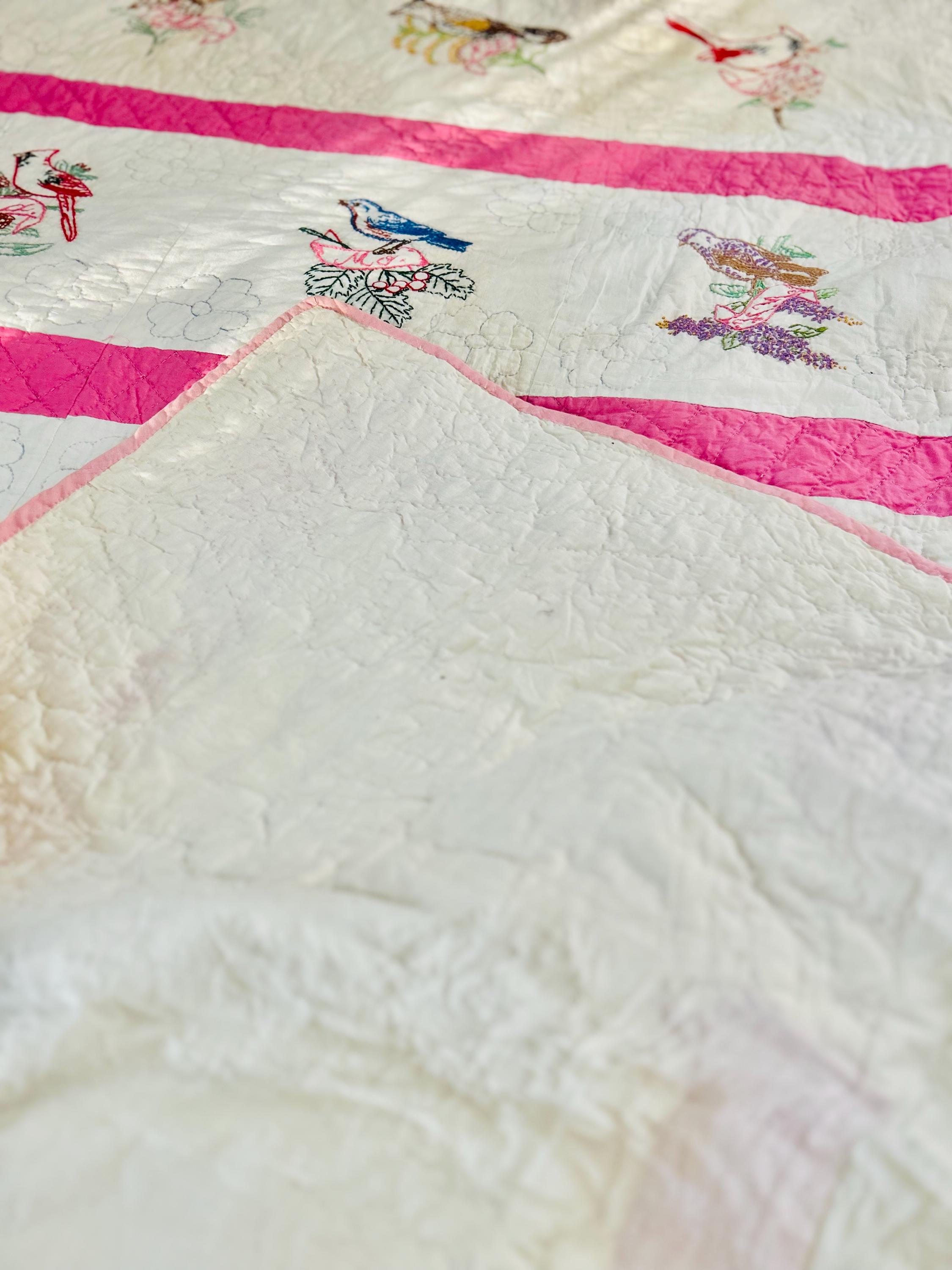 This is a very interesting quilt, signed "Grand-dad and Mother Nilbert" and dated 1948, and made up of beautifully and intricately embroidered birds of each state. Note there are only 48 states represented since Hawaii and Alaska did not become states until 1959. In addition, whether intentionally or by accident, some of the quilt blocks have been embroidered on the wrong side - which does not affect the birds, but results in a few of the names, like Iowa, embroidered as awoI. The quilting is intricate for a "bird" quilt and includes flowers, outlines of the embroidery squares and diamonds along the sashing and border.