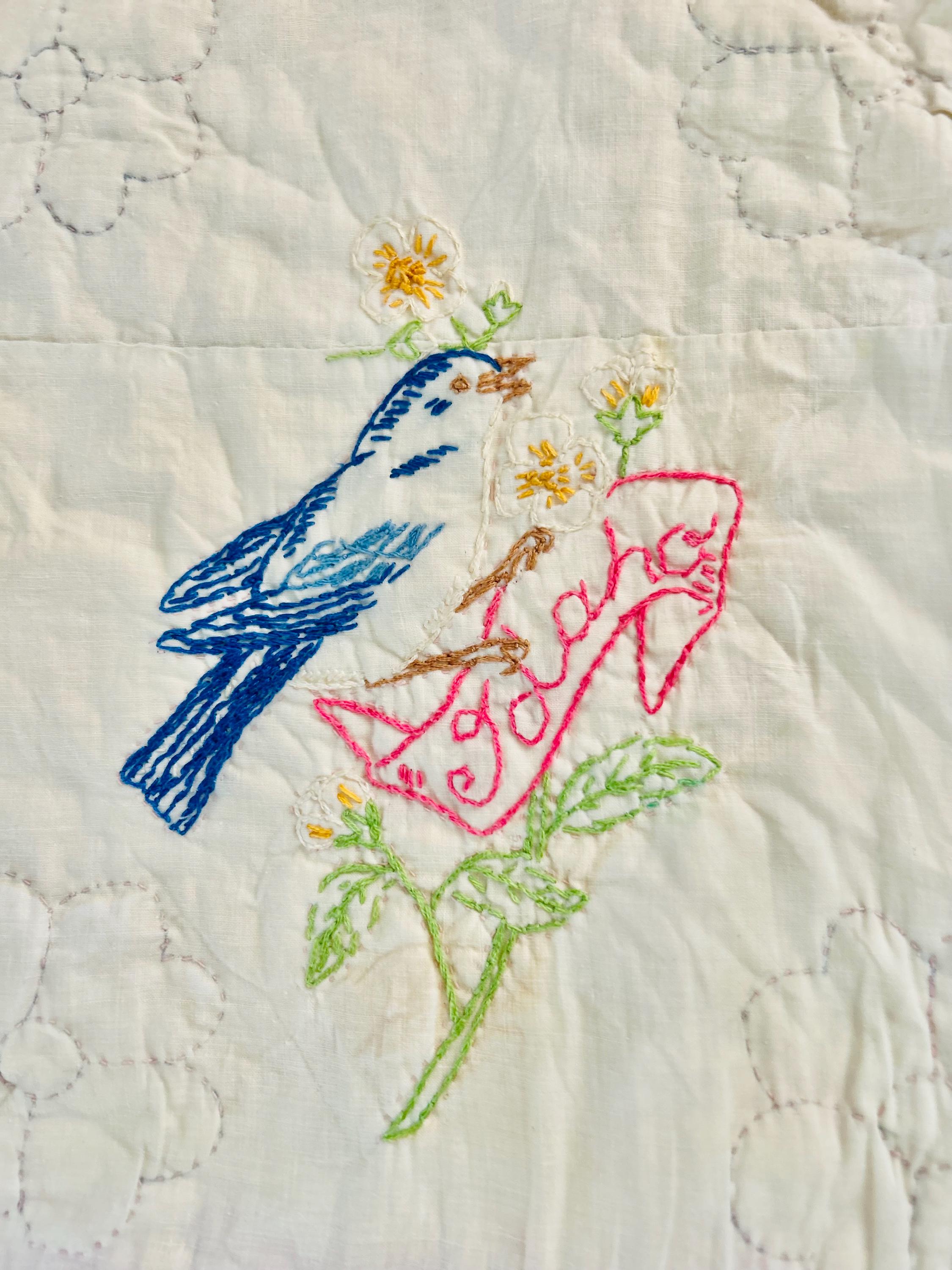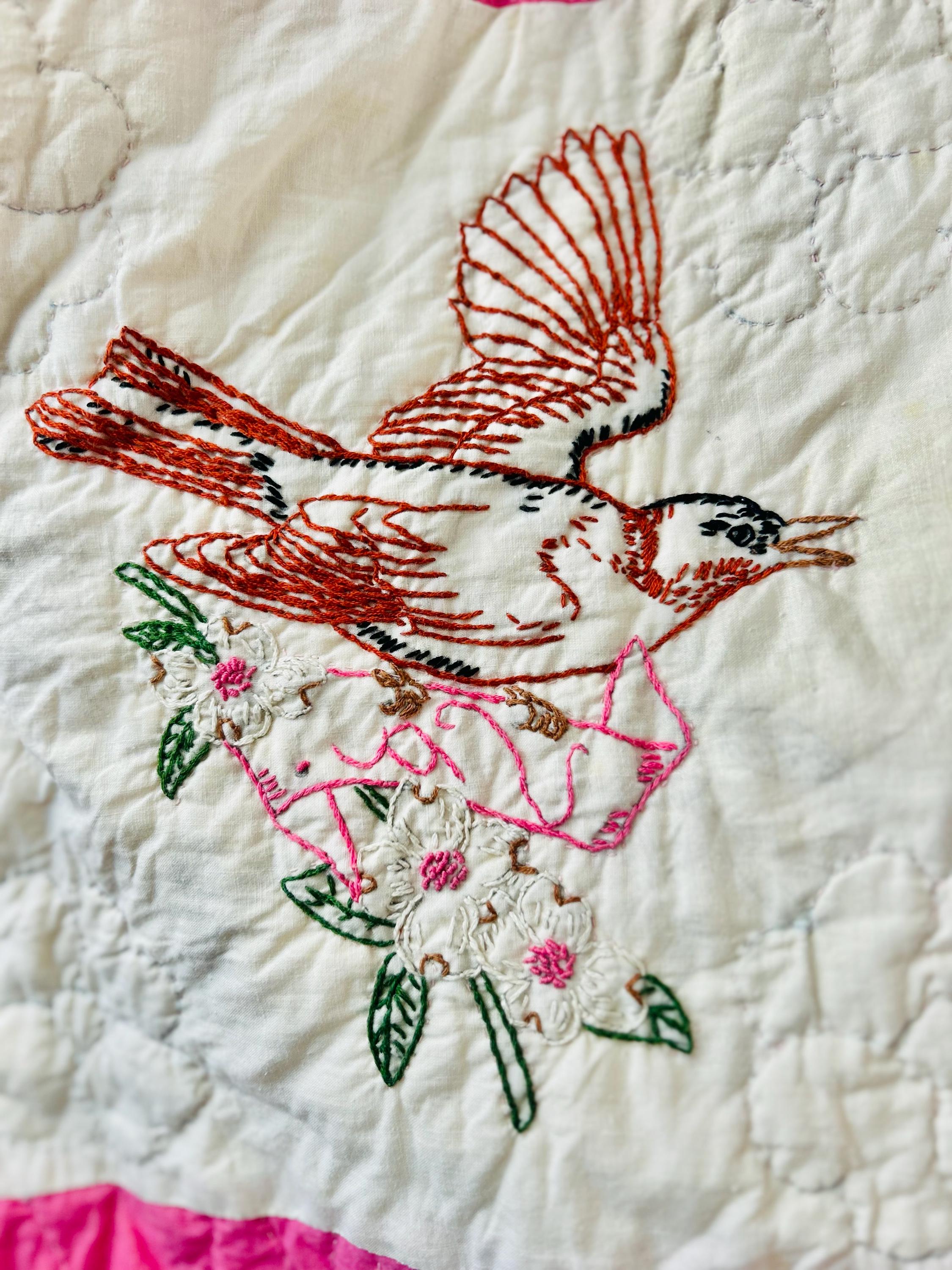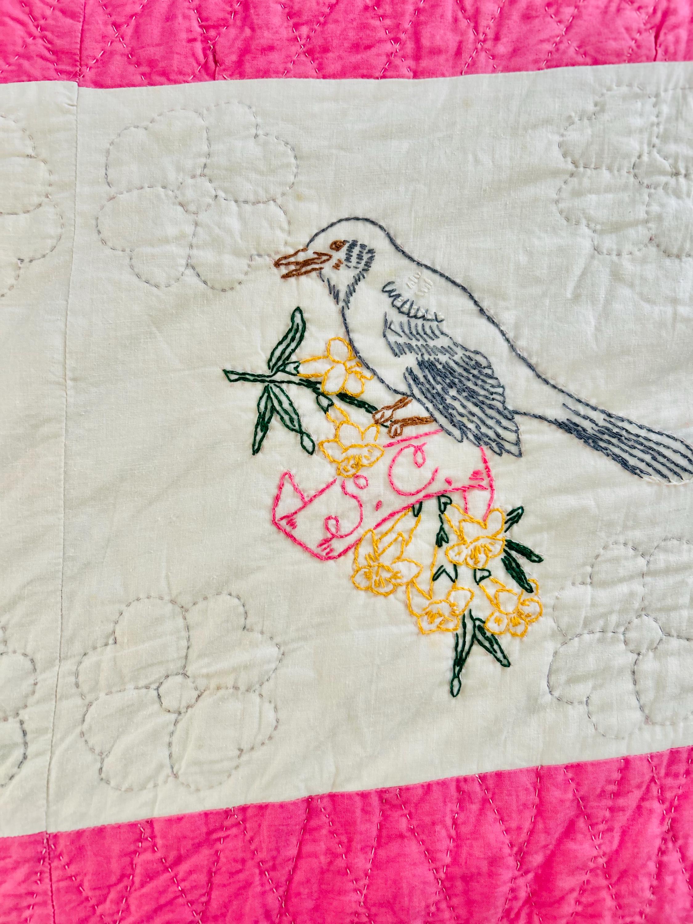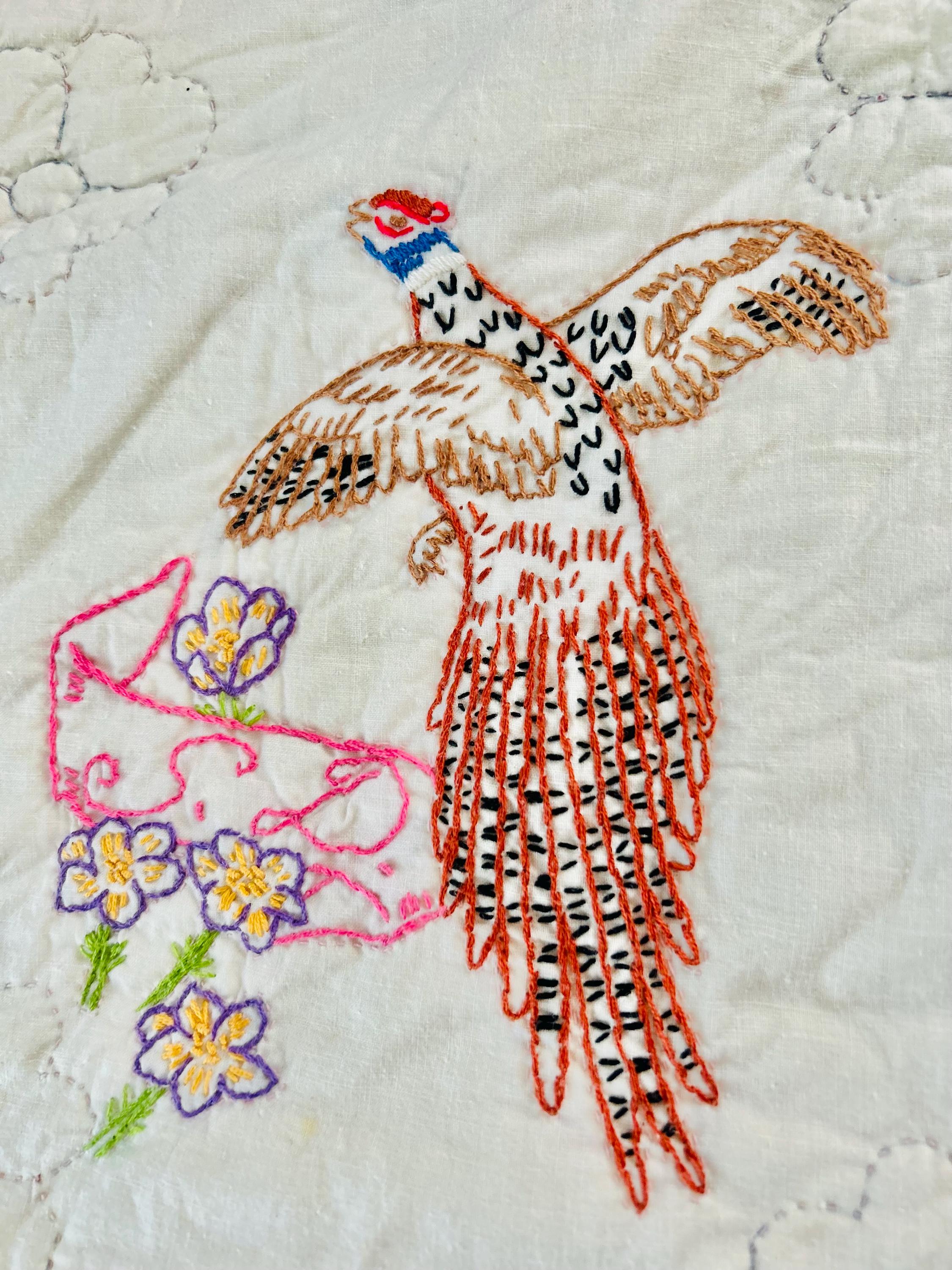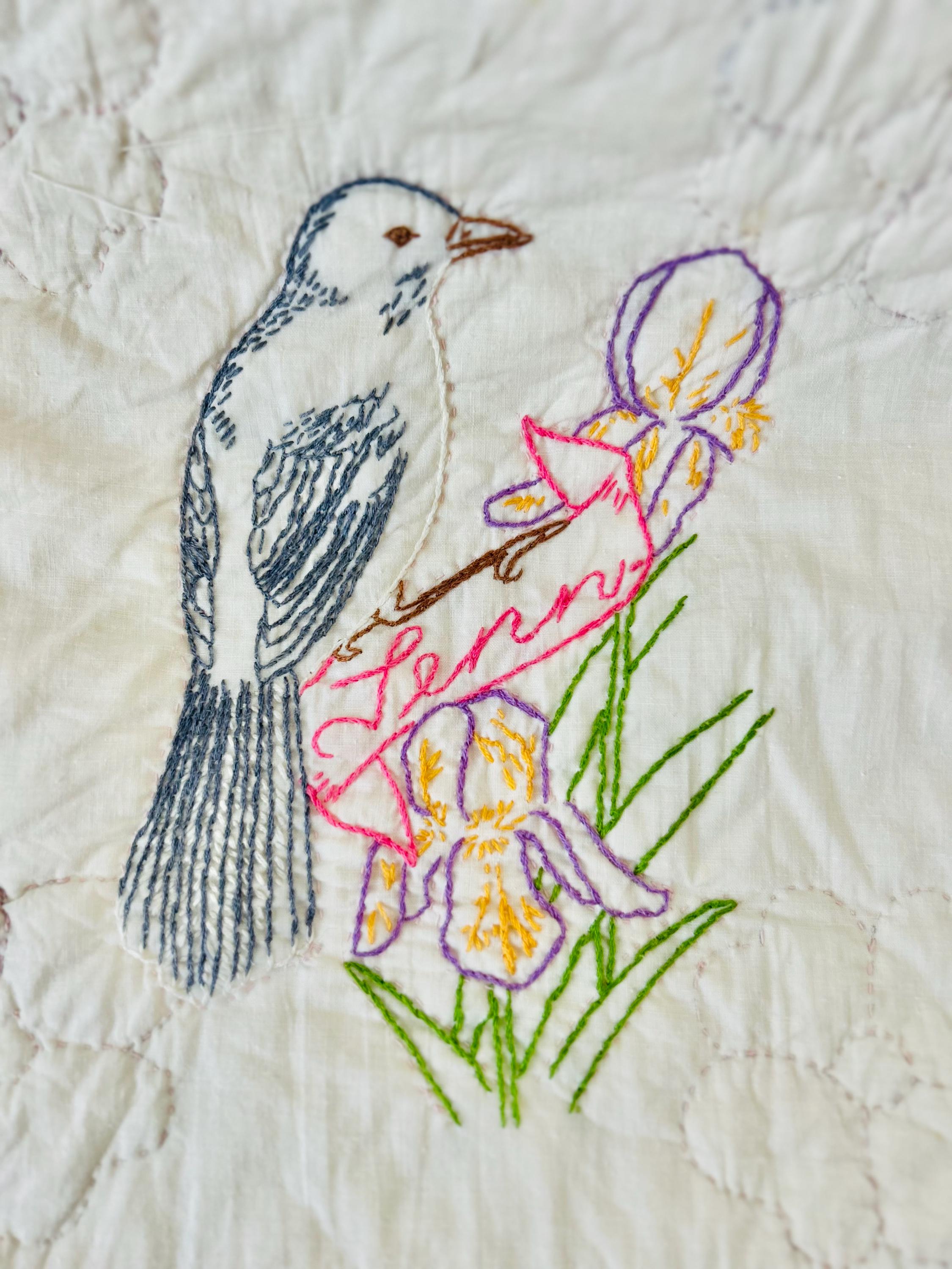 This is a very interesting quilt, signed "Grand-dad and Mother Nilbert" and dated 1948, and made up of beautifully and intricately embroidered birds of each state. Note there are only 48 states represented since Hawaii and Alaska did not become states until 1959. In addition, whether intentionally or by accident, some of the quilt blocks have been embroidered on the wrong side - which does not affect the birds, but results in a few of the names, like Iowa, embroidered as awoI. The quilting is intricate for a "bird" quilt and includes flowers, outlines of the embroidery squares and diamonds along the sashing and border.
