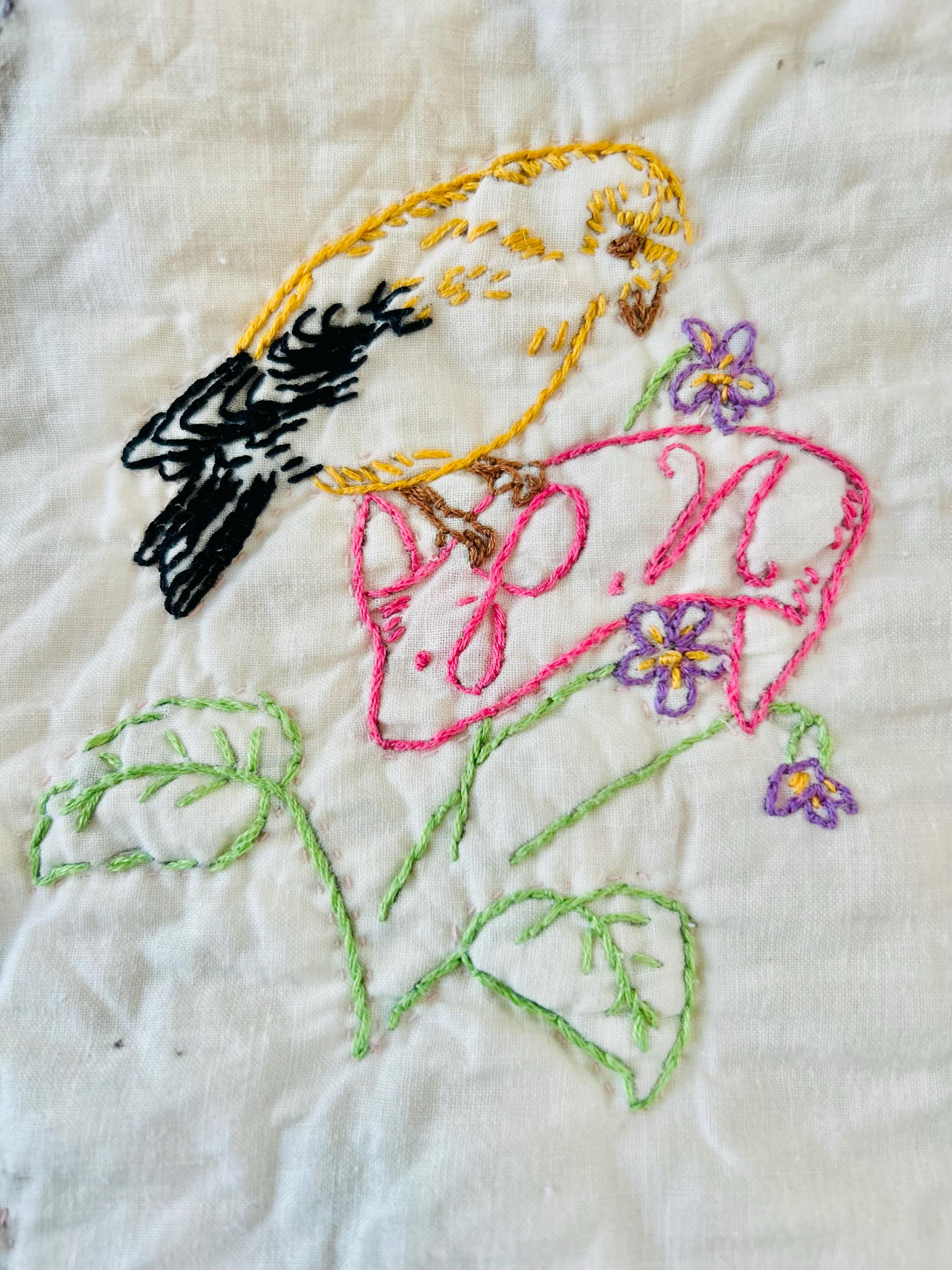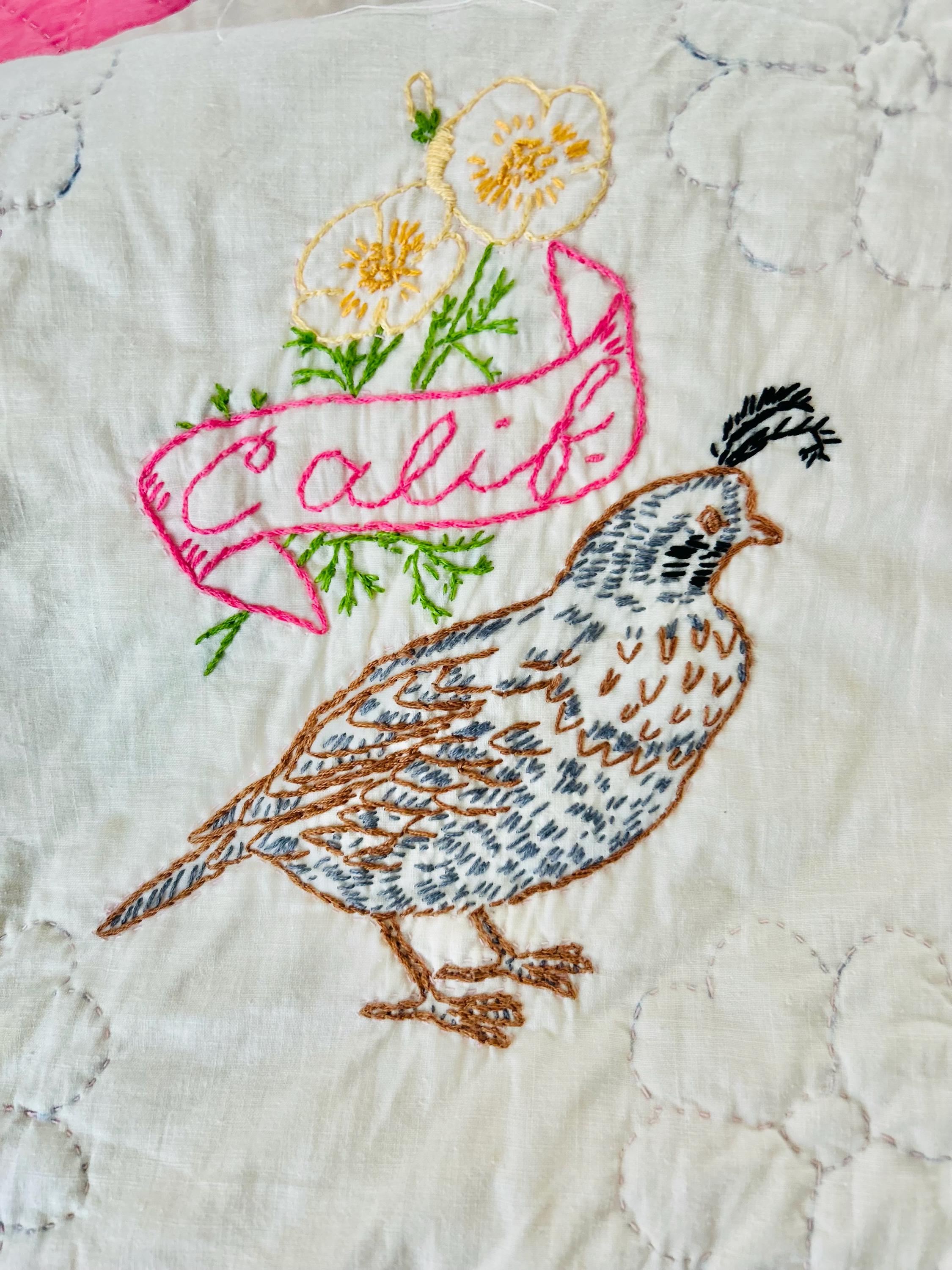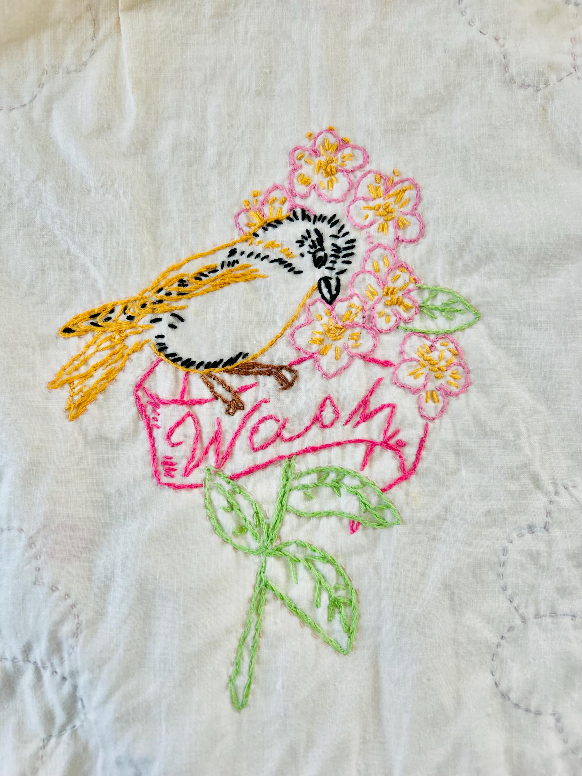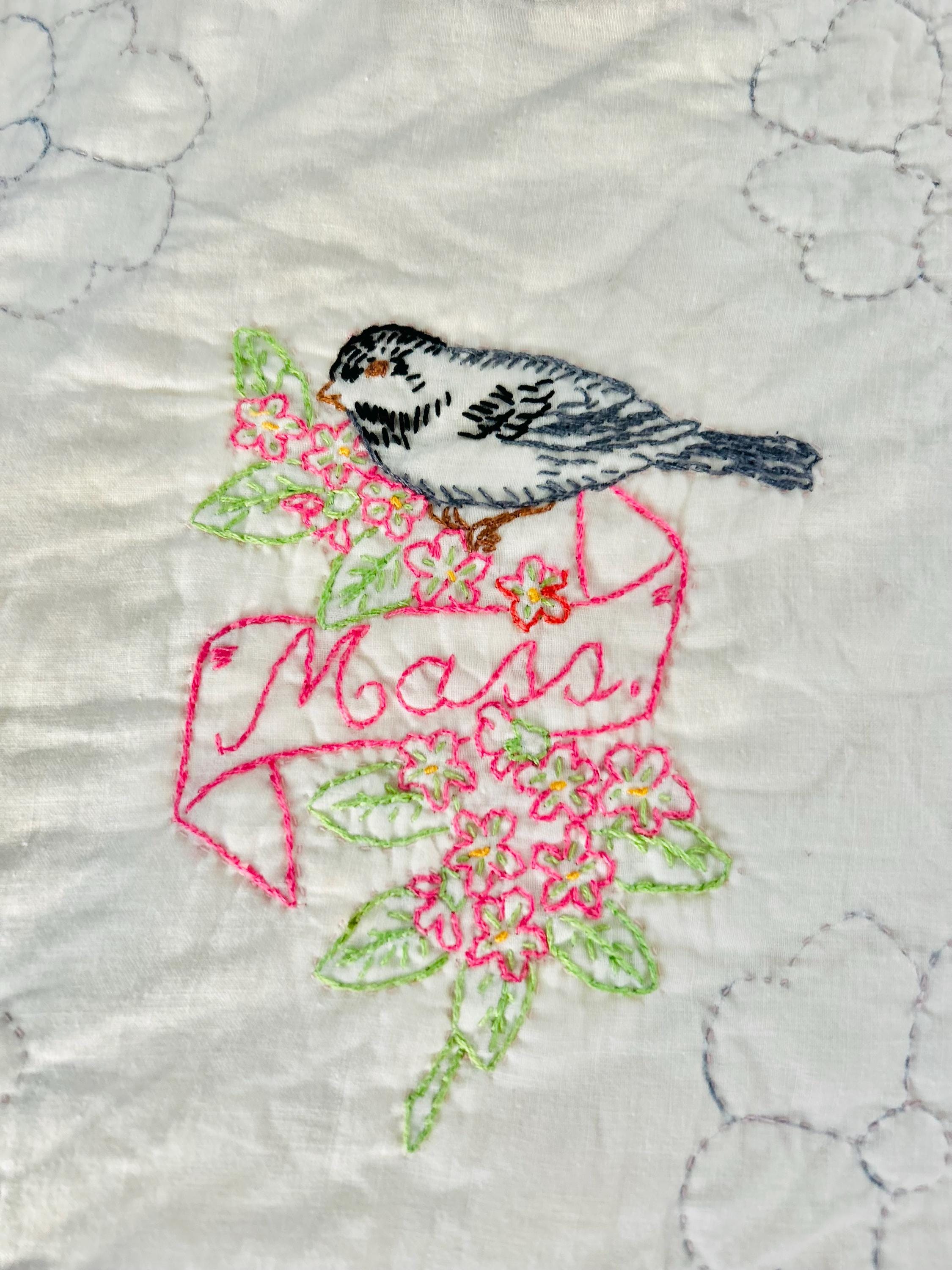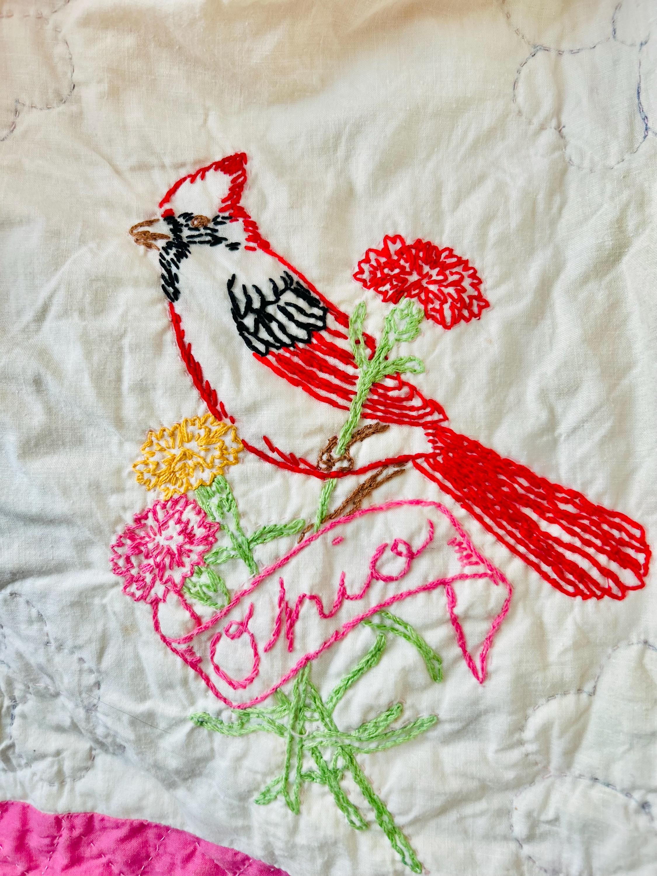This is a very interesting quilt, signed "Grand-dad and Mother Nilbert" and dated 1948, and made up of beautifully and intricately embroidered birds of each state. Note there are only 48 states represented since Hawaii and Alaska did not become states until 1959. In addition, whether intentionally or by accident, some of the quilt blocks have been embroidered on the wrong side - which does not affect the birds, but results in a few of the names, like Iowa, embroidered as awoI. The quilting is intricate for a "bird" quilt and includes flowers, outlines of the embroidery squares and diamonds along the sashing and border.